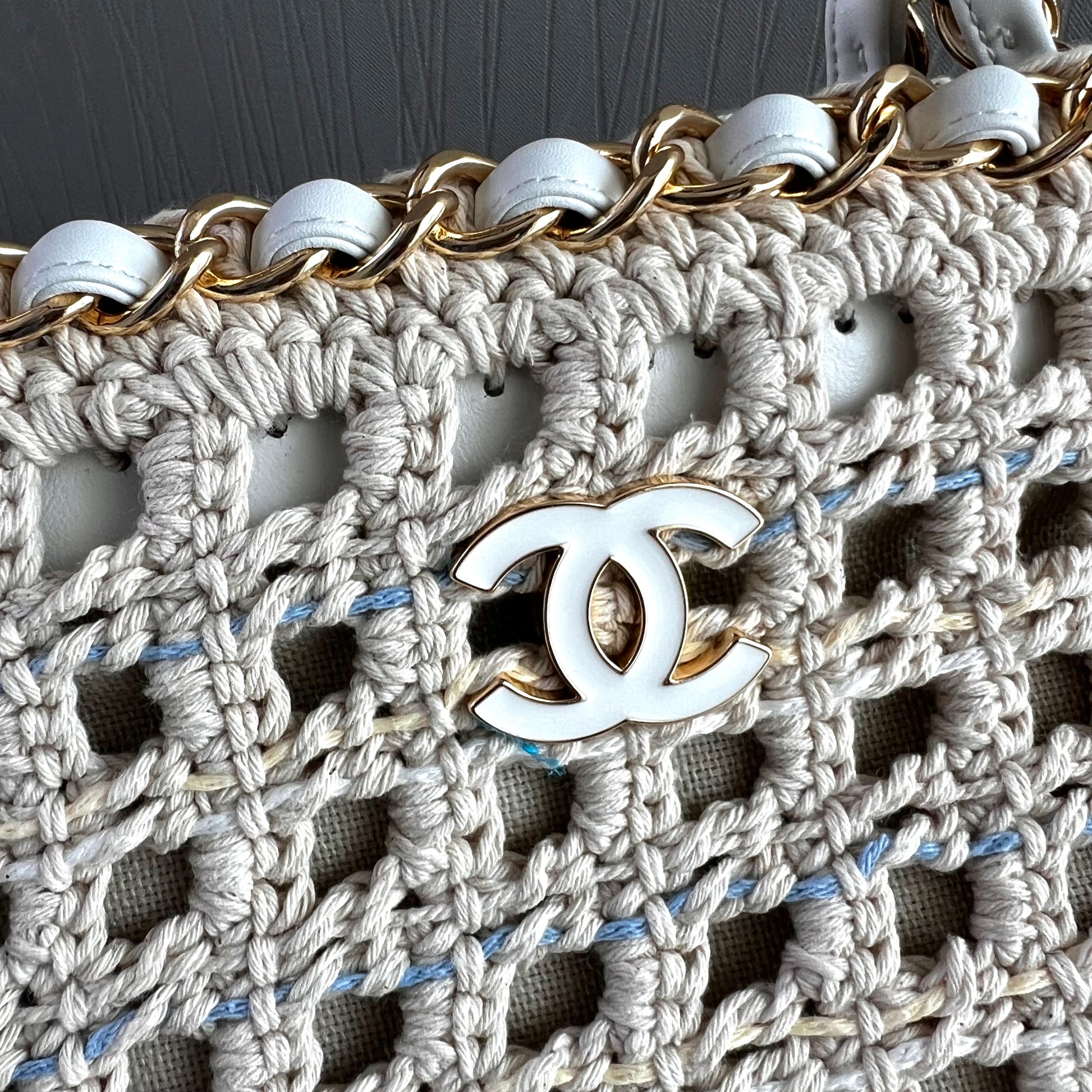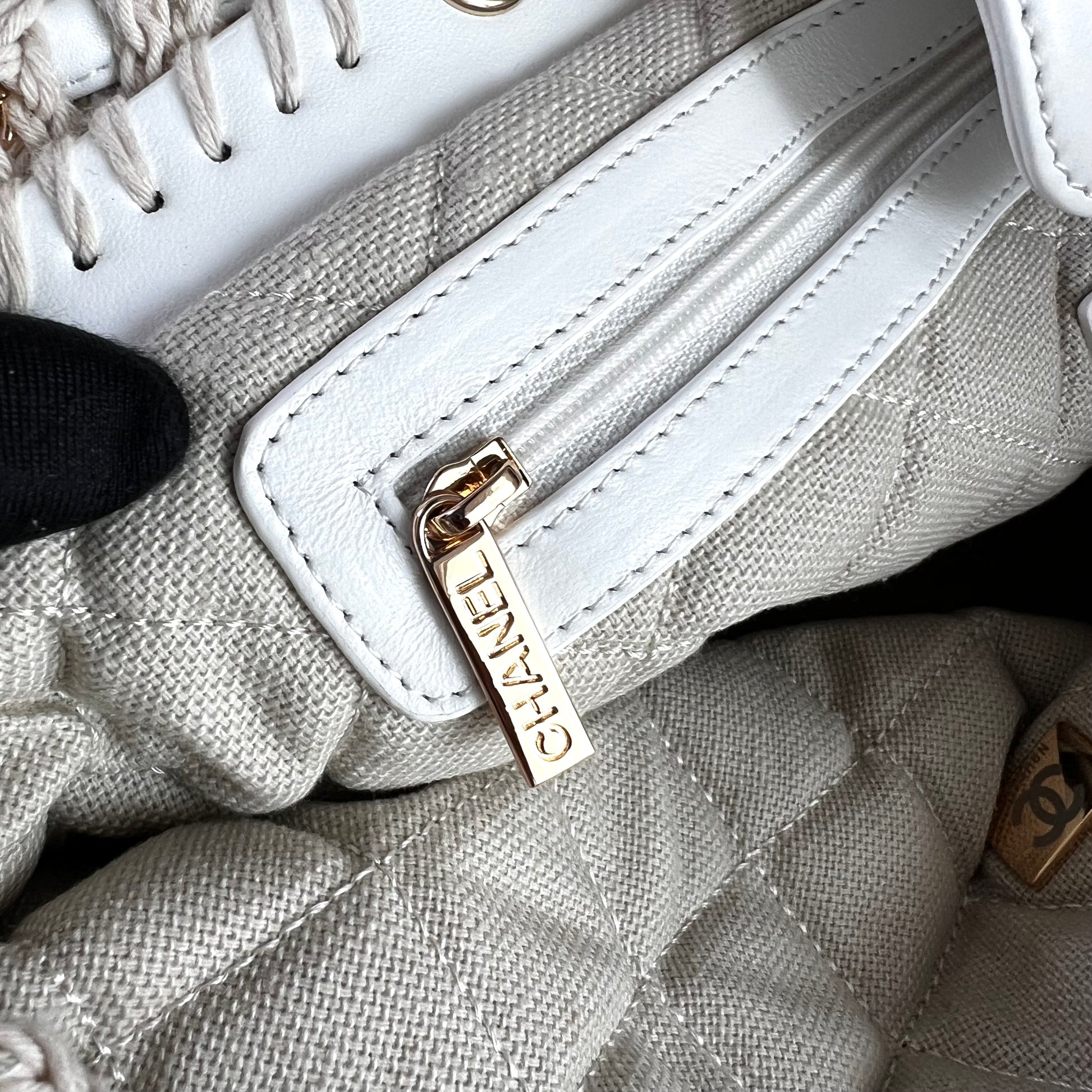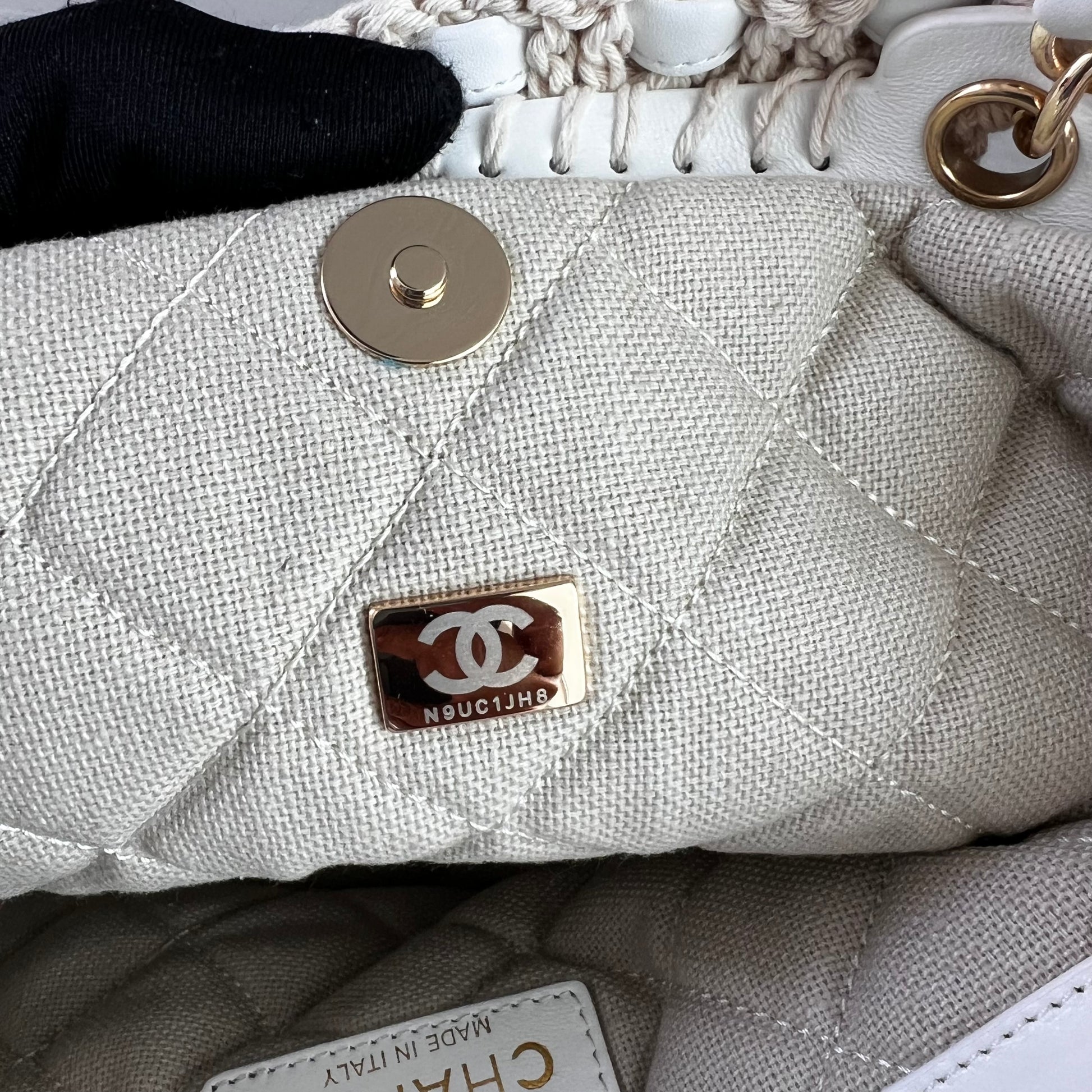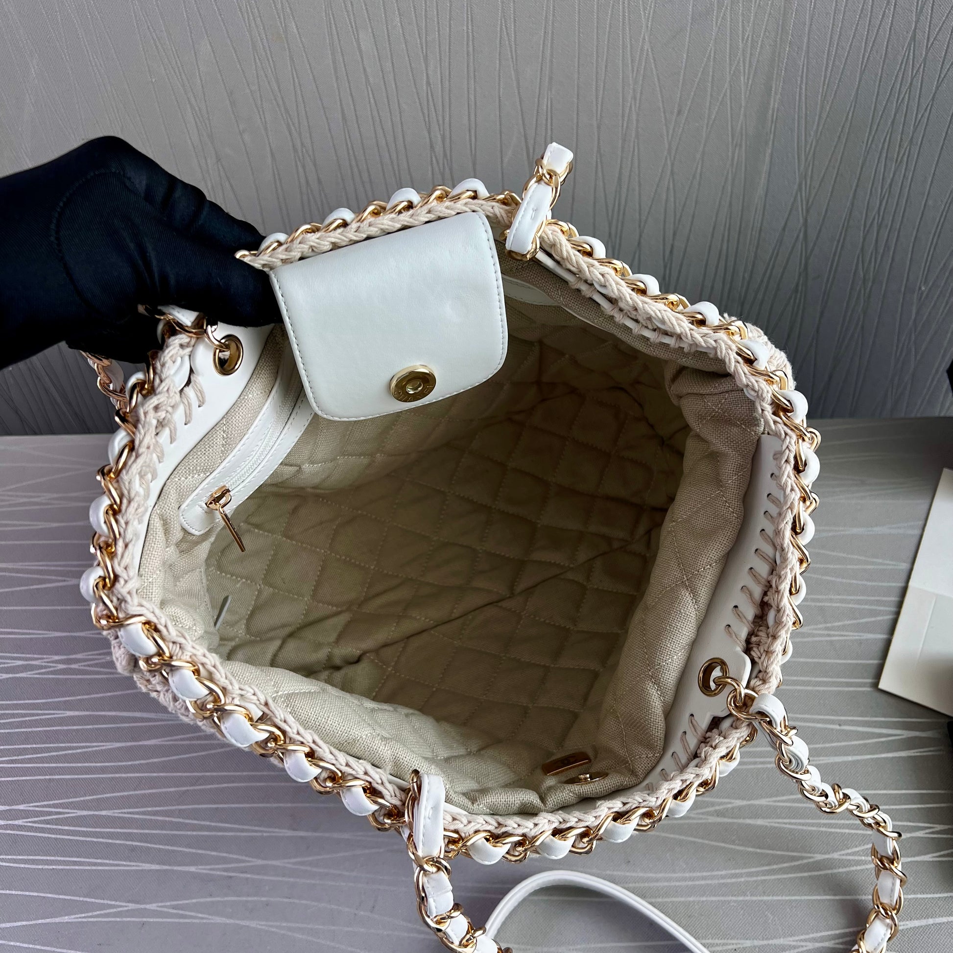 Bolso C tejido en algodón natural combinada con piel blanca. Herrajes dorados. Cierre de imán, interior lino.