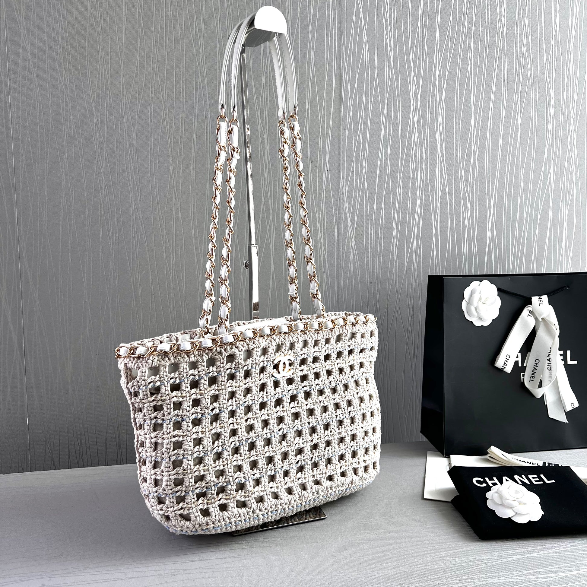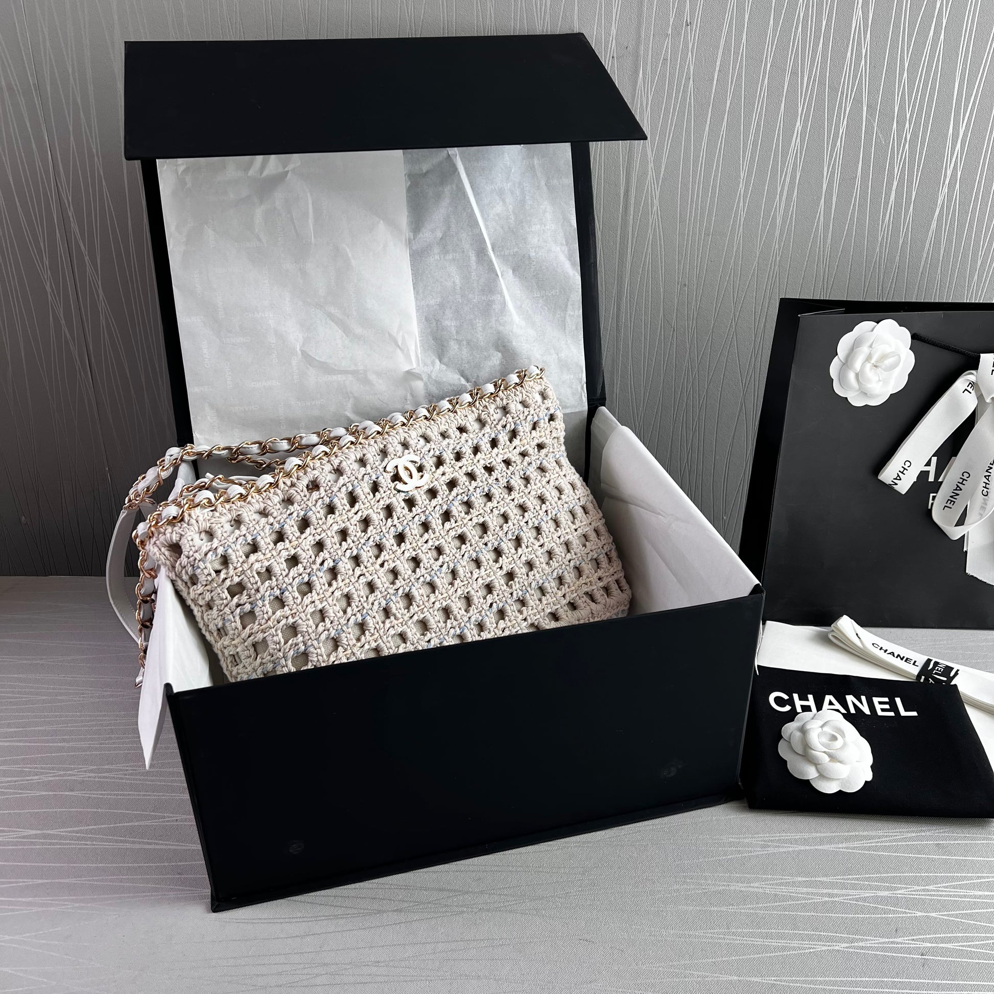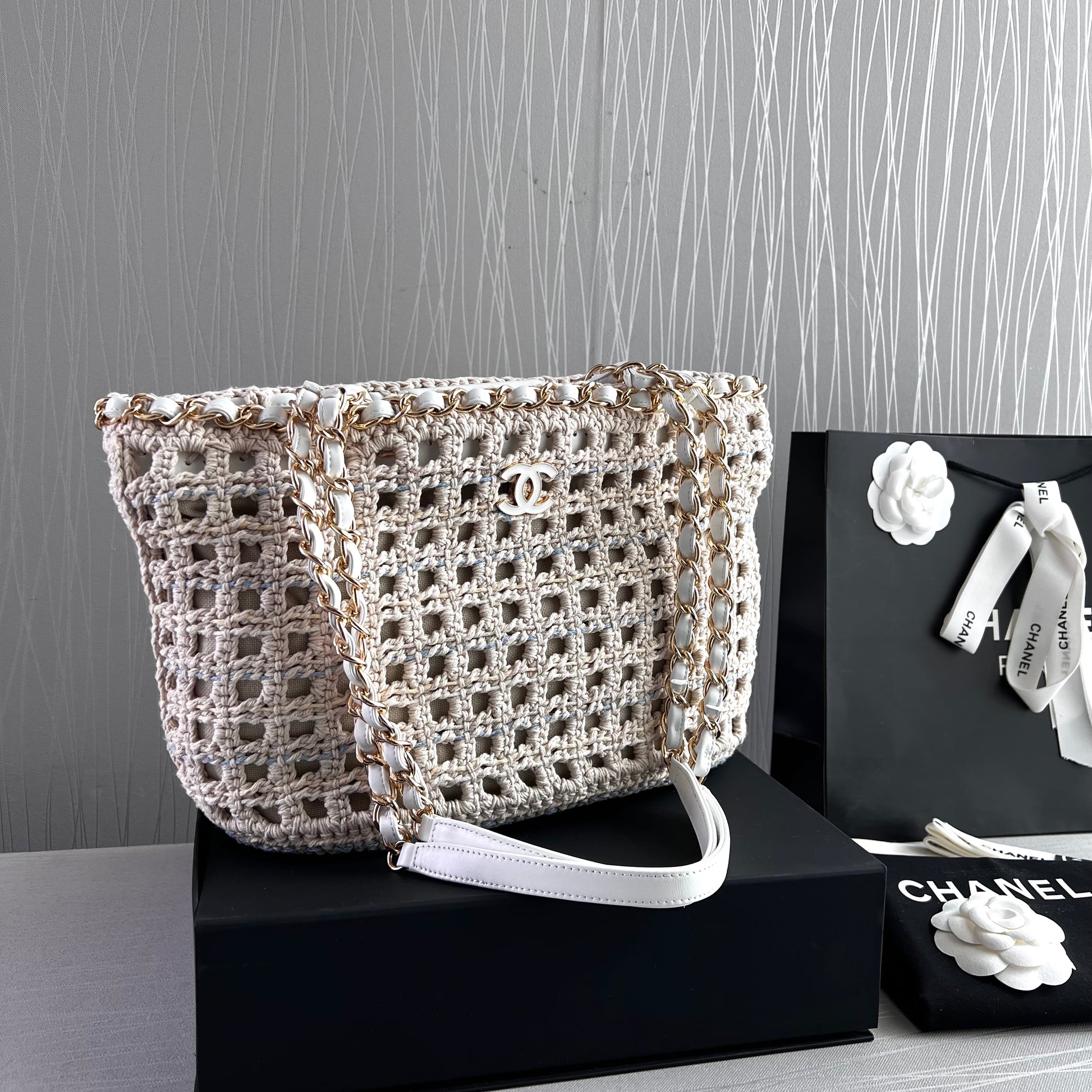 Bolso C tejido en algodón natural combinada con piel blanca. Herrajes dorados. Cierre de imán, interior lino.