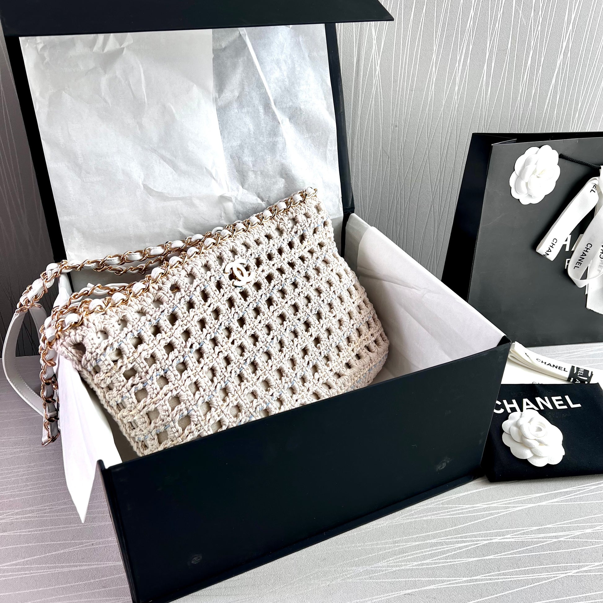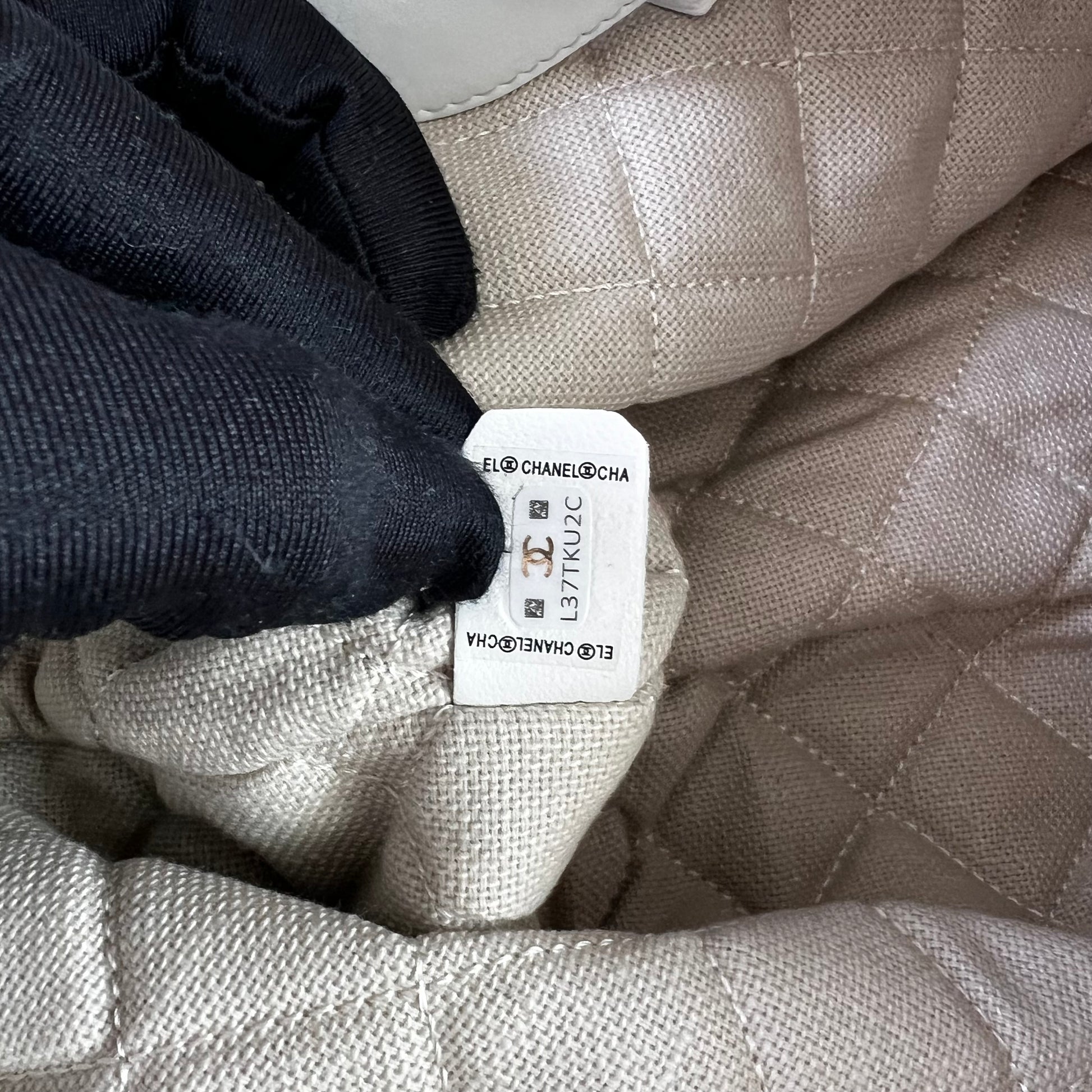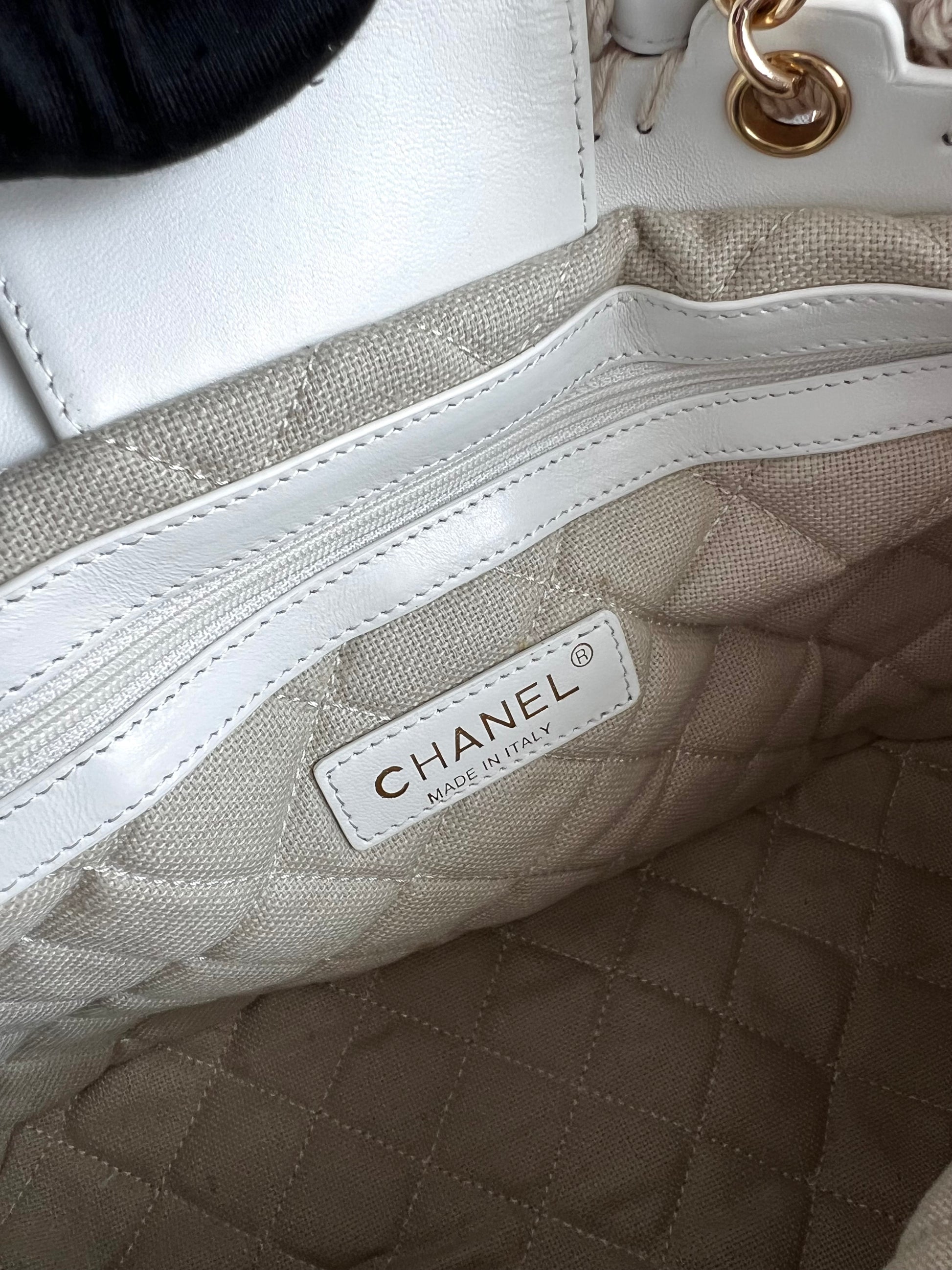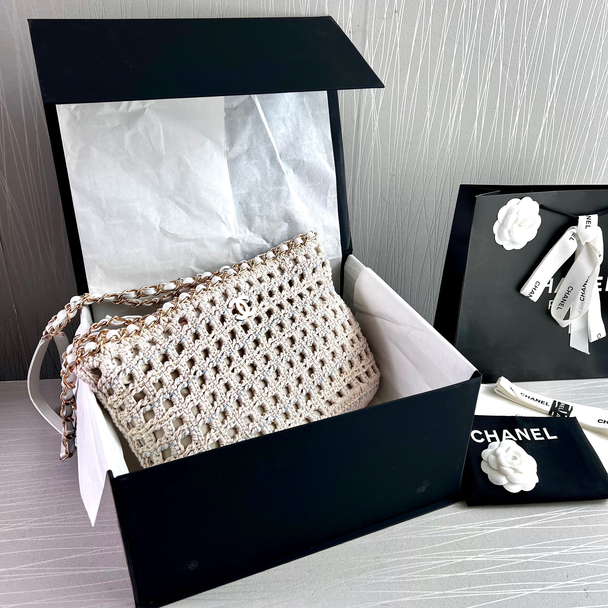 Bolso C tejido en algodón natural combinada con piel blanca. Herrajes dorados. Cierre de imán, interior lino.