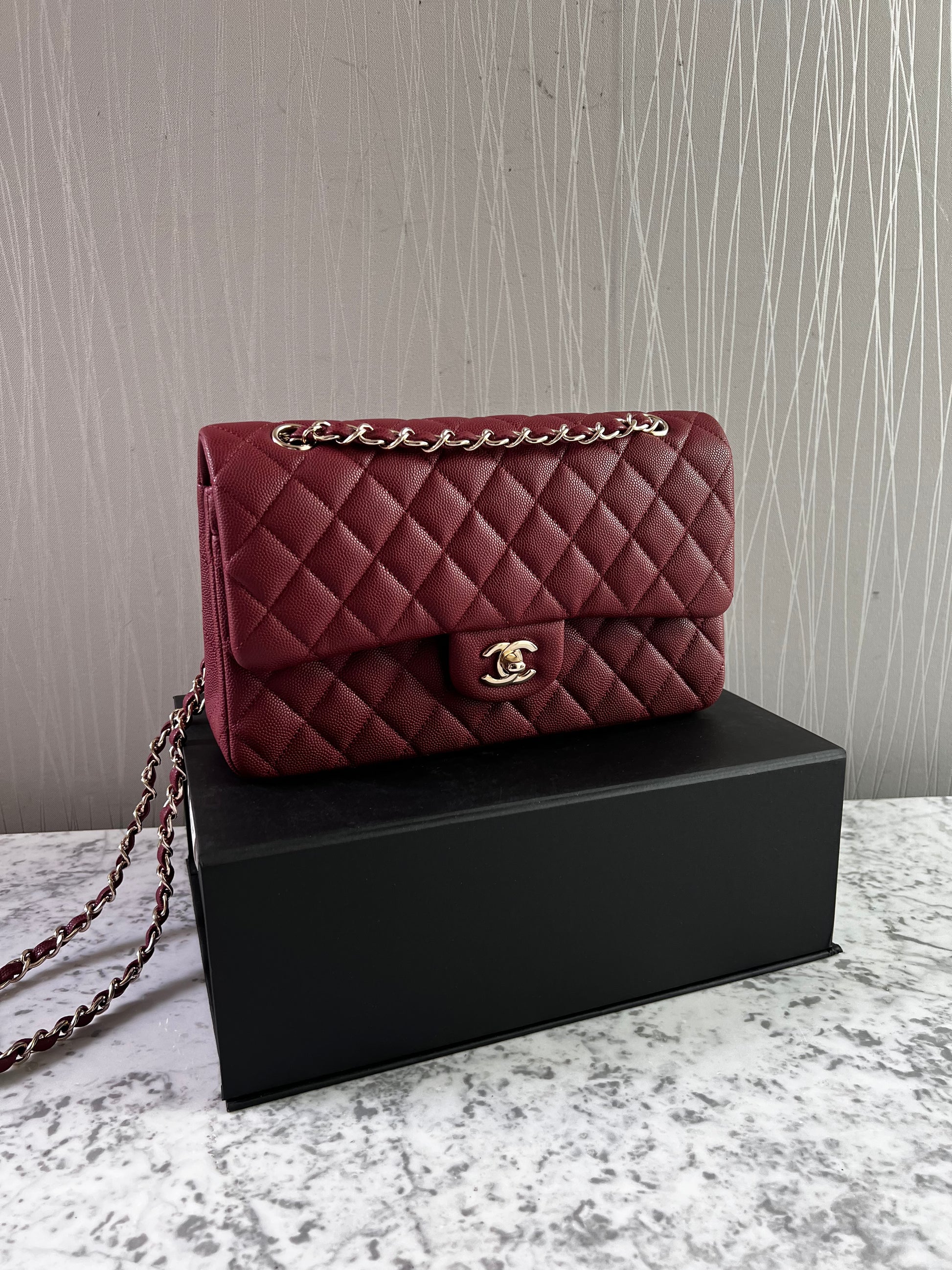 Bolso C-hanel piel caviar color vino. Herrajes color dorado pálido. Dimensiones 25.5 cm. Incluye caja imantada, guardapolvo, shopping bag, flor y listón.