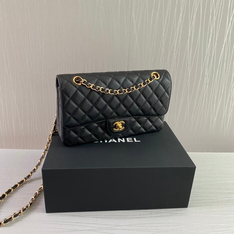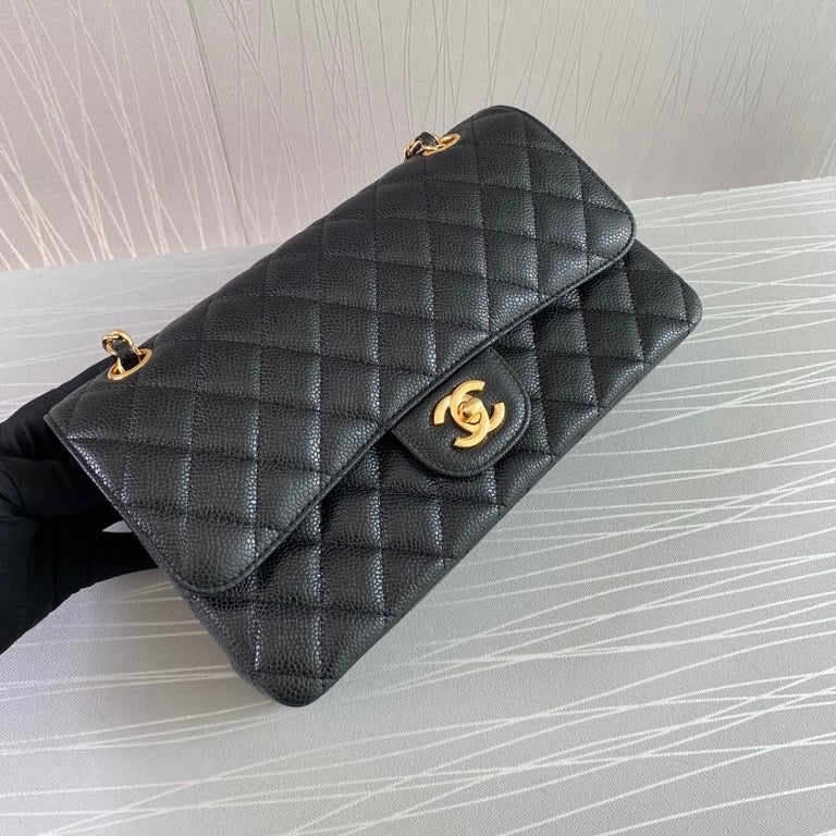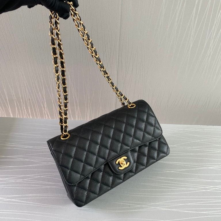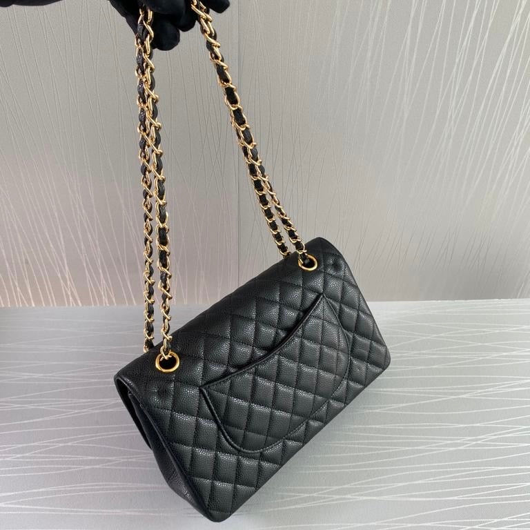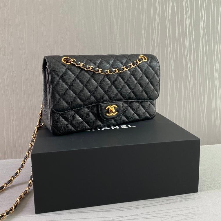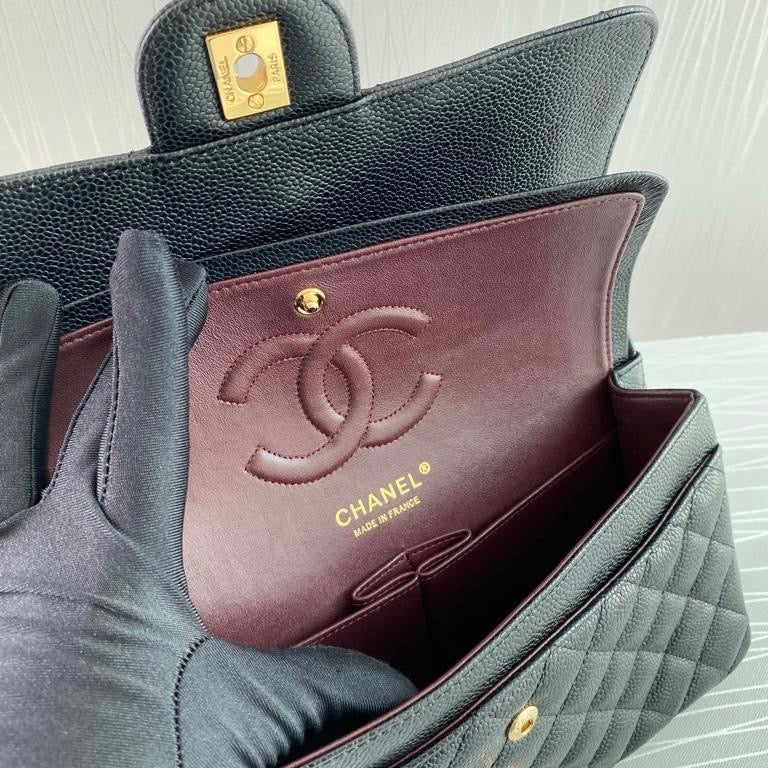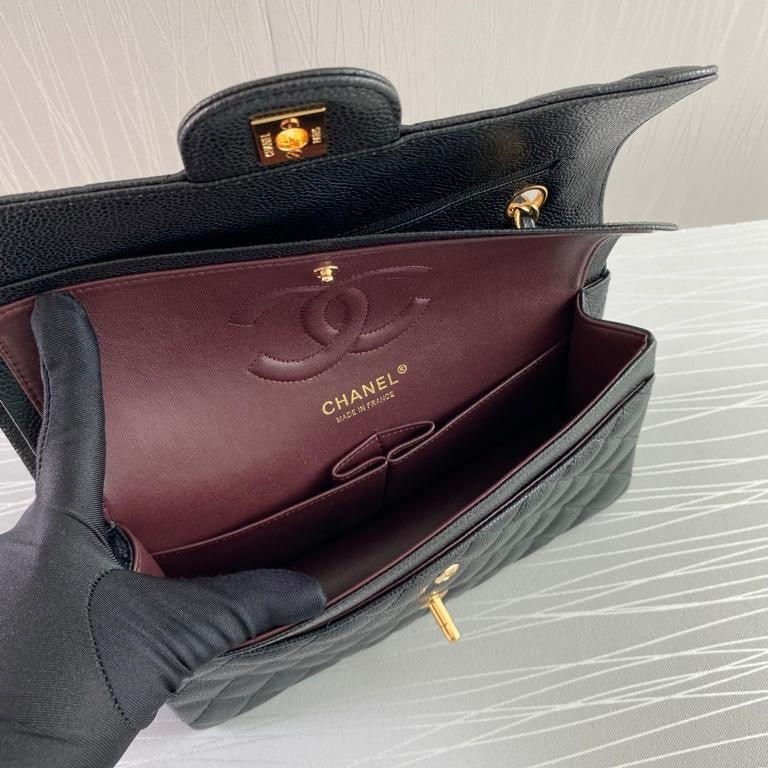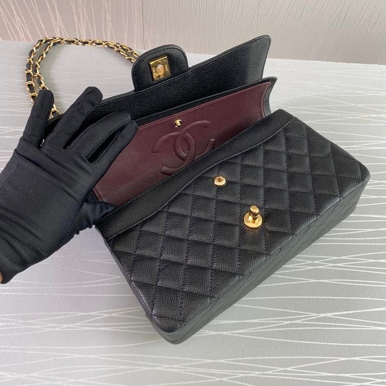 Bolso Classic 25.5 cm en color negro piel caviar, interior en color vino, herrajes color dorado, incluye caja imantada, bolsa guardapolvo, shopping bag, listón y flor.