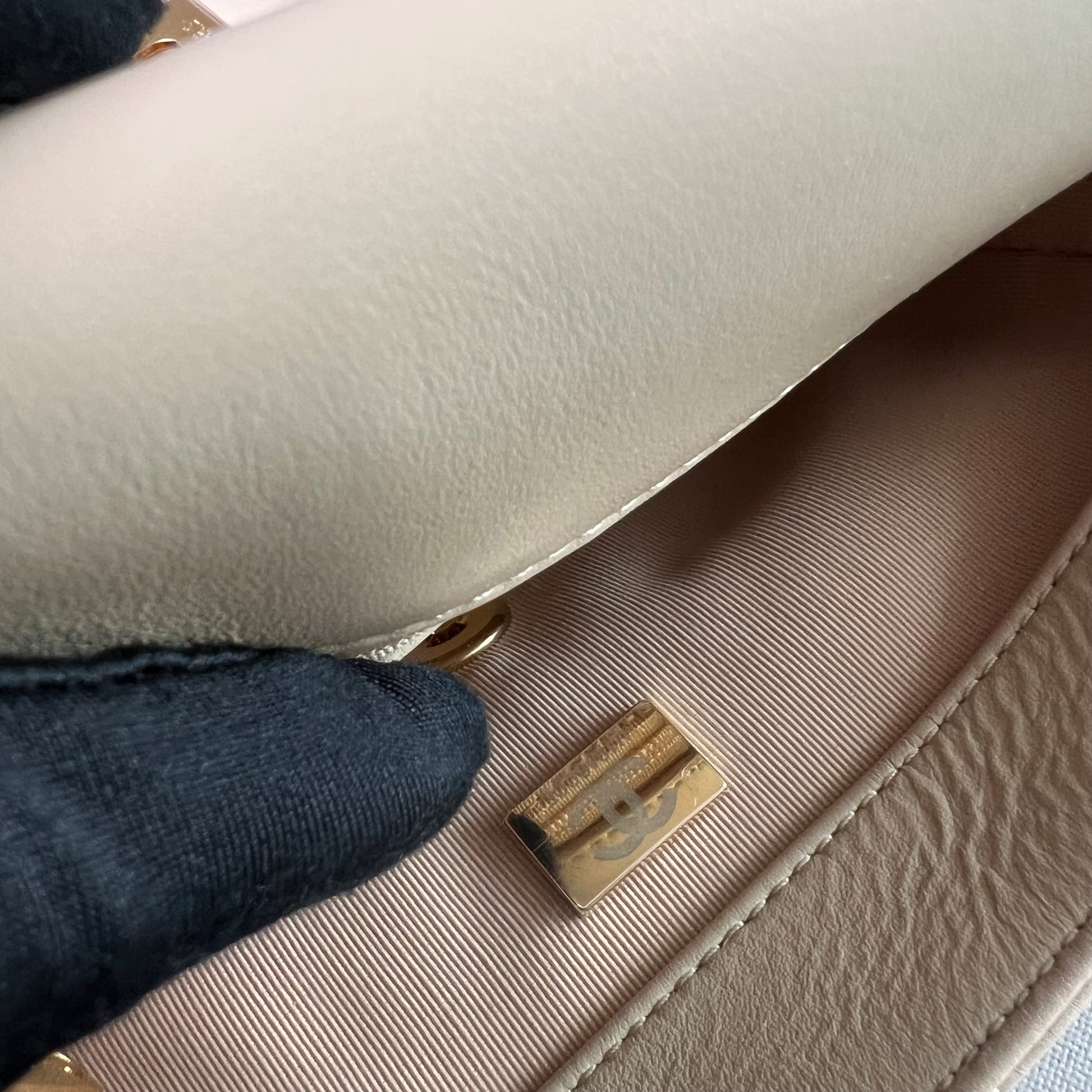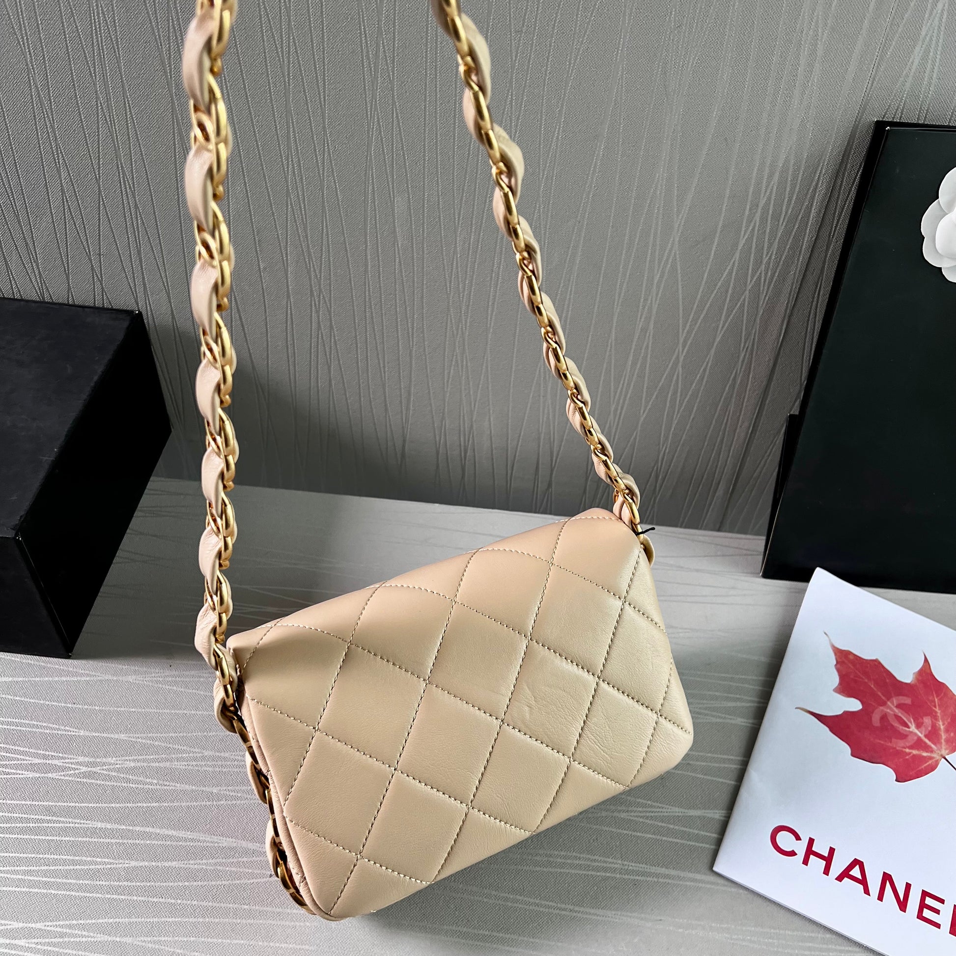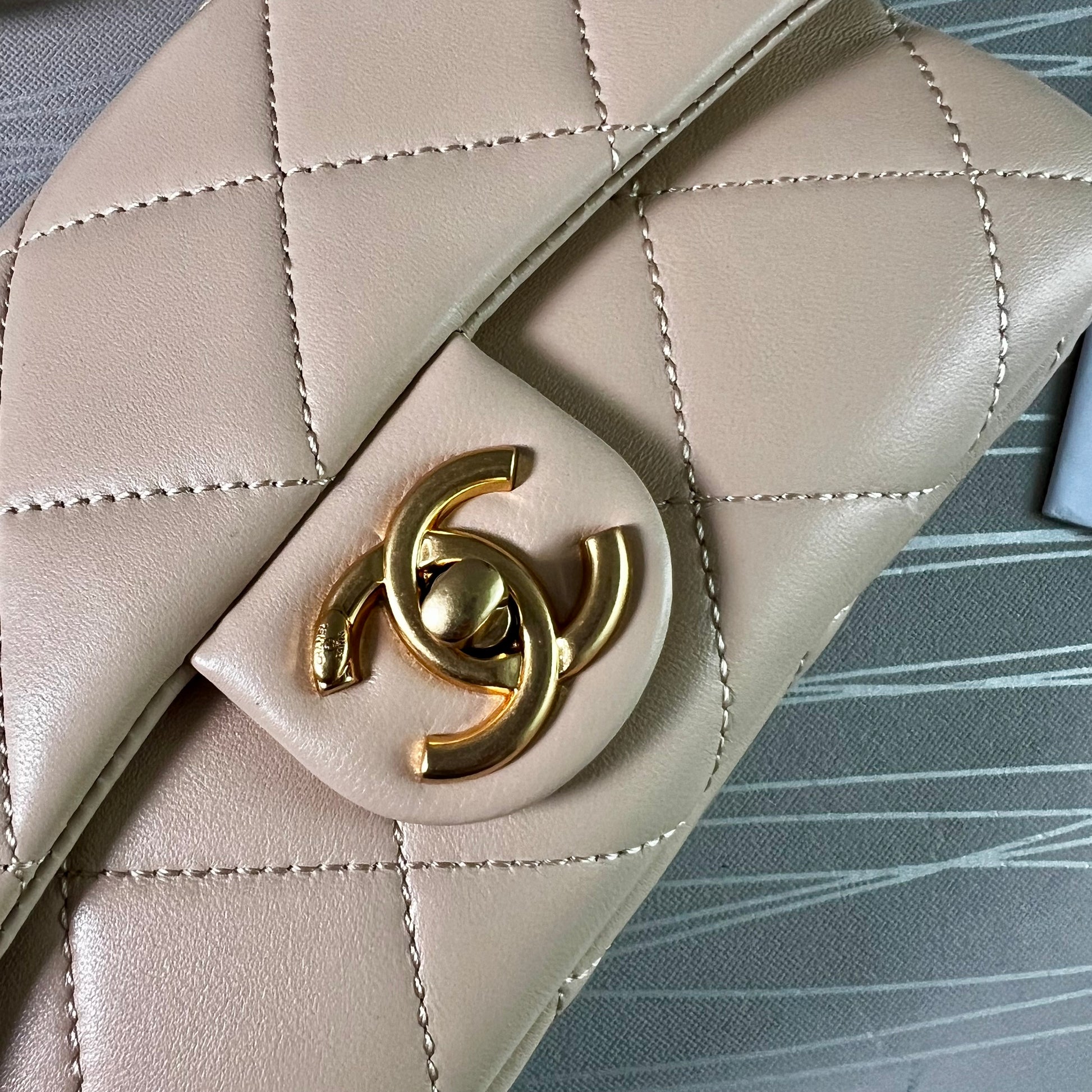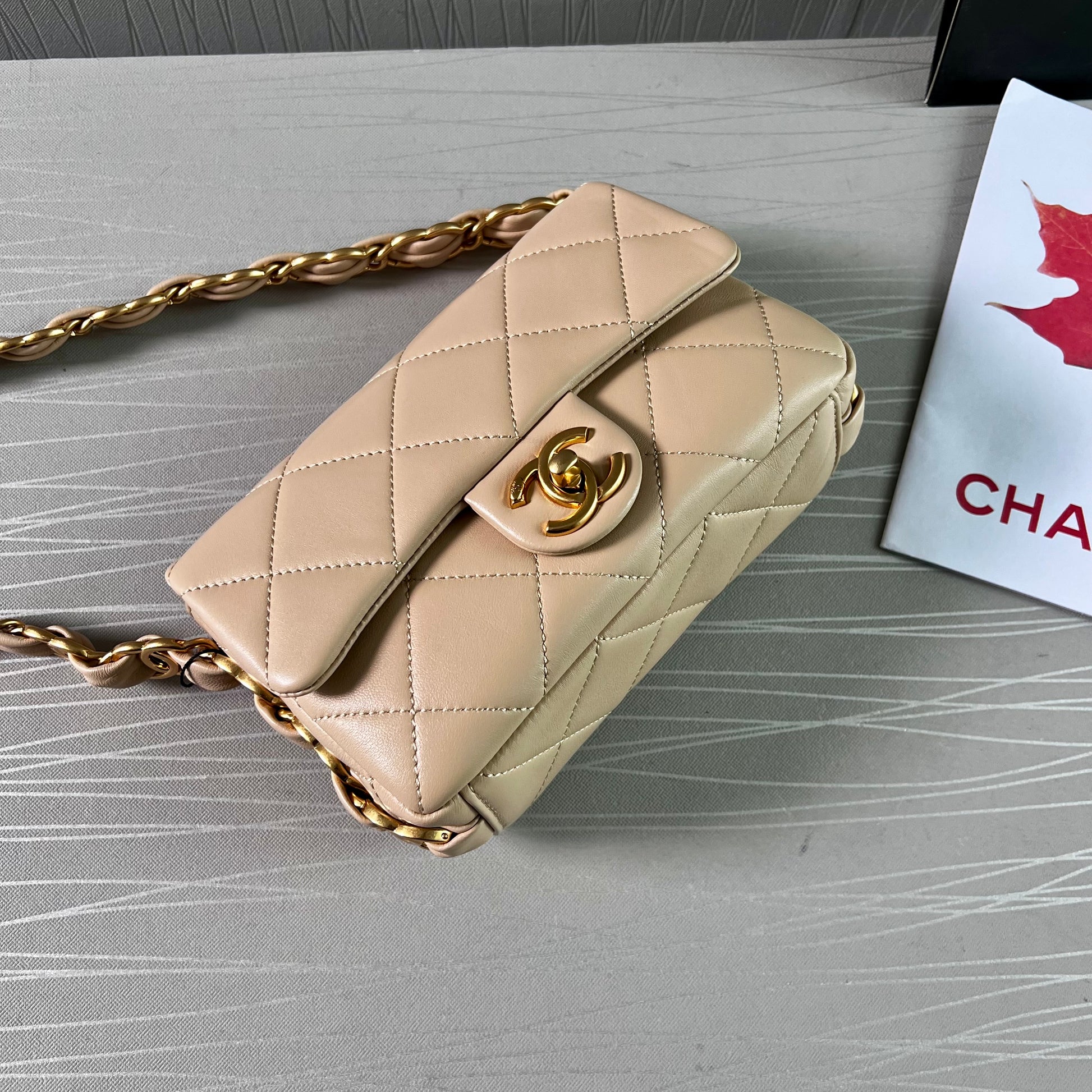 Bolso C piel color beige, herrajes dorados vintage, dimensiones 20 cm. Incluye guardapolvo, caja, listón flor y shopping bag.