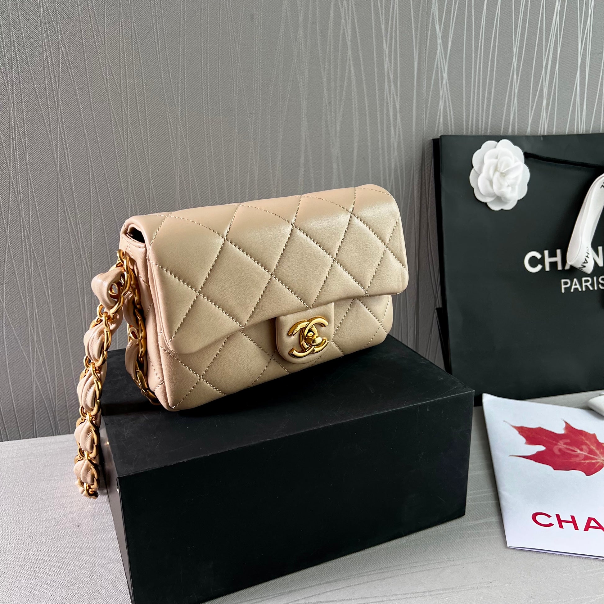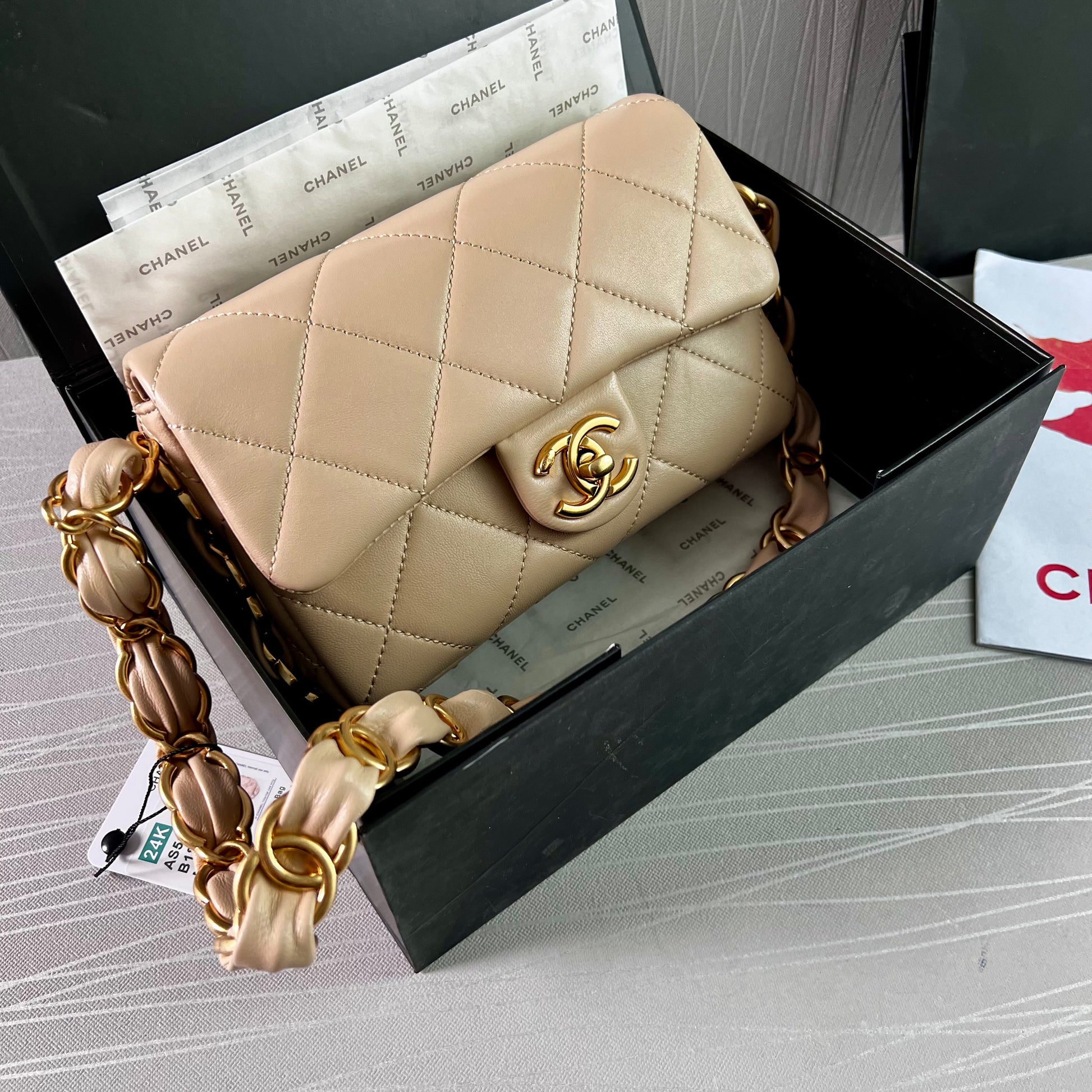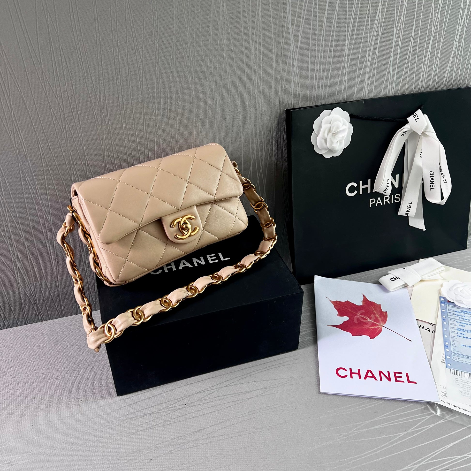 Bolso C piel color beige, herrajes dorados vintage, dimensiones 20 cm. Incluye guardapolvo, caja, listón flor y shopping bag.