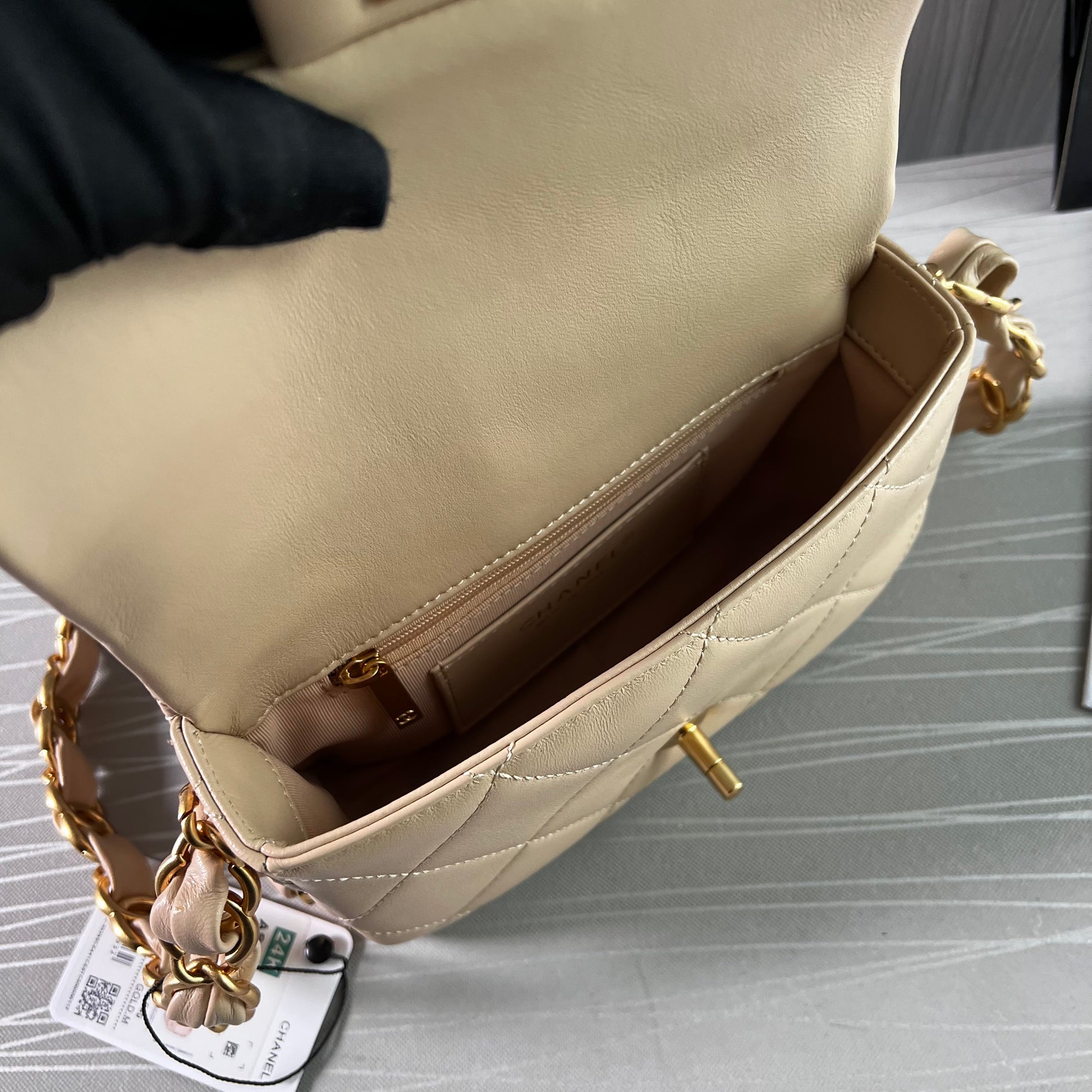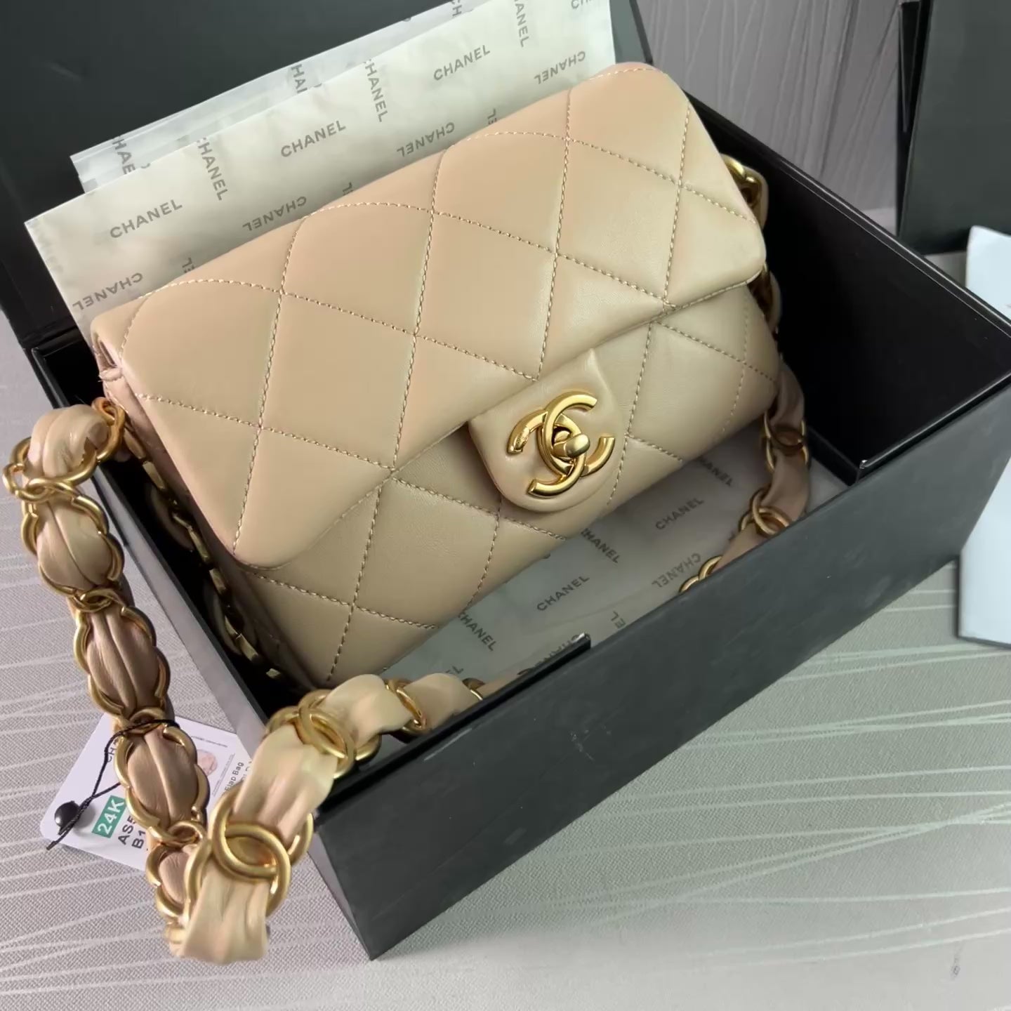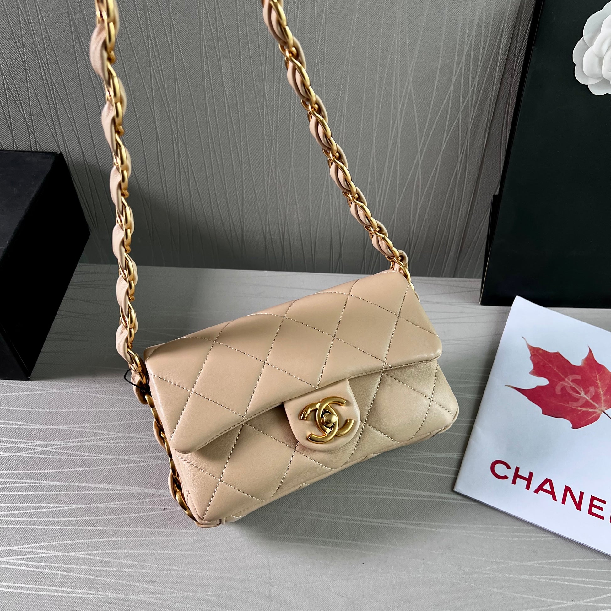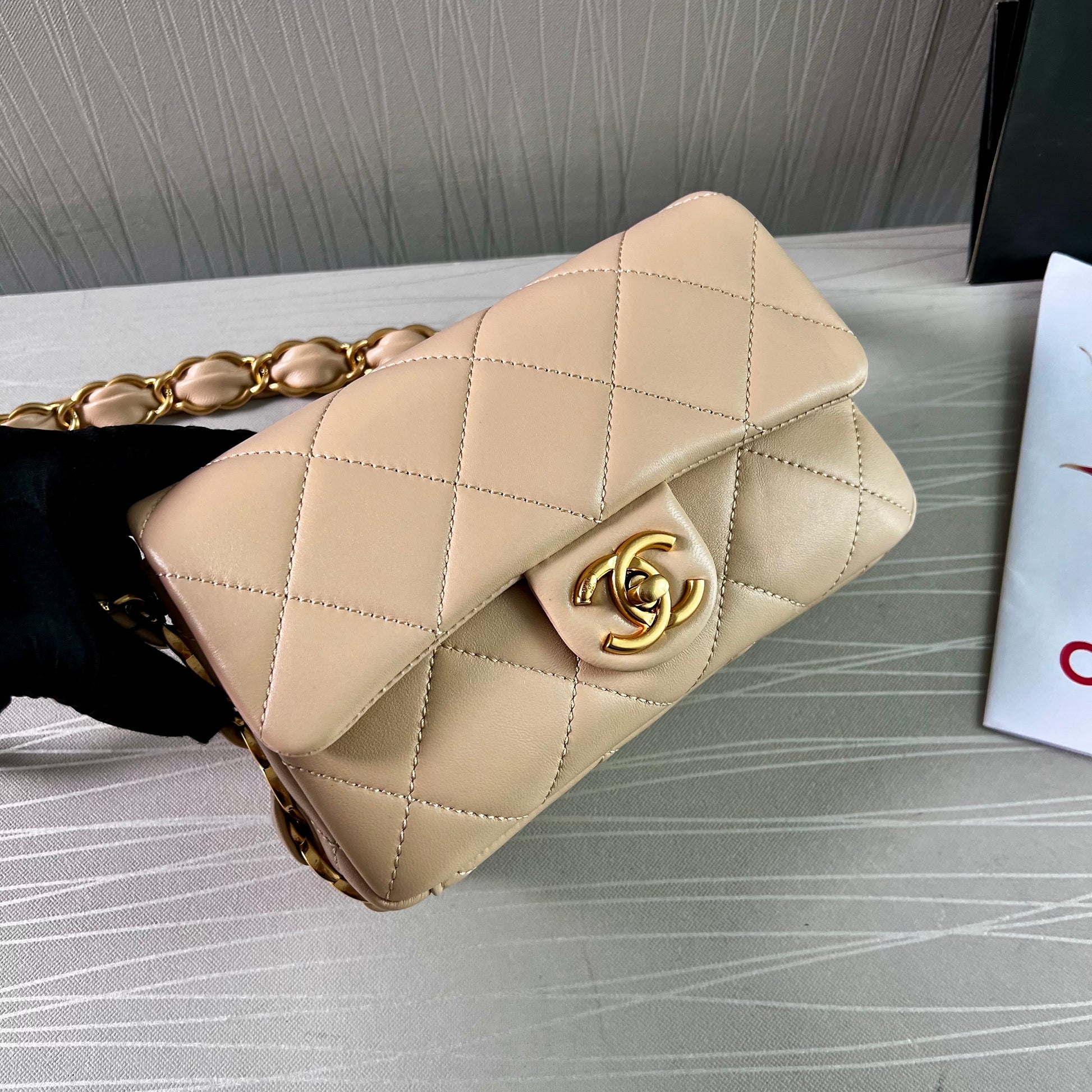 Bolso C piel color beige, herrajes dorados vintage, dimensiones 20 cm. Incluye guardapolvo, caja, listón flor y shopping bag.
