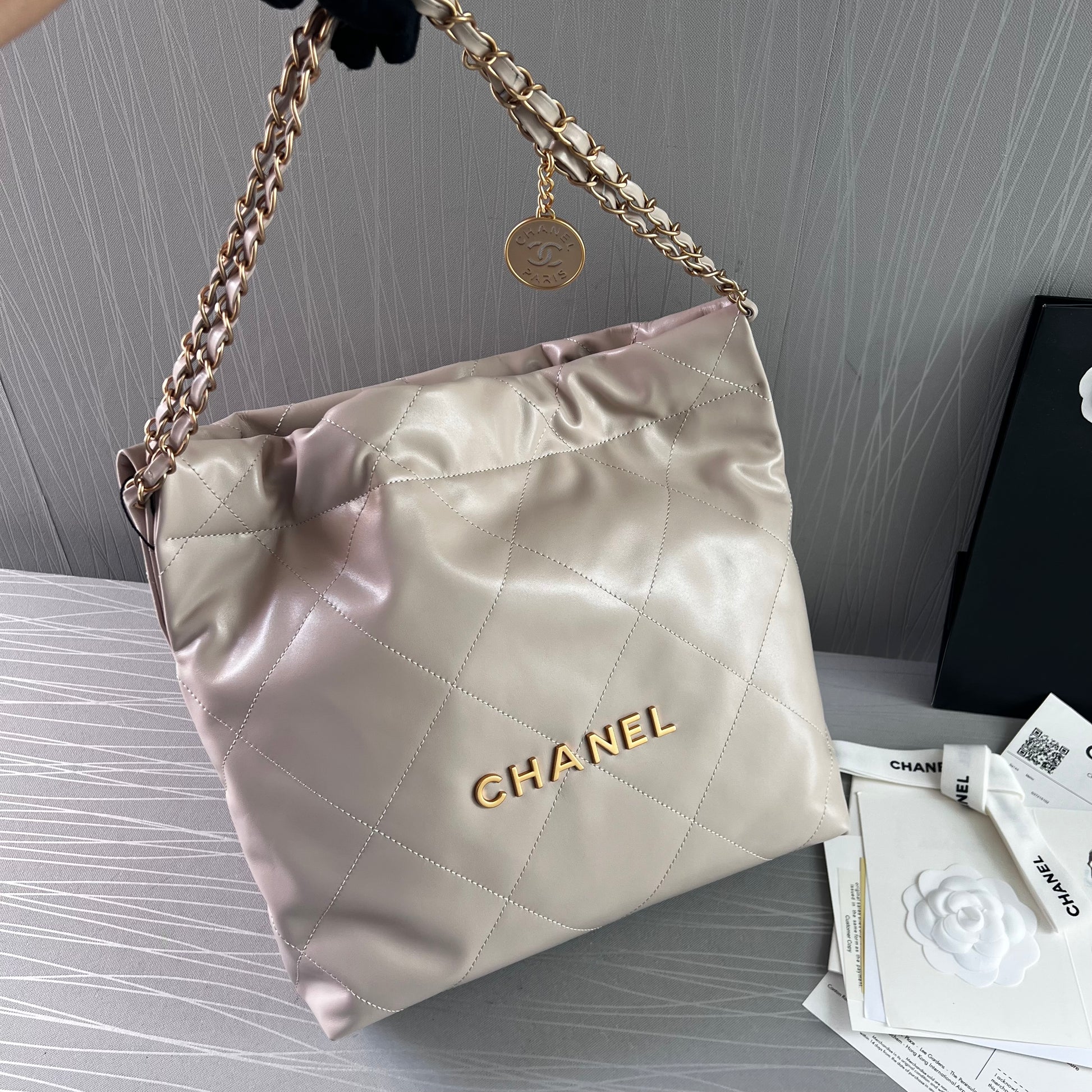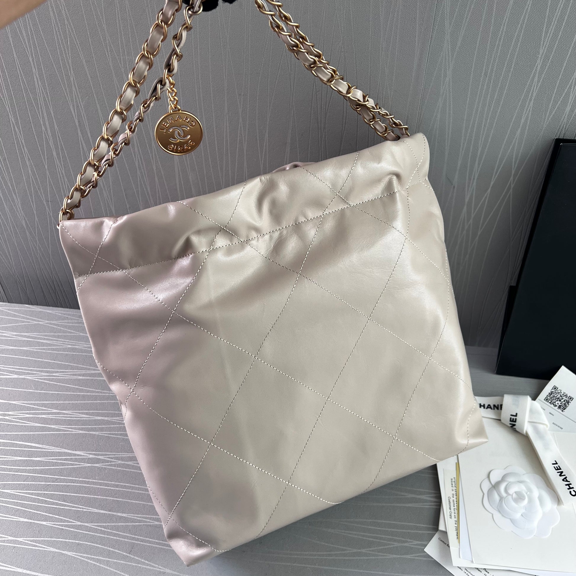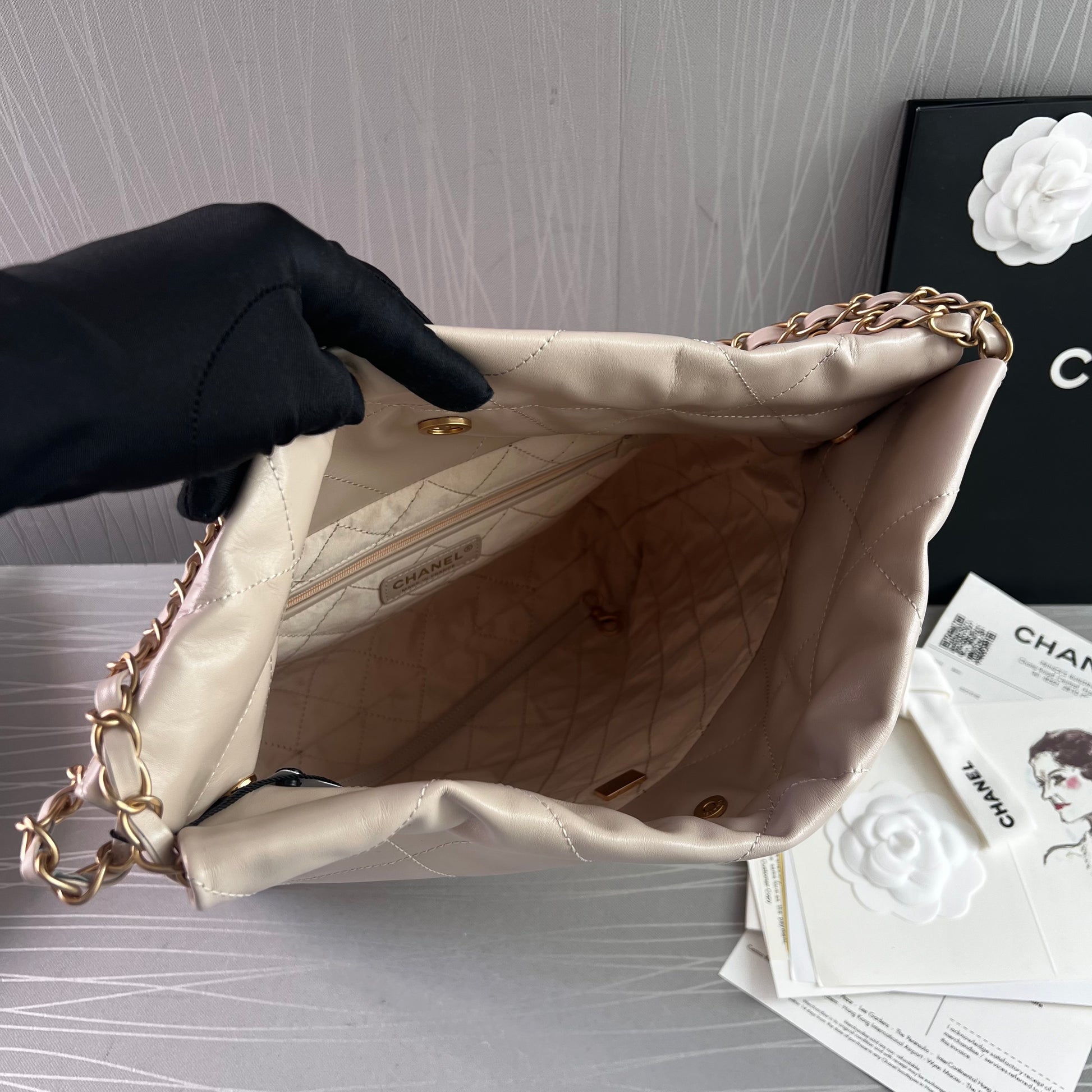 Bolso C piel color beige claro, herrajes dorados . Incluye caja imantada, bolso guardapolvo, shopping bag, flor y listón. Dimensiones 35 x 37 x 7 cm.