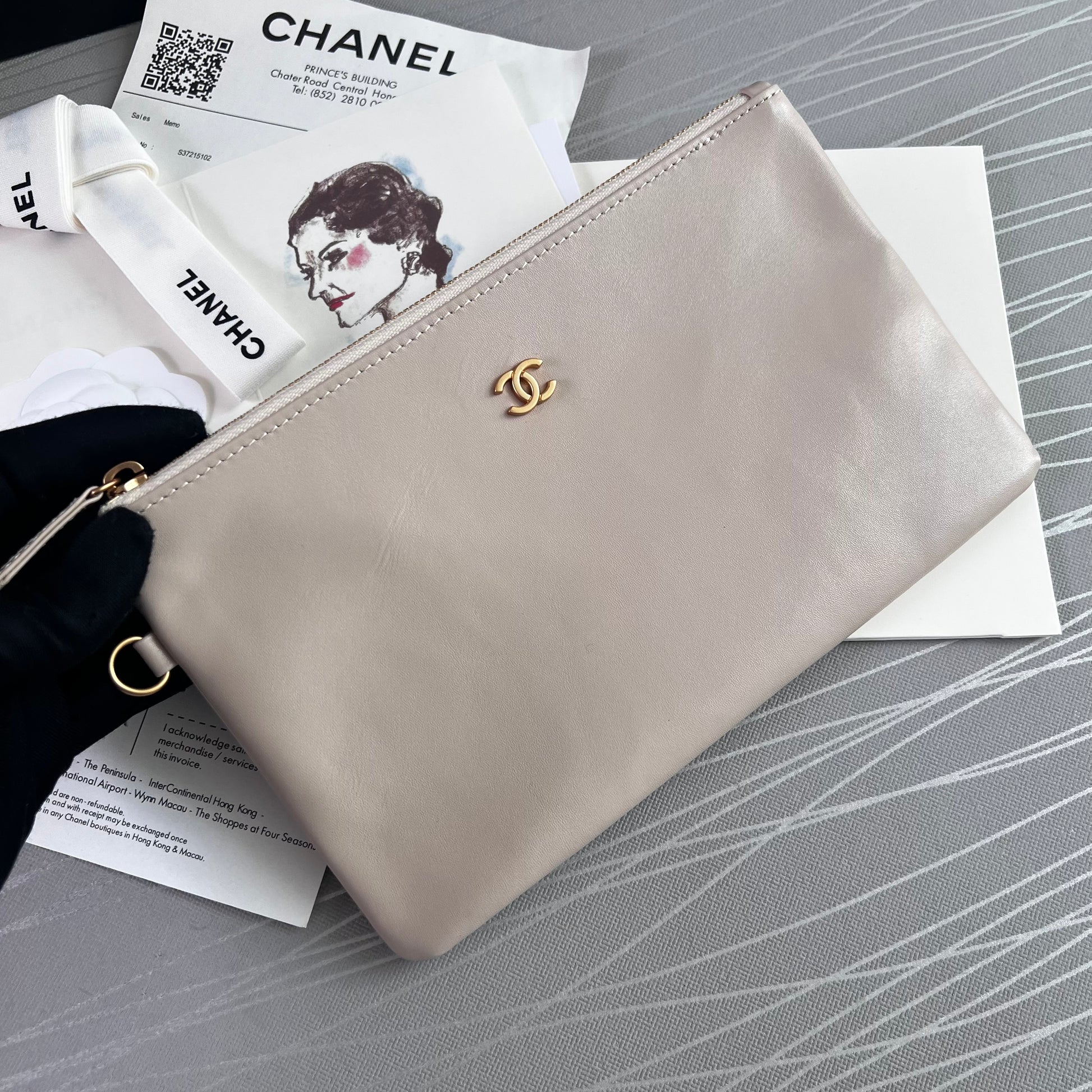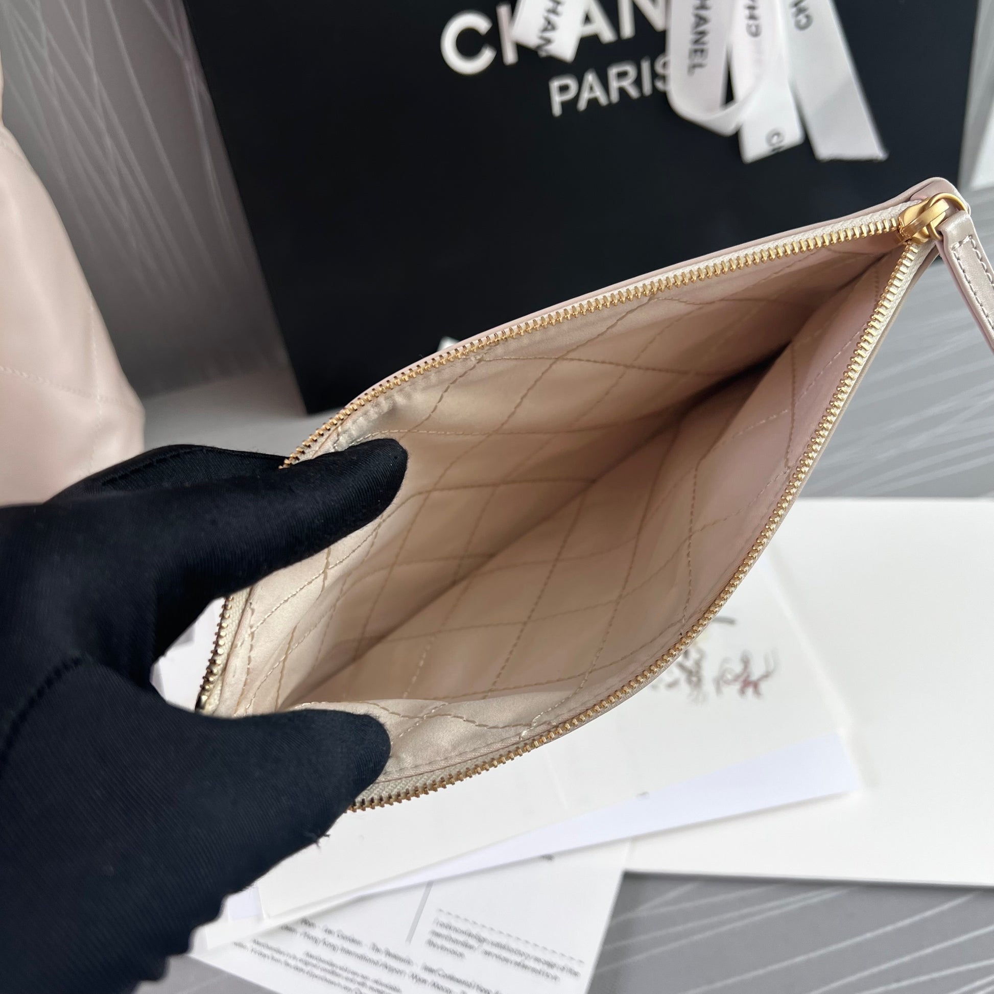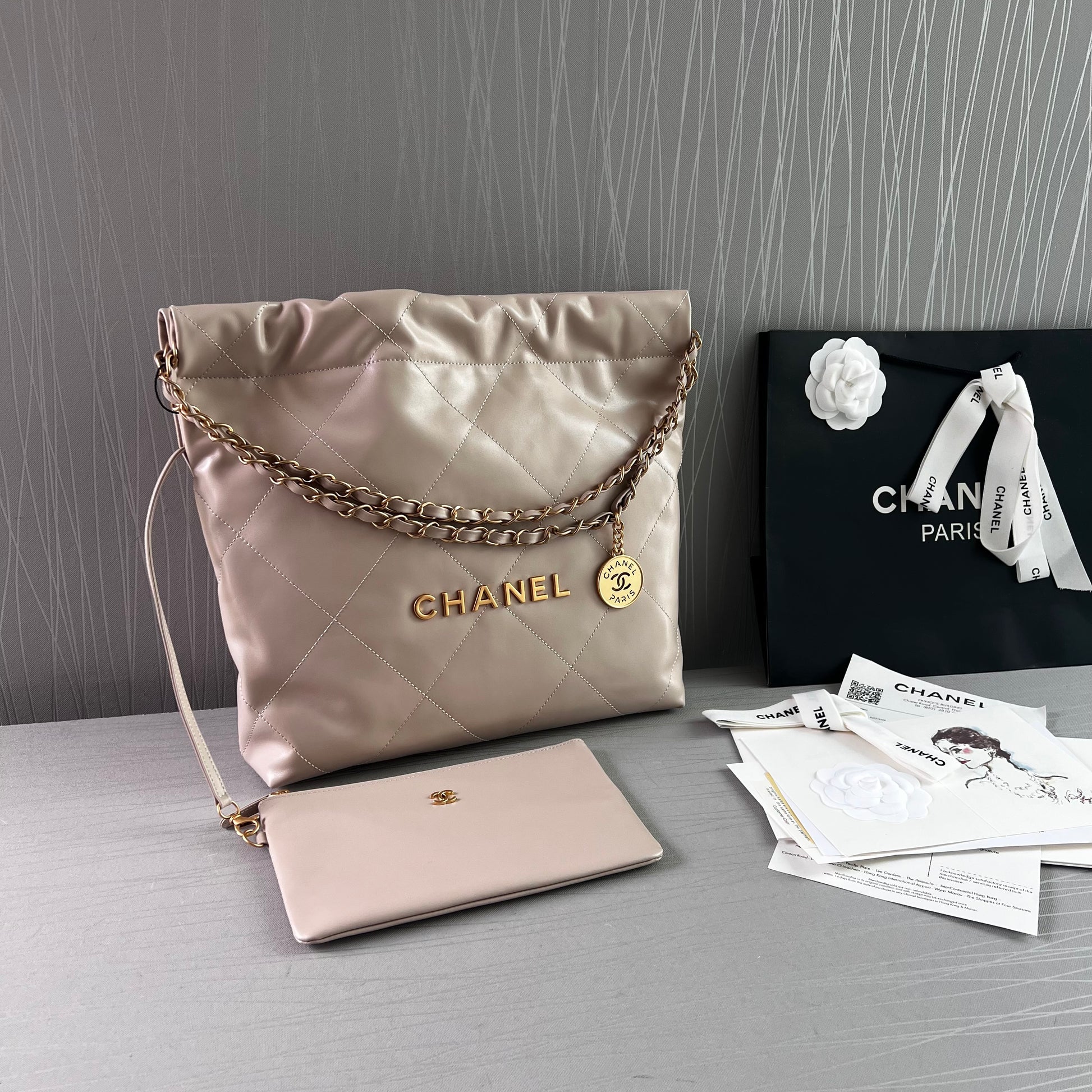 Bolso C piel color beige claro, herrajes dorados . Incluye caja imantada, bolso guardapolvo, shopping bag, flor y listón. Dimensiones 35 x 37 x 7 cm.