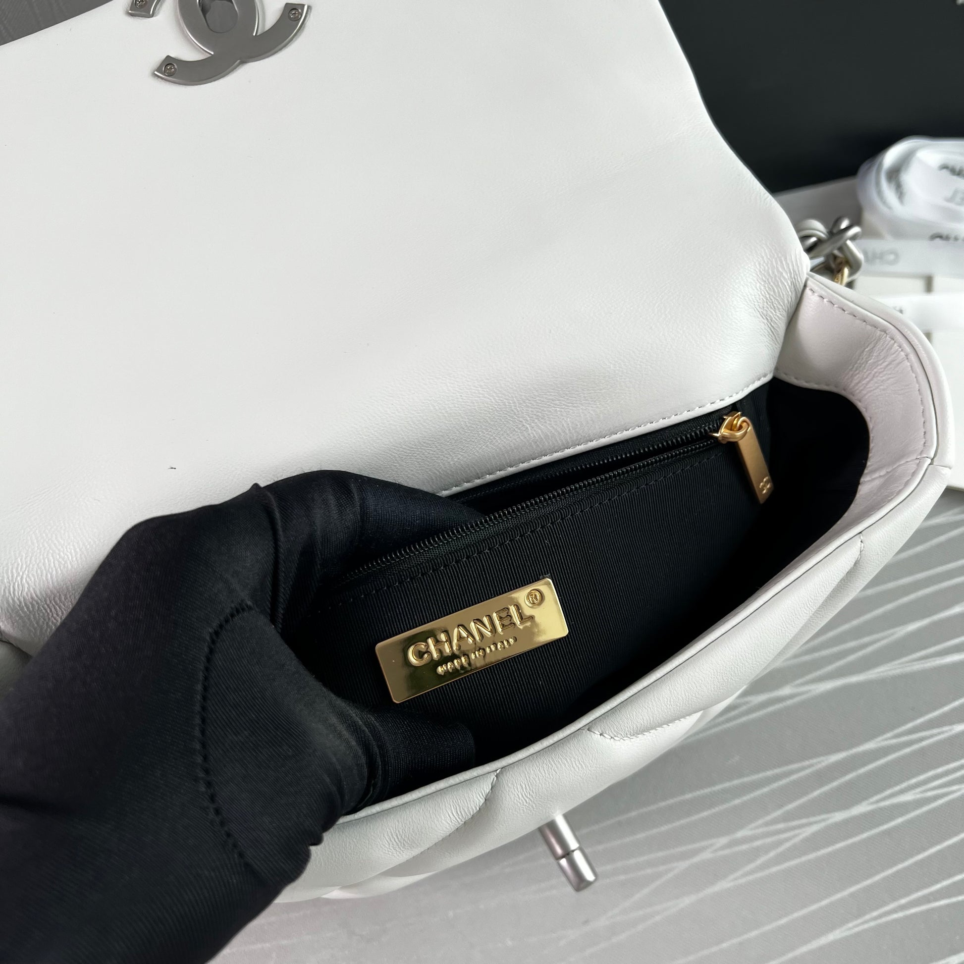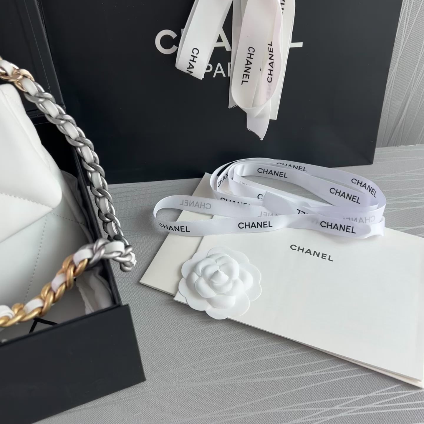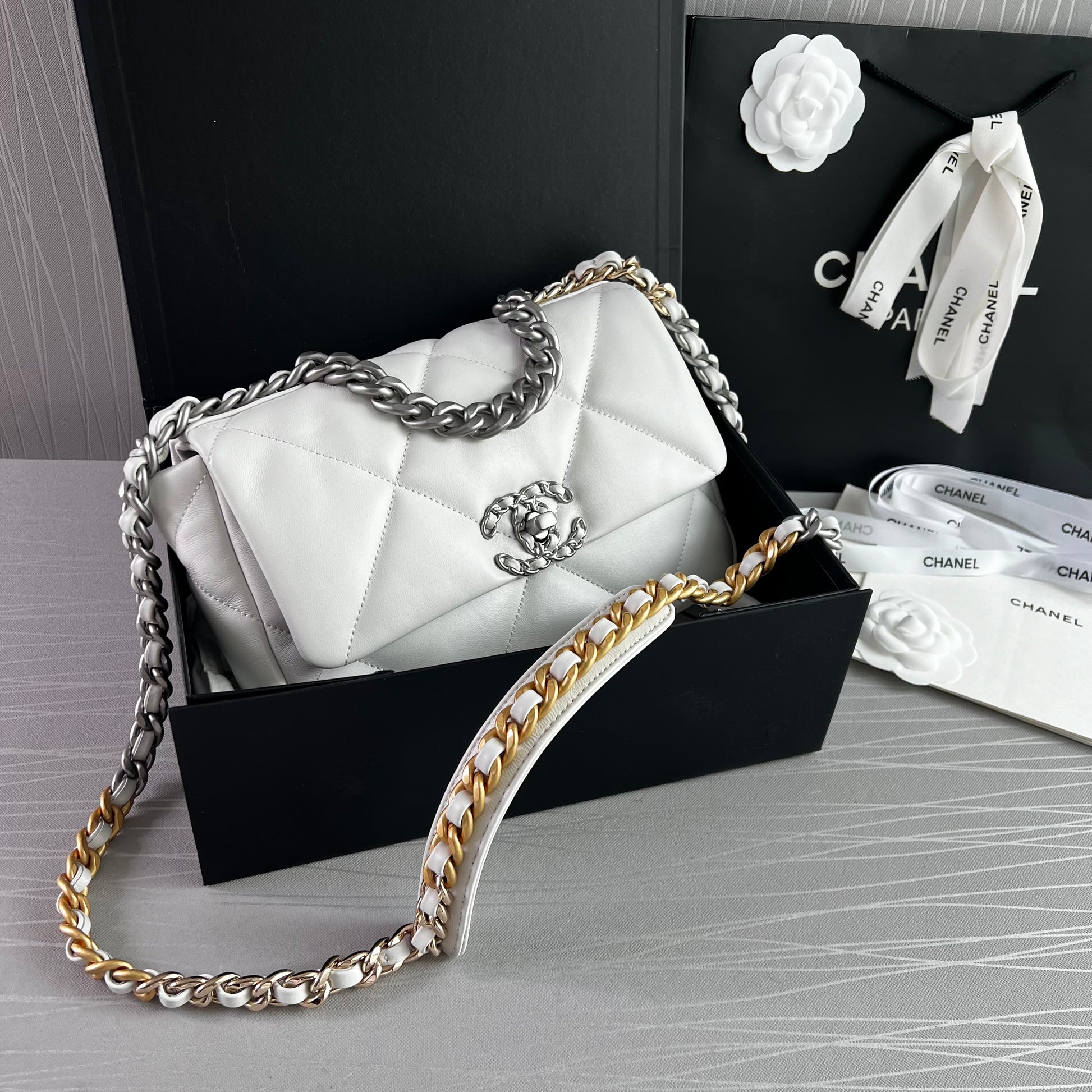 Bolso en piel color blanco, 26 cm, herrajes en 3 colores, incluye caja, shopping bag, bolsa guardapolvo, flor y listón.