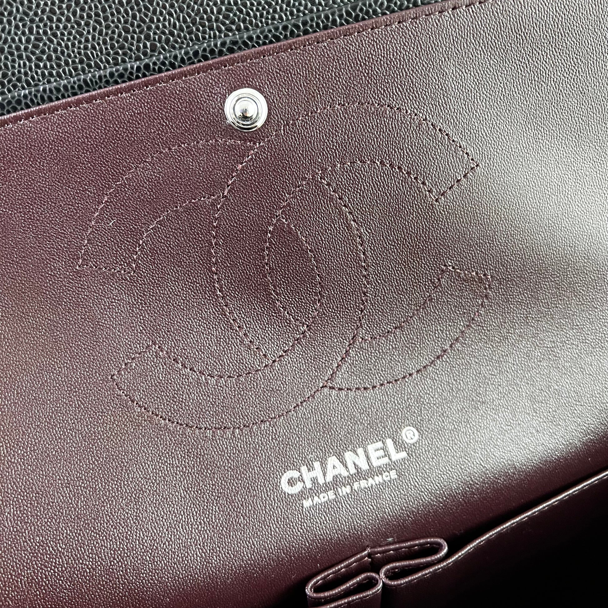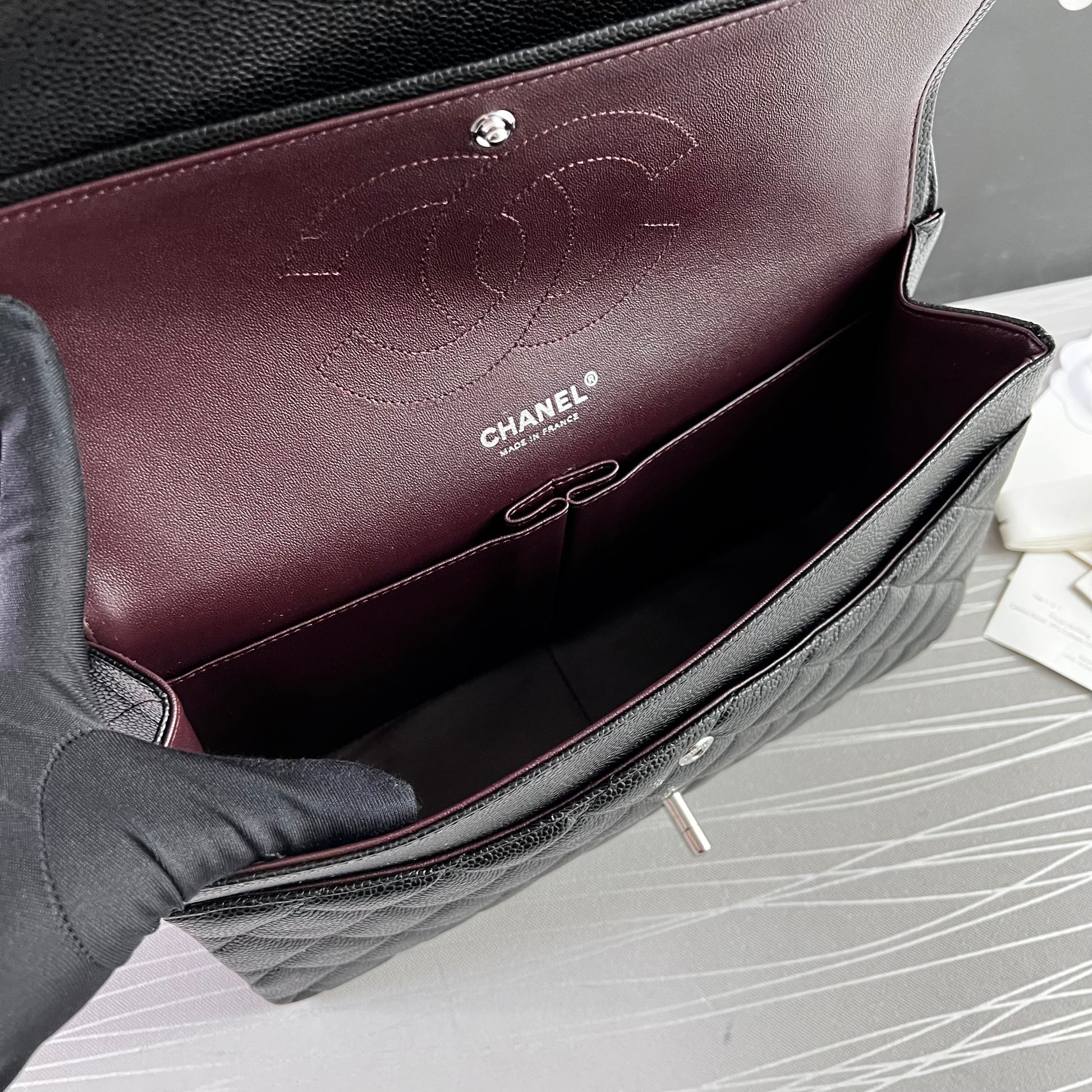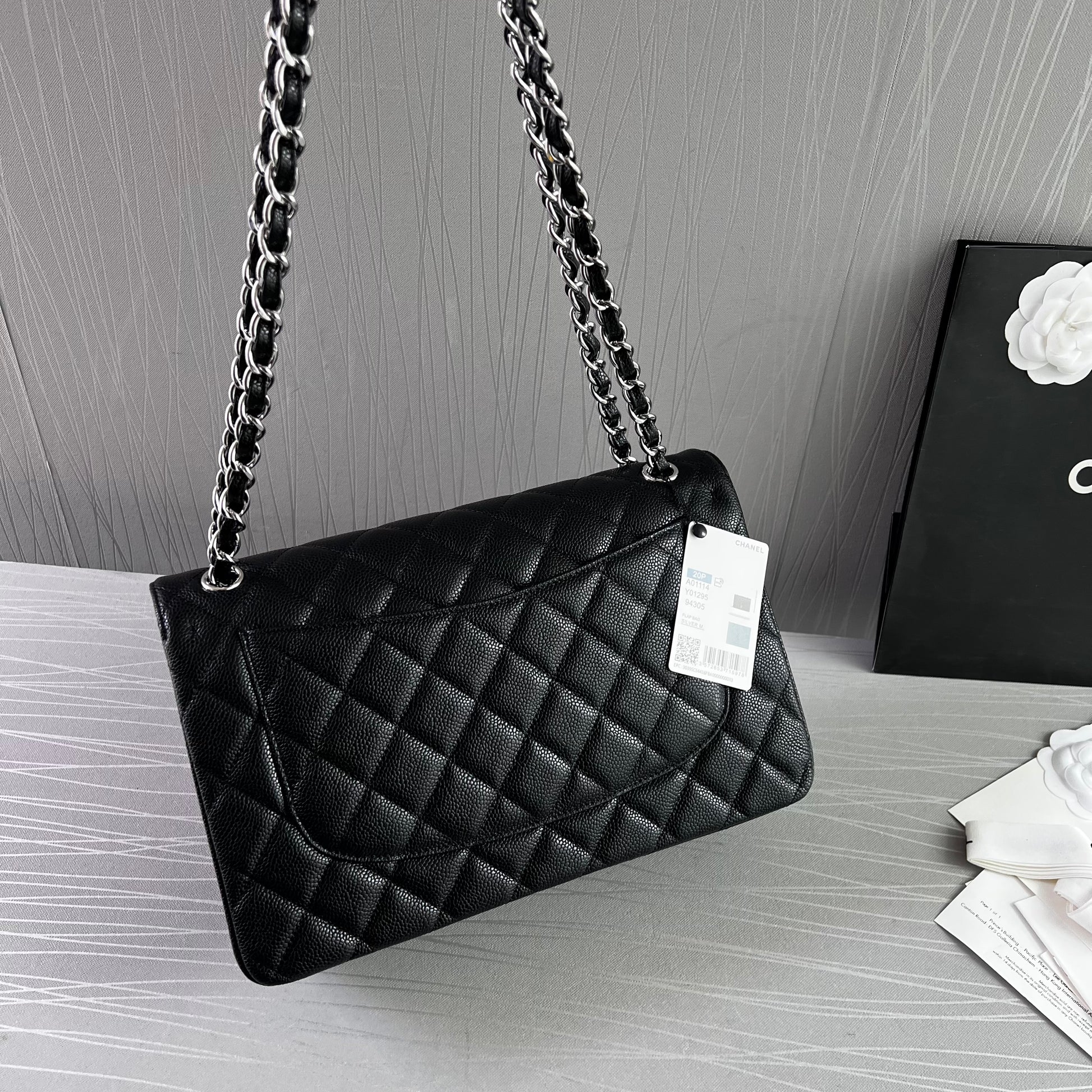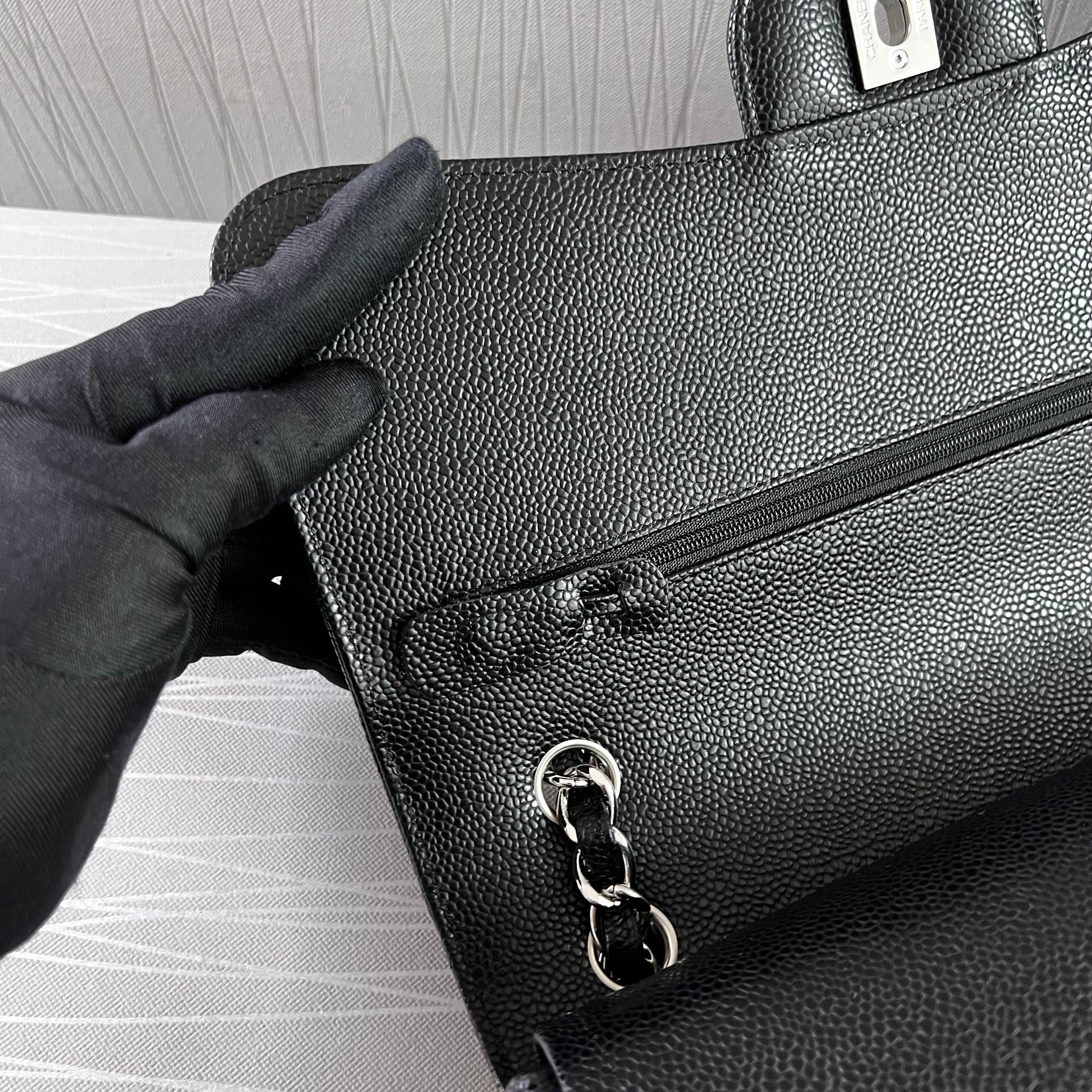 Bolso C piel caviar color negro, herrajes plateados. Dimensiones 30 cm. Incluye caja imantada, guardapolvo, flor y listón. Shopping Bag