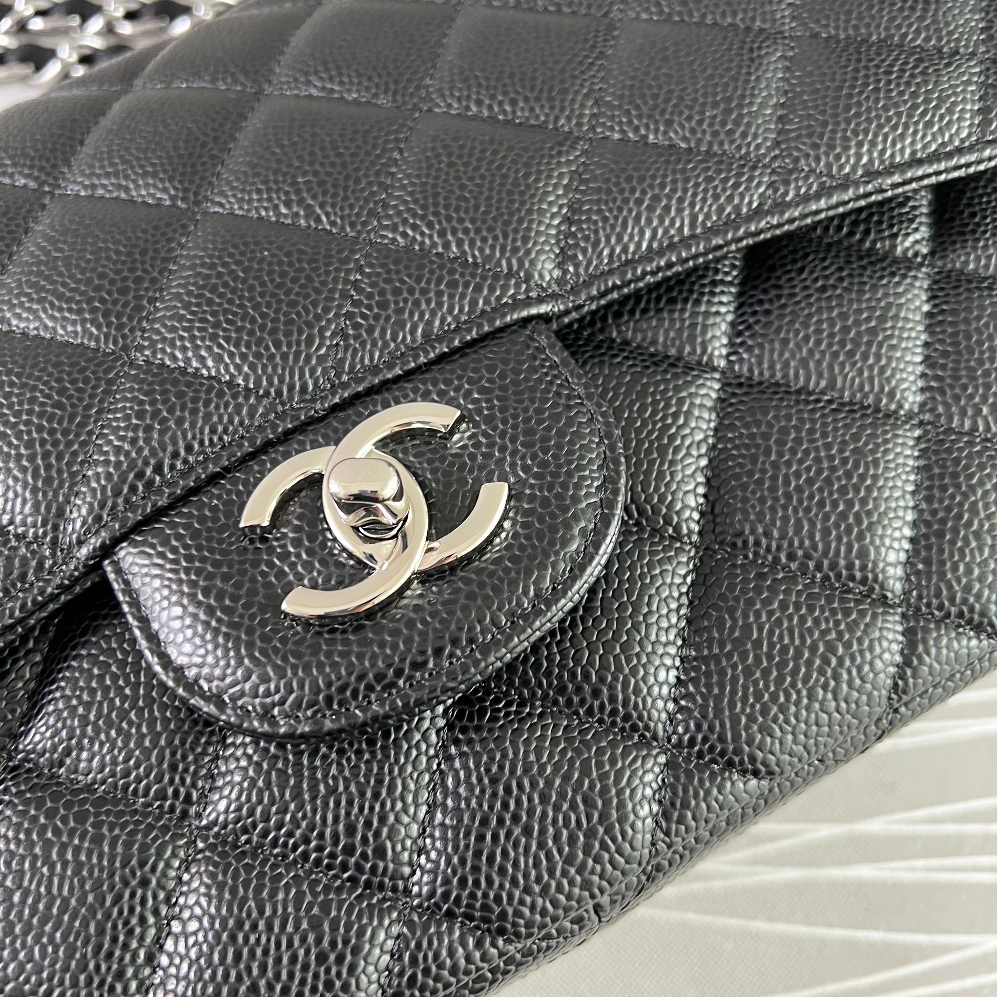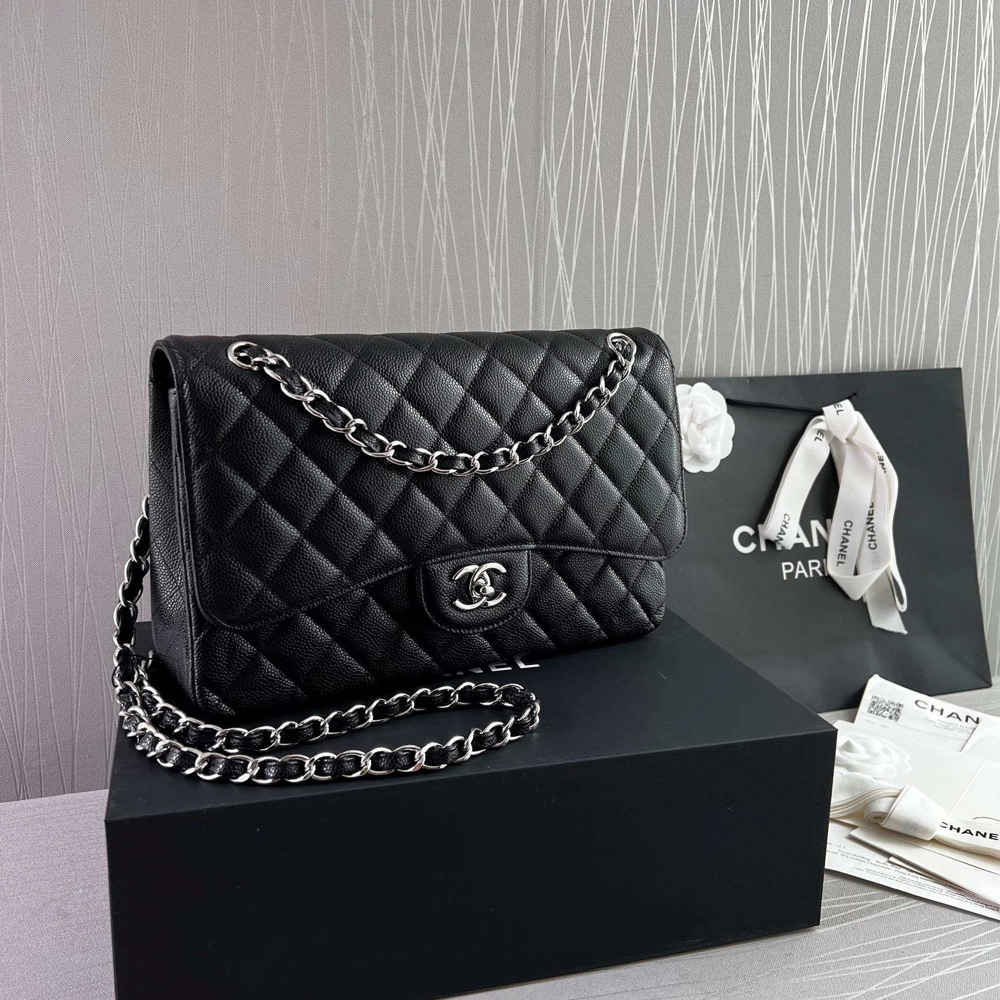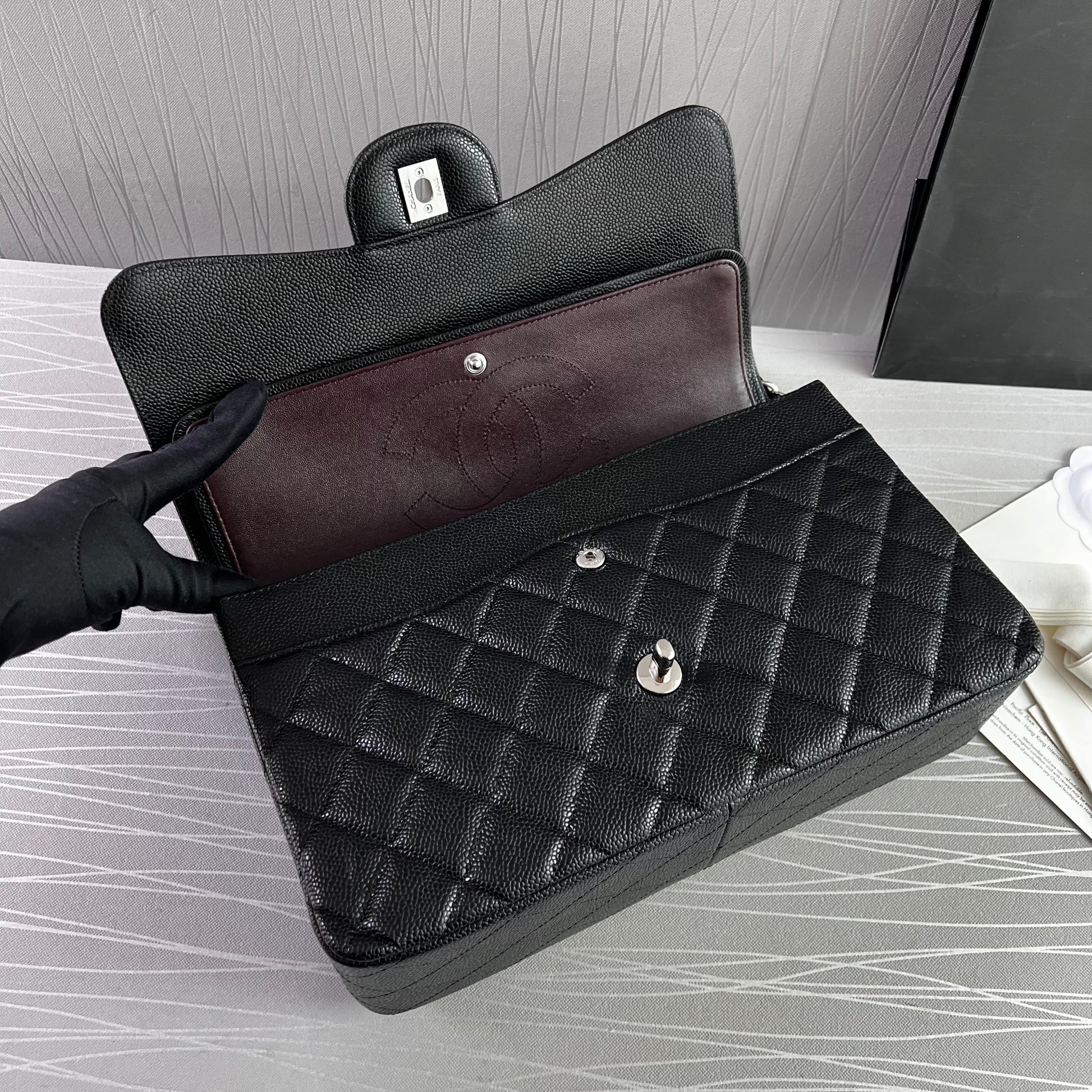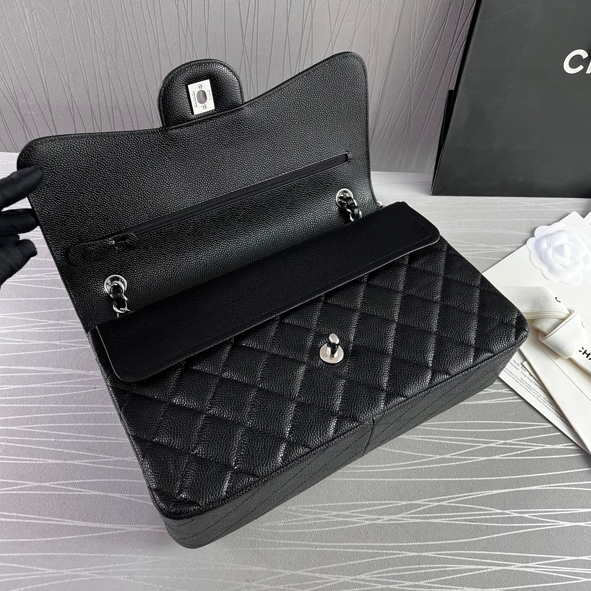 Bolso C piel caviar color negro, herrajes plateados. Dimensiones 30 cm. Incluye caja imantada, guardapolvo, flor y listón. Shopping Bag