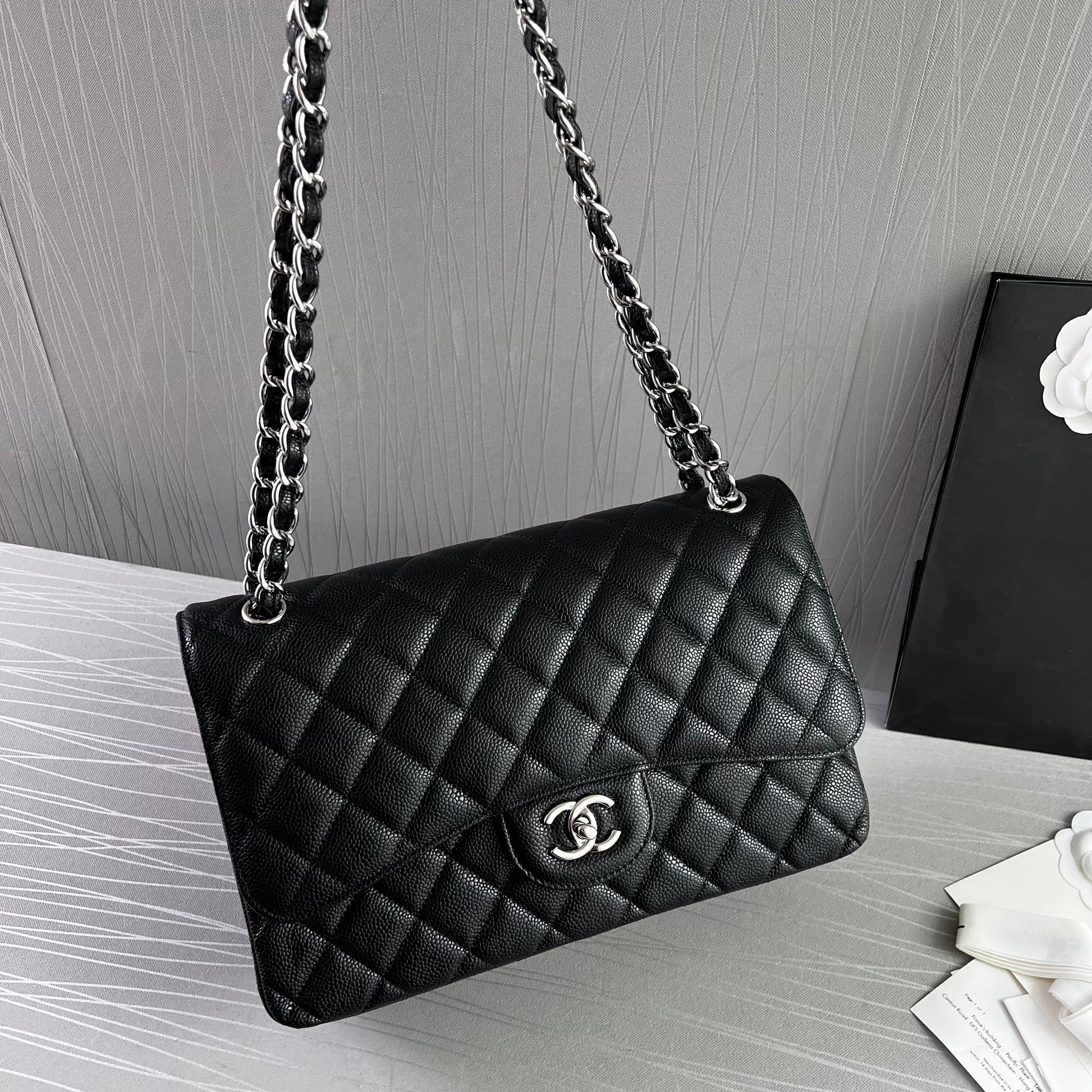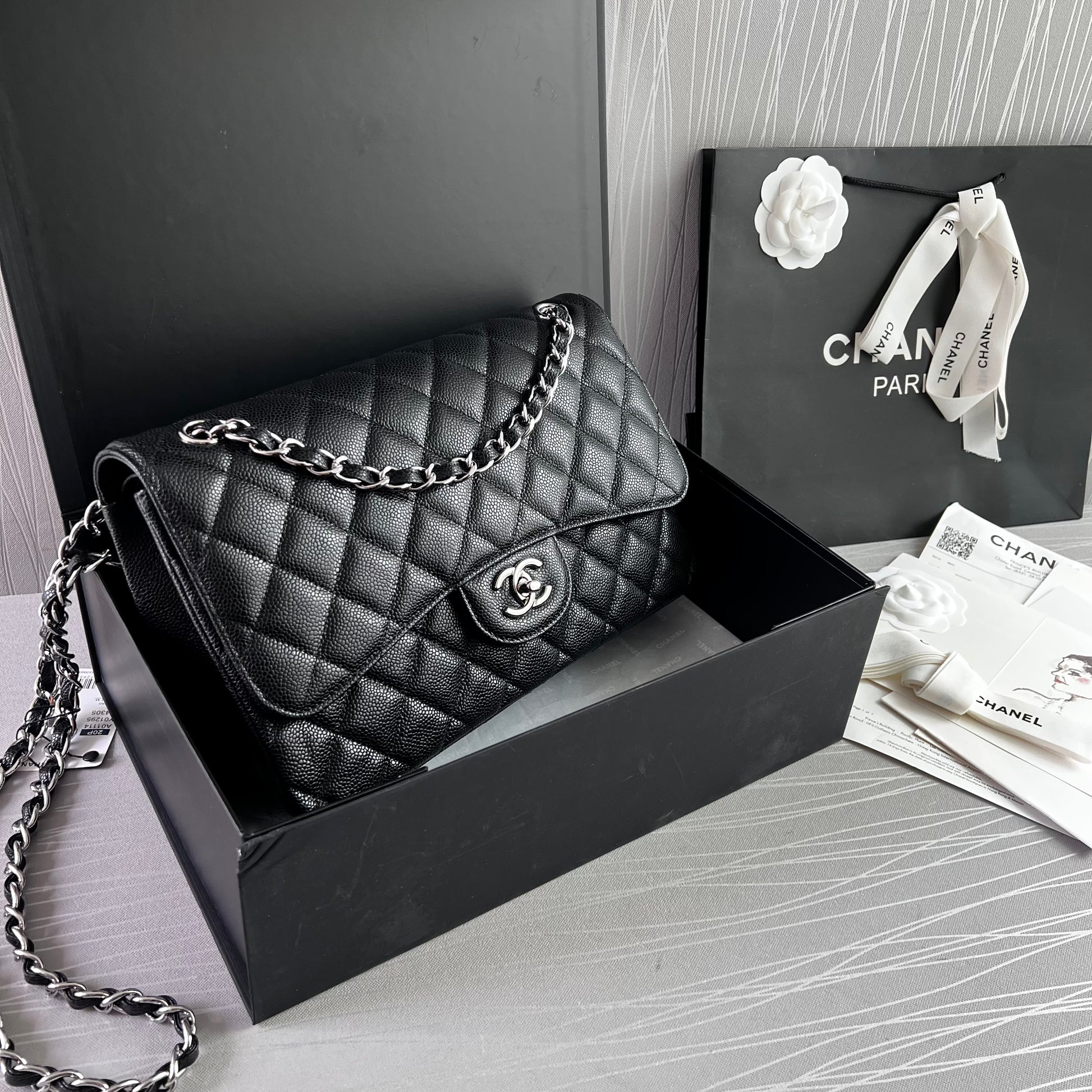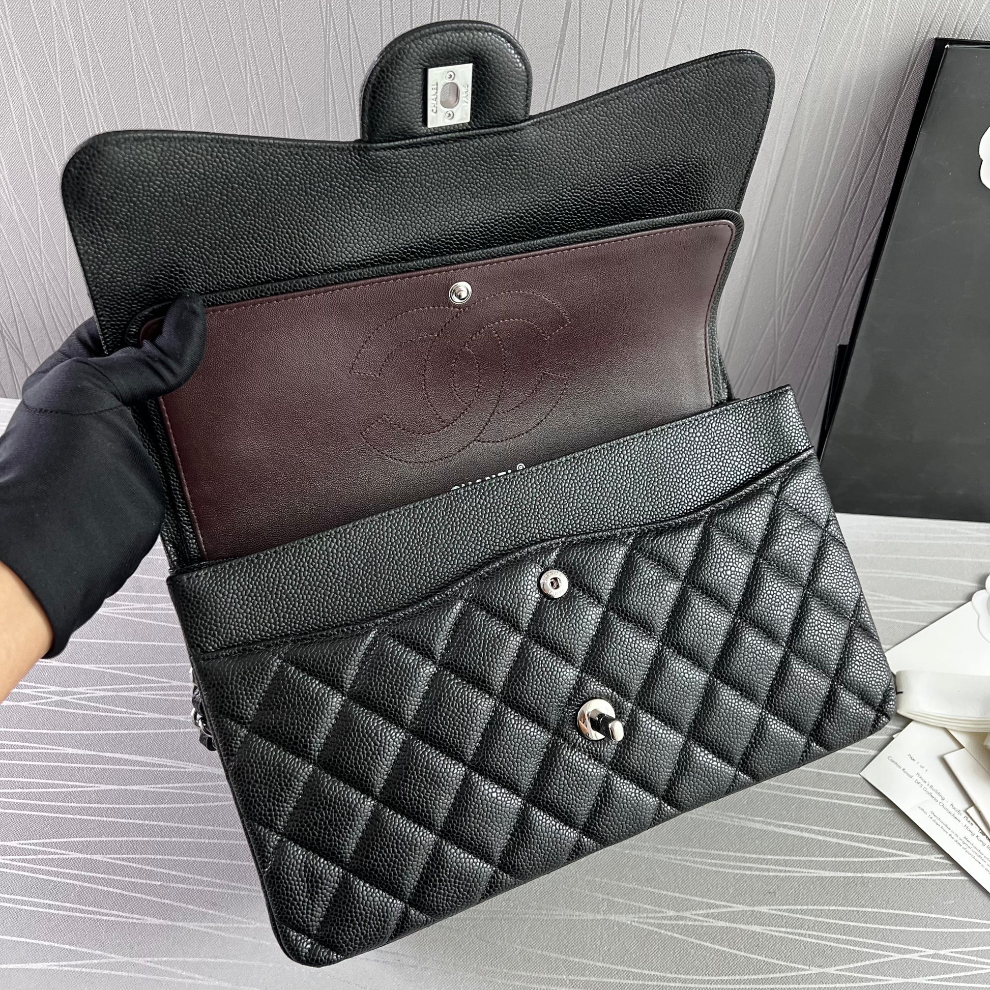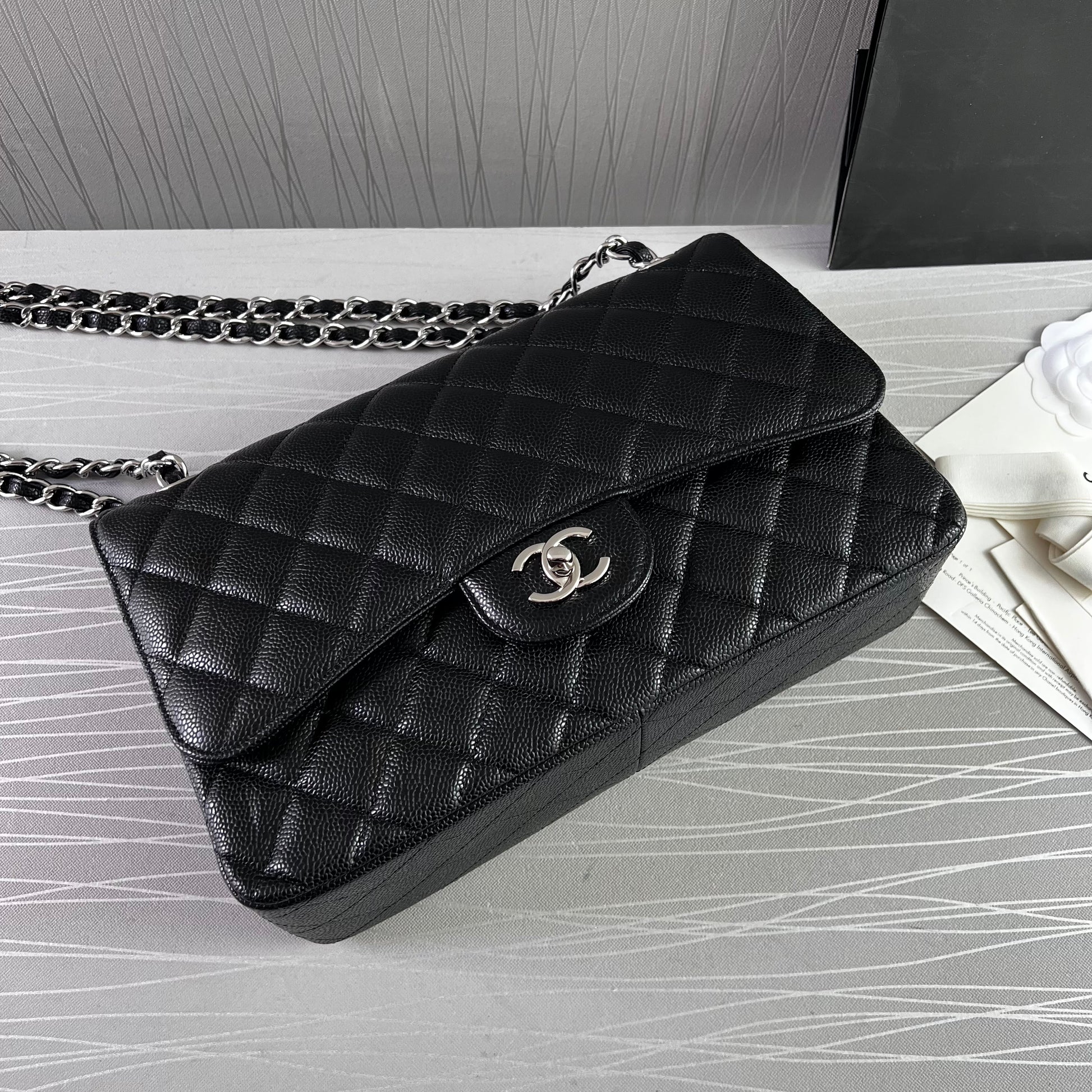 Bolso C piel caviar color negro, herrajes plateados. Dimensiones 30 cm. Incluye caja imantada, guardapolvo, flor y listón. Shopping Bag