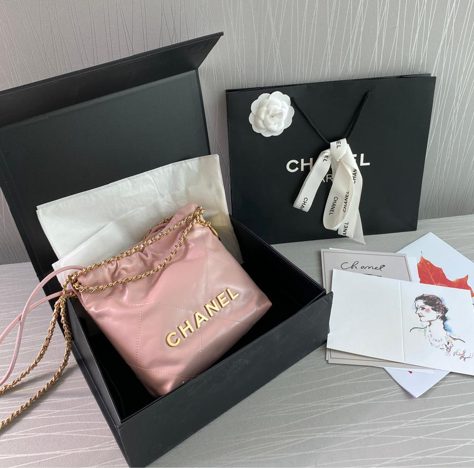 Bolso C piel color rosa, tamaño mini, herrajes dorados.