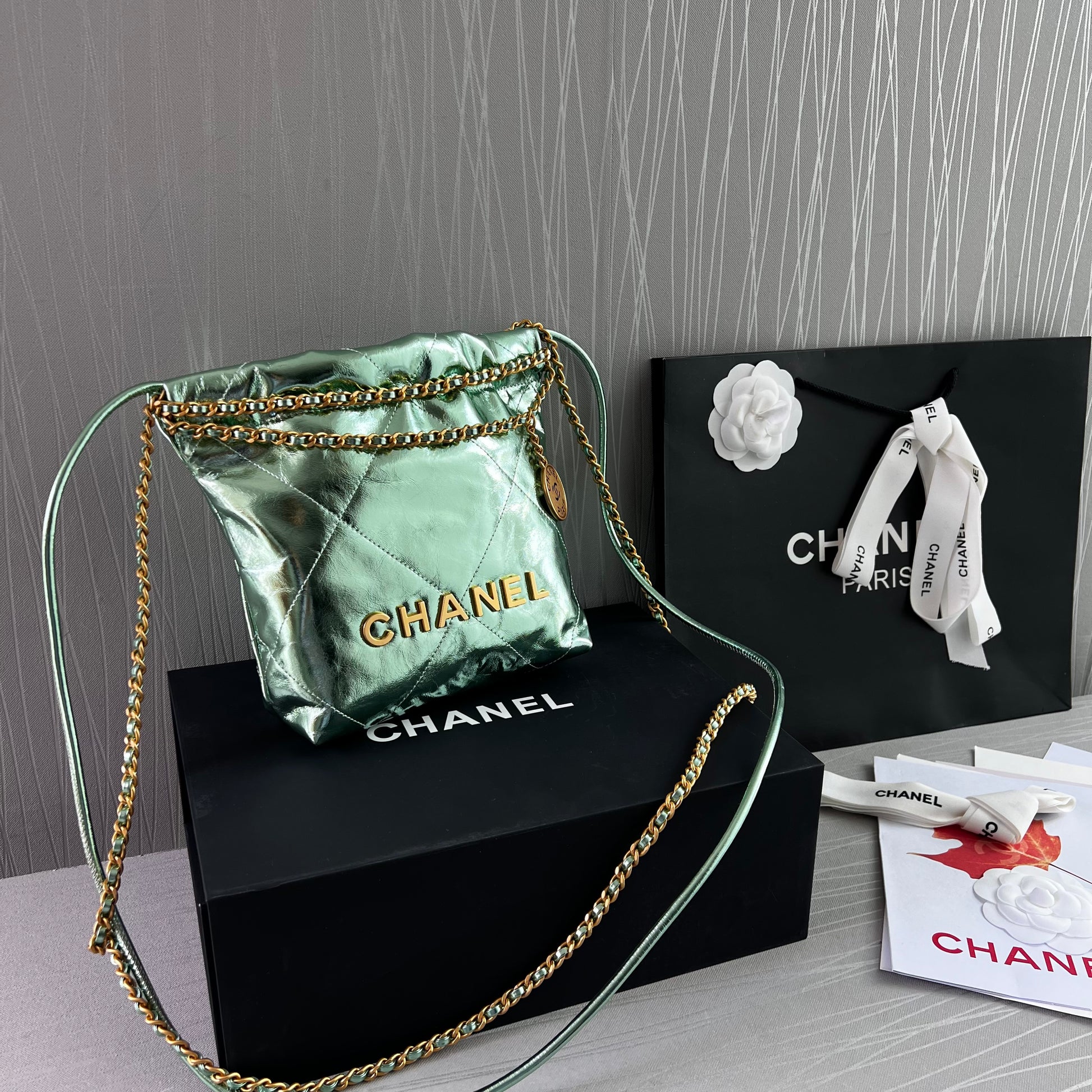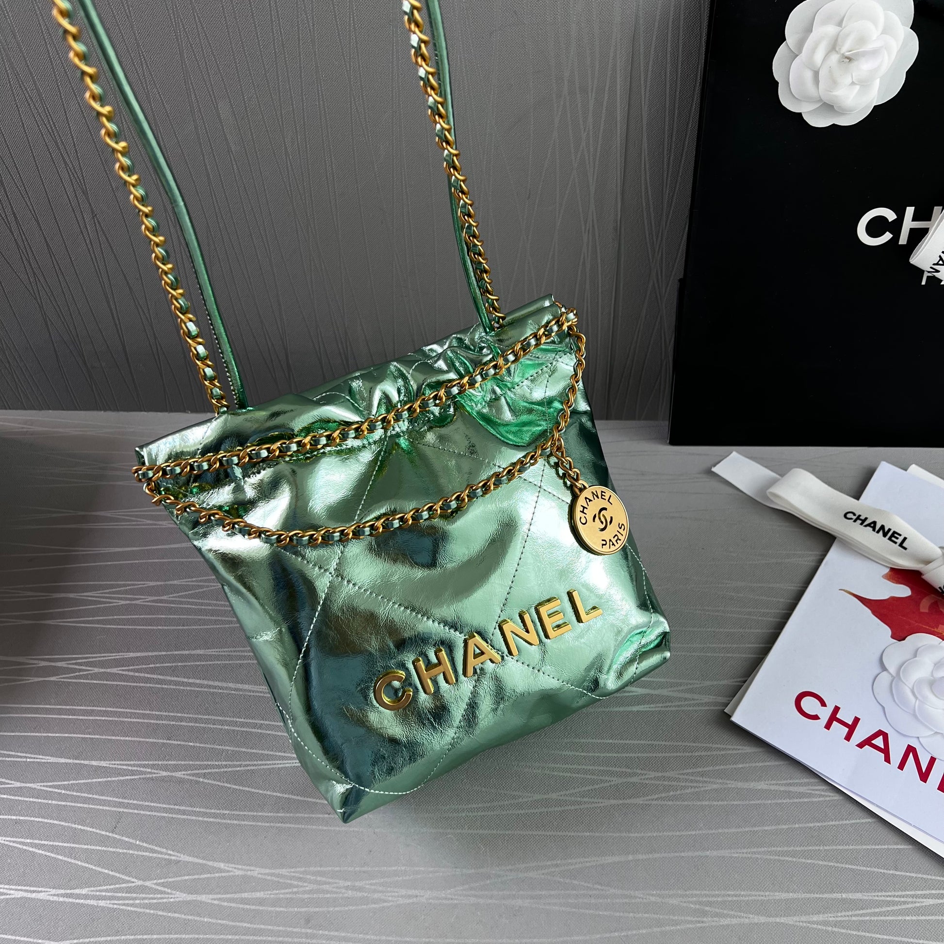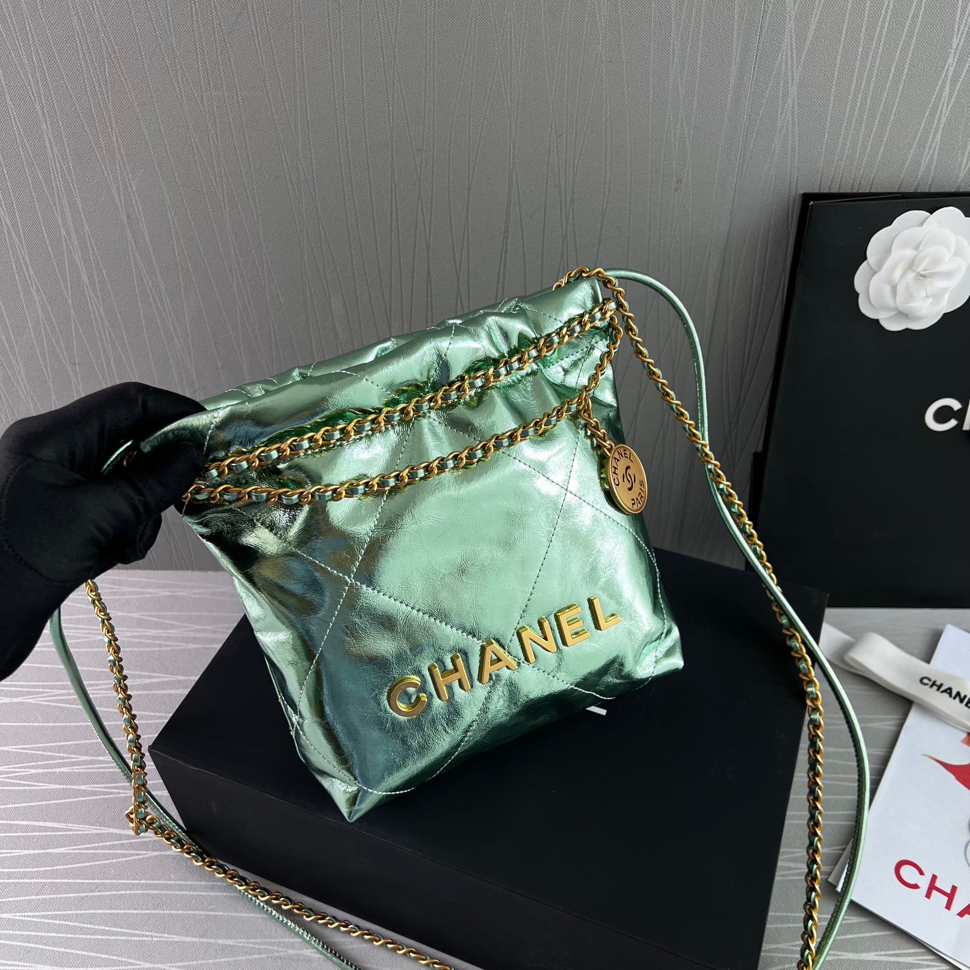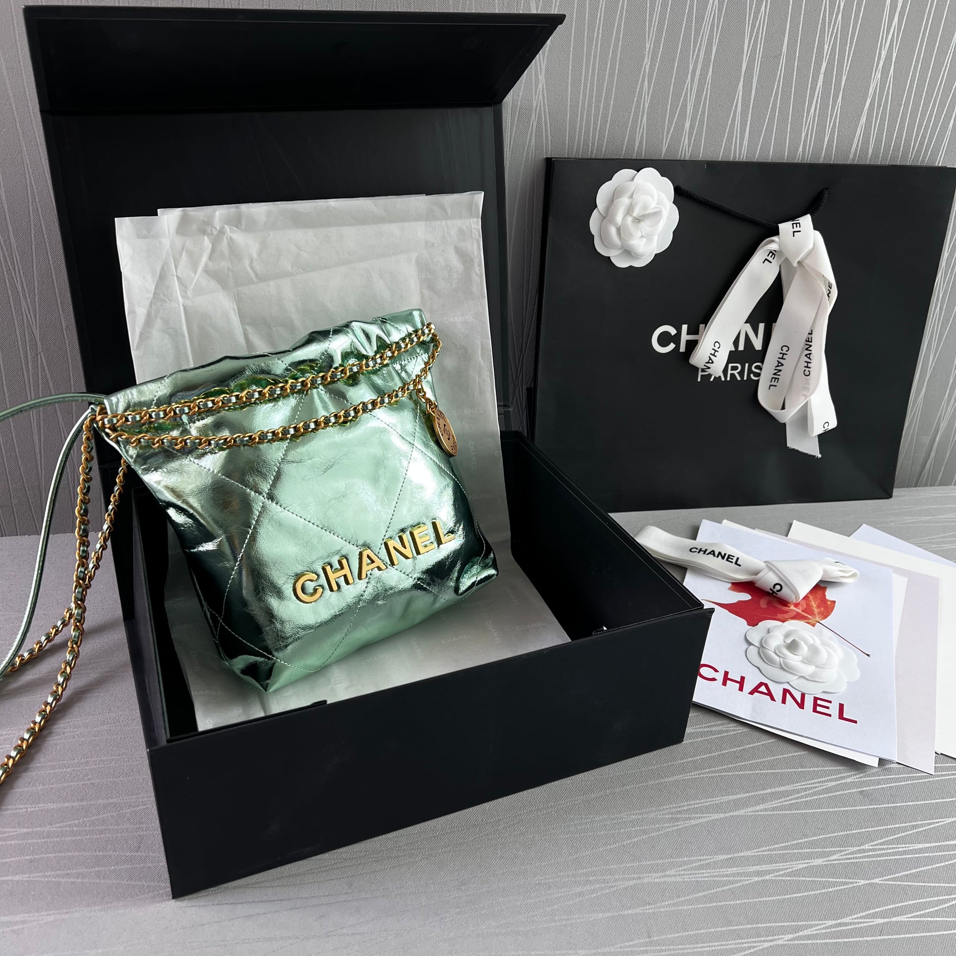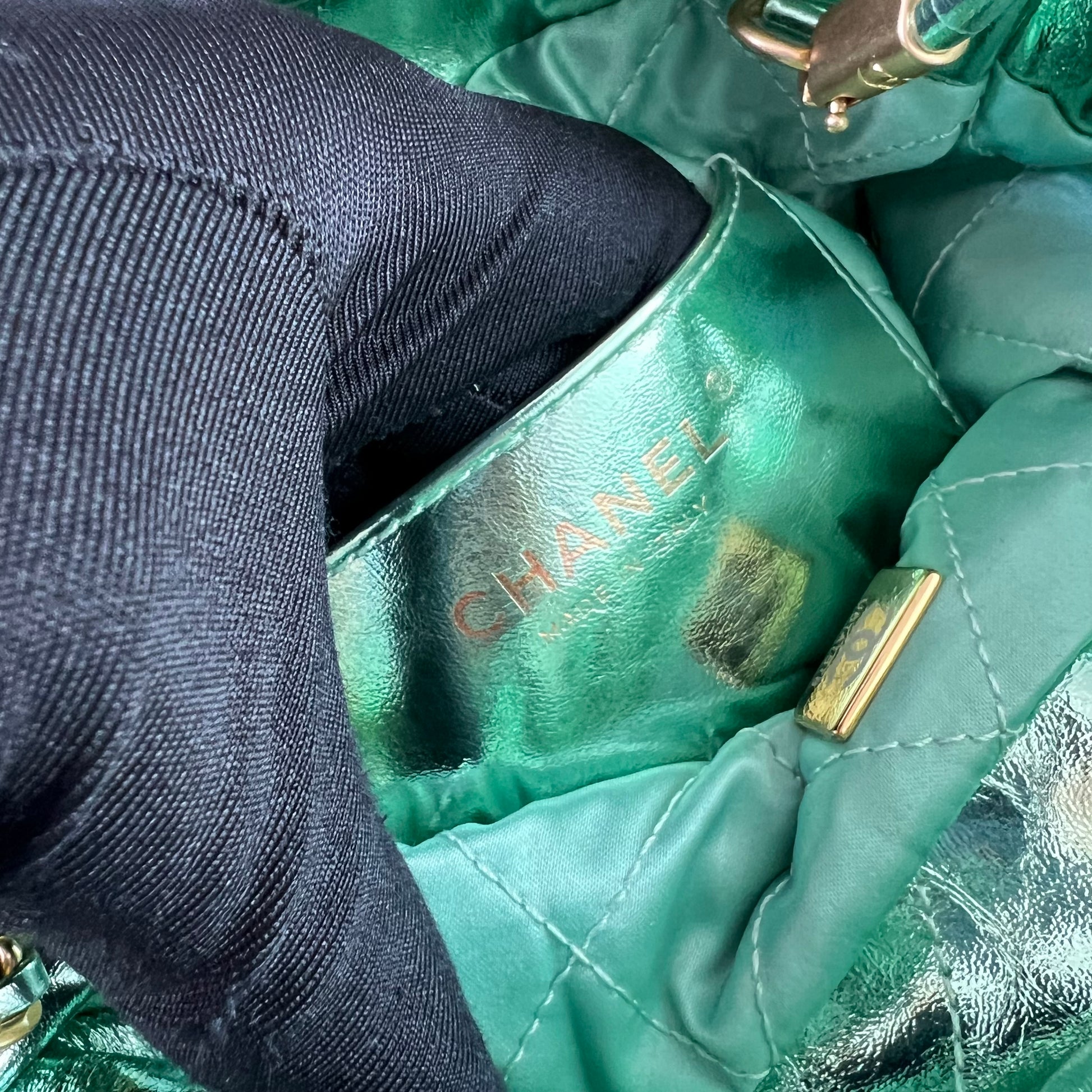 Bolso C piel metalizada color verde mini , herrajes dorados. Dimensiones 20 x 19 x 6 cm. Incluye caja imantada, shopping bag, bolsa guardapolvo, flor y listón.
