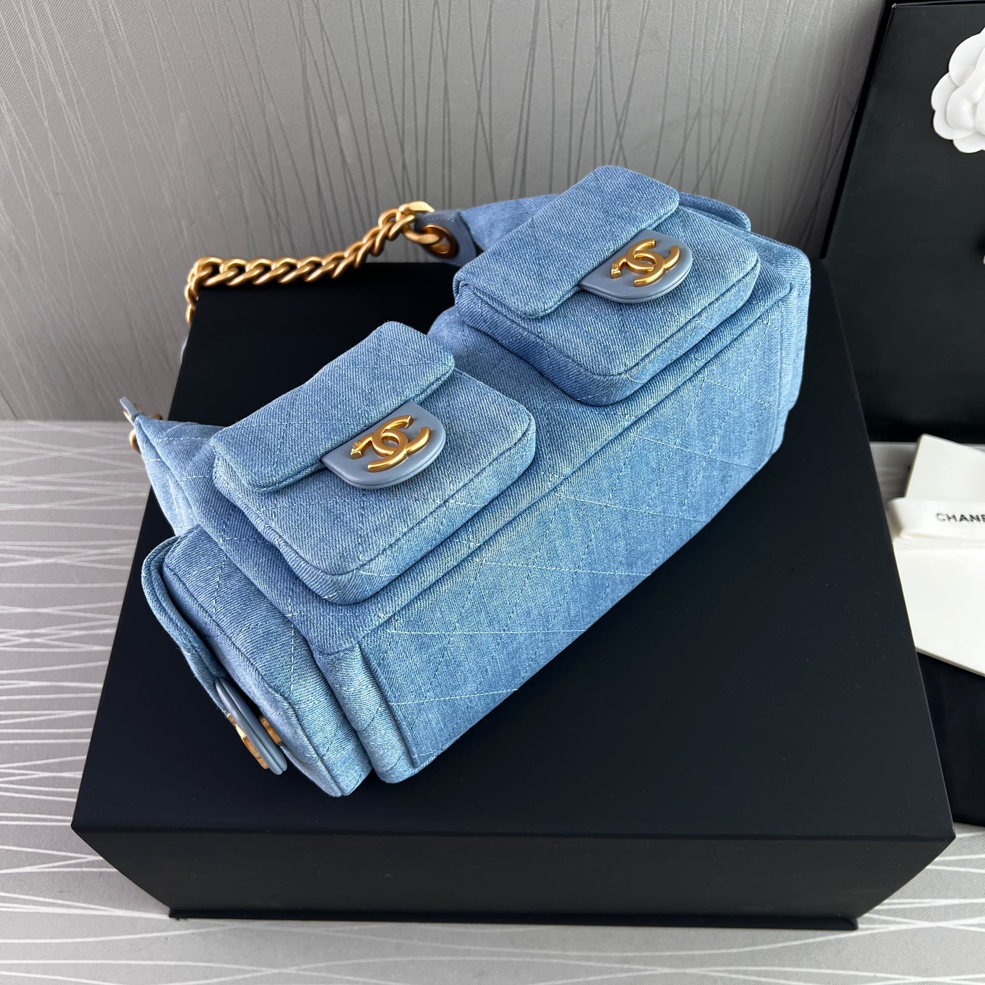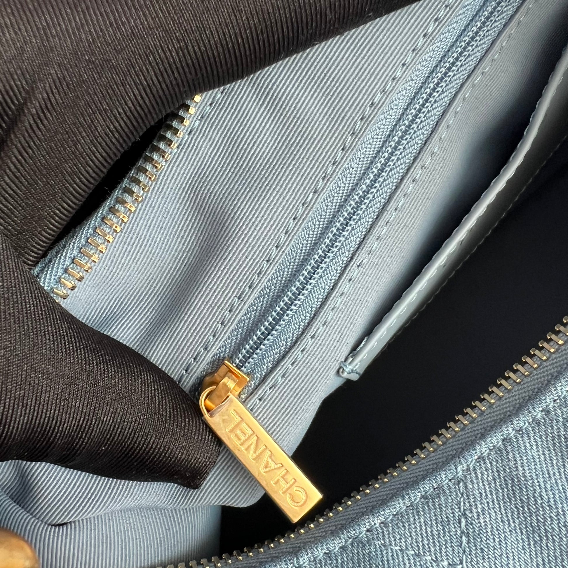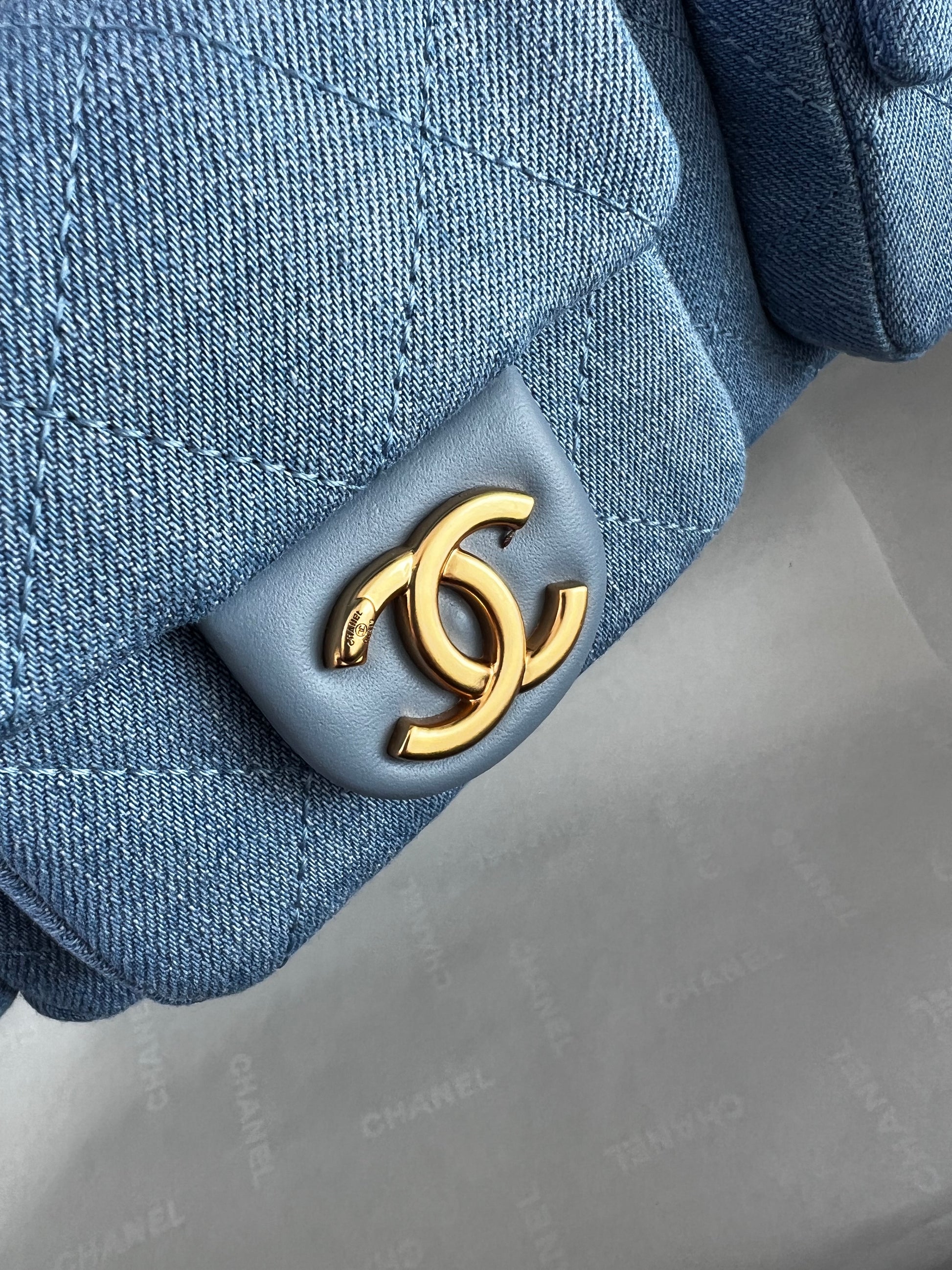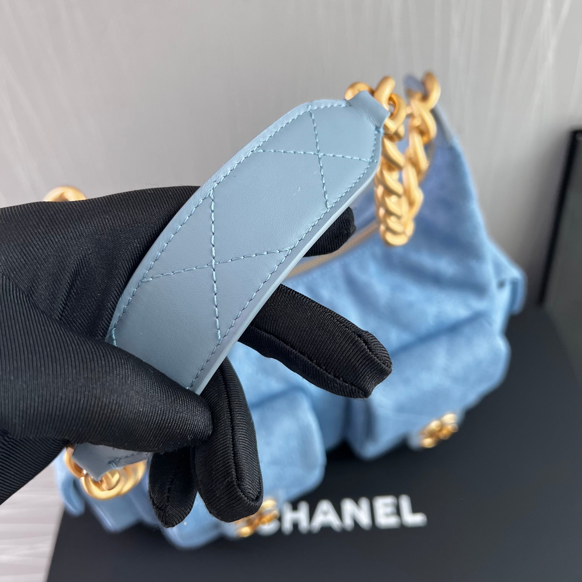 Bolso C tela tipo mezclilla azul claro con detalles en piel del mismo tono, herrajes dorados. Dimensiones 22 x 31 x 15 cm. Incluye caja imantada, guardapolvo, flor y listón.