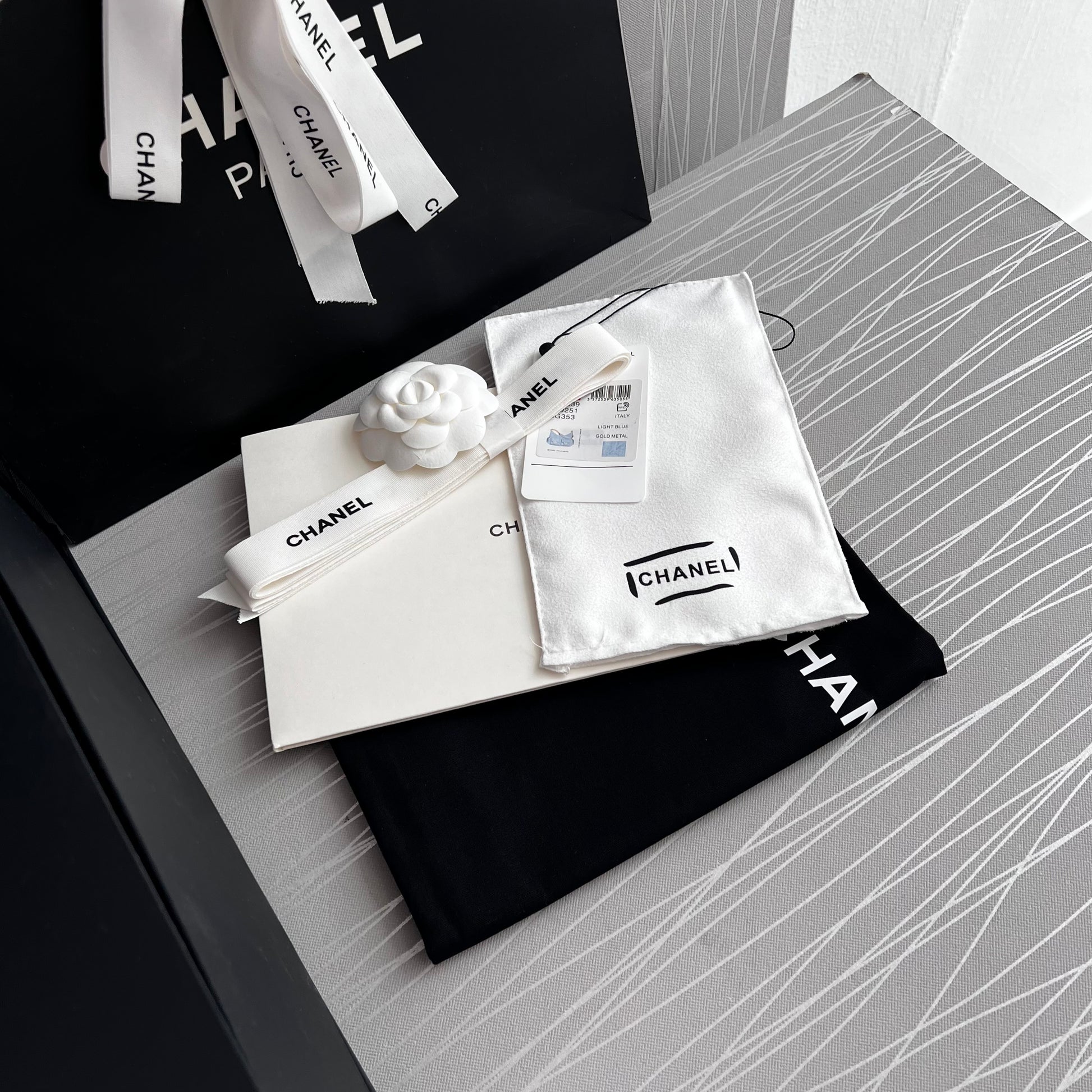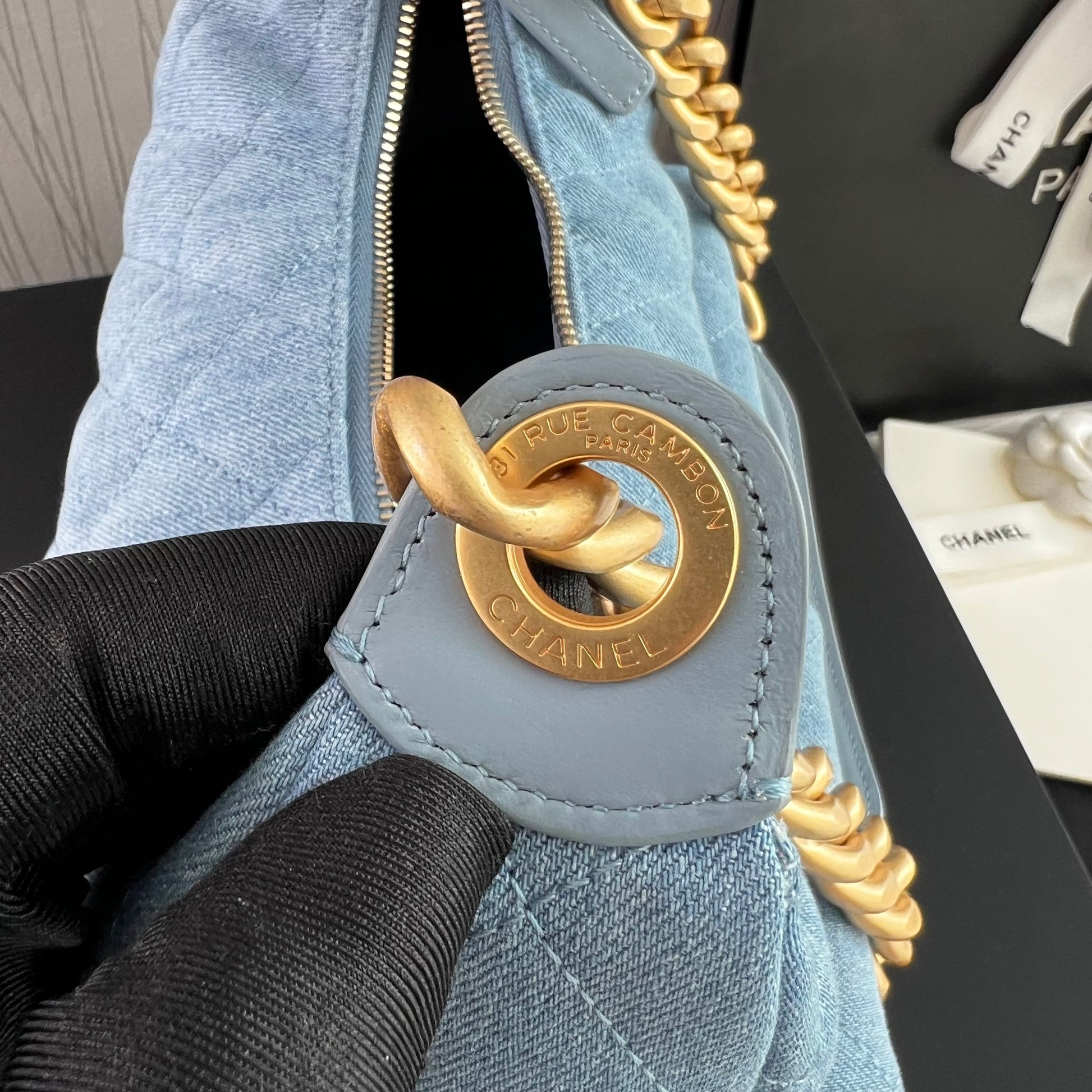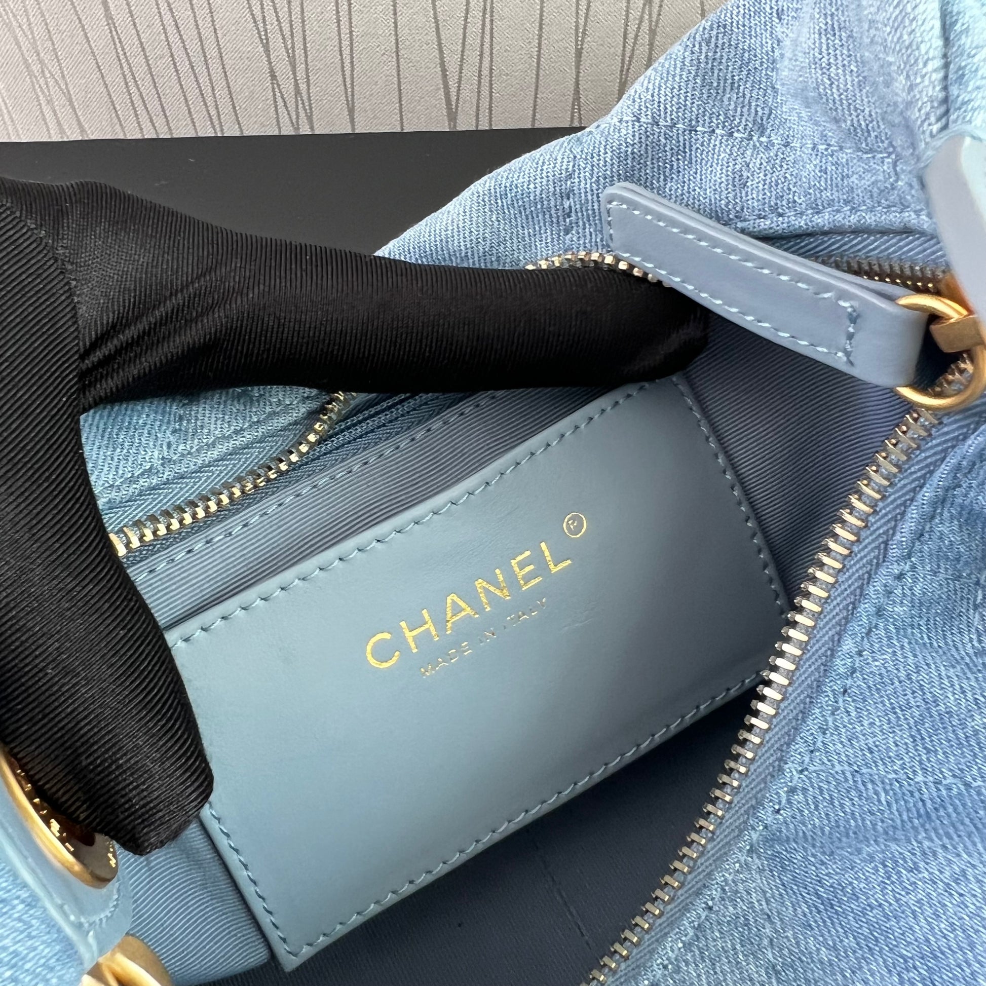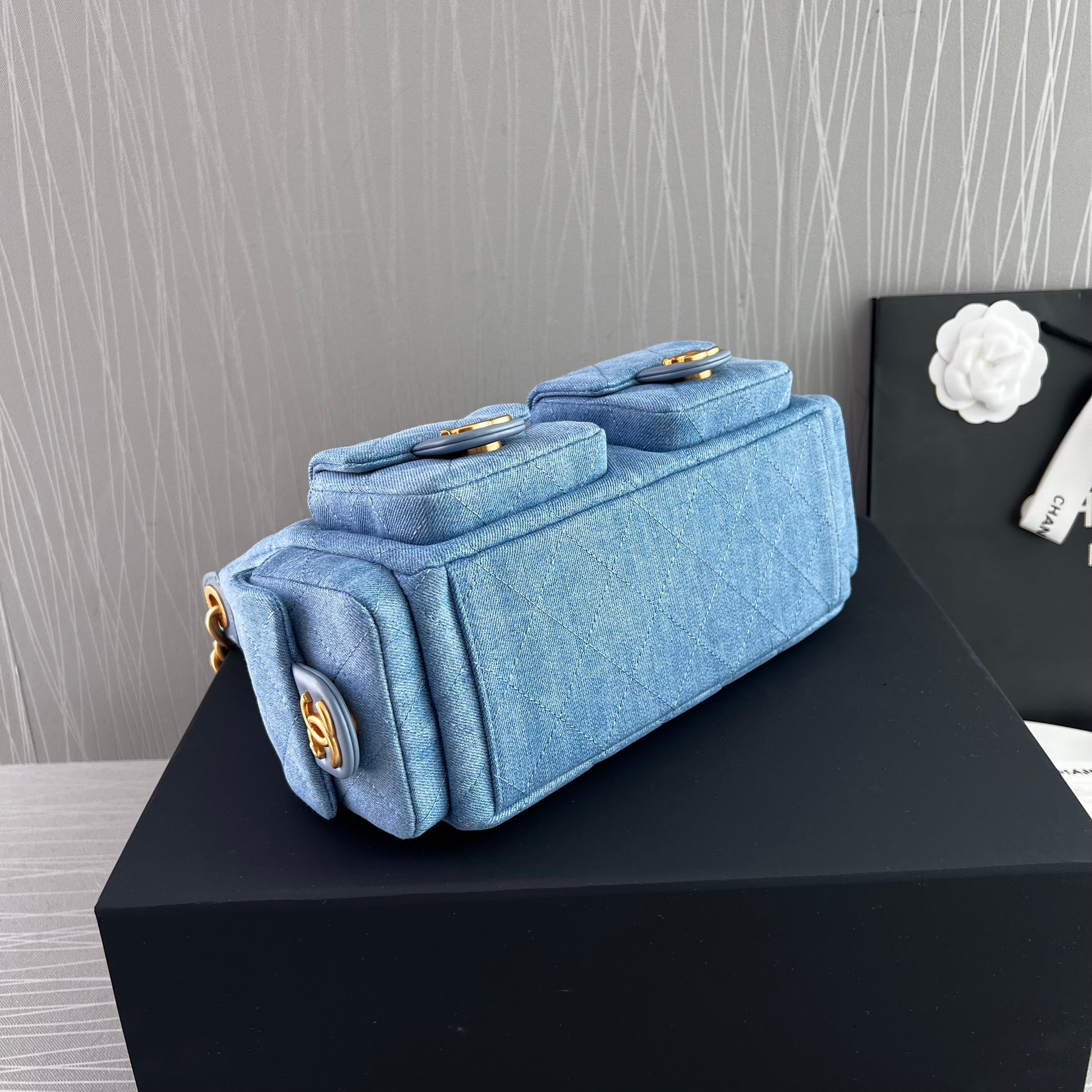 Bolso C tela tipo mezclilla azul claro con detalles en piel del mismo tono, herrajes dorados. Dimensiones 22 x 31 x 15 cm. Incluye caja imantada, guardapolvo, flor y listón.