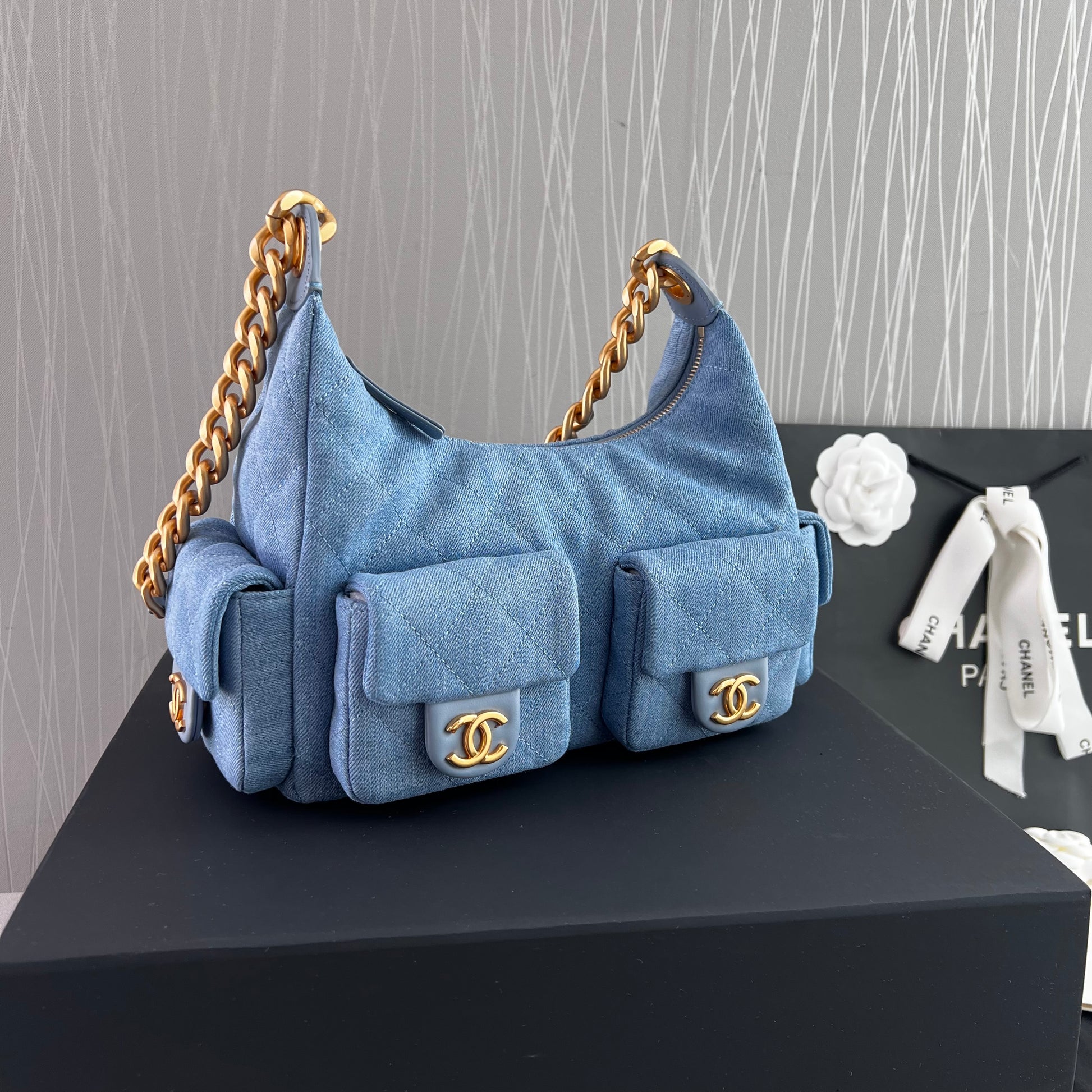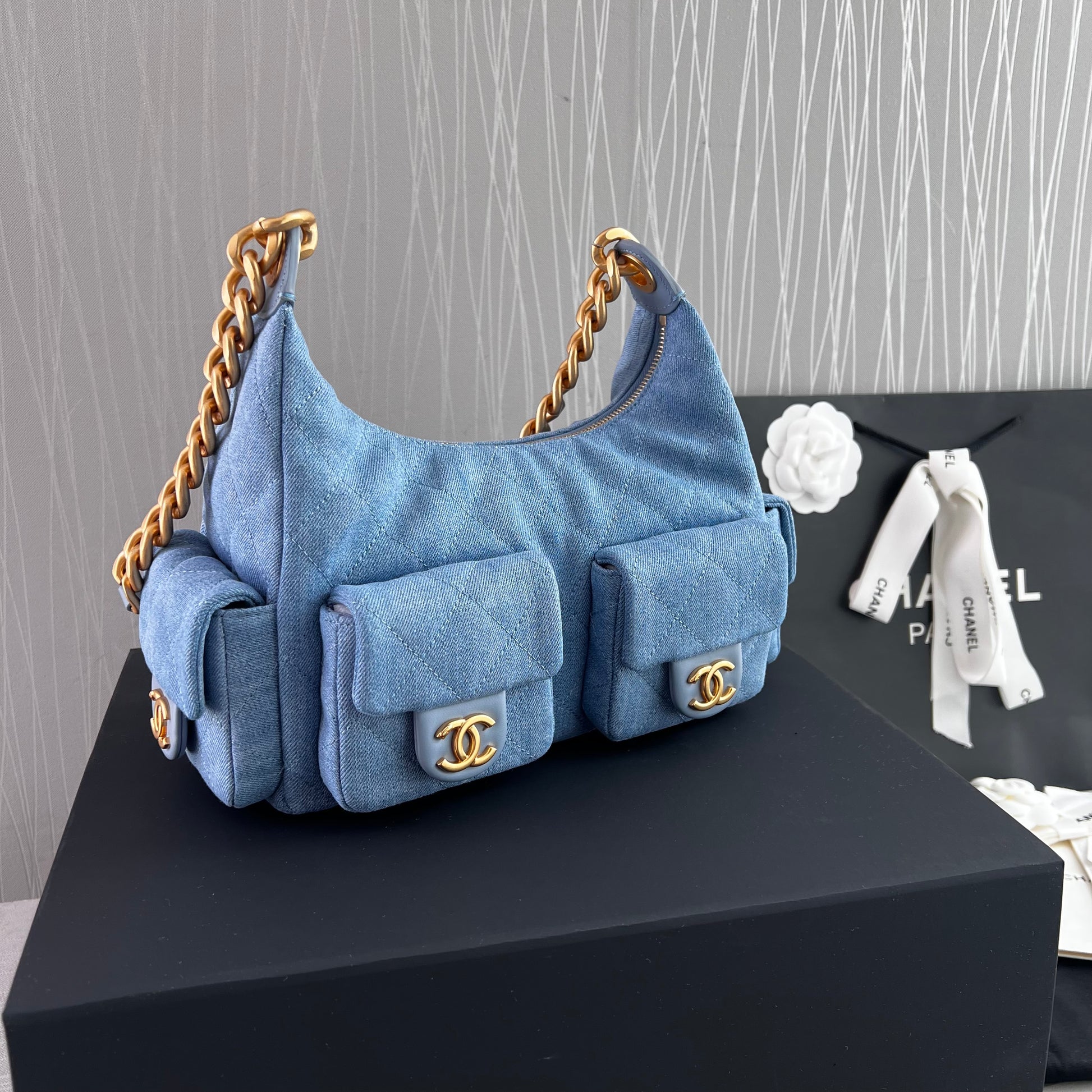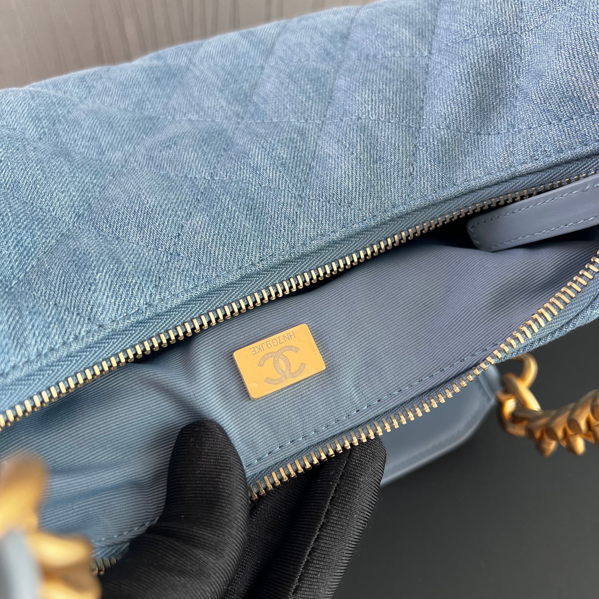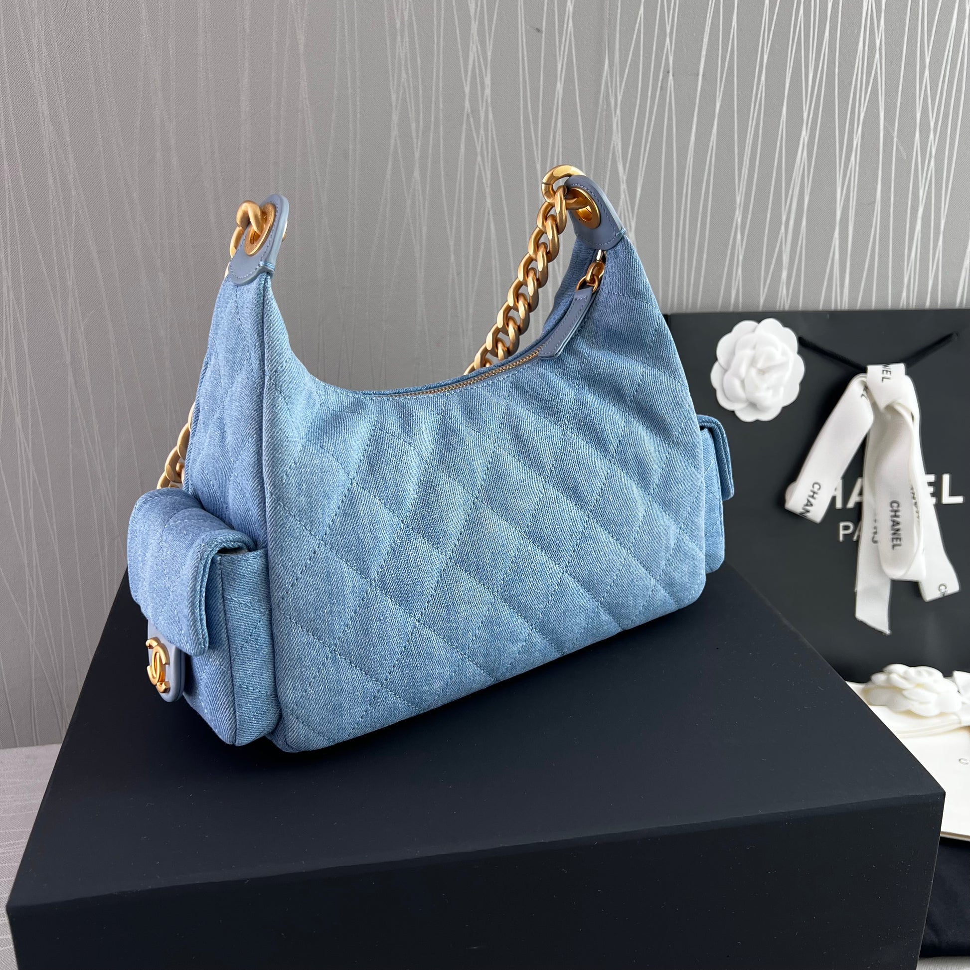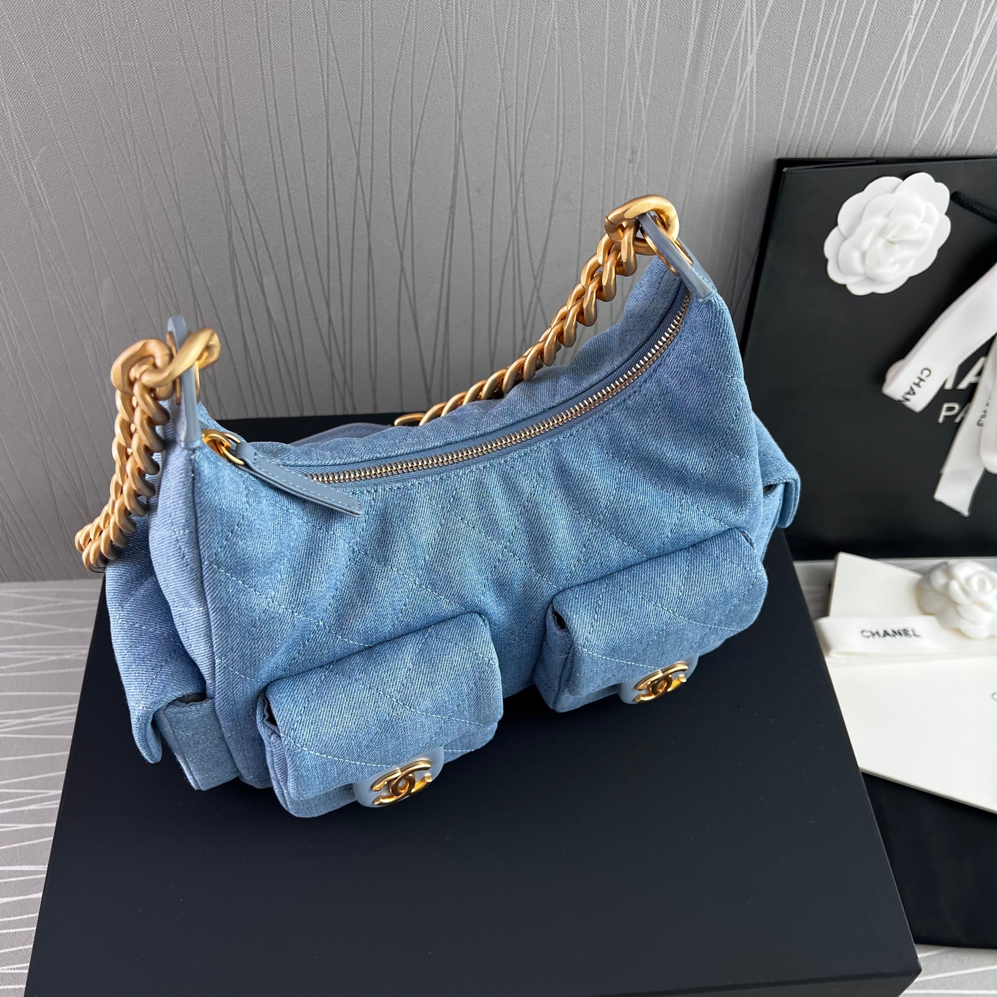 Bolso C tela tipo mezclilla azul claro con detalles en piel del mismo tono, herrajes dorados. Dimensiones 22 x 31 x 15 cm. Incluye caja imantada, guardapolvo, flor y listón.