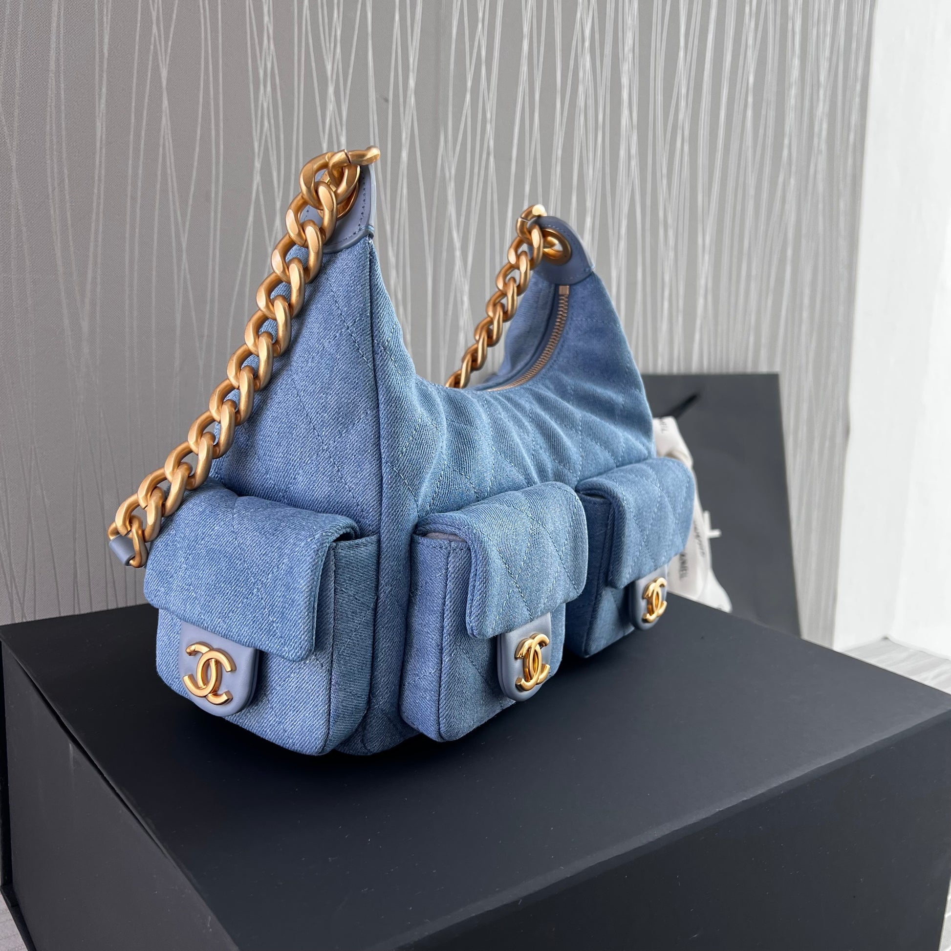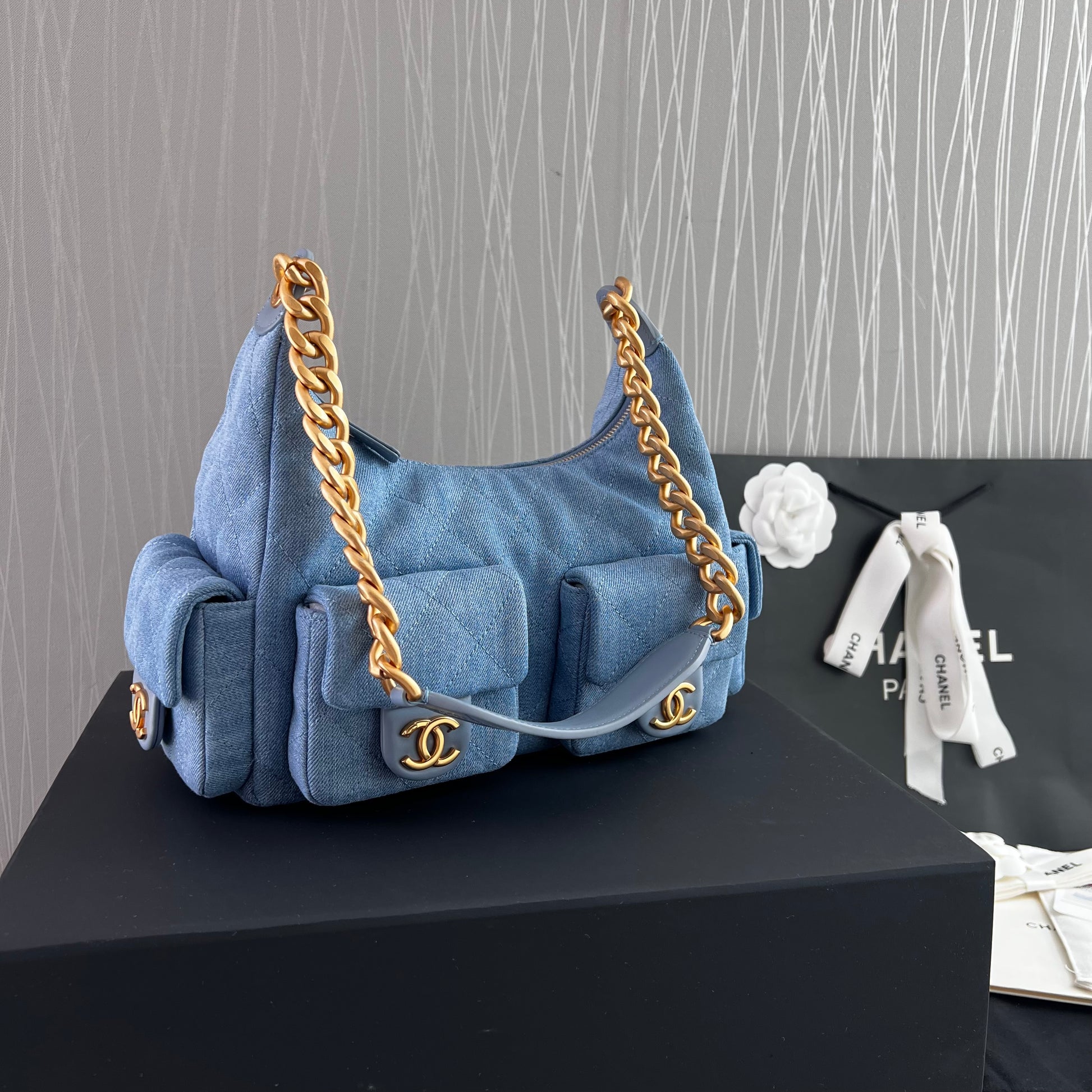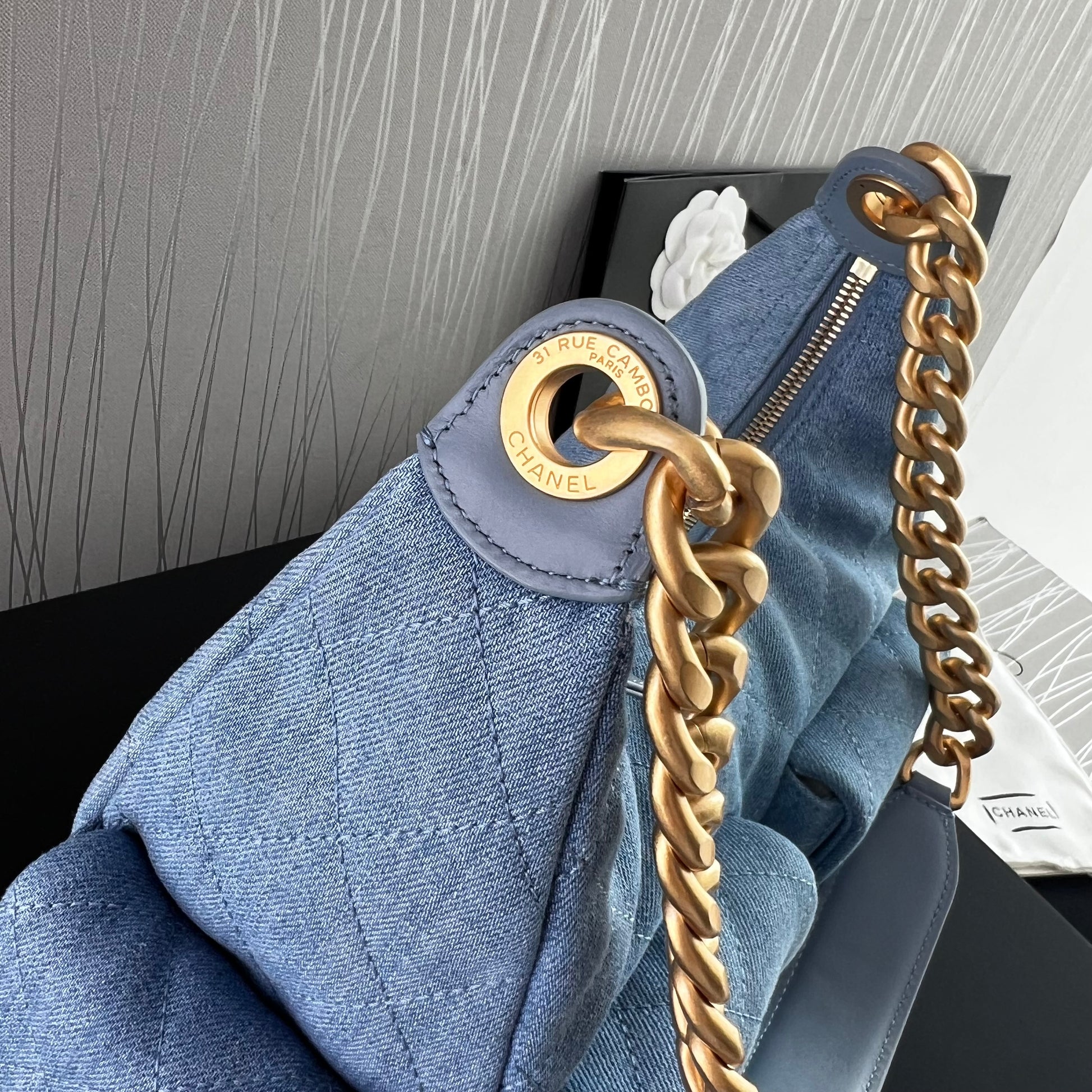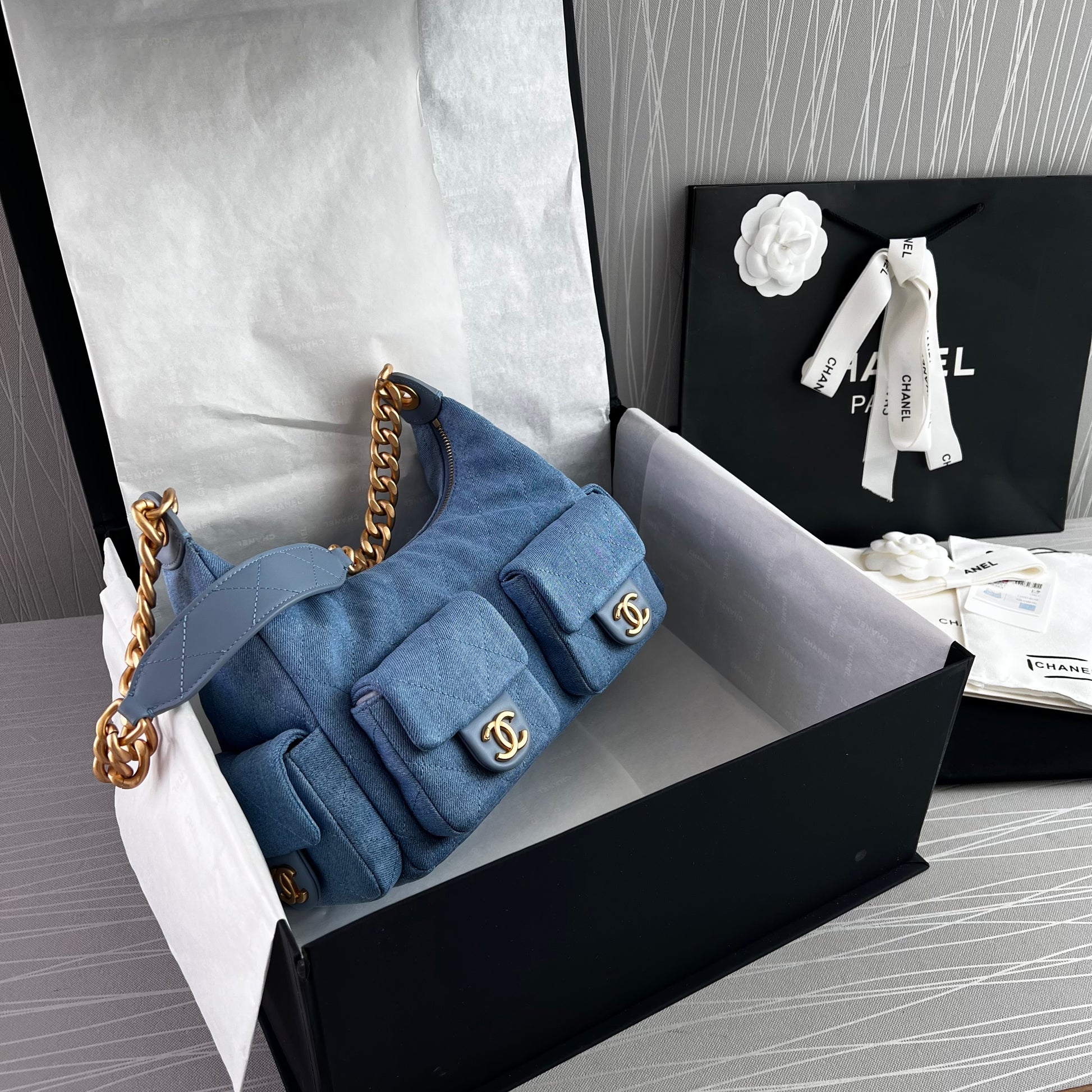 Bolso C tela tipo mezclilla azul claro con detalles en piel del mismo tono, herrajes dorados. Dimensiones 22 x 31 x 15 cm. Incluye caja imantada, guardapolvo, flor y listón.
