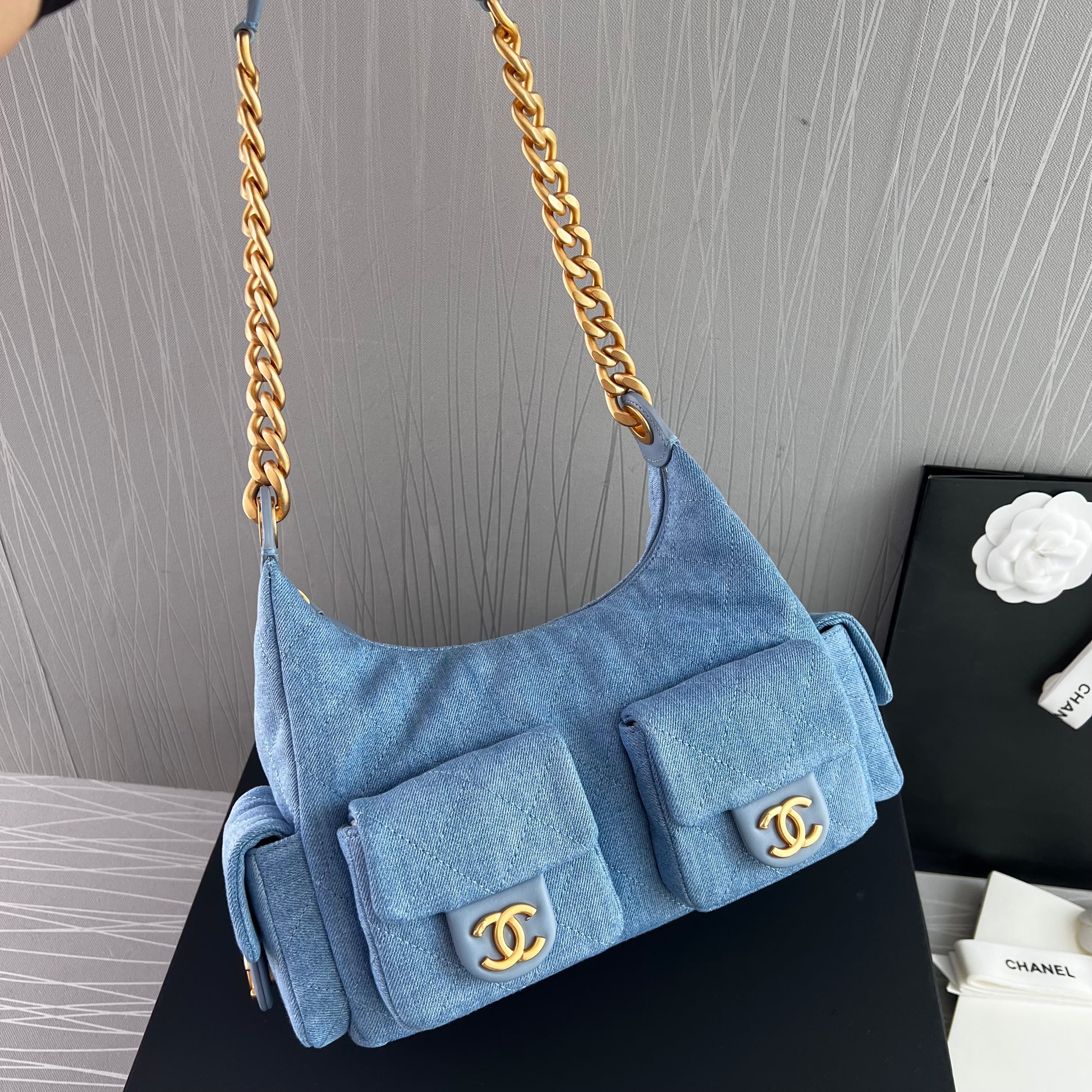 Bolso C tela azul tipo mezclilla con herrajes dorados