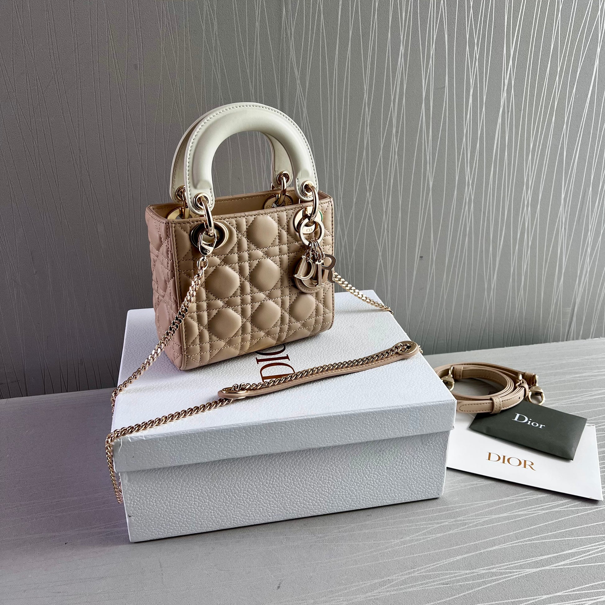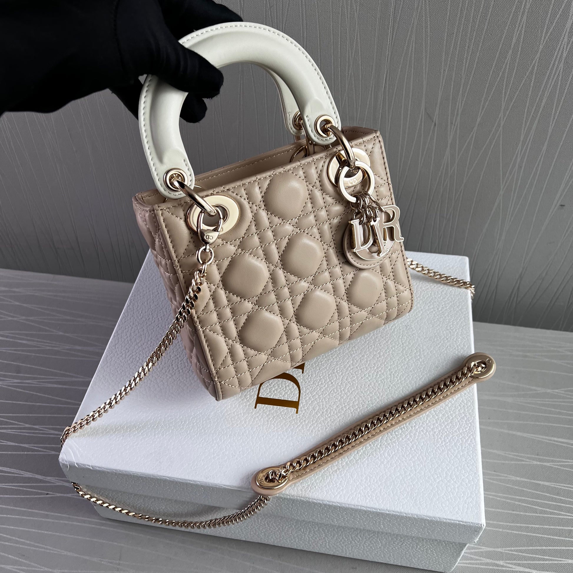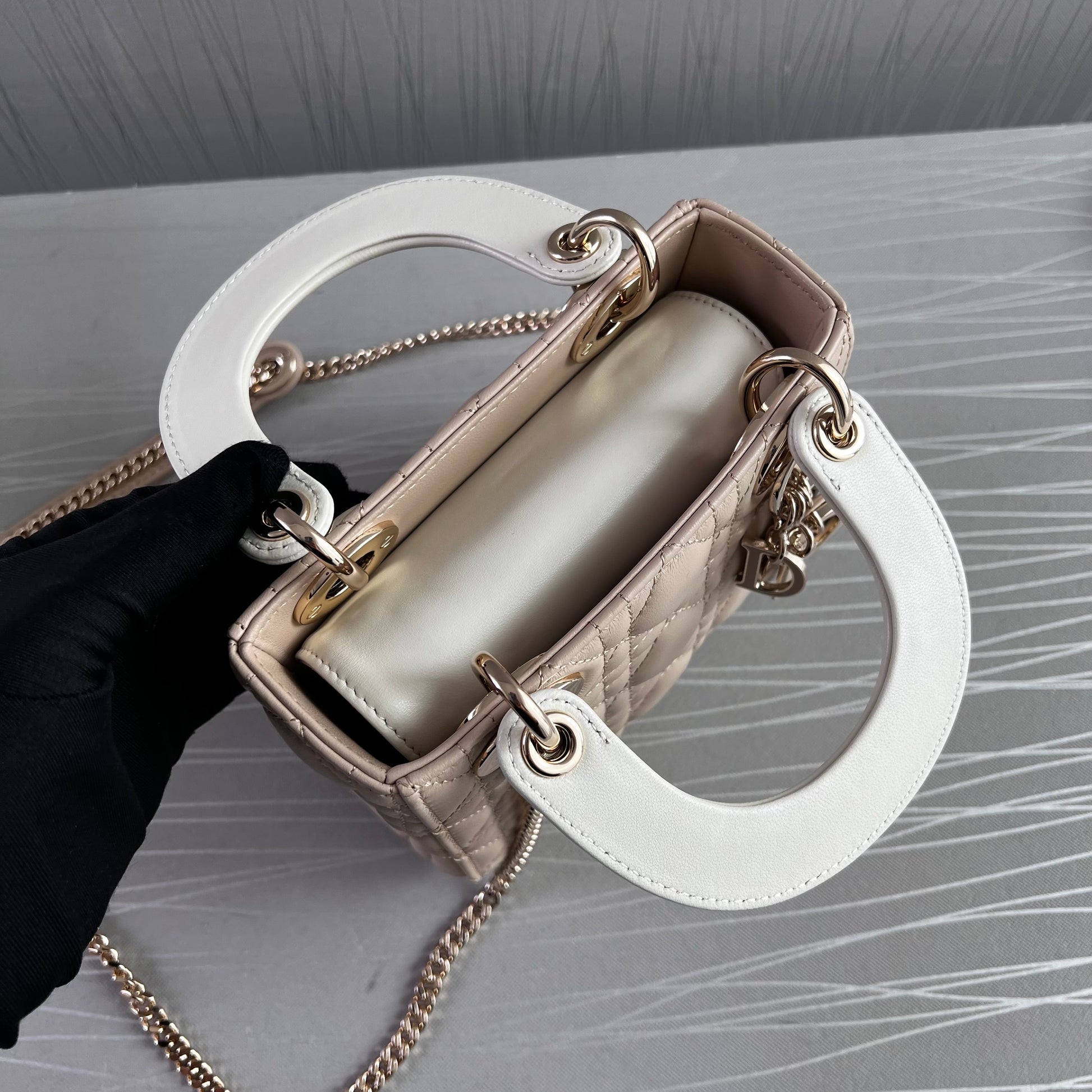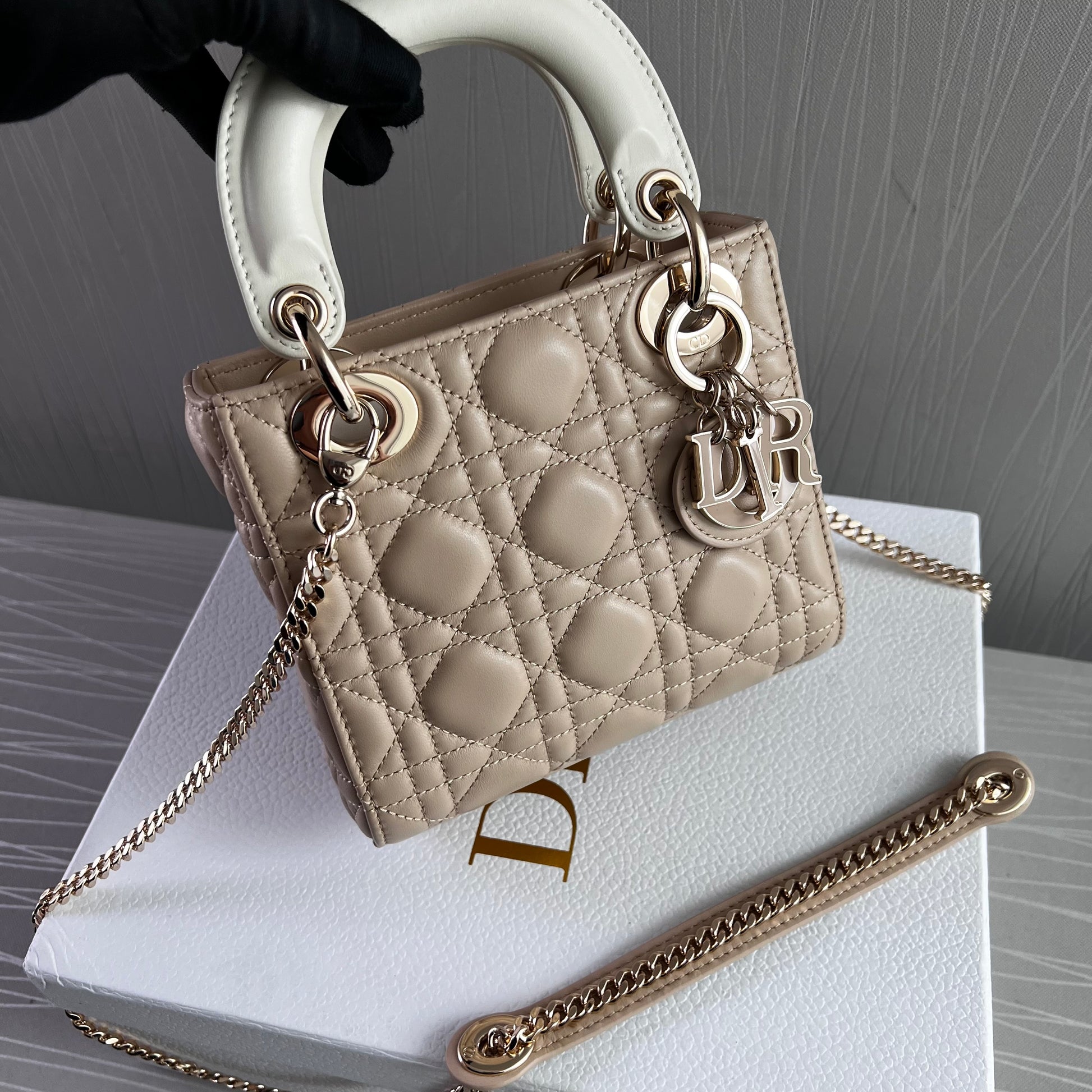 Bolso D piel color beige combinada con hueso, herrajes dorado pálido, incluye dos straps, piel y otro con cadena.Dimensiones 17 x 15 x 7 cm.Incluye caja, guardapolvo.