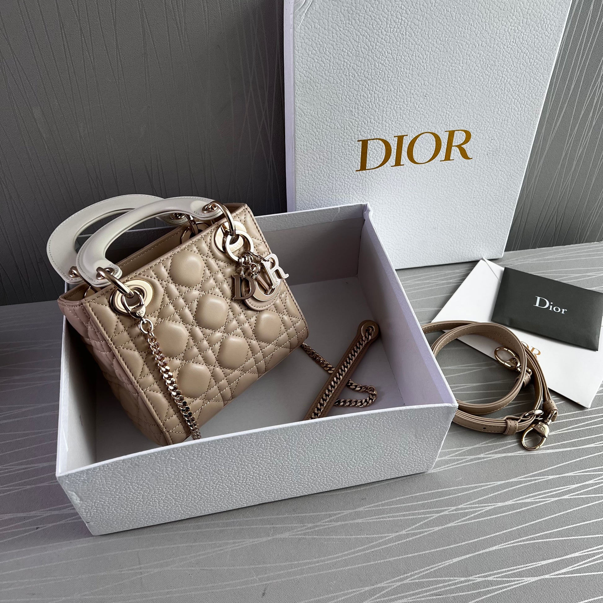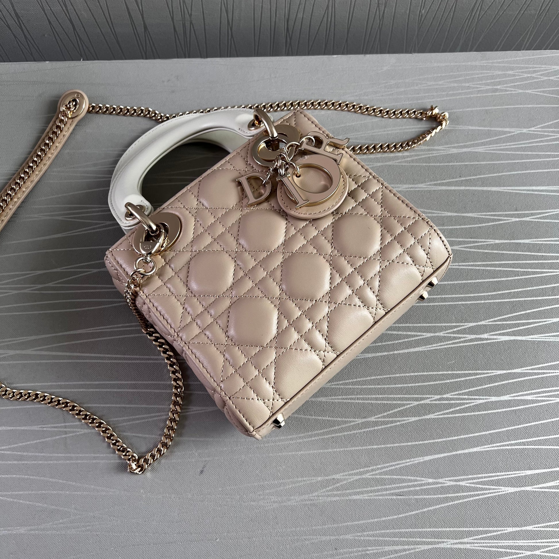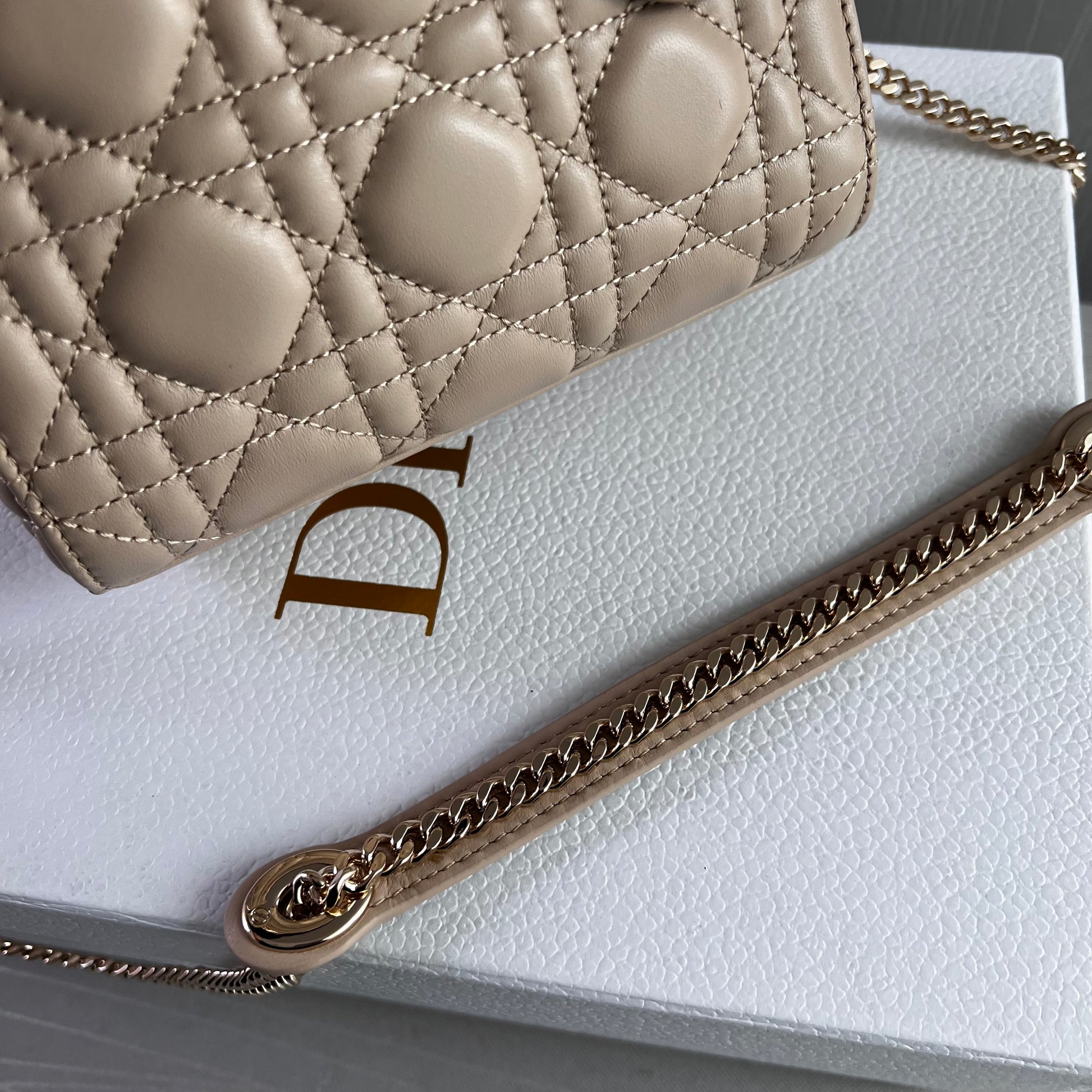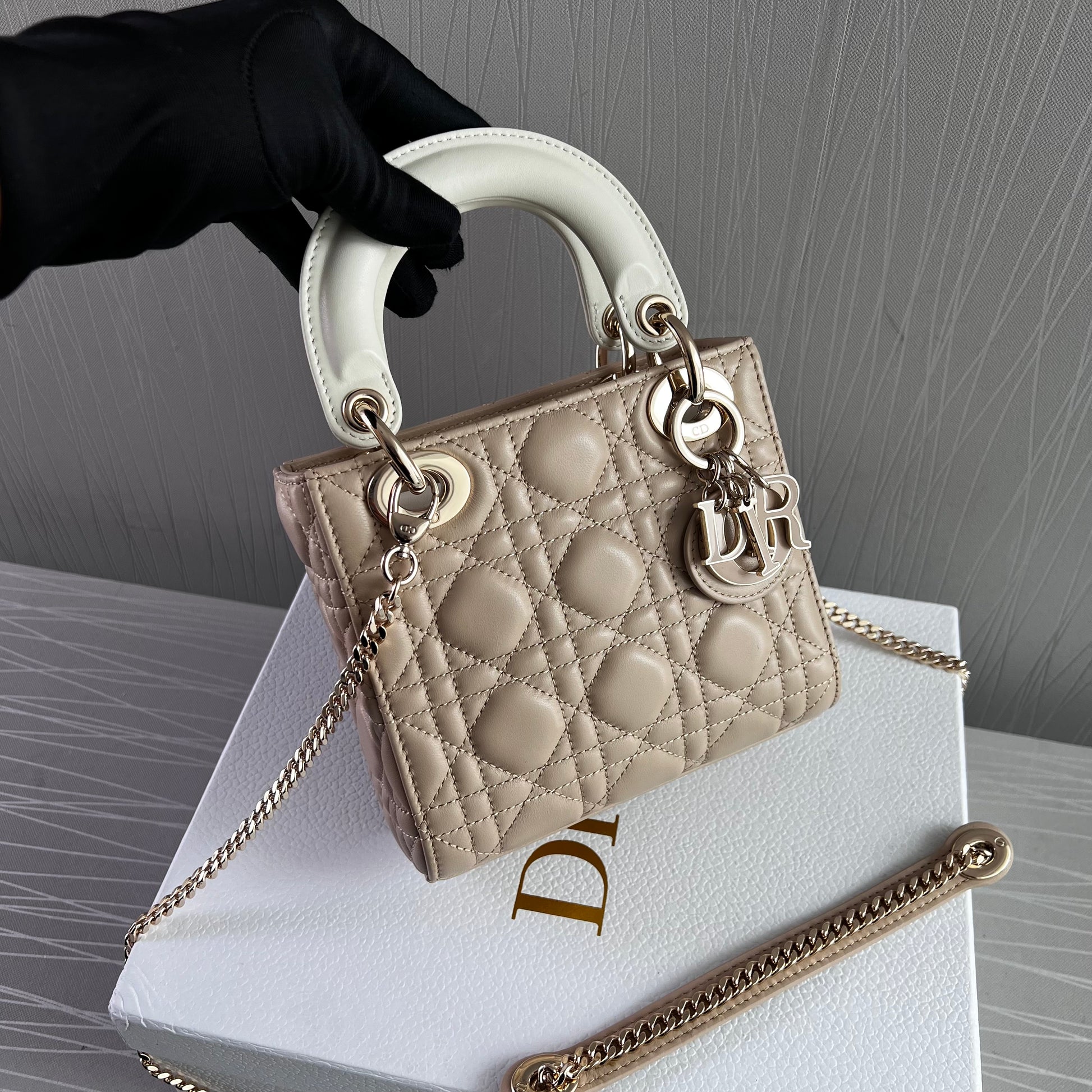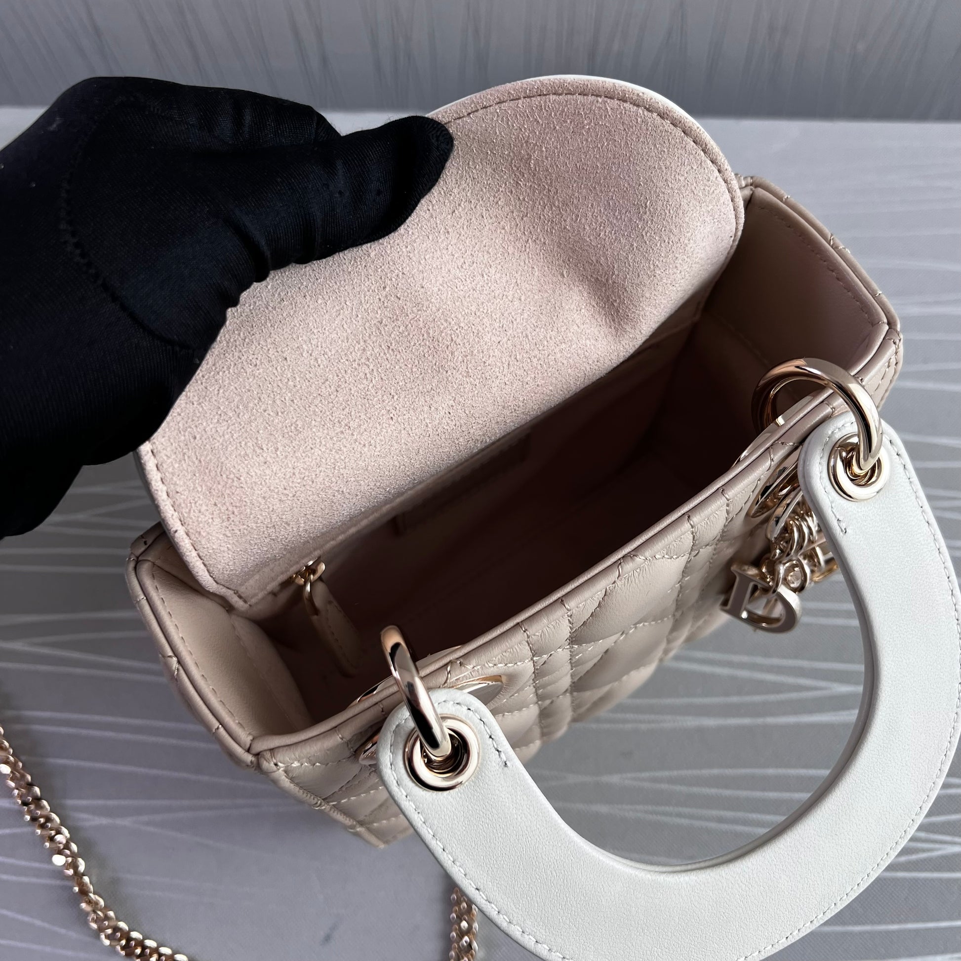 Bolso D piel color beige combinada con hueso, herrajes dorado pálido, incluye dos straps, piel y otro con cadena.Dimensiones 17 x 15 x 7 cm.Incluye caja, guardapolvo.
