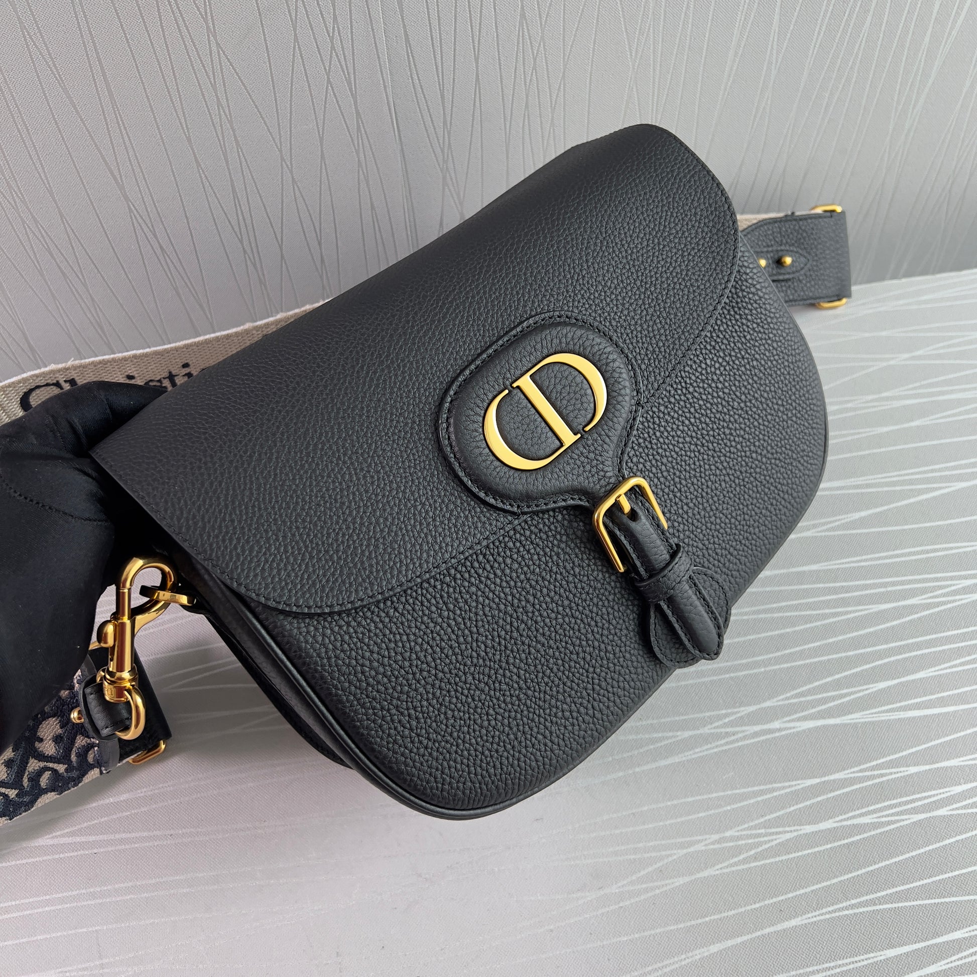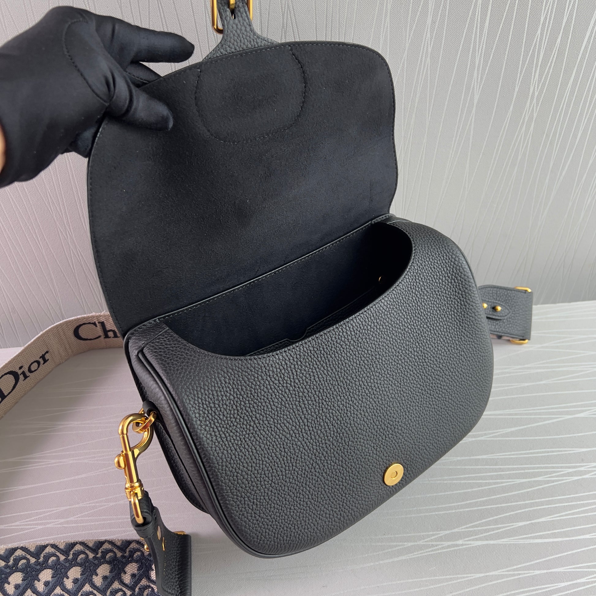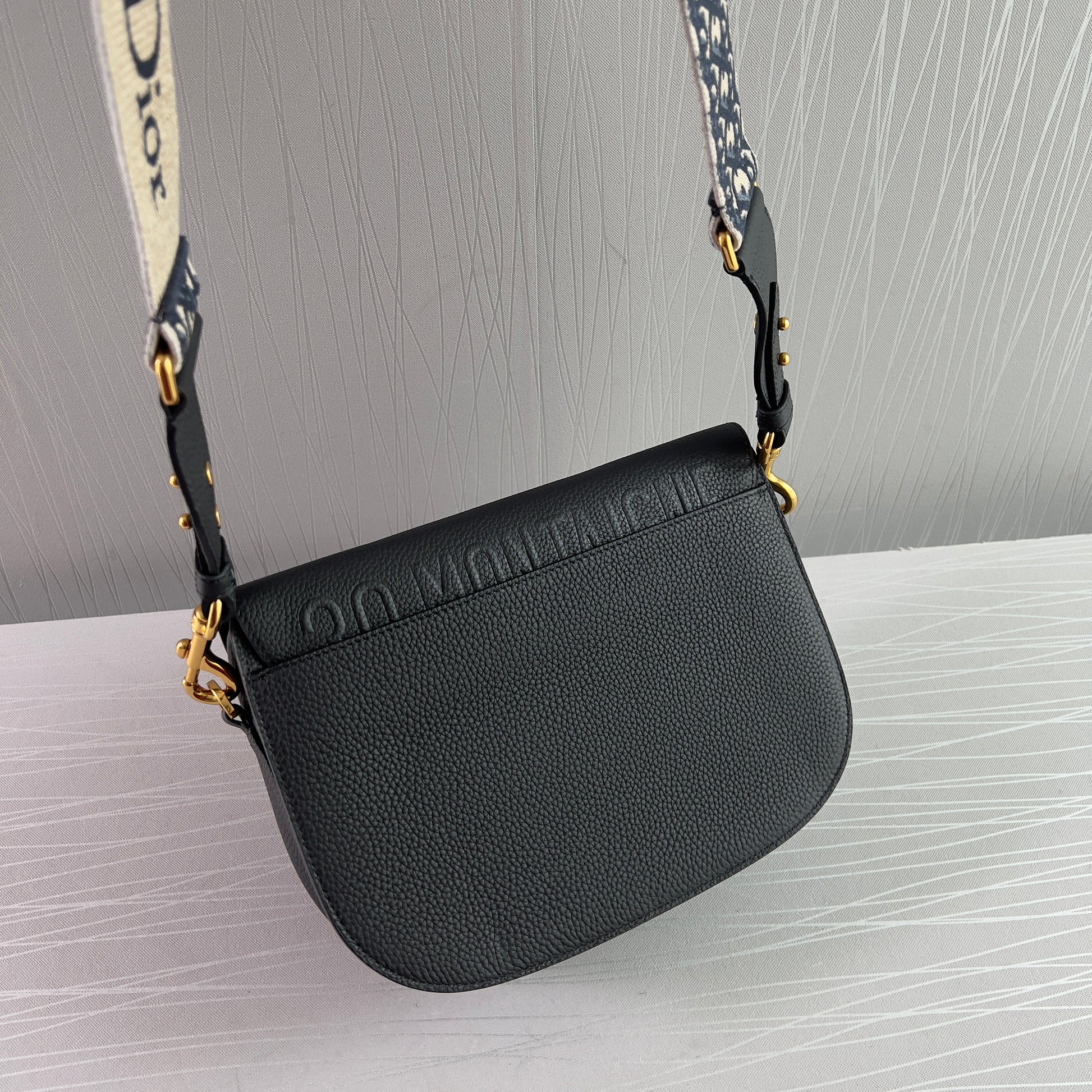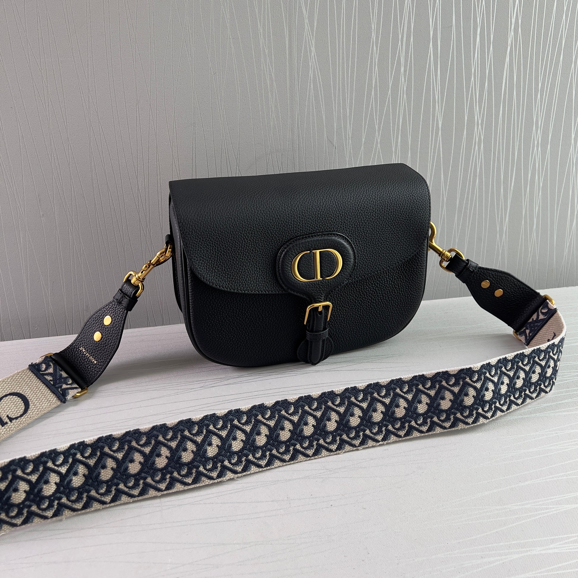 Bolso piel color negro, herrajes dorados, strap en tela bordada color azul marino