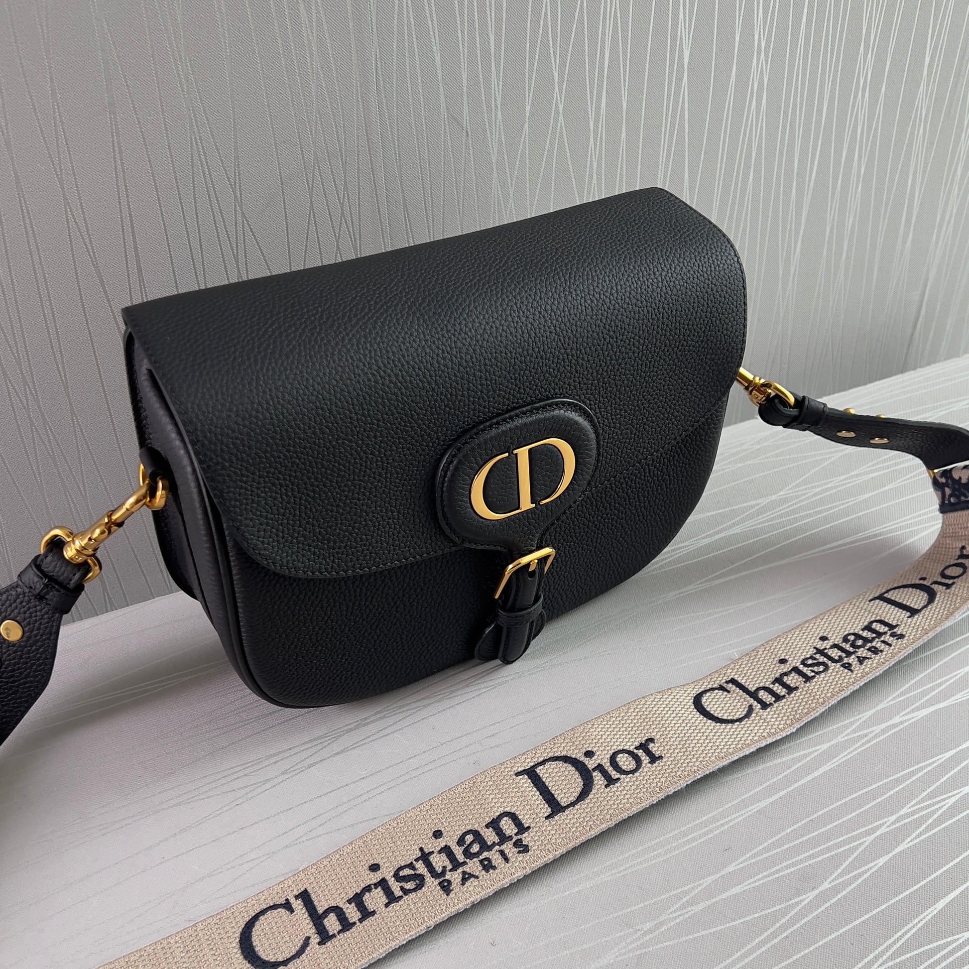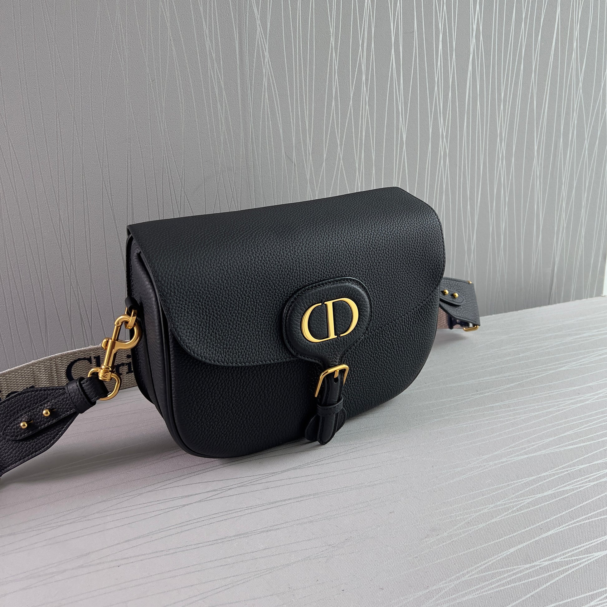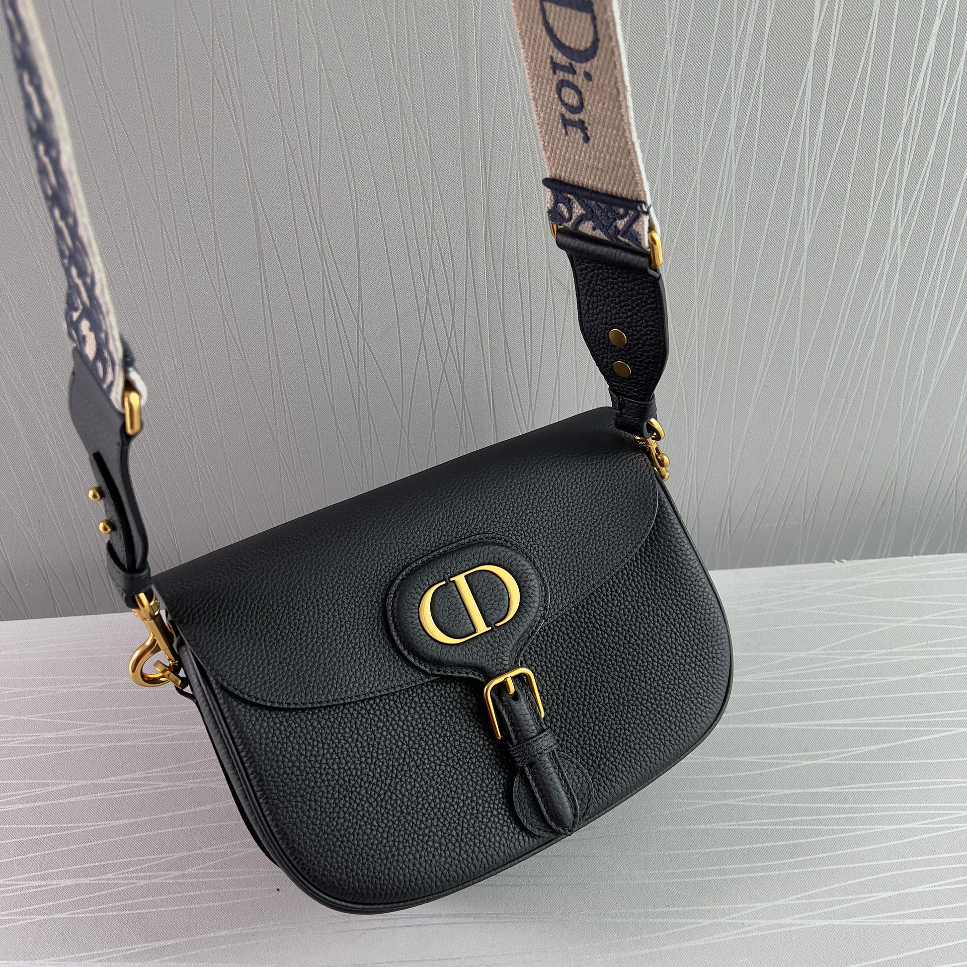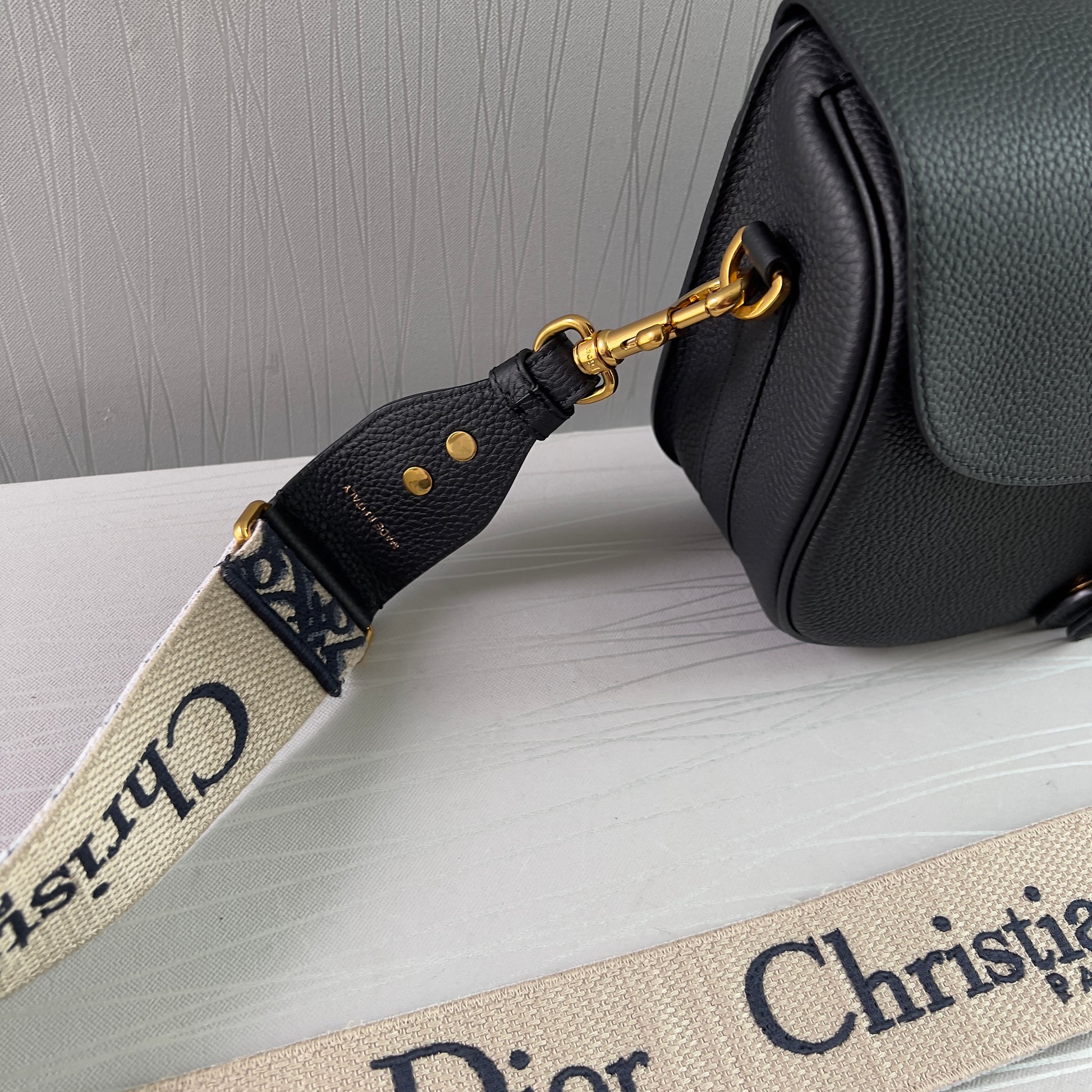 Bolso piel color negro, herrajes dorados, strap en tela bordada color azul marino