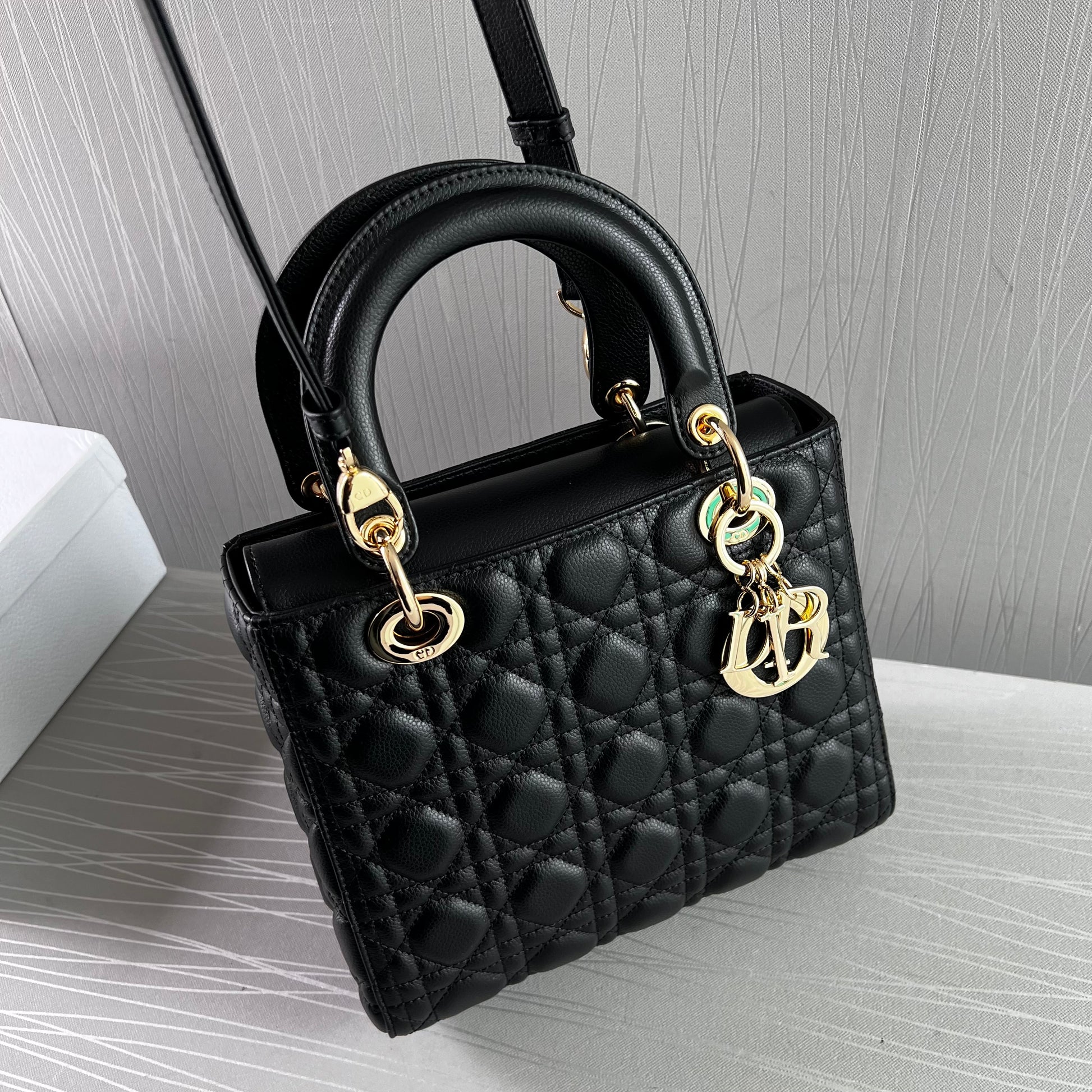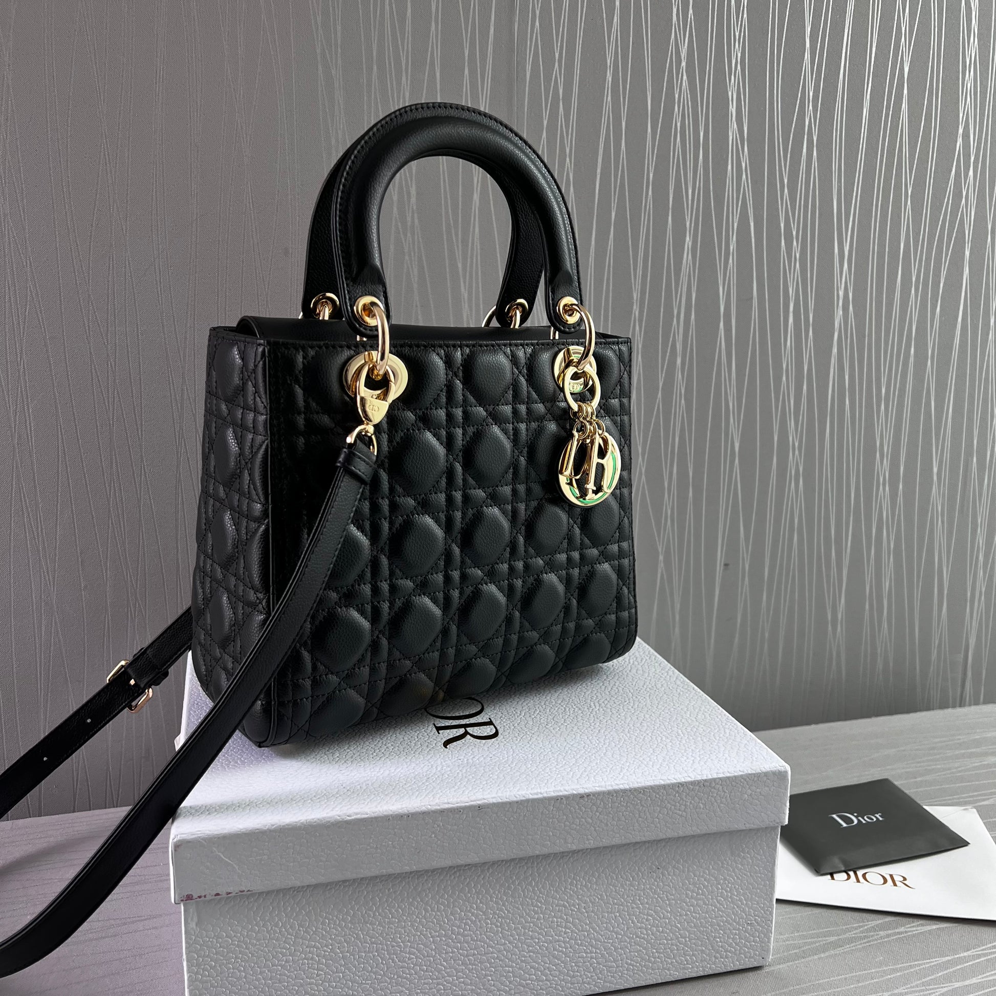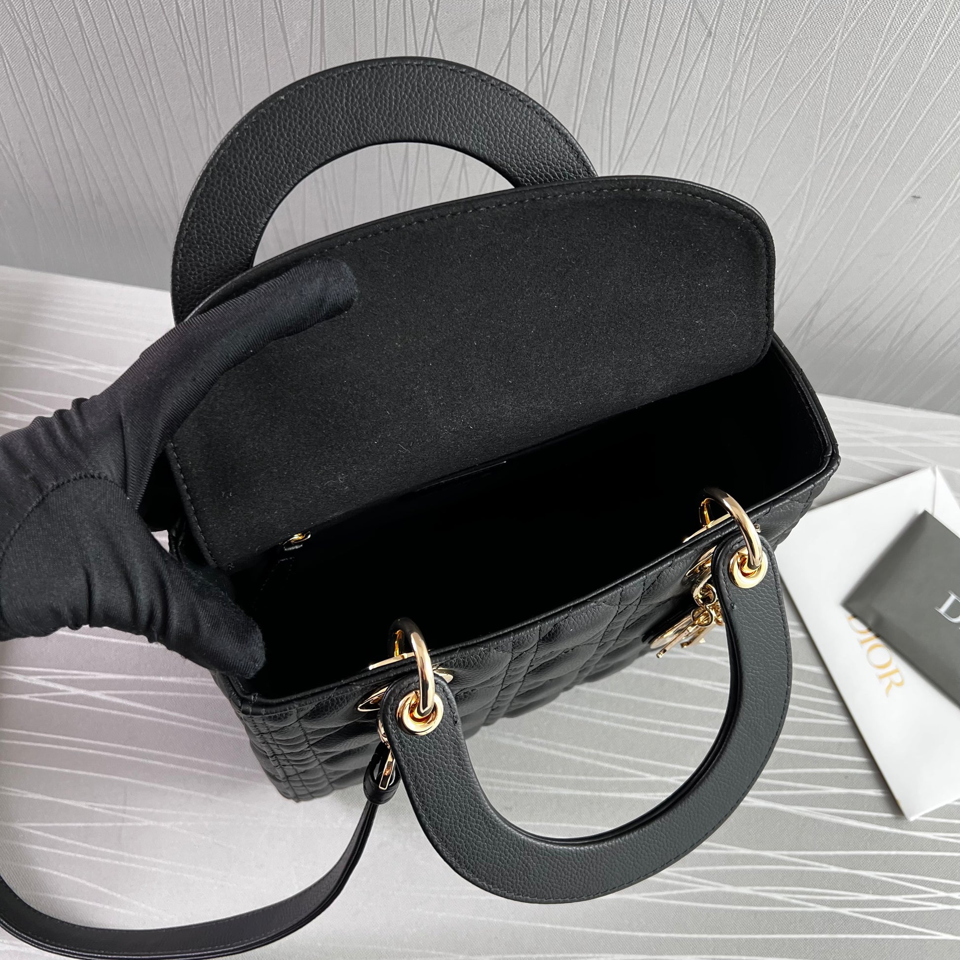 Bolso D piel color negro , herrajes dorados. Incluye caja y guardapolvo. Dimensiones 24 x 21 x 12 cm.