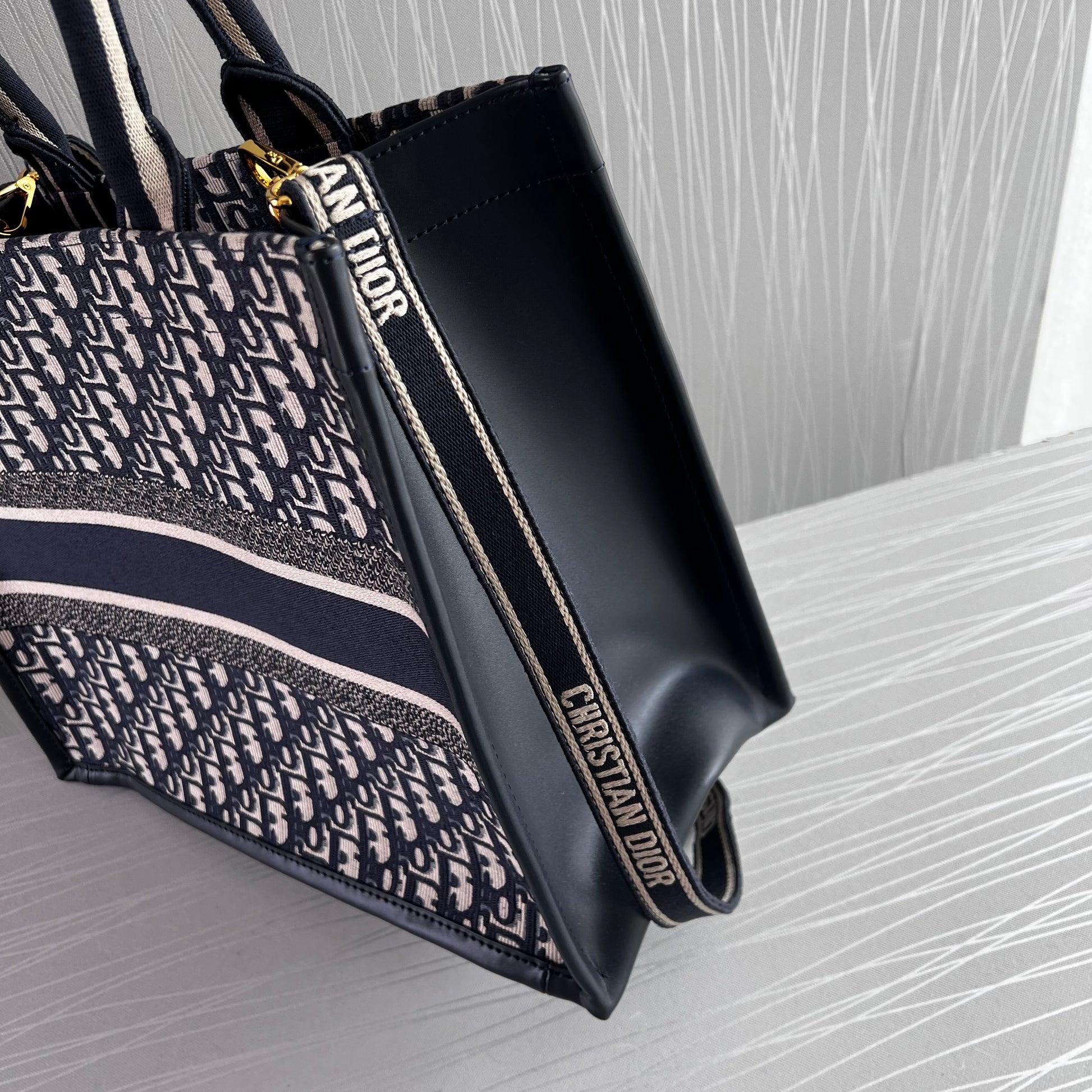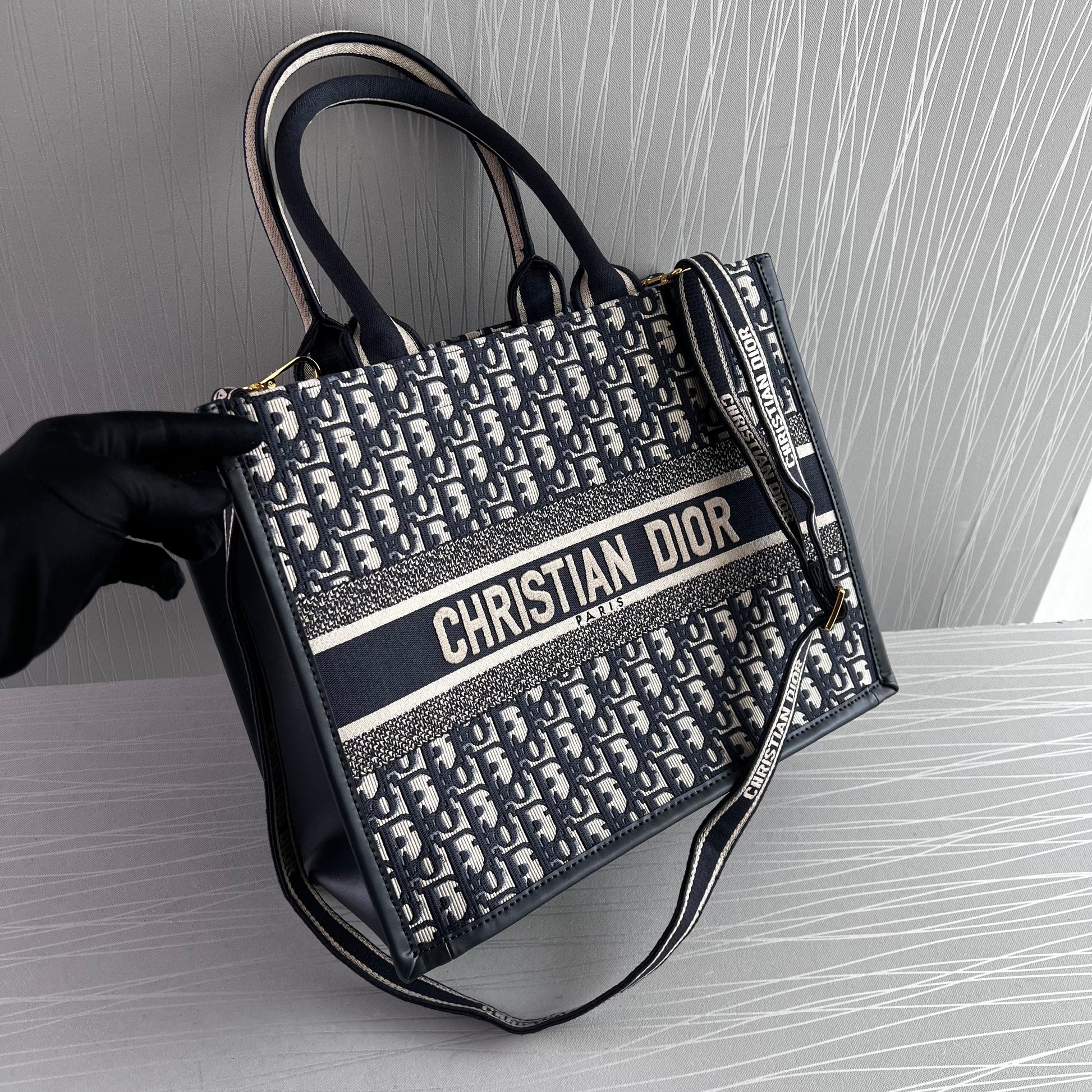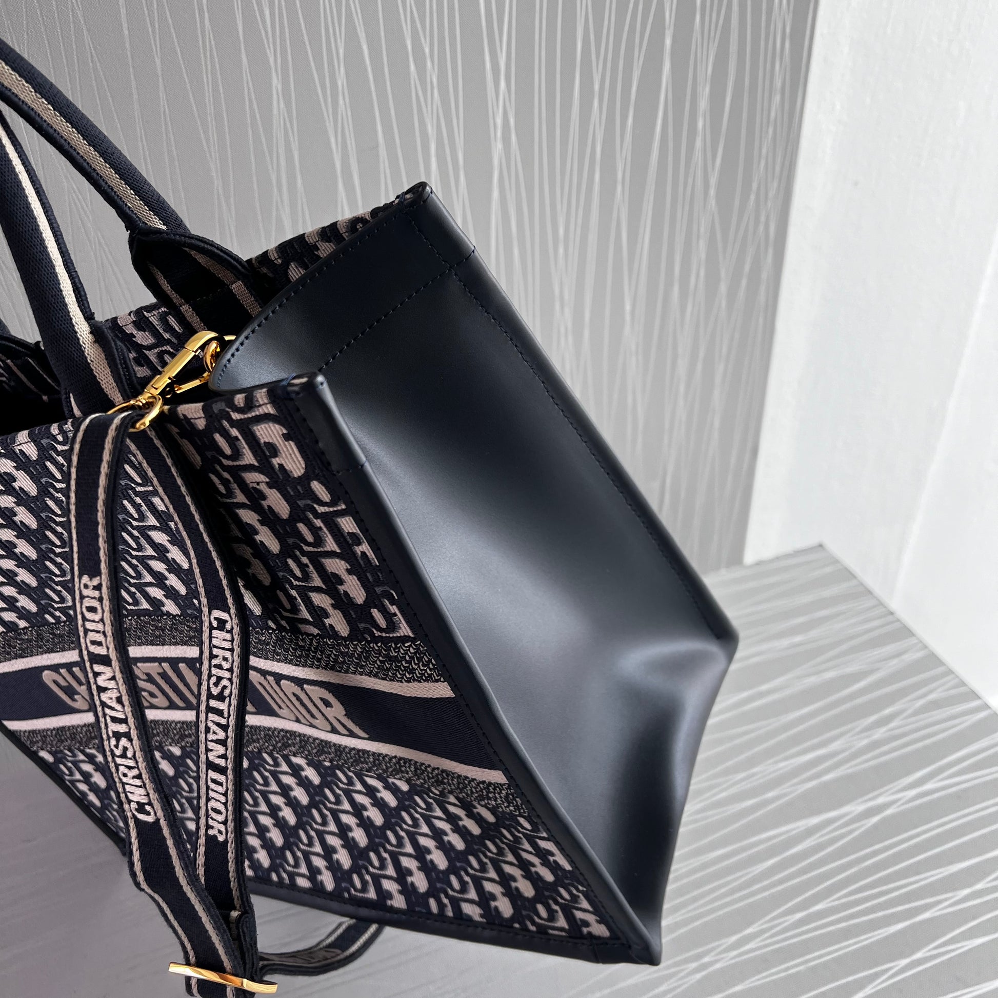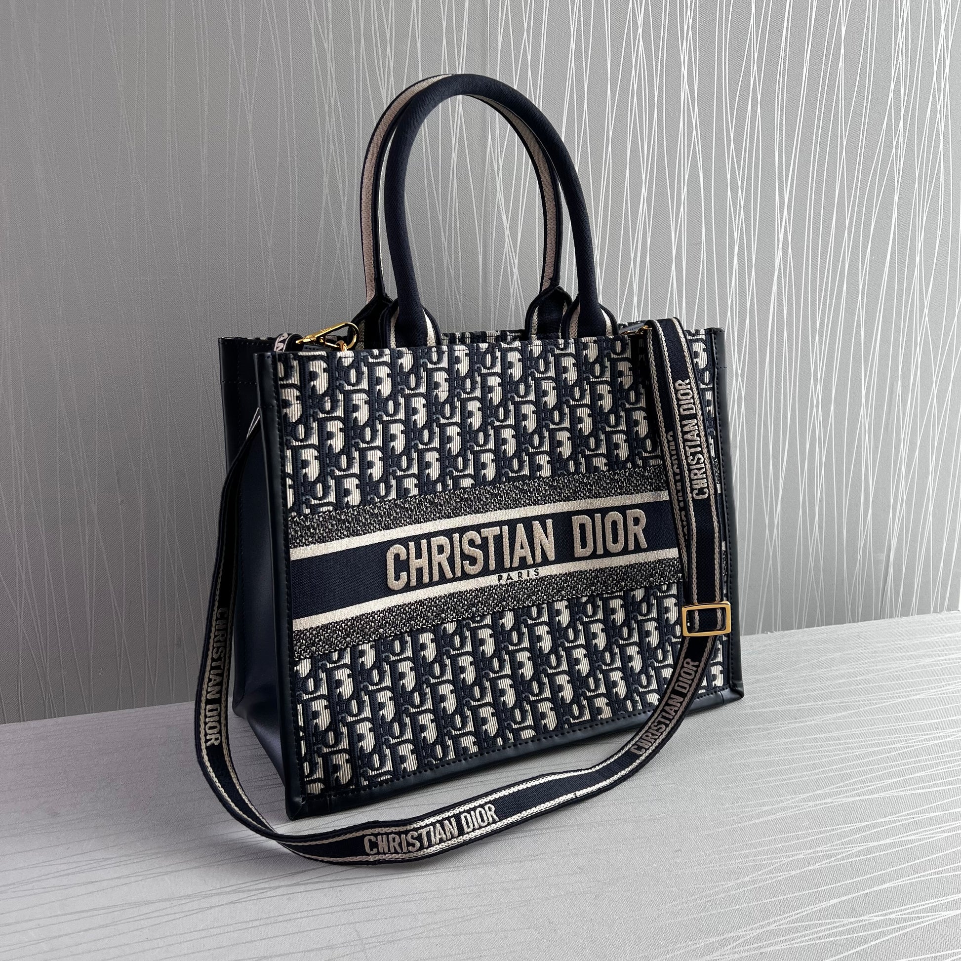 Bolso Tote tamaño mediano, 36.5 cm, color azul marino, tela bordada y costados en piel, incluye strap removible. Incluye Shopping bag y bolsa guardapolvo.