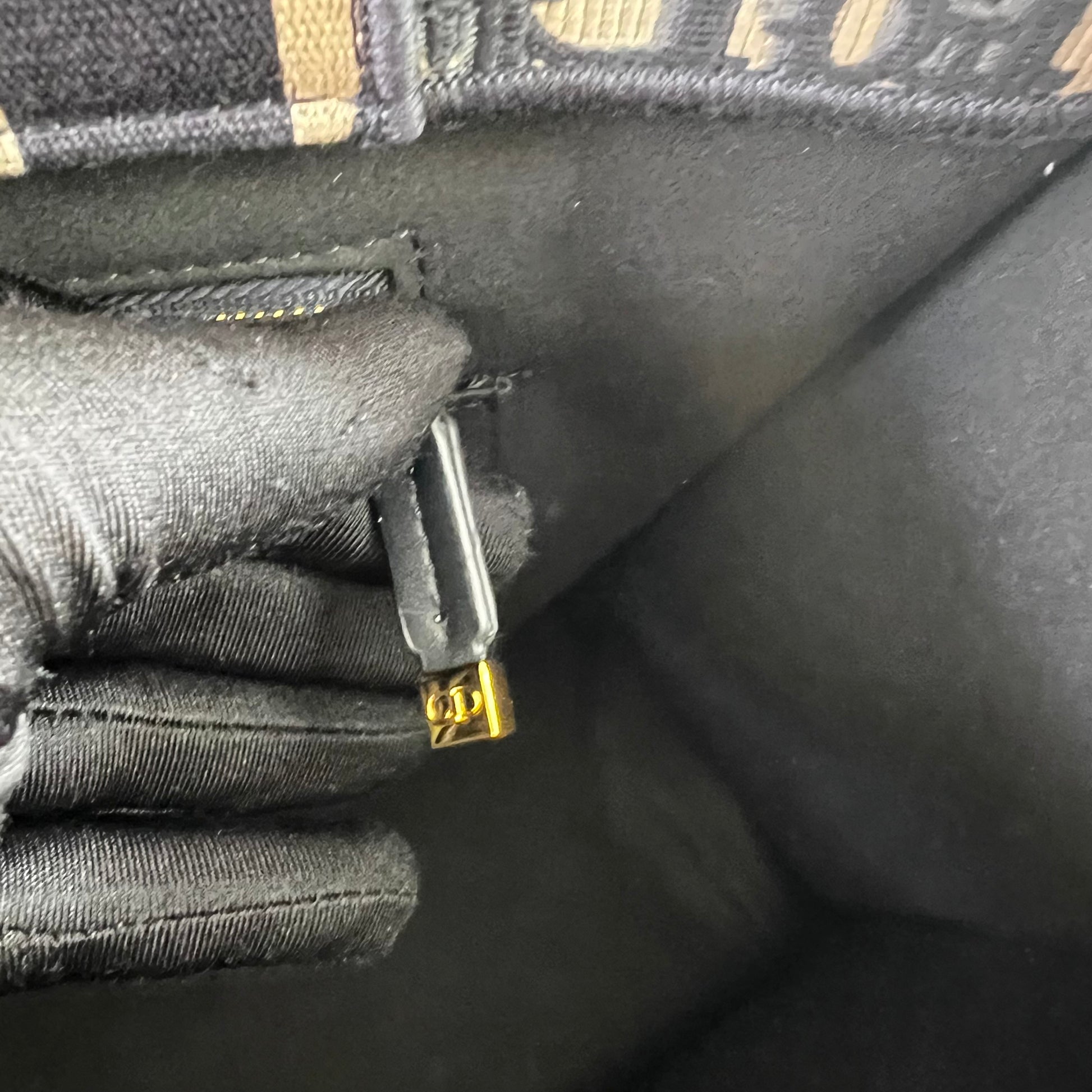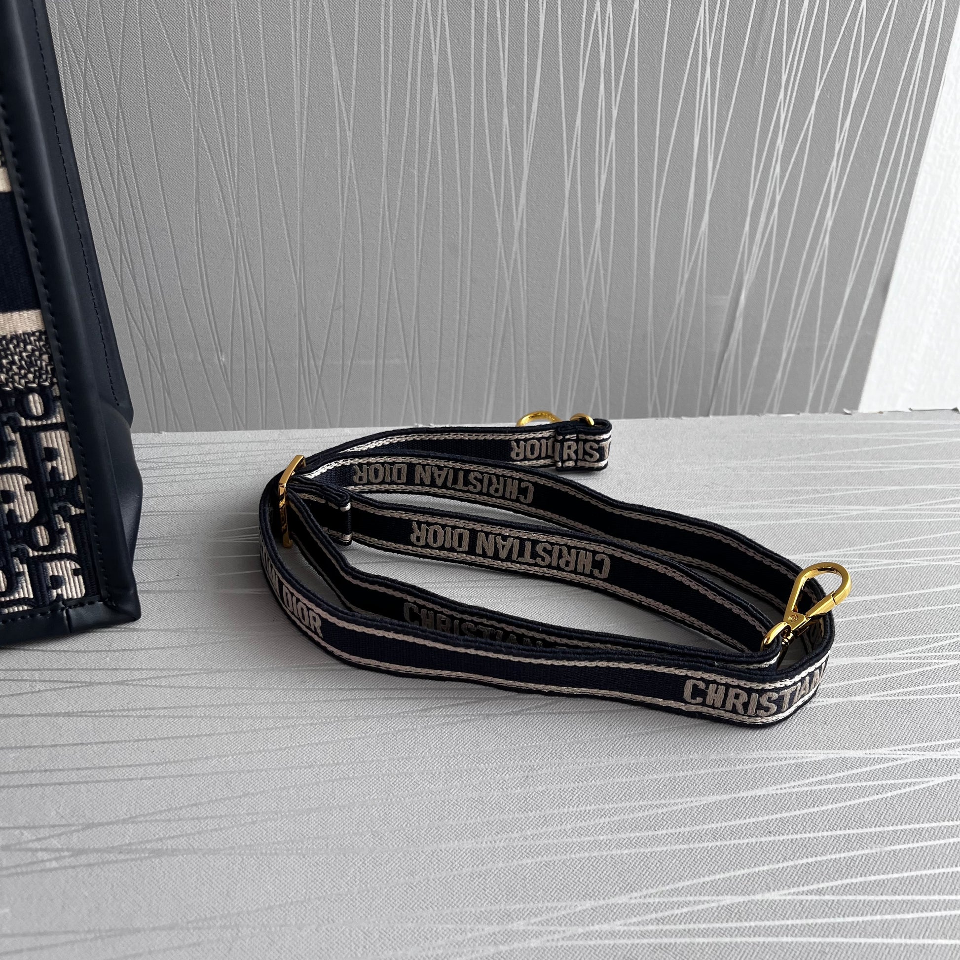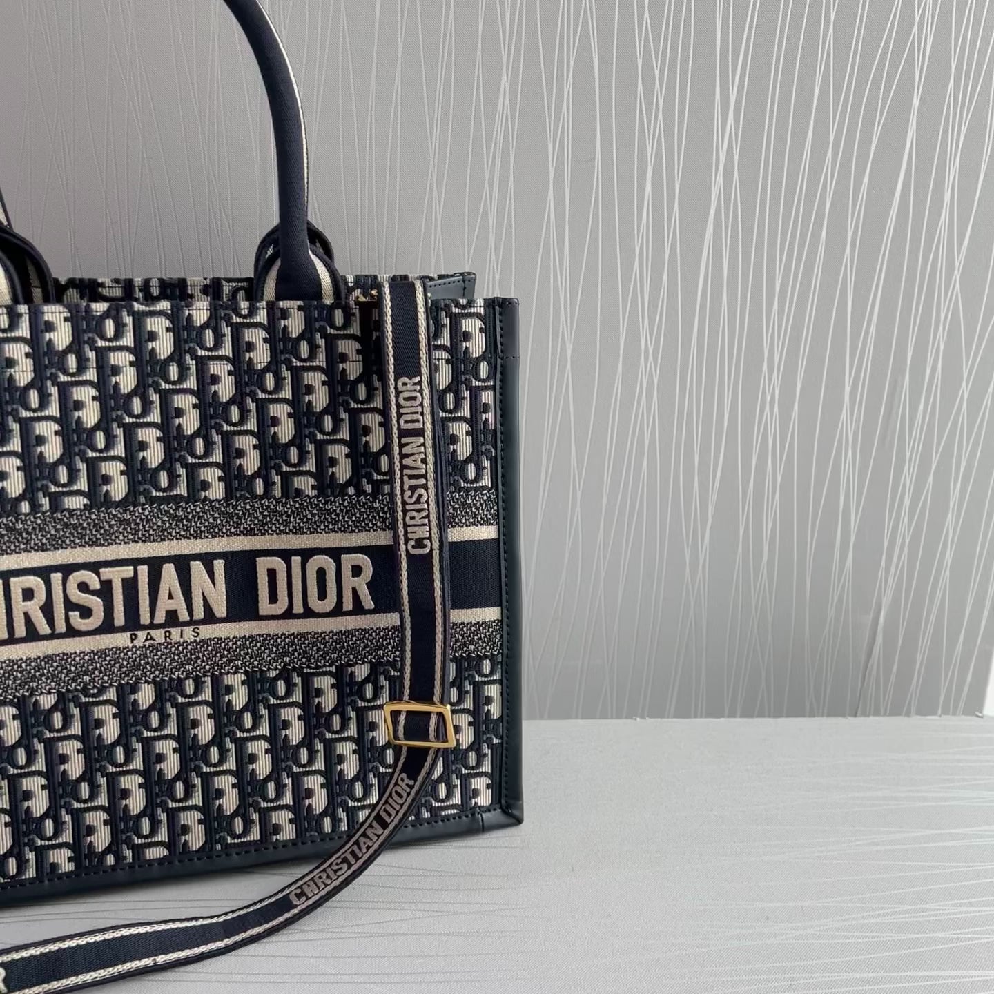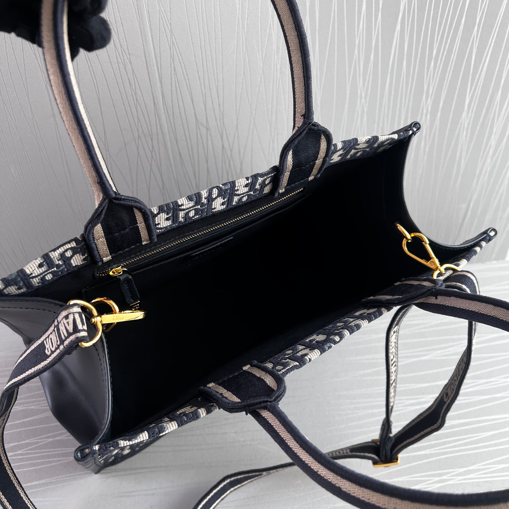 Bolso Tote tamaño mediano, 36.5 cm, color azul marino, tela bordada y costados en piel, incluye strap removible. Incluye Shopping bag y bolsa guardapolvo.