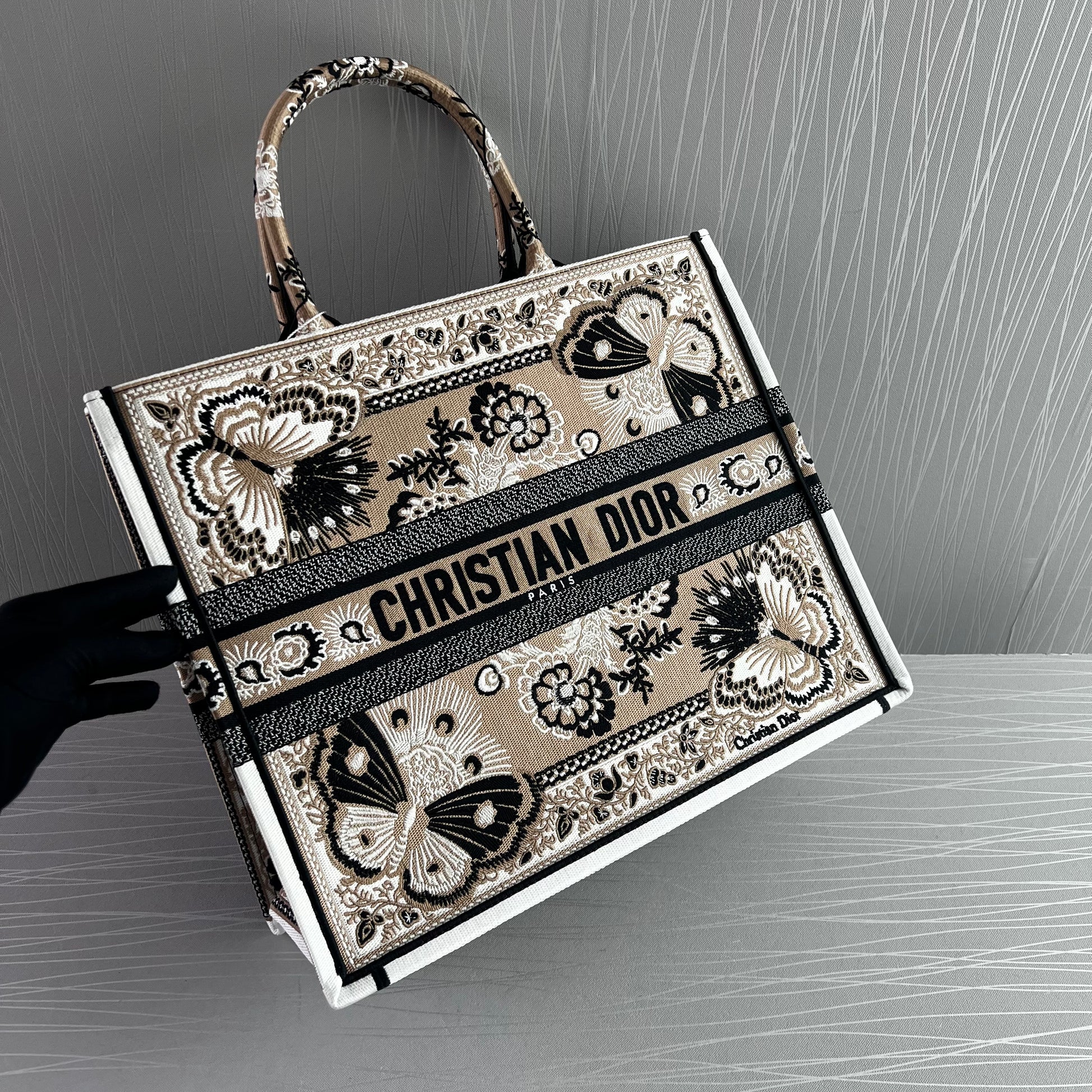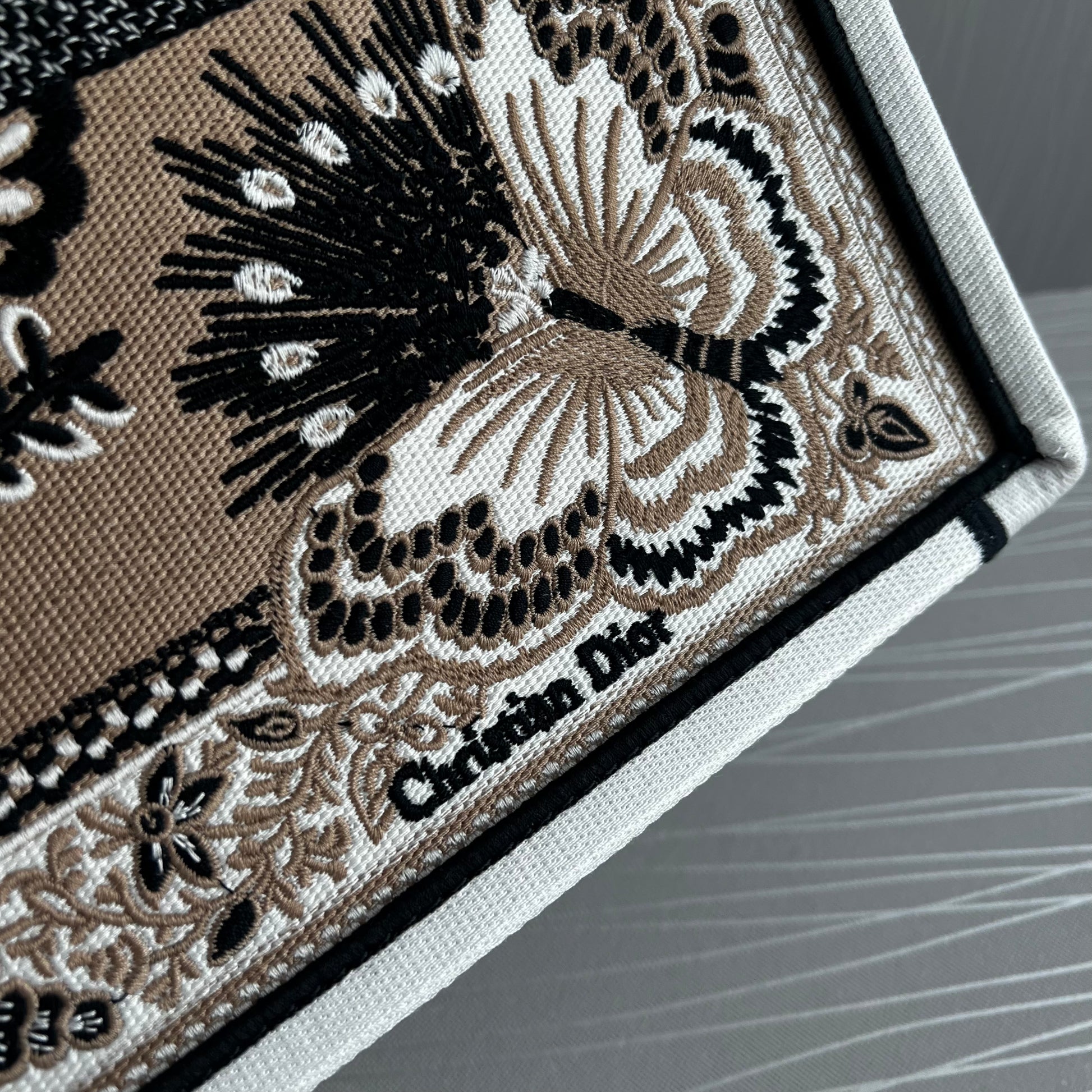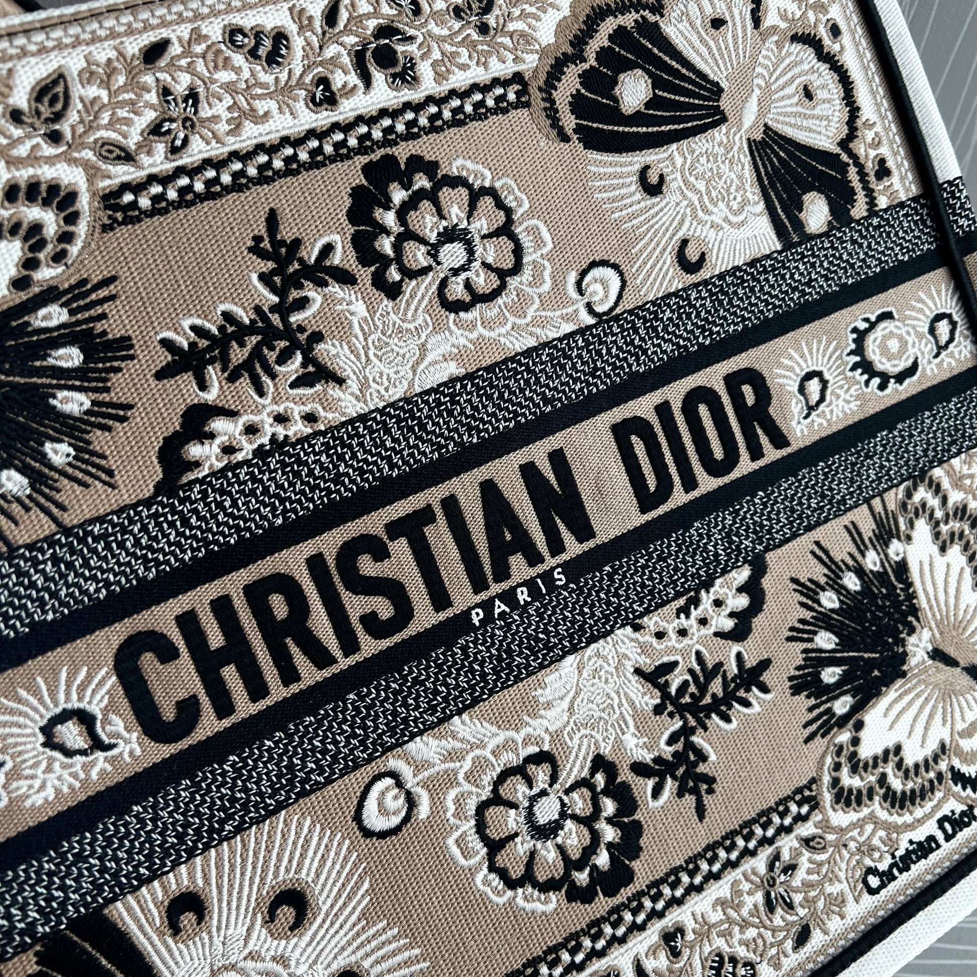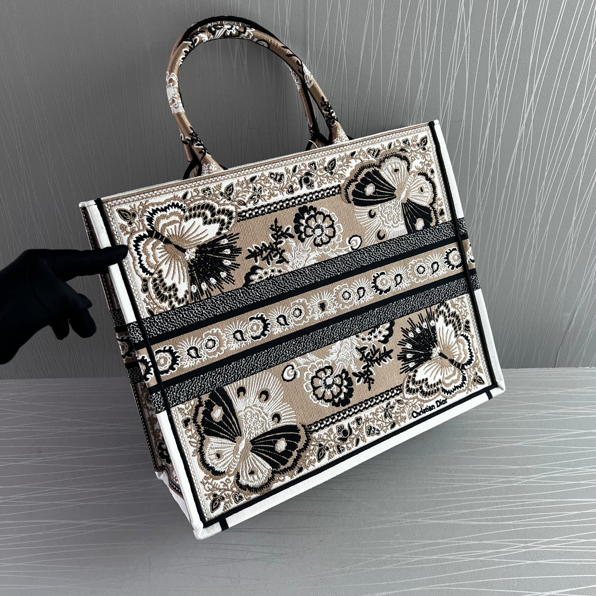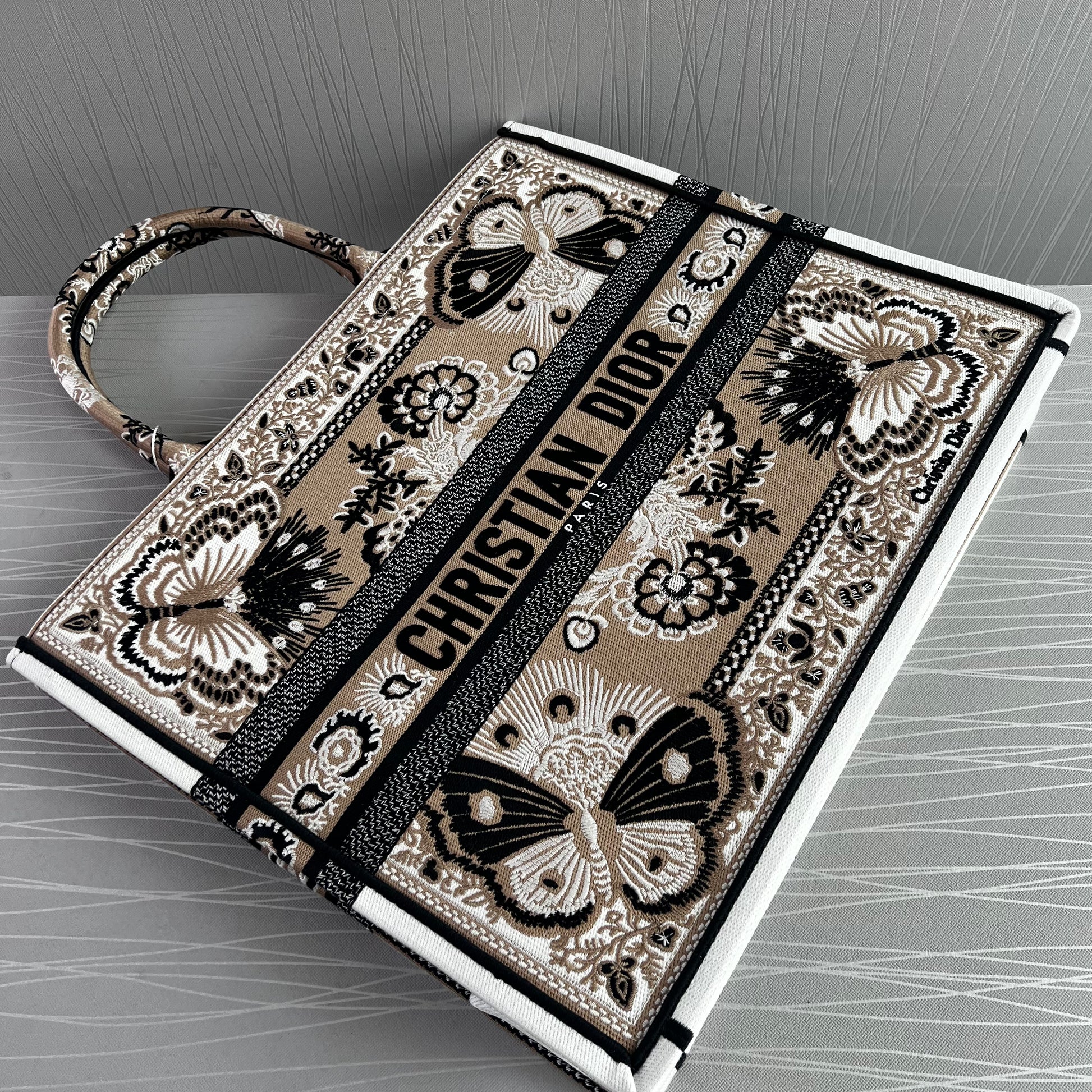 Bolso Tote tela bordada butterfly color beige multicolor, tamaño grande 42 X 35 X 18.5 cm, incluye shopping bag y bolsa guardapolvo.