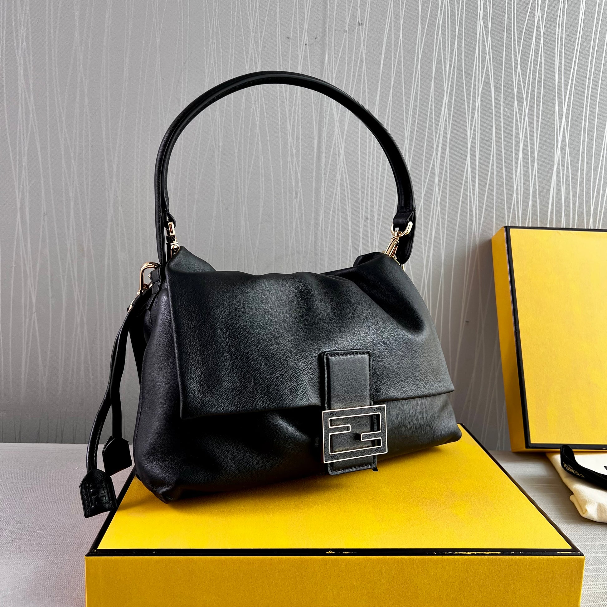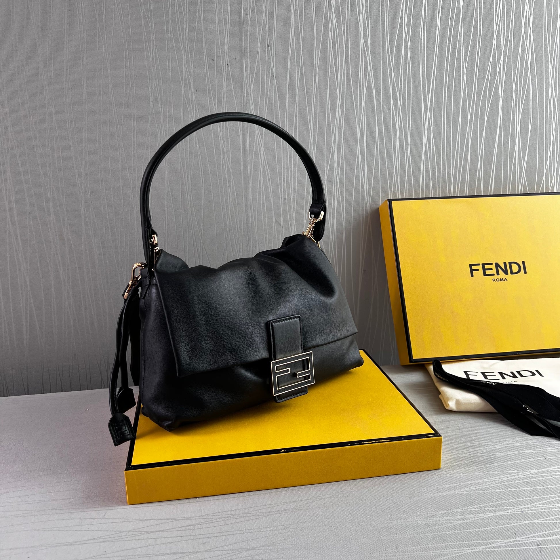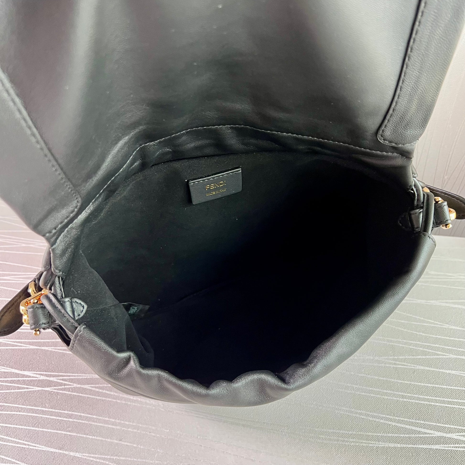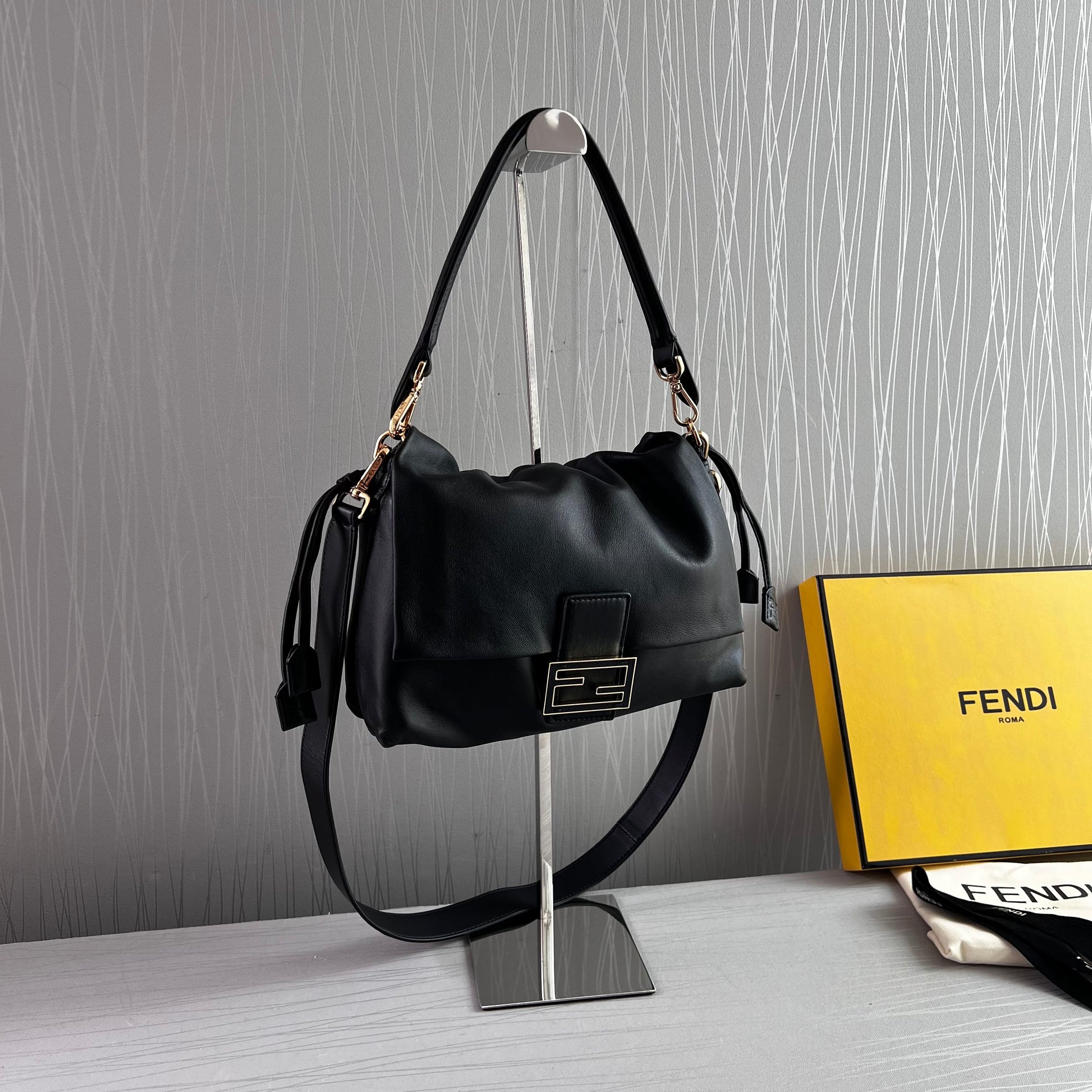 Bolso F piel napa color negro.Tamaño mediano, herrajes color dorado. Forro de ante.Cierre magnético de cordón ajustable. Se puede llevar al hombre o cruzada ambas asas desmontables. Piel suave. Dimensiones 26.5 x 18 x 8.5 cm. Incluye caja, shopping bag, listón, bolsa guardapolvo.