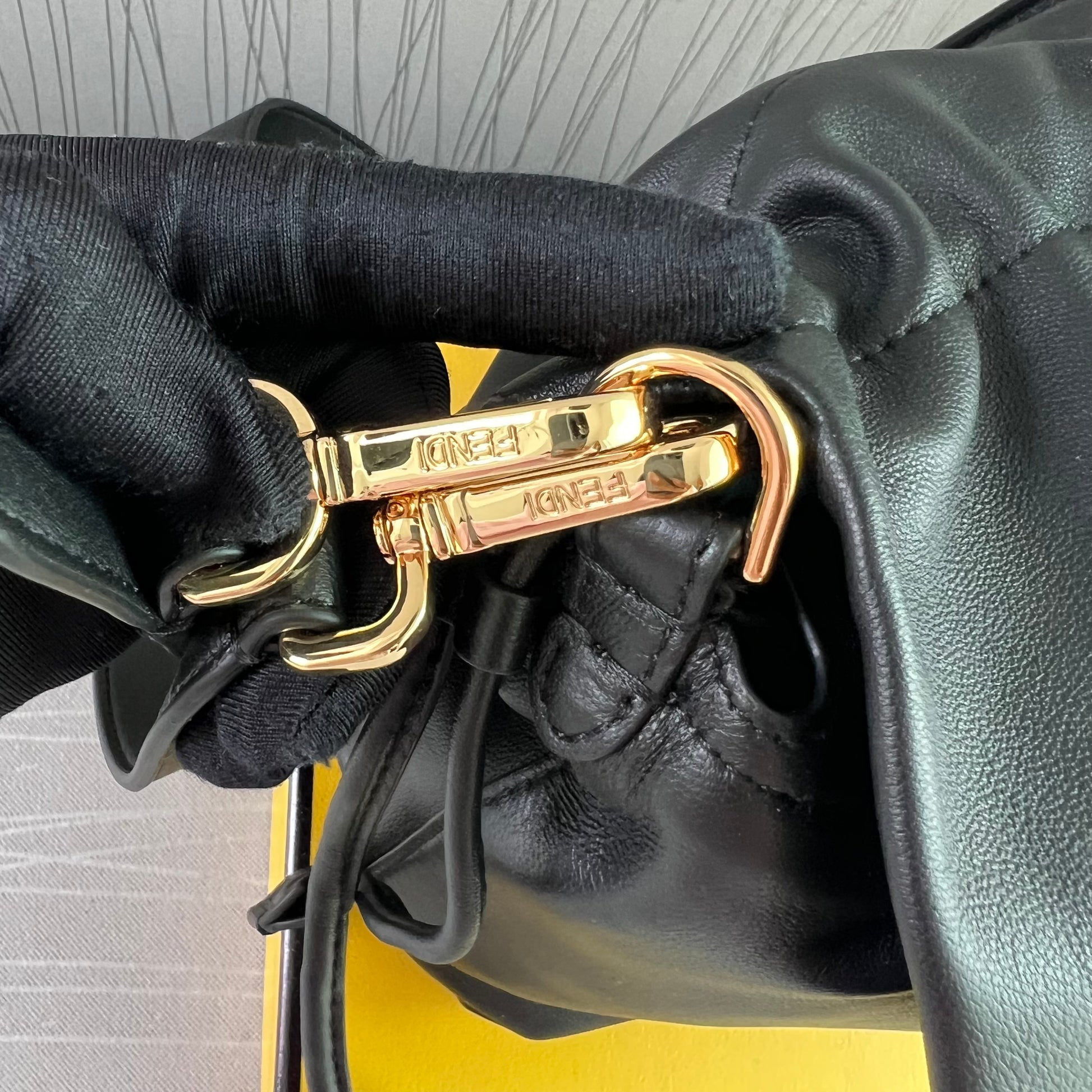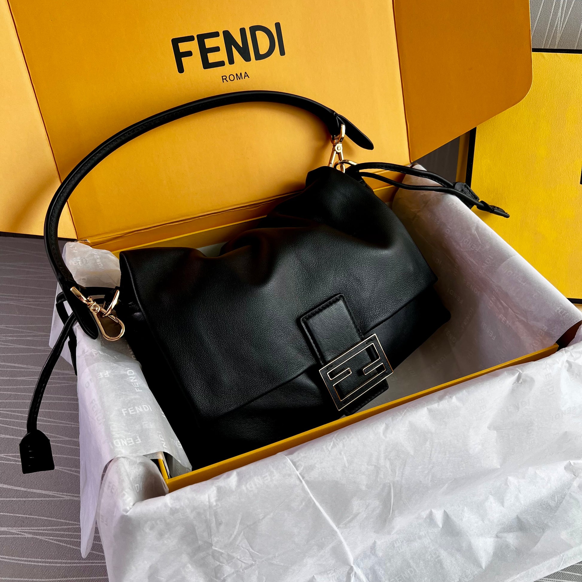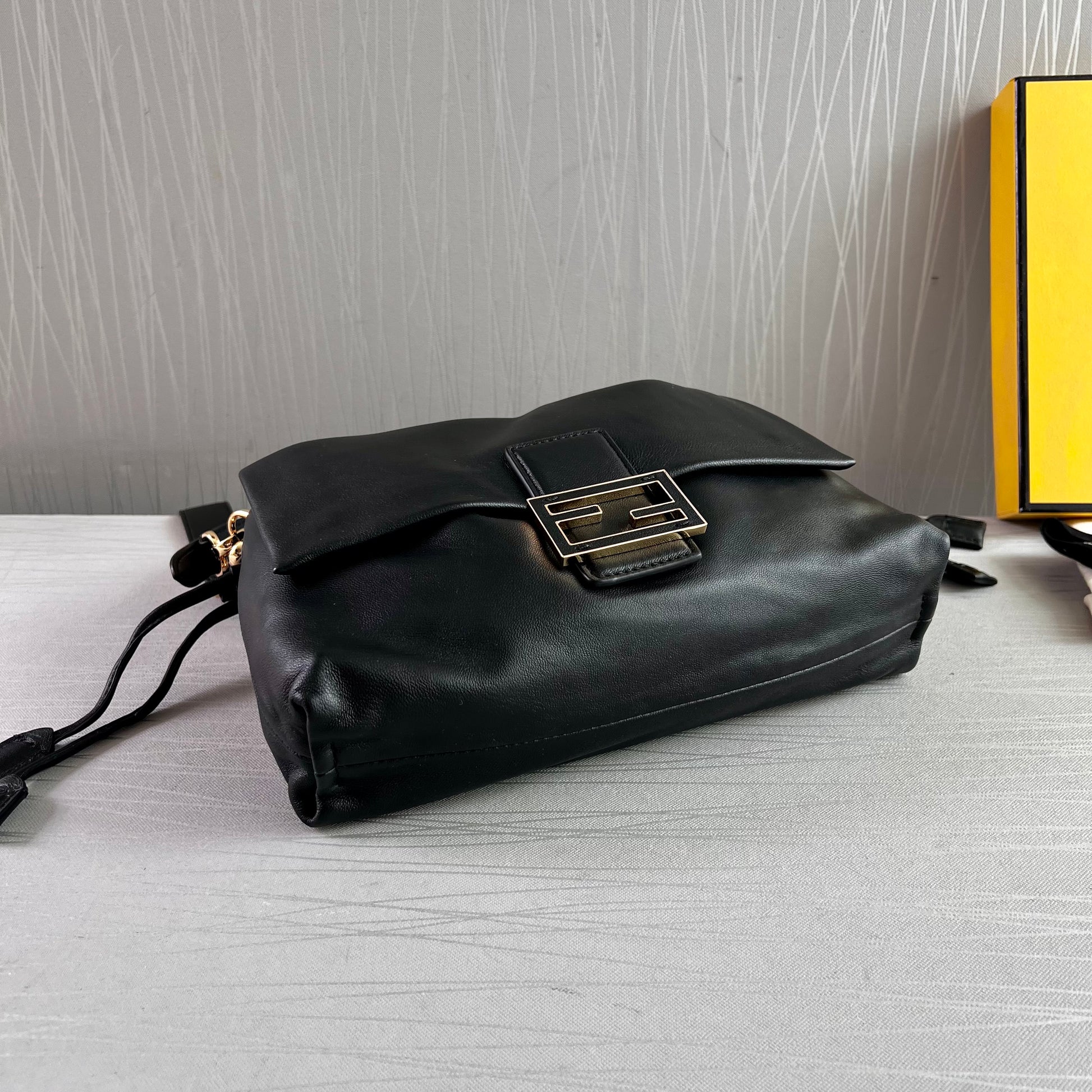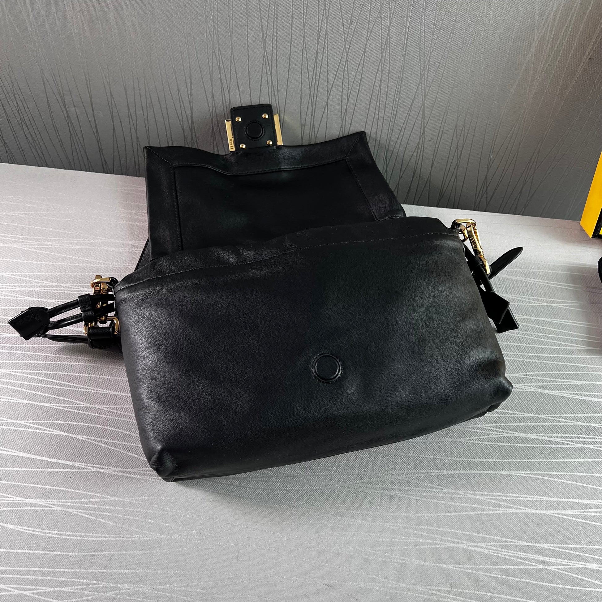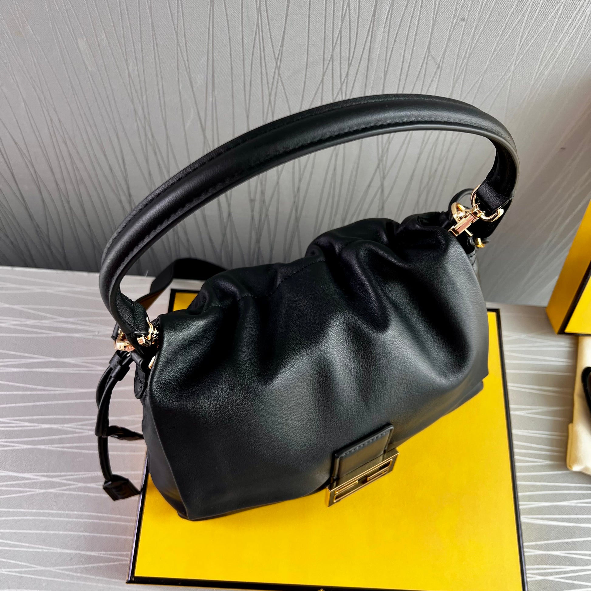 Bolso F piel napa color negro.Tamaño mediano, herrajes color dorado. Forro de ante.Cierre magnético de cordón ajustable. Se puede llevar al hombre o cruzada ambas asas desmontables. Piel suave. Dimensiones 26.5 x 18 x 8.5 cm. Incluye caja, shopping bag, listón, bolsa guardapolvo.