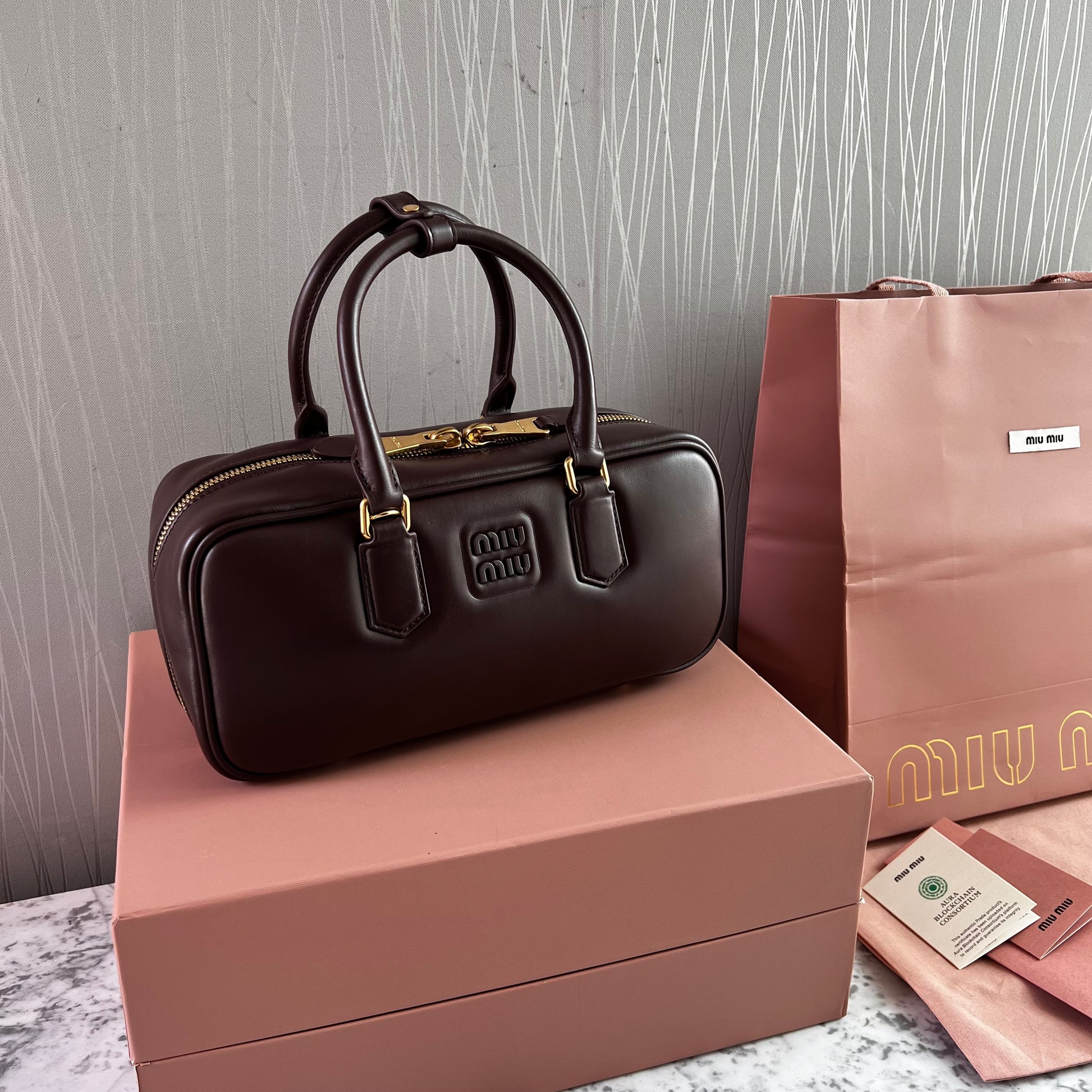 Bolso M-iu piel color café, acolchado ligero . Bandolera de piel ajustable y extraíble . Herrajes en tono dorado. Incluye caja, guardapolvo, shopping bag. Dimensiones 27x12x9 cm.