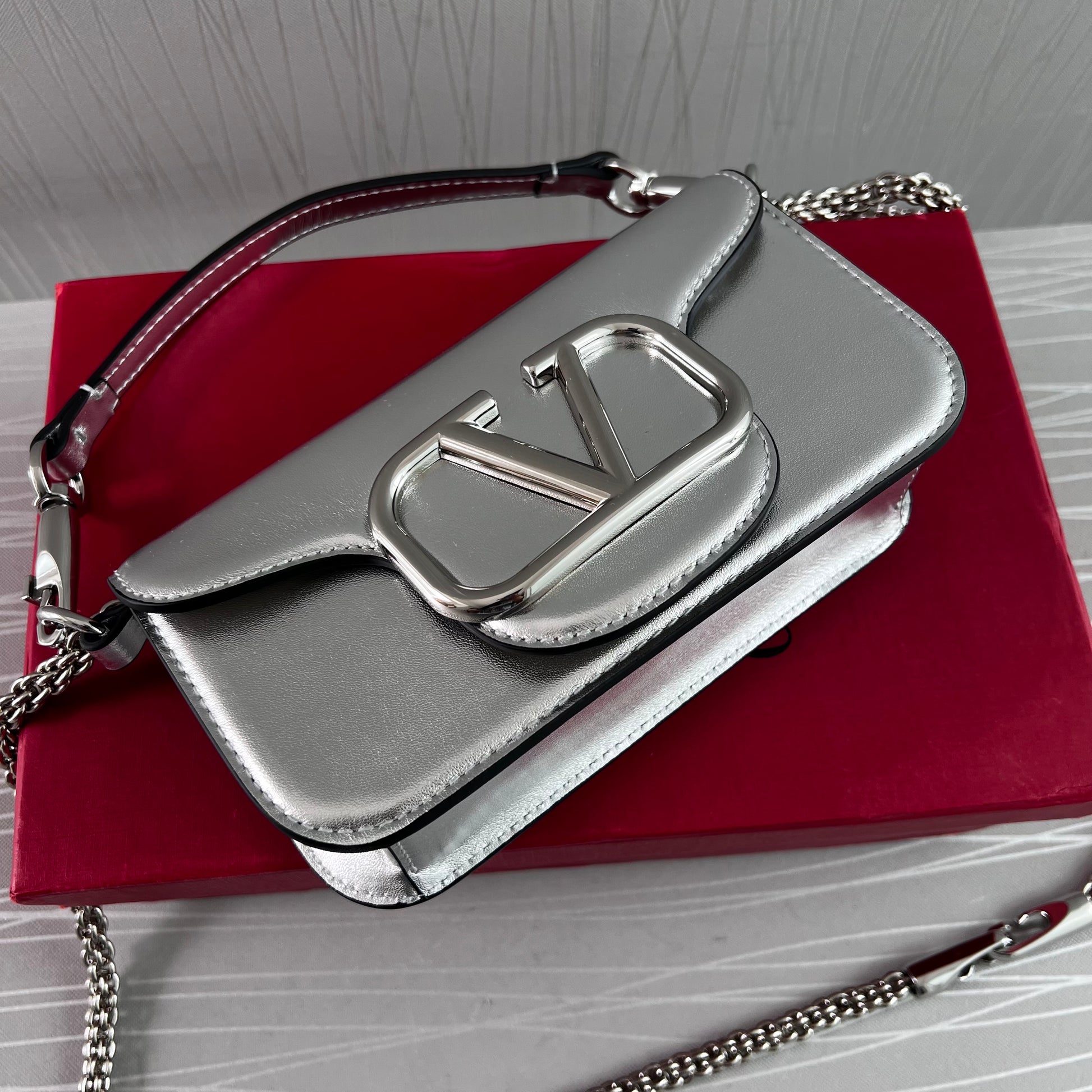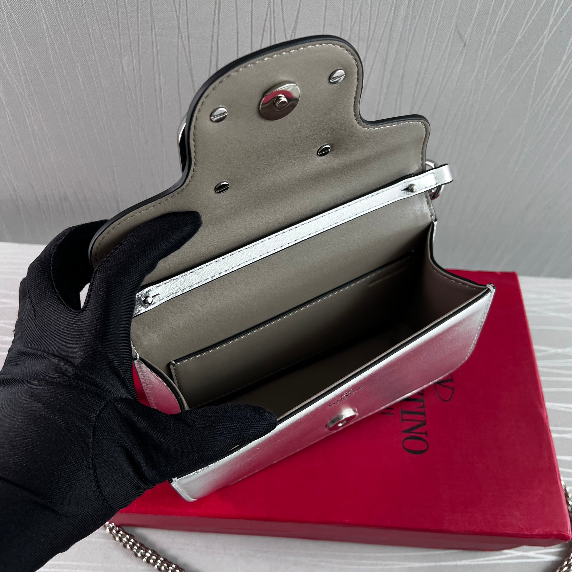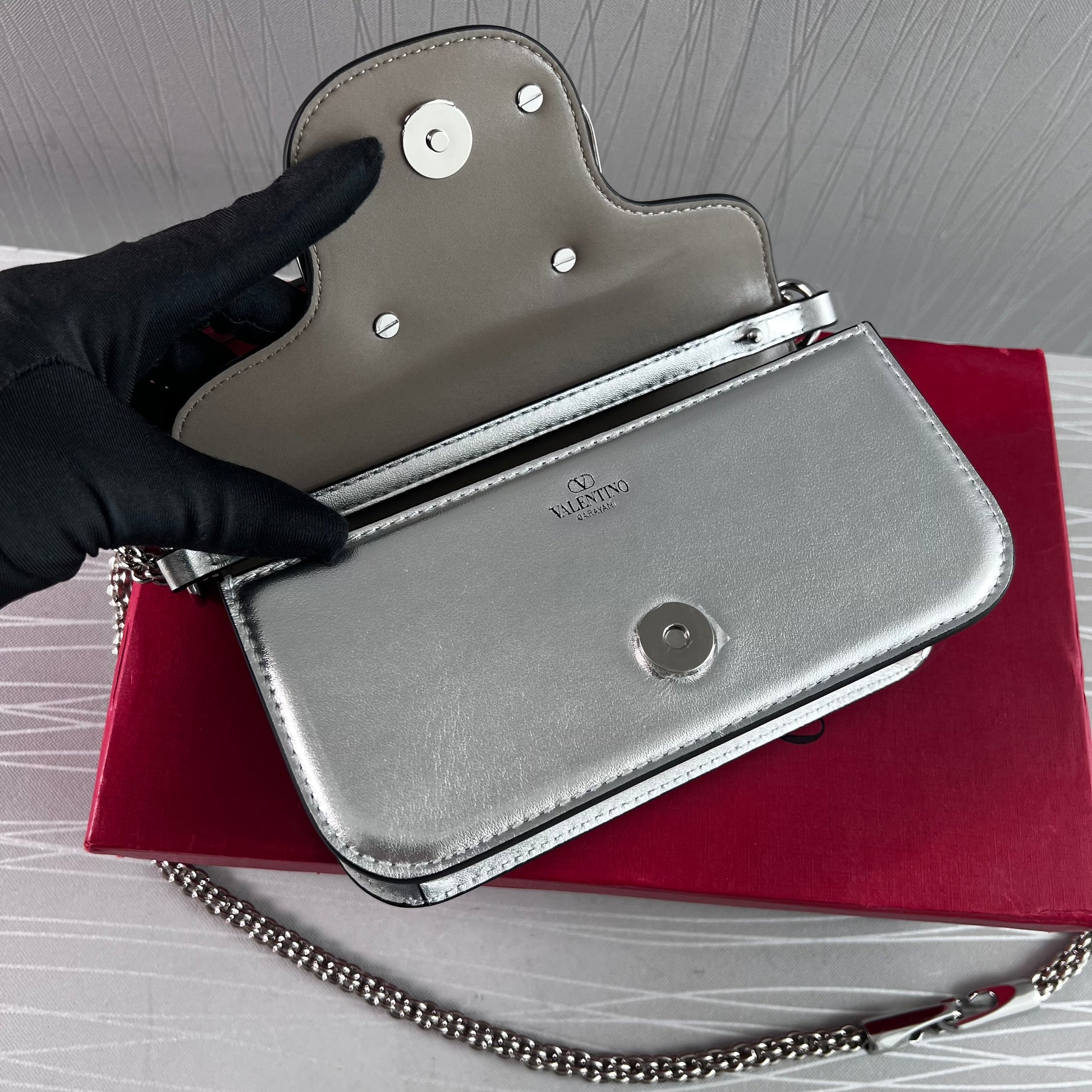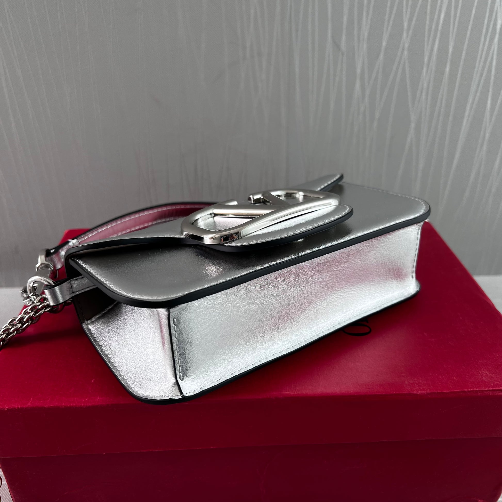 Bolso piel color plata con herrajes y cadena del mismo color. Incluye shopping bag y guardapolvo. Dimensiones 20 x 11 x 5 cm.