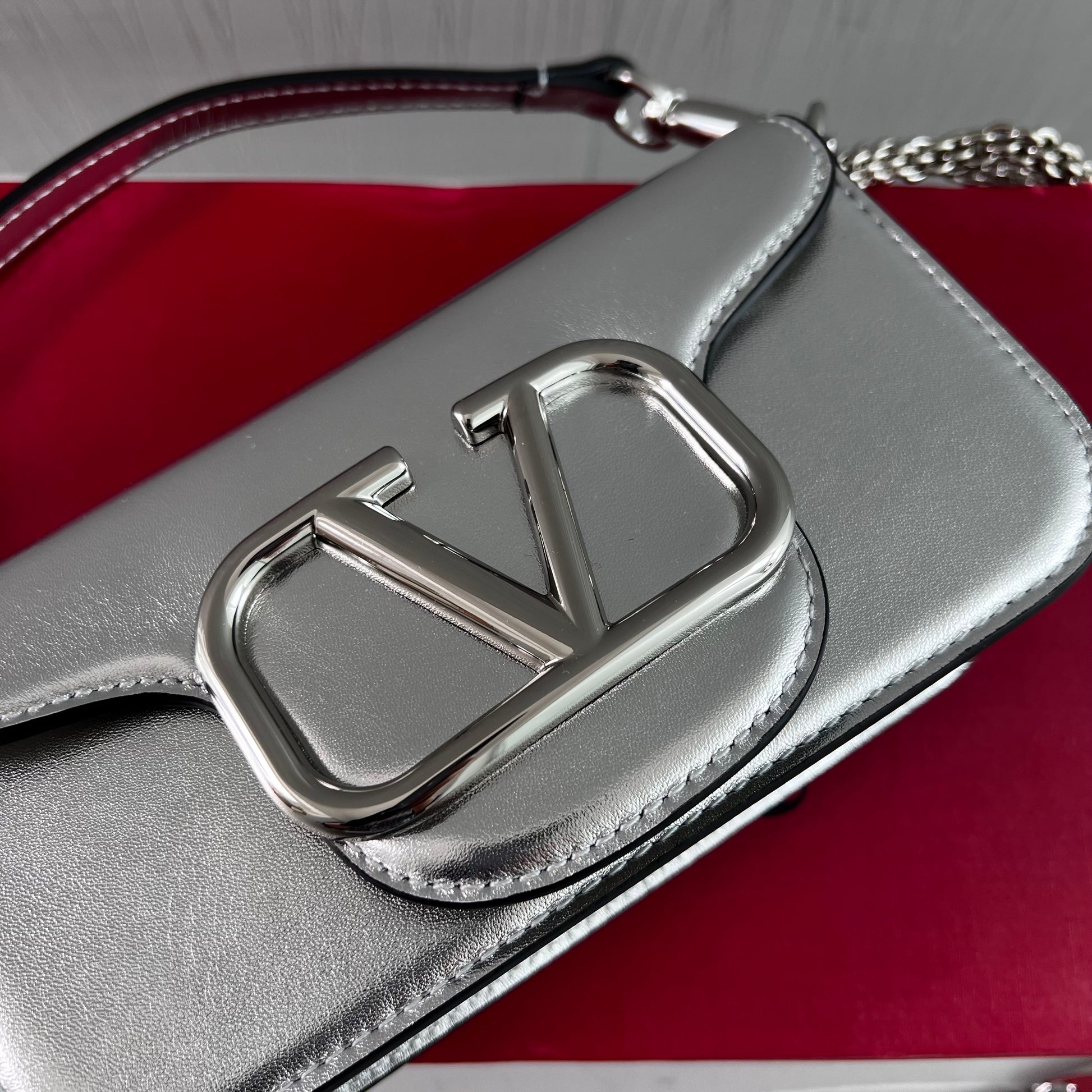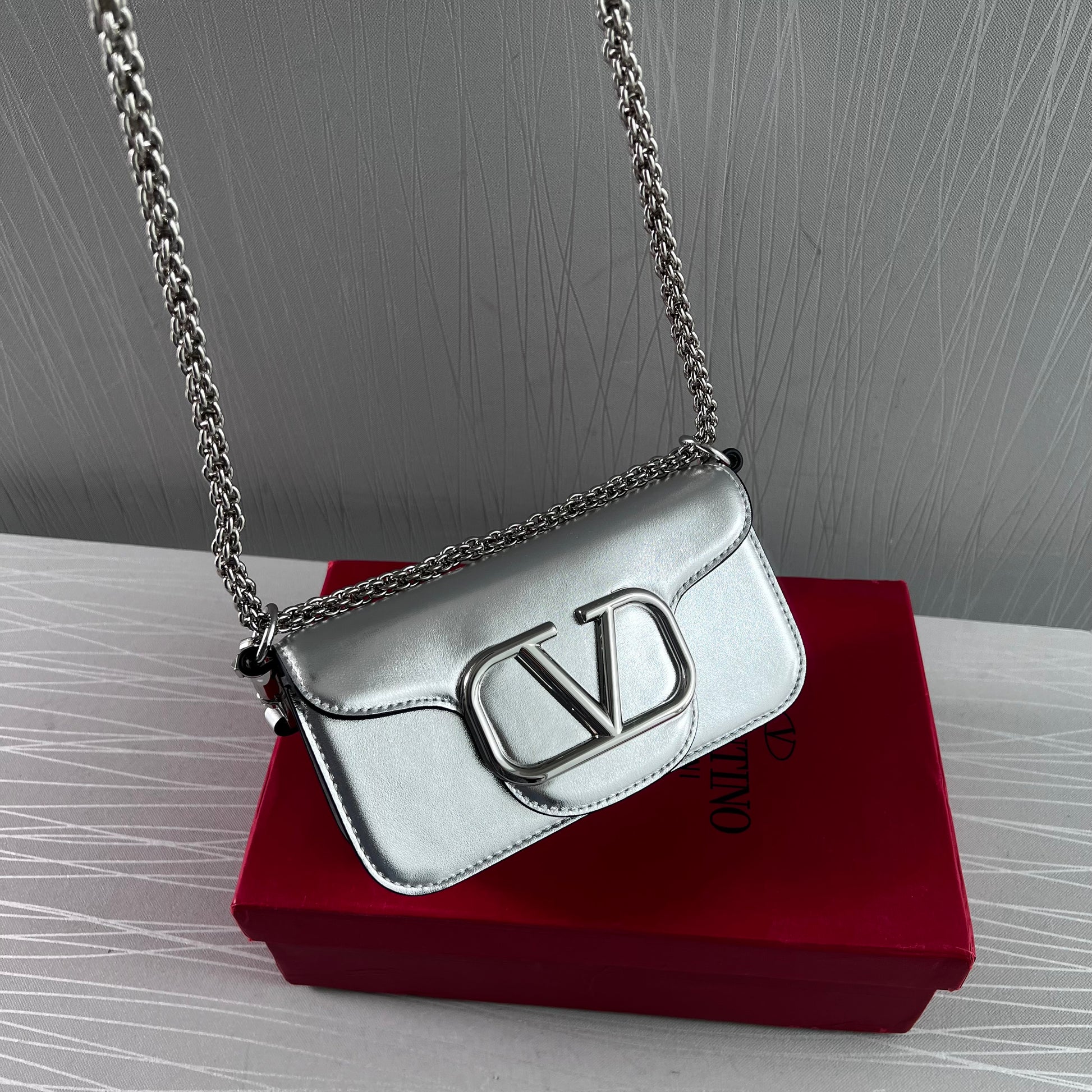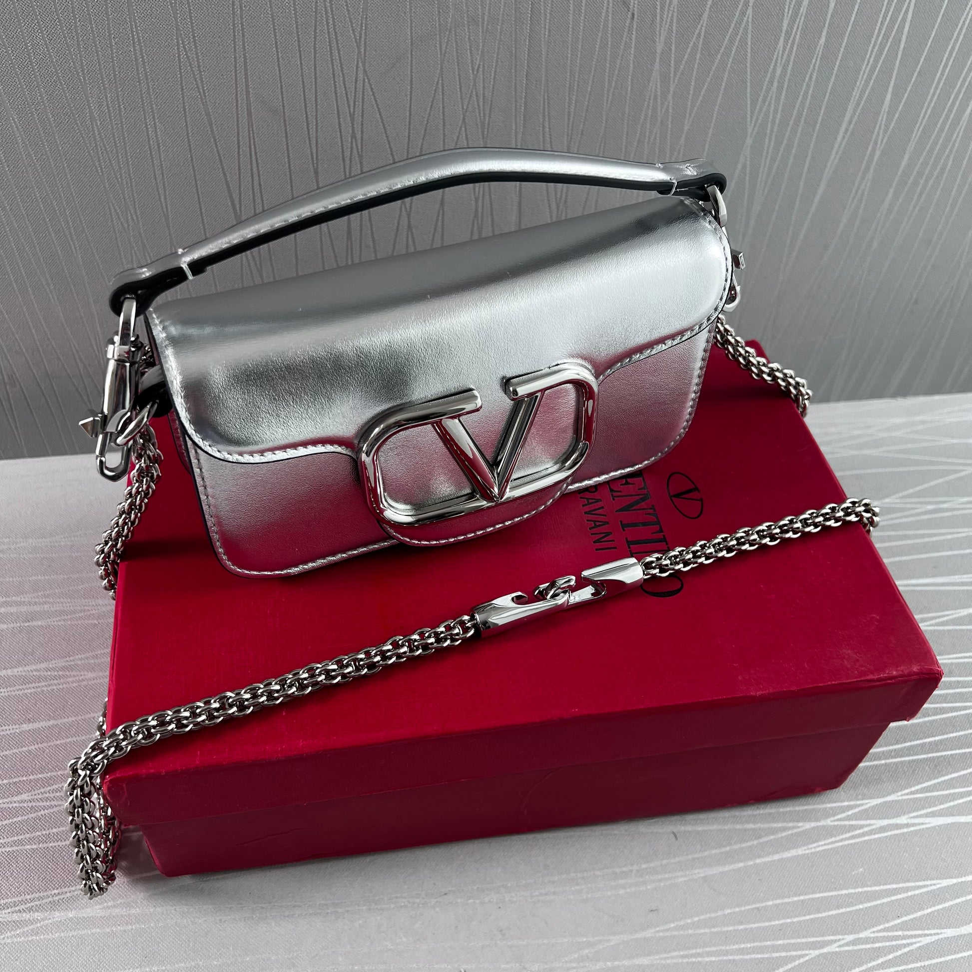 Bolso piel color plata con herrajes y cadena del mismo color. Incluye shopping bag y guardapolvo. Dimensiones 20 x 11 x 5 cm.