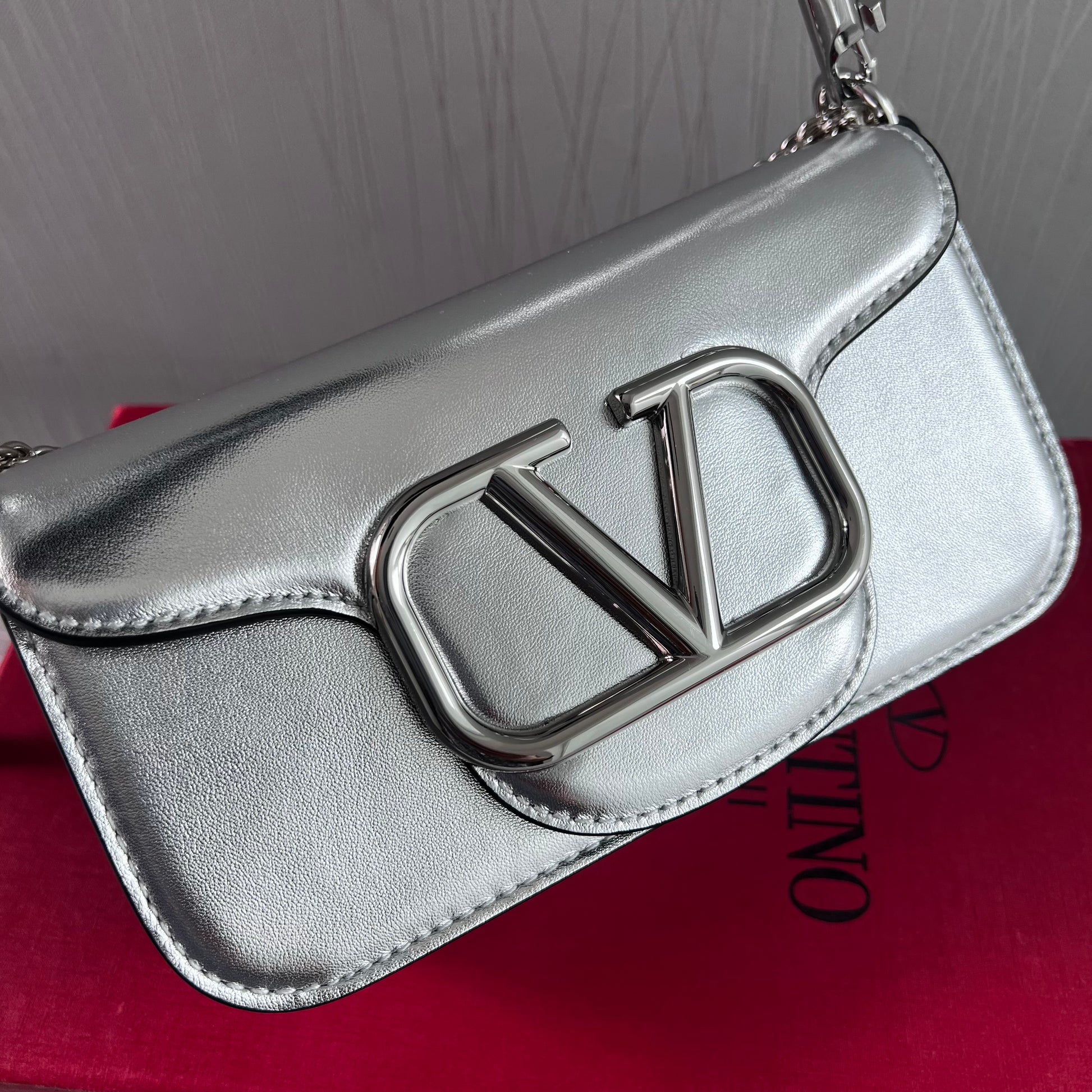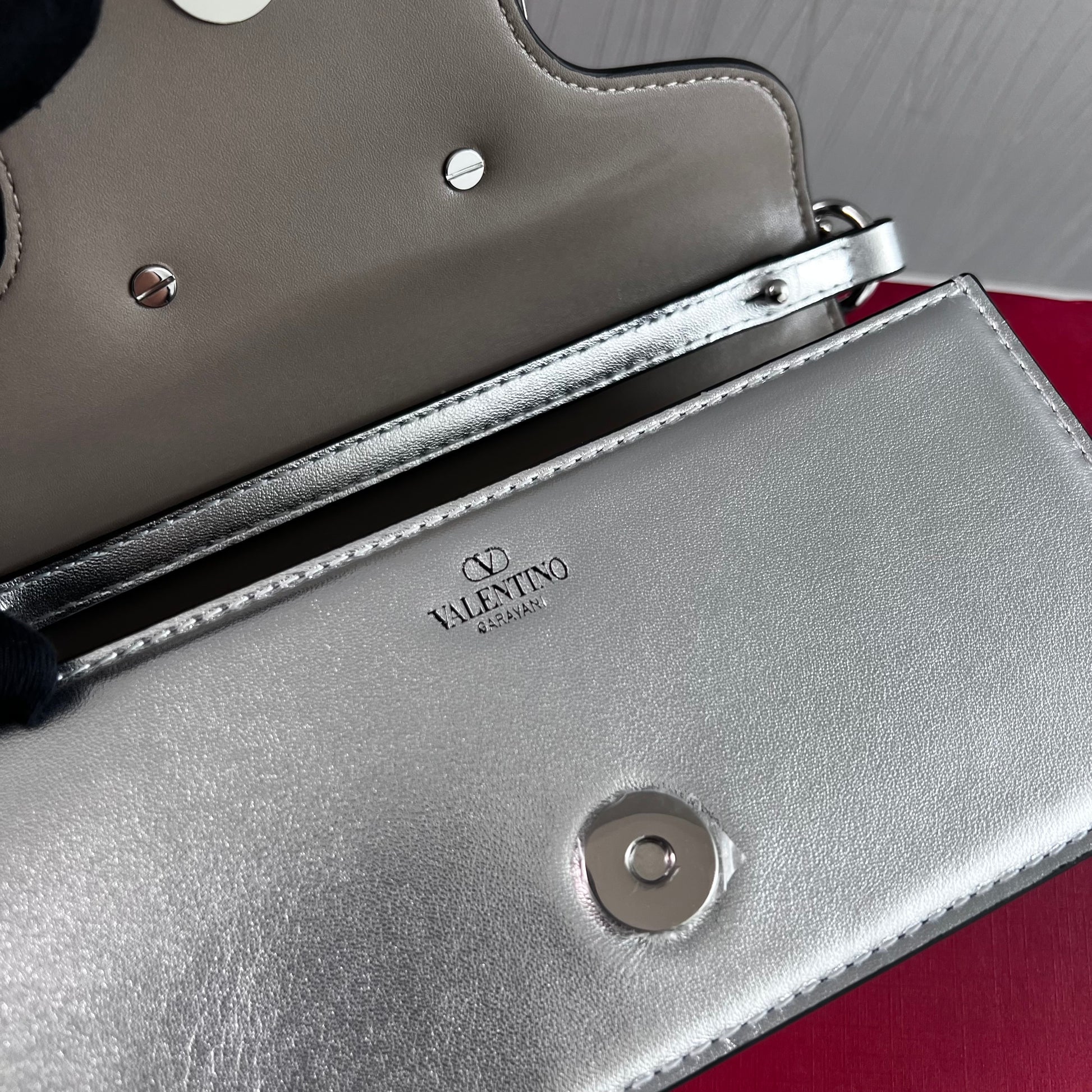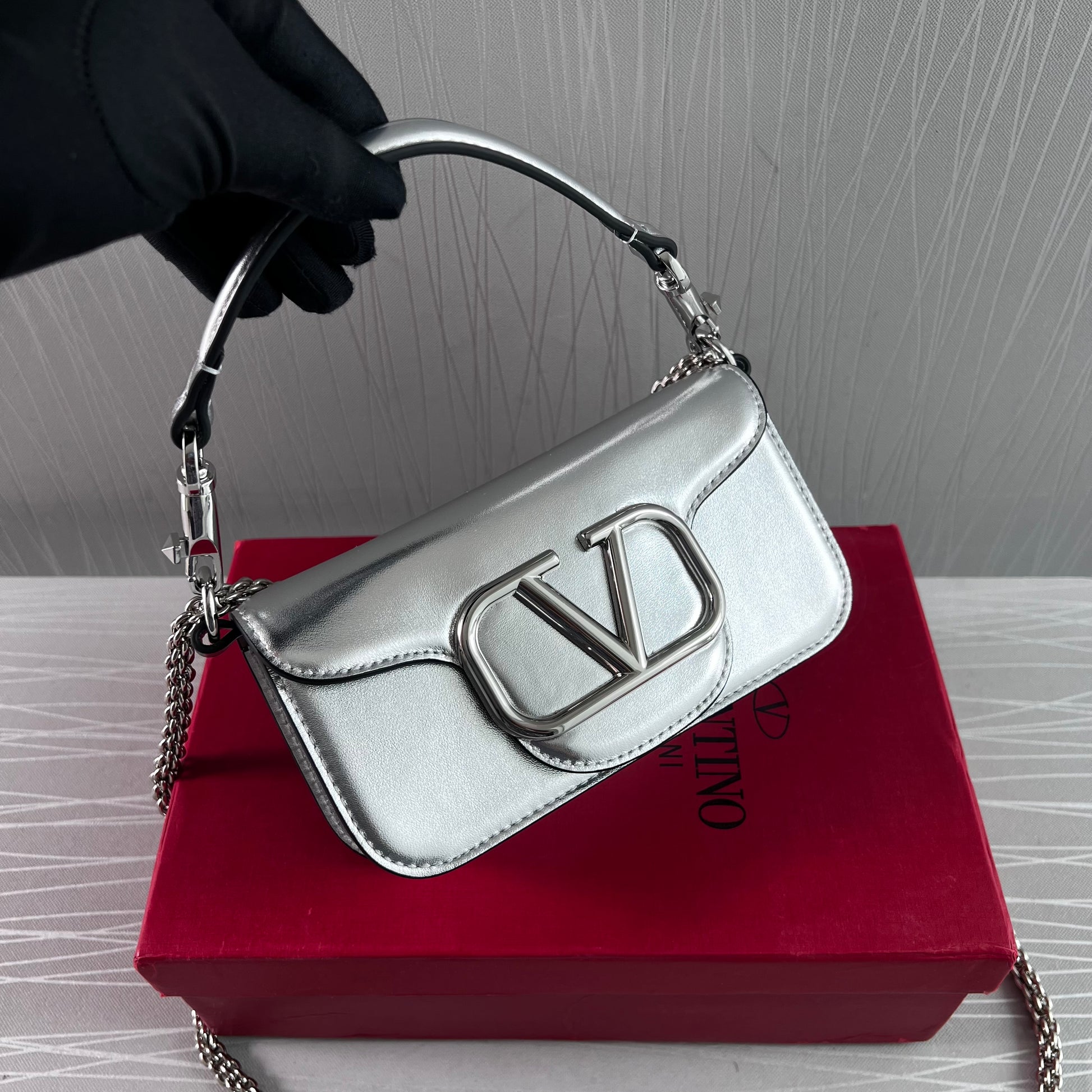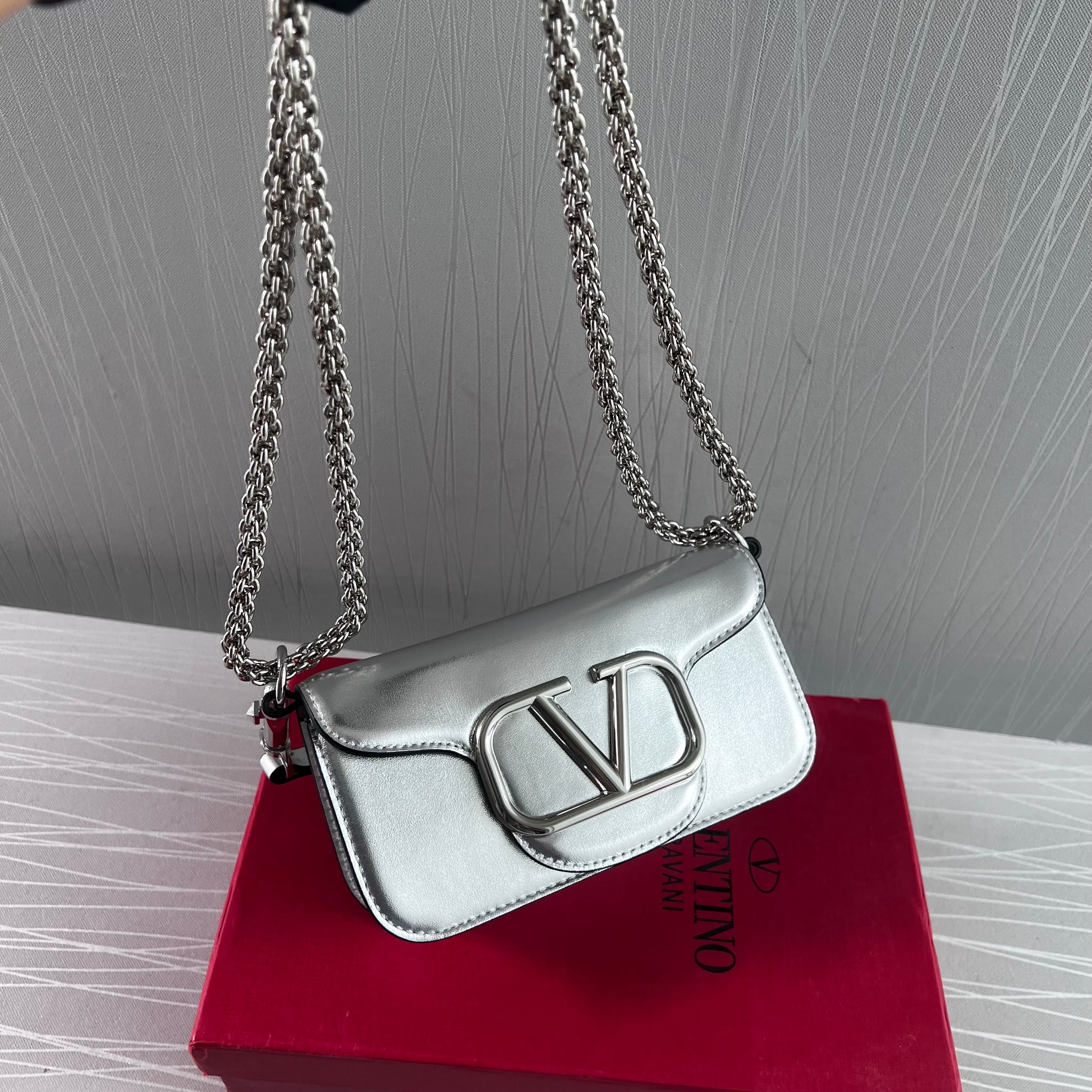 Bolso piel color plata con herrajes y cadena del mismo color. Incluye shopping bag y guardapolvo. Dimensiones 20 x 11 x 5 cm.