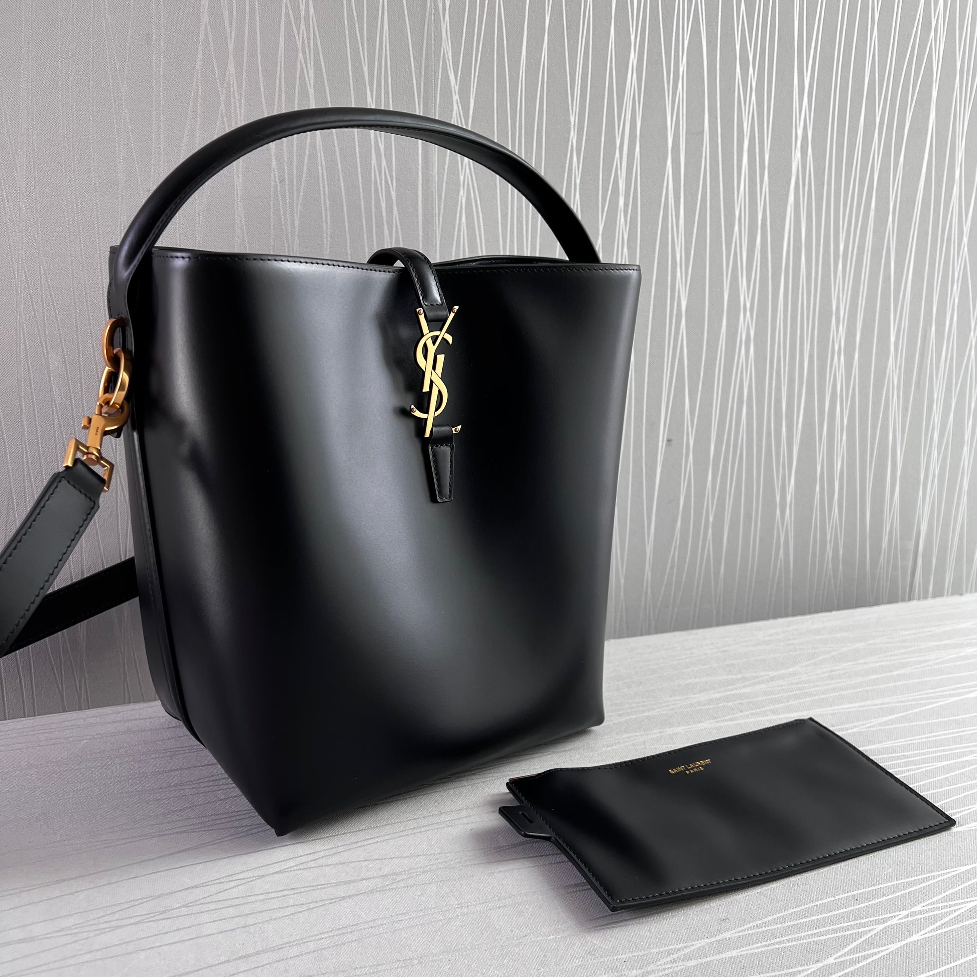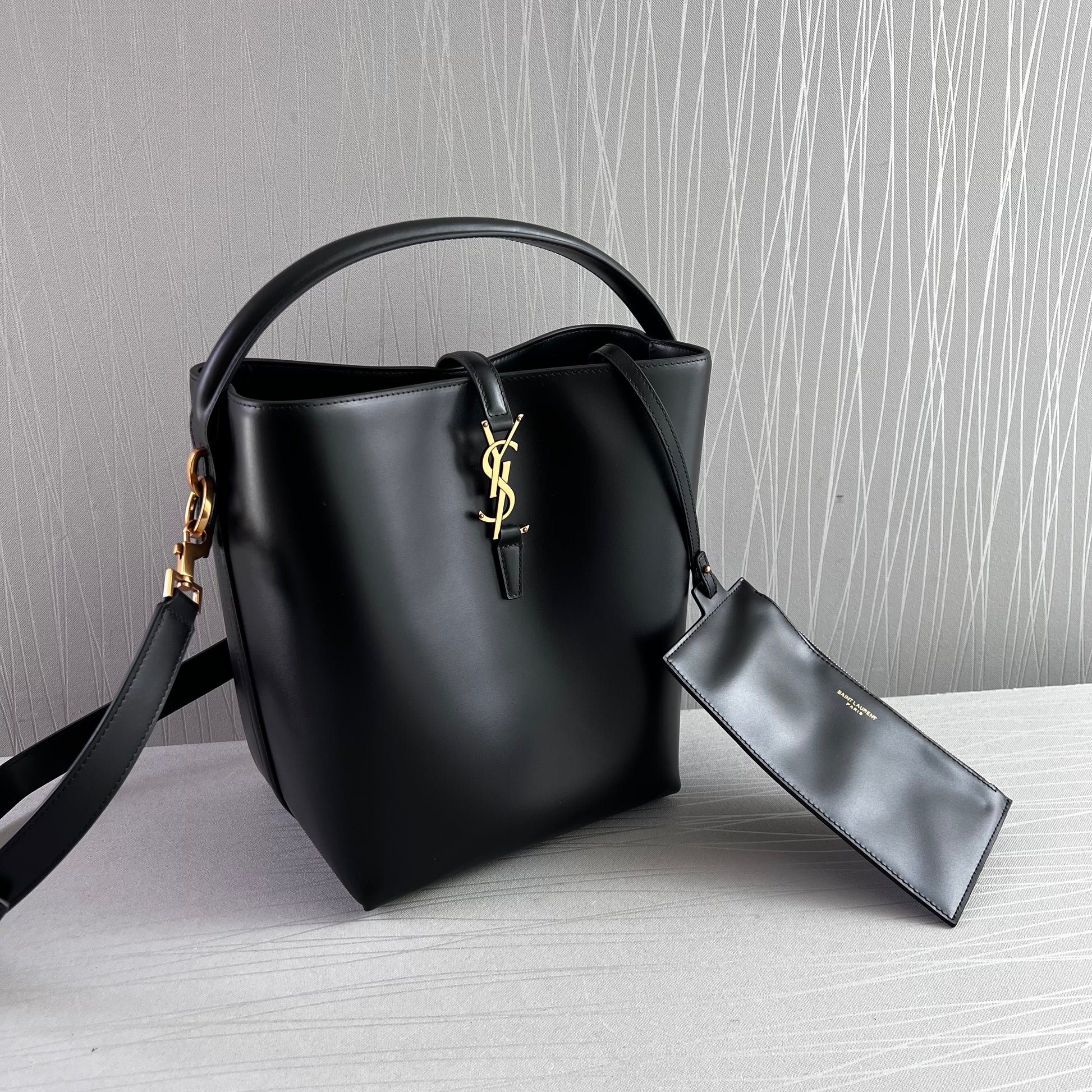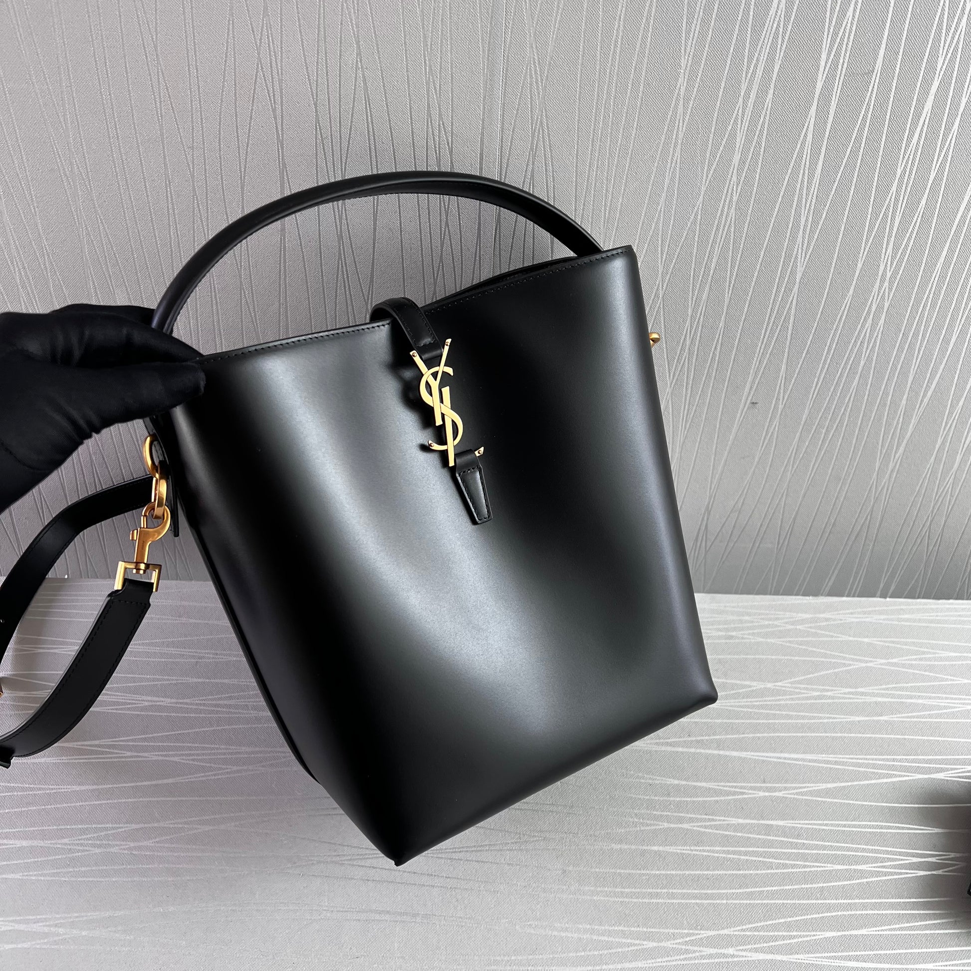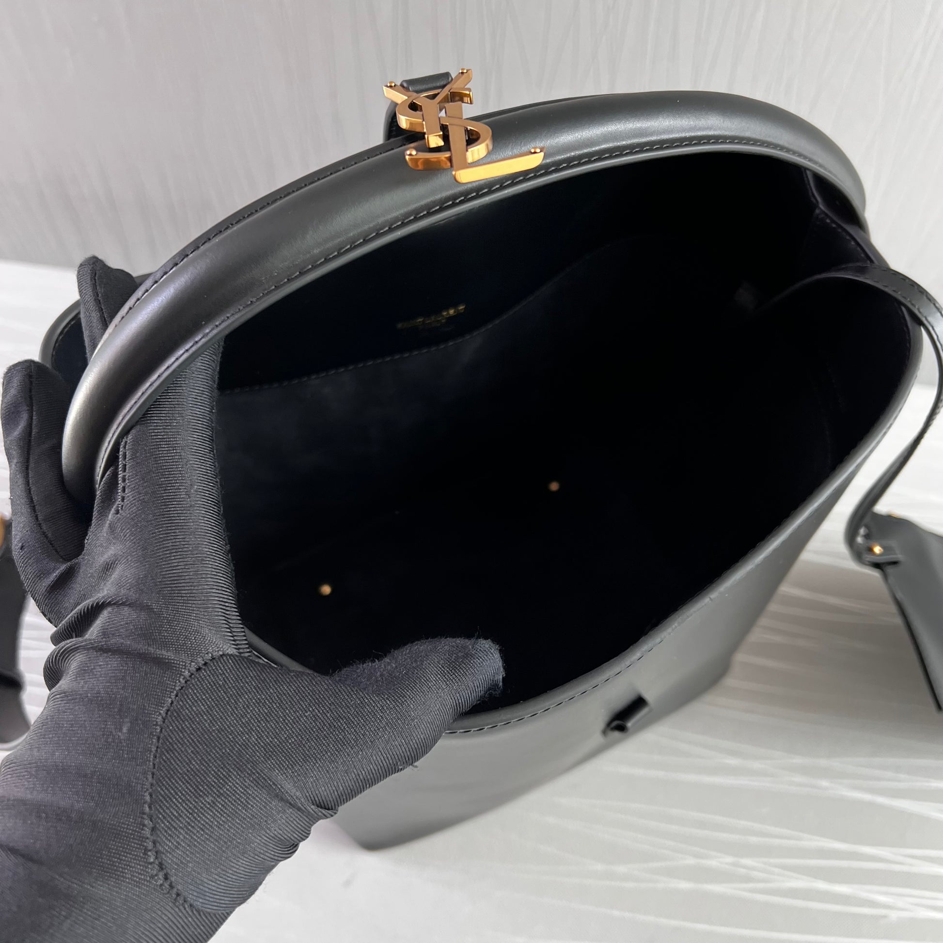 Bolso Y piel color negro y herrajes dorados. Dimensiones 25 cm. Incluye cubrepolvo y shopping bag.