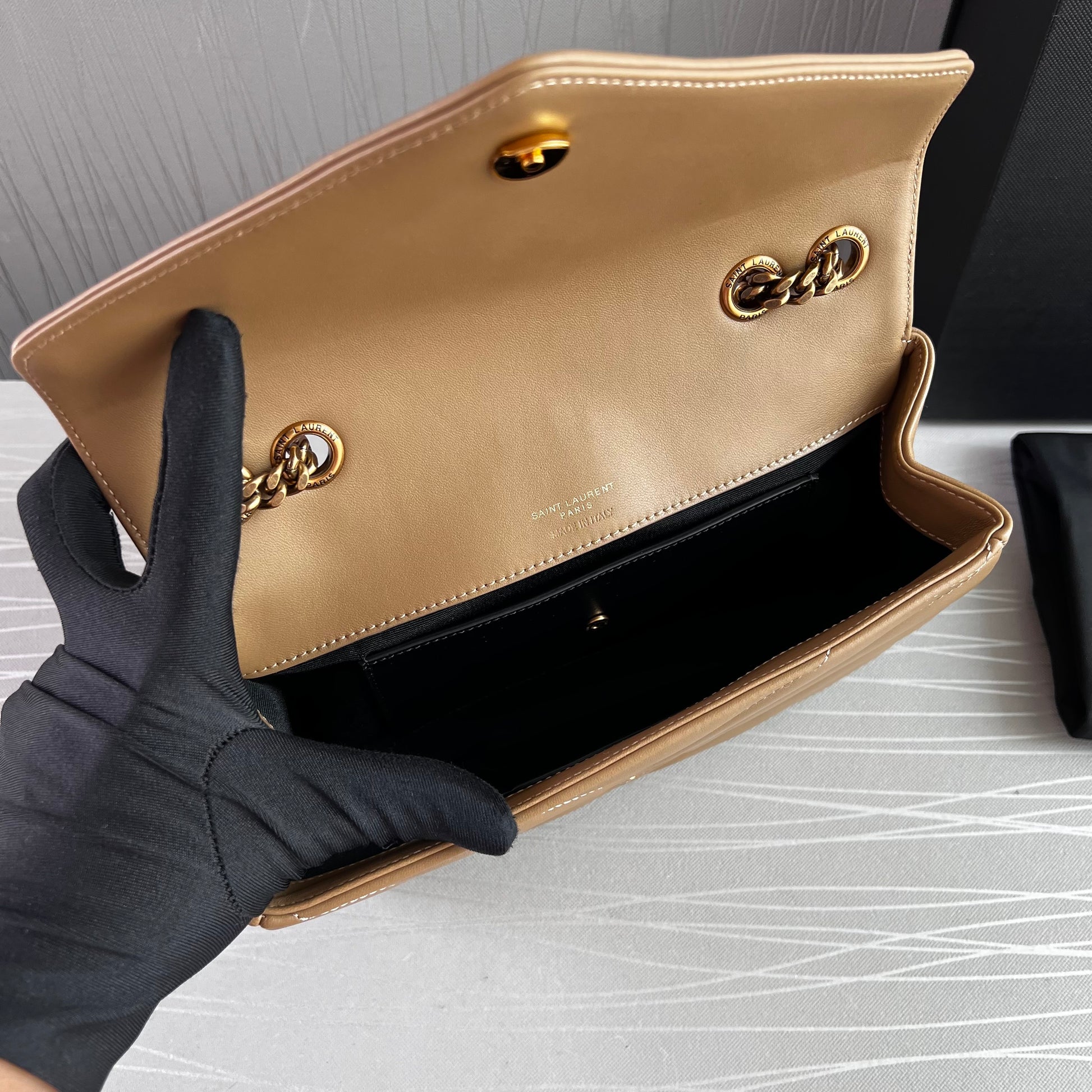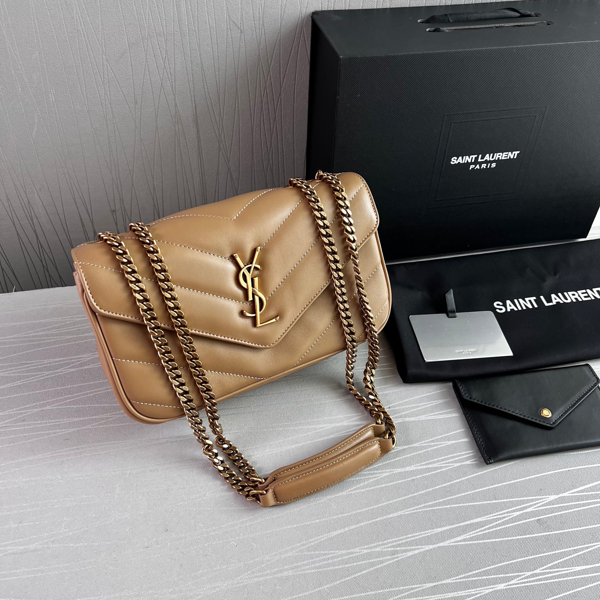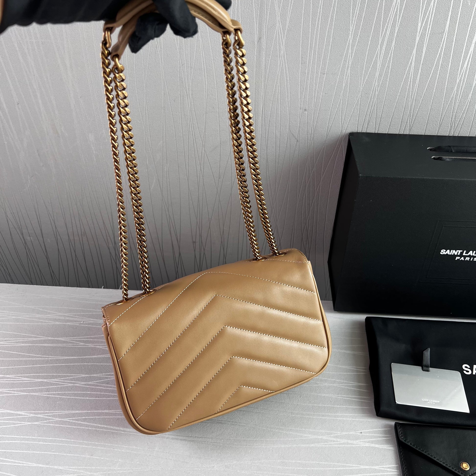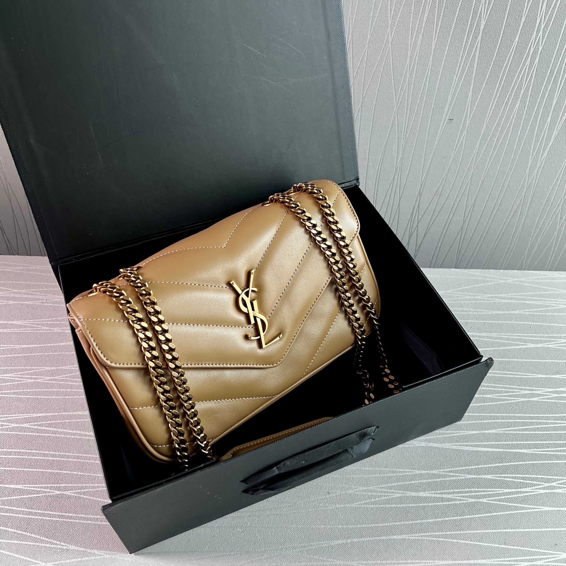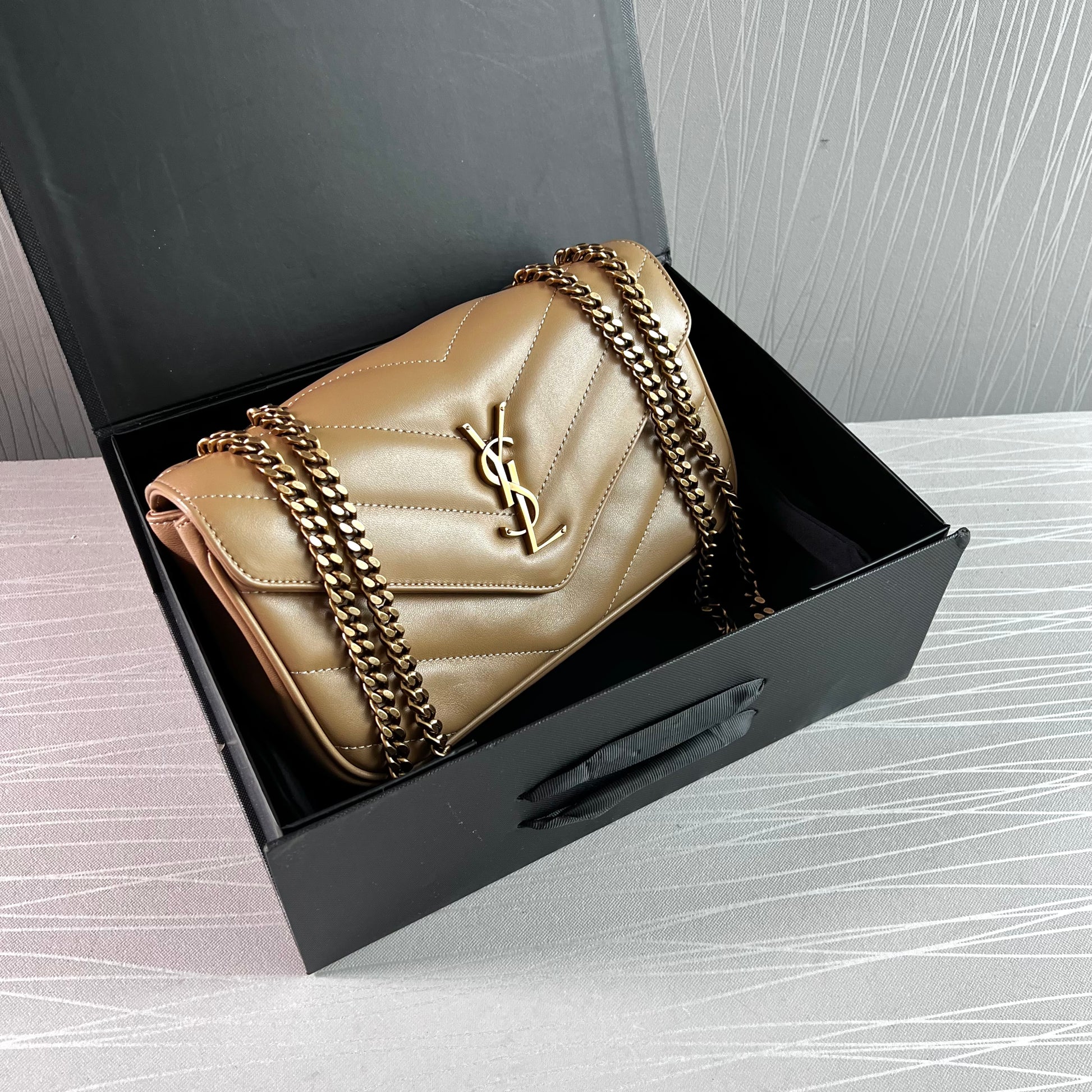 Bolso Y piel color beige bronce, con herrajes en color oro vintage. Se puede usar cruzada o al hombro.Dimensiones 24 X 14 X 6 cm. En el interior viene un pequeño monedero y en espejo. Incluye caja, shopping bag y bolsa guardapolvo.