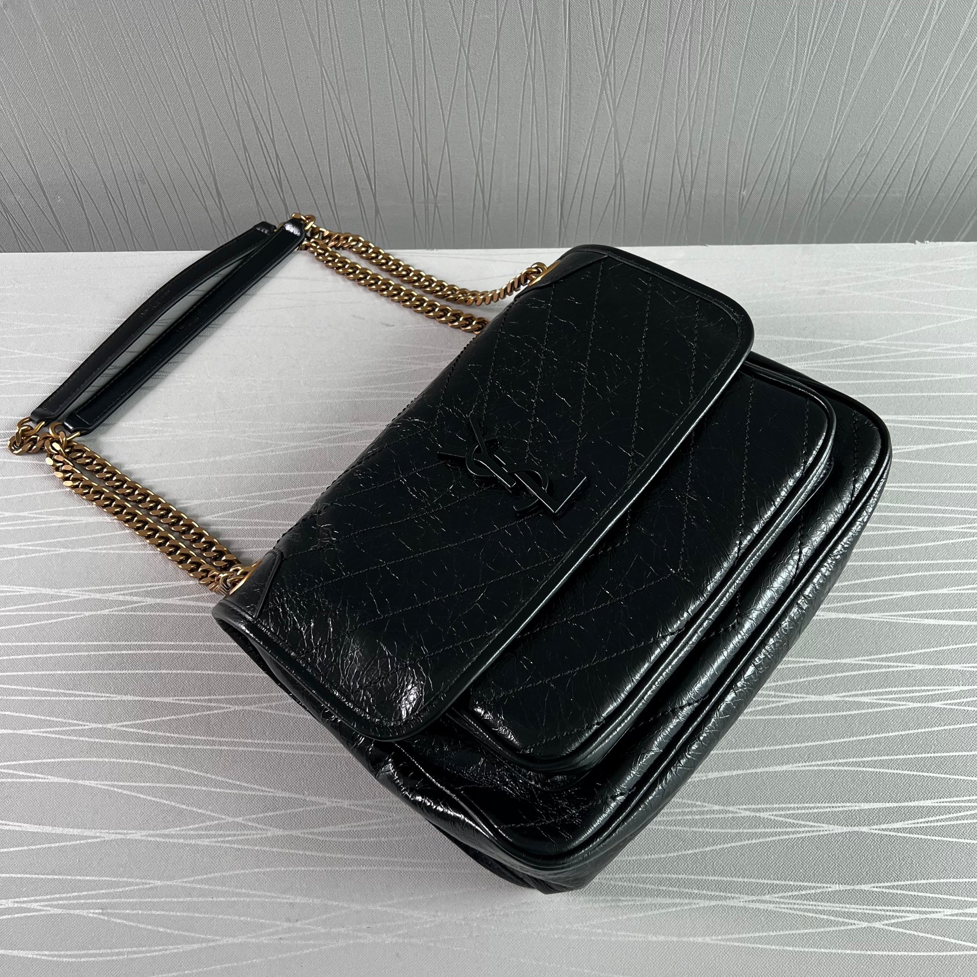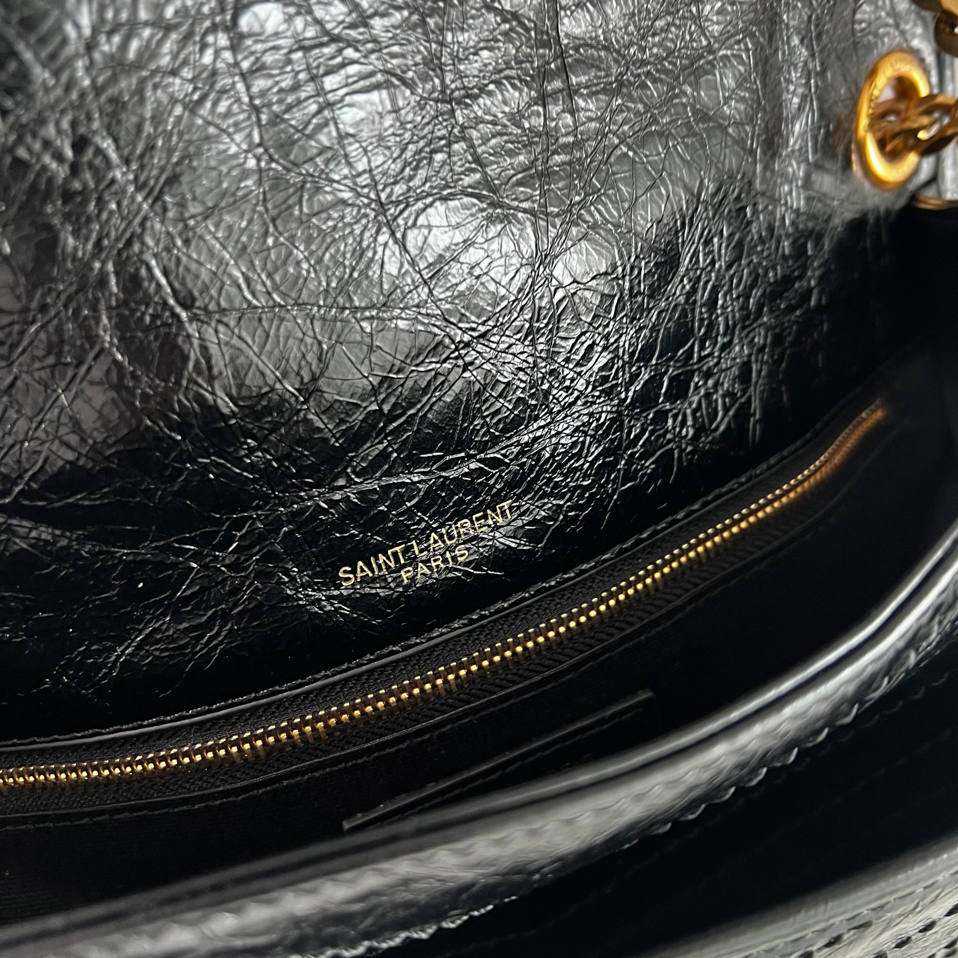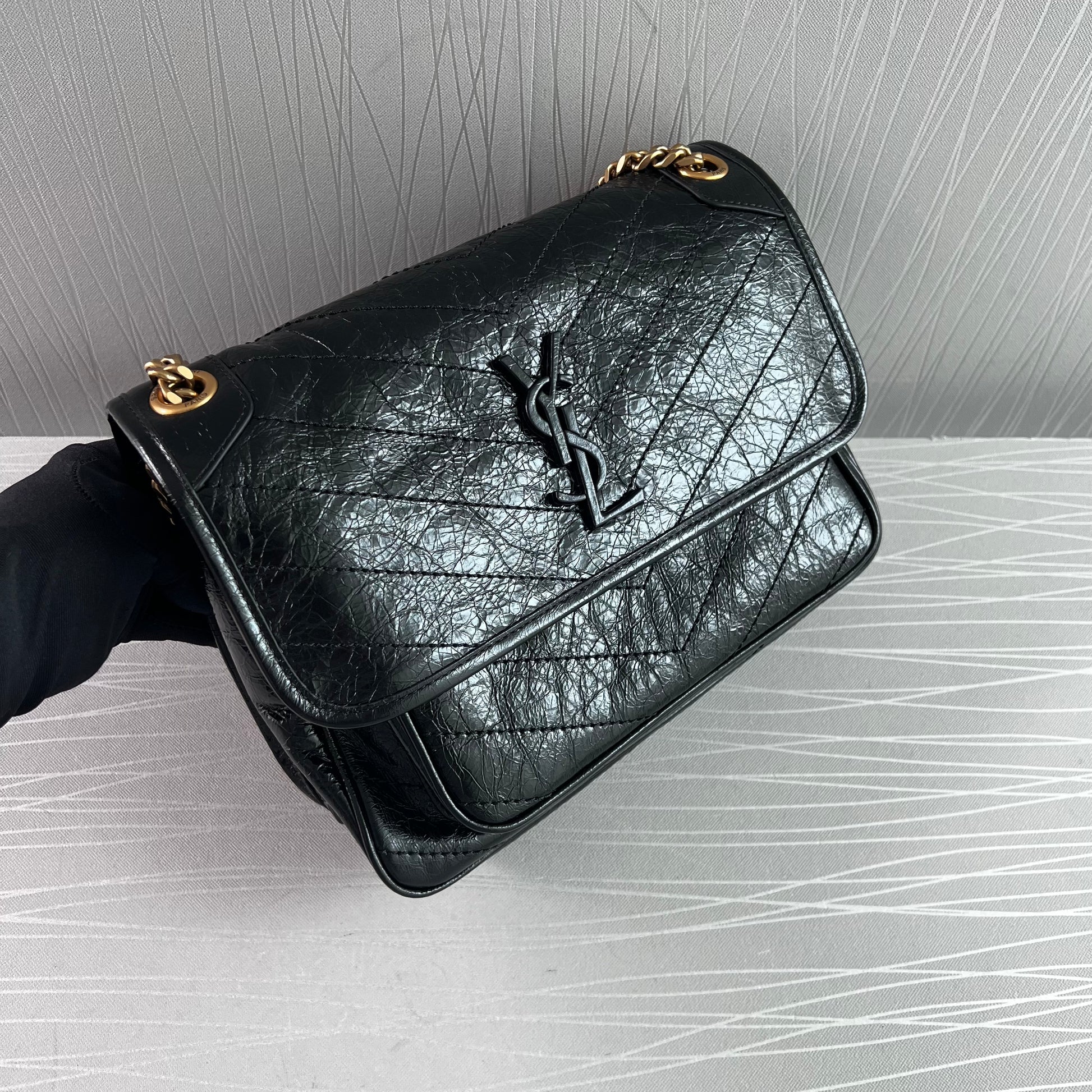 Bolso piel de becerro vintage en color negro, herrajes dorados y negro, dimensiones 28 X 20 X 8,5 CM, incluye shopping bag y bolsa guardapolvo.