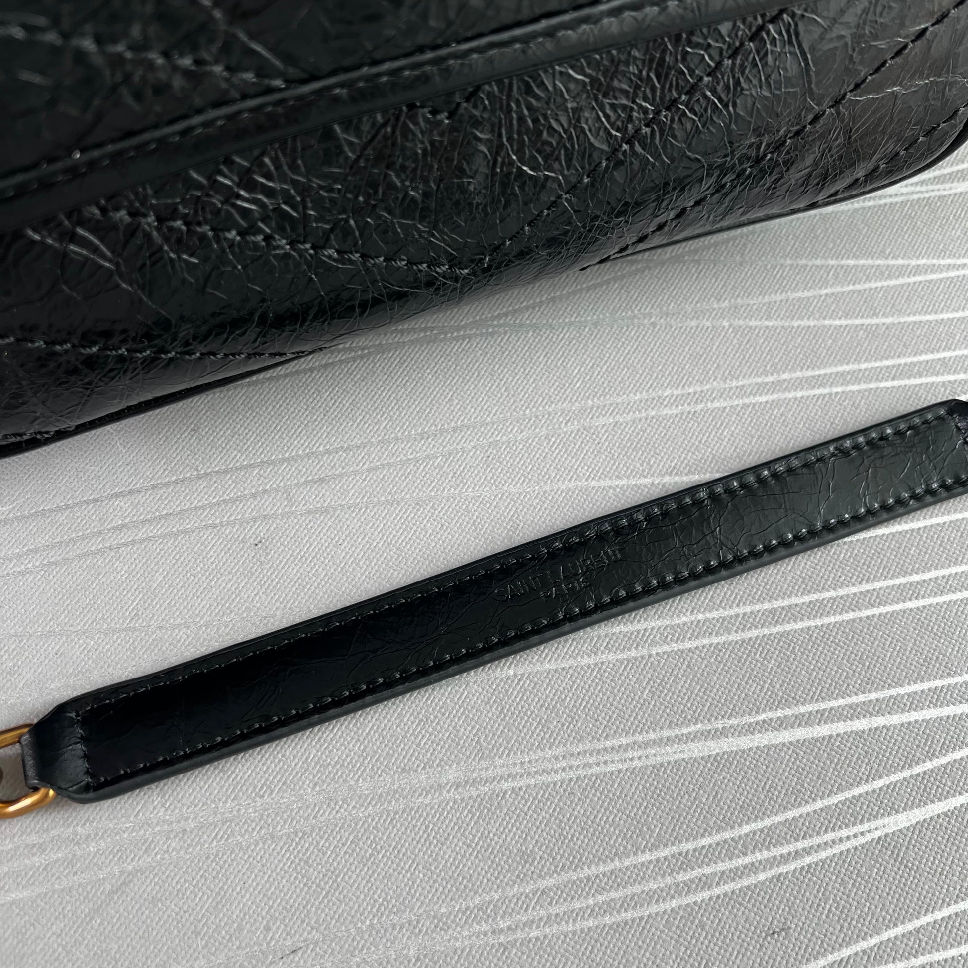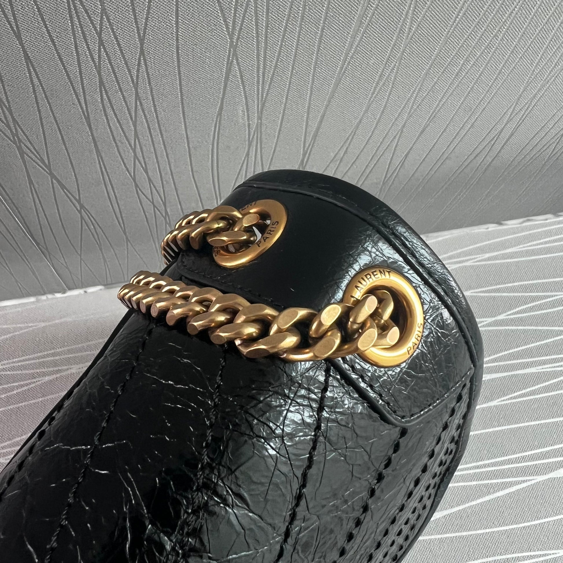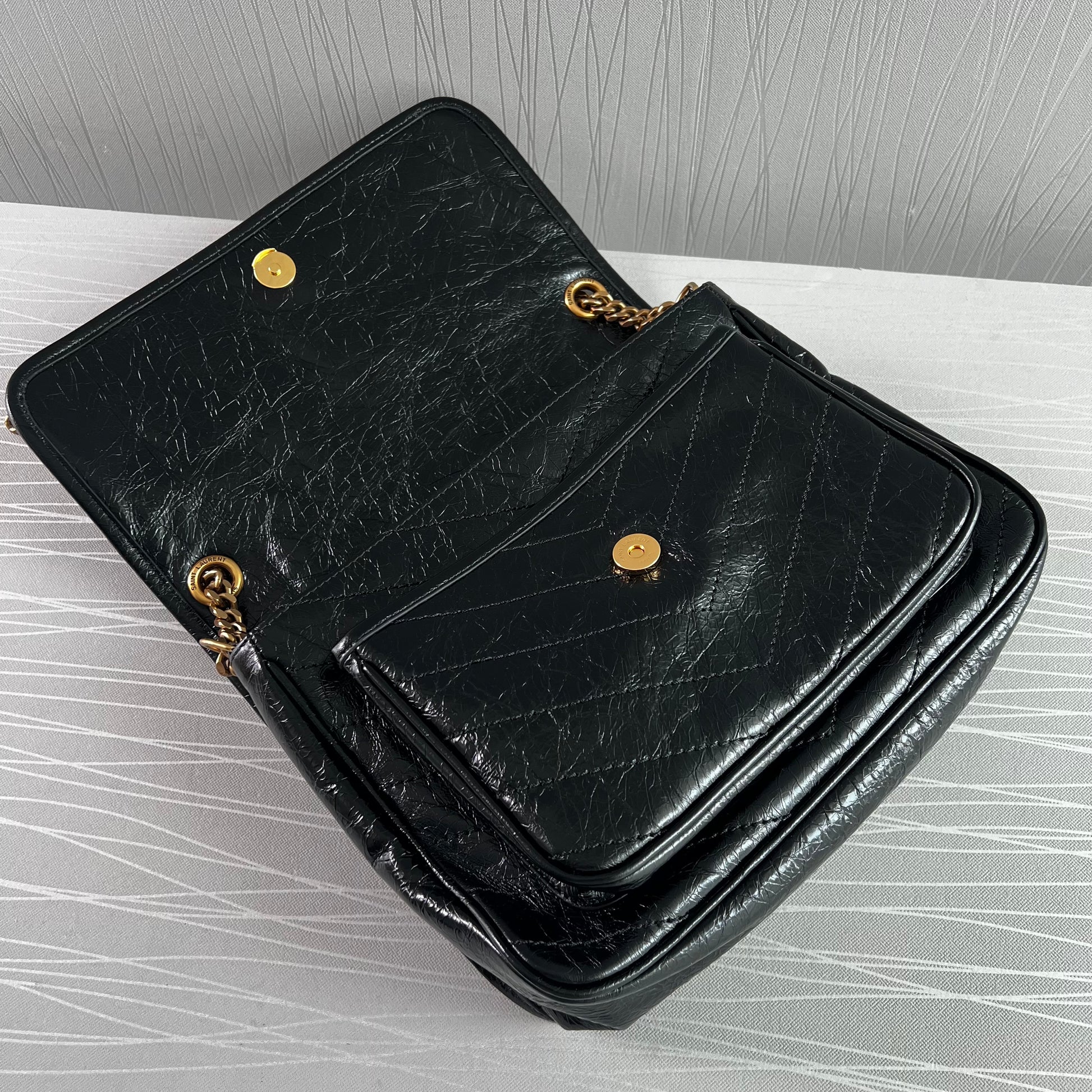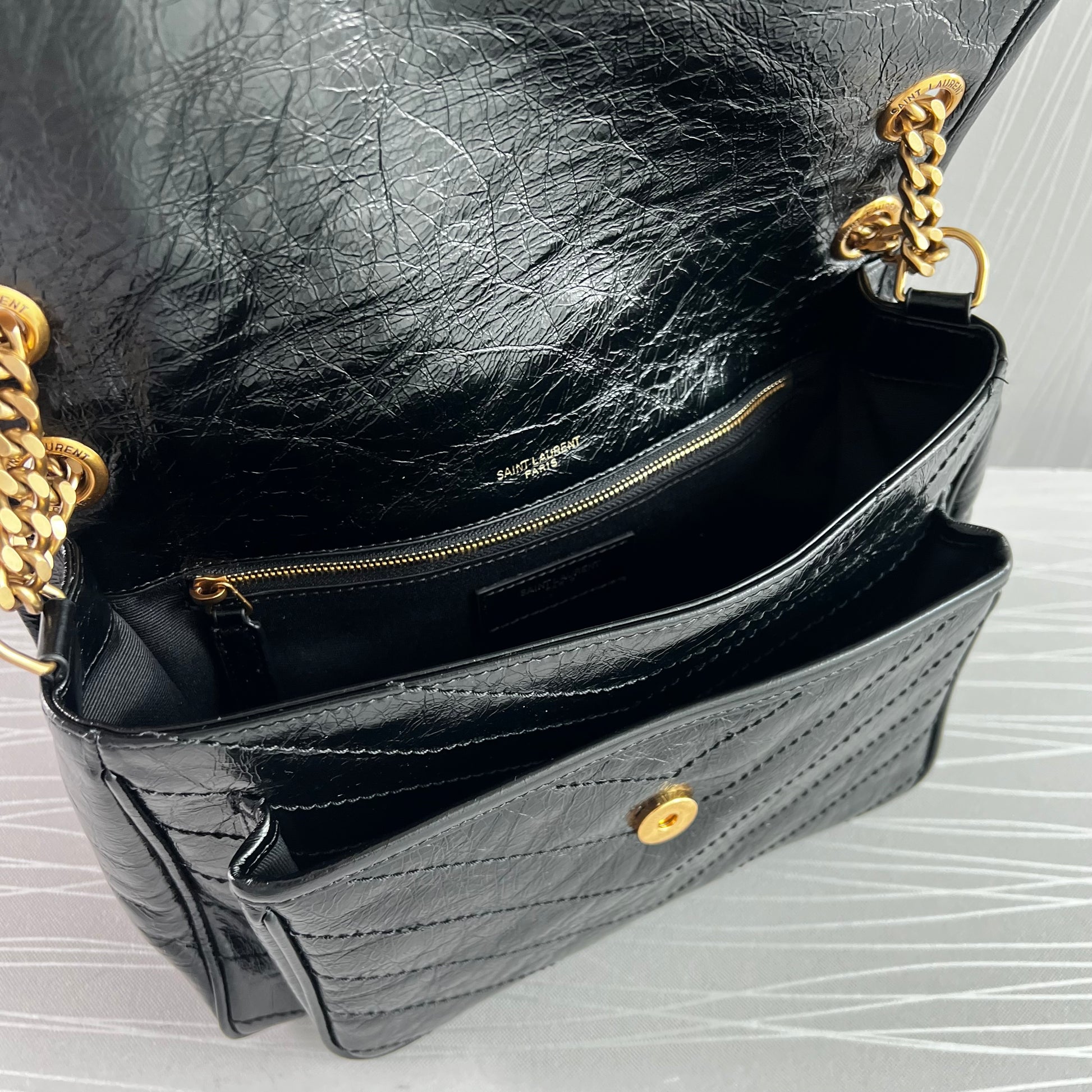 Bolso piel de becerro vintage en color negro, herrajes dorados y negro, dimensiones 28 X 20 X 8,5 CM, incluye shopping bag y bolsa guardapolvo.