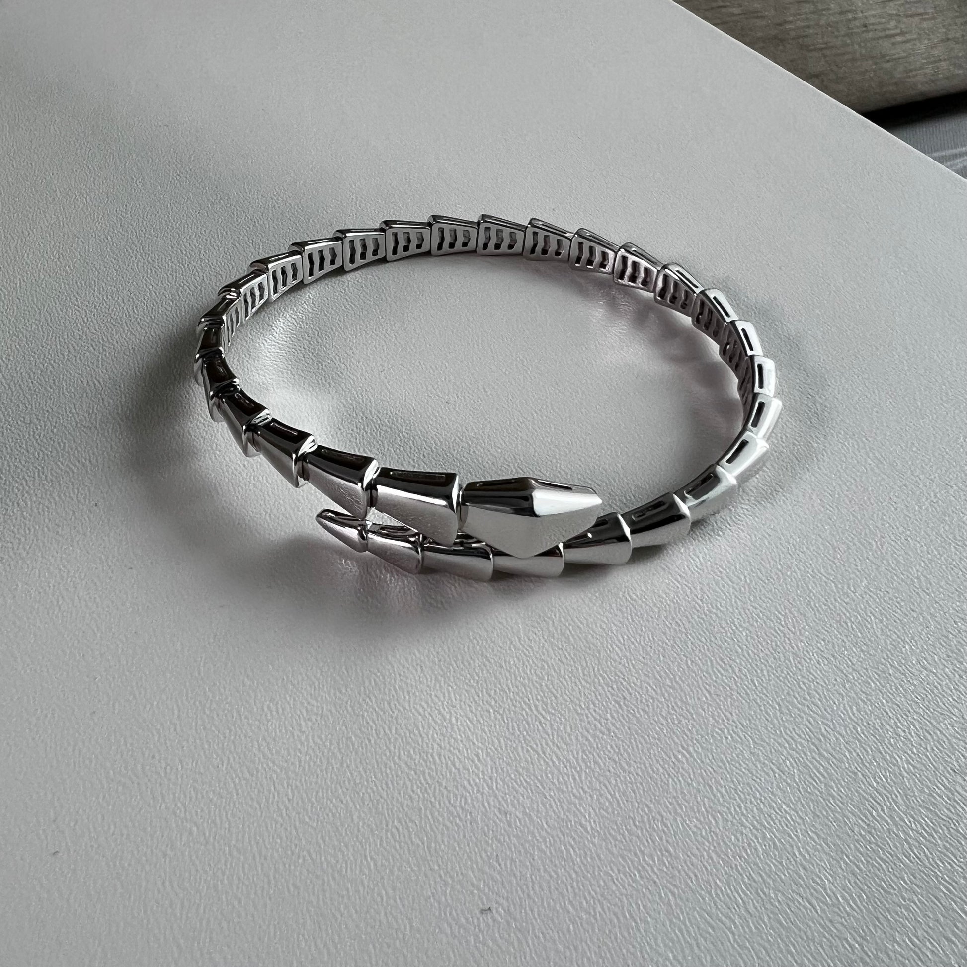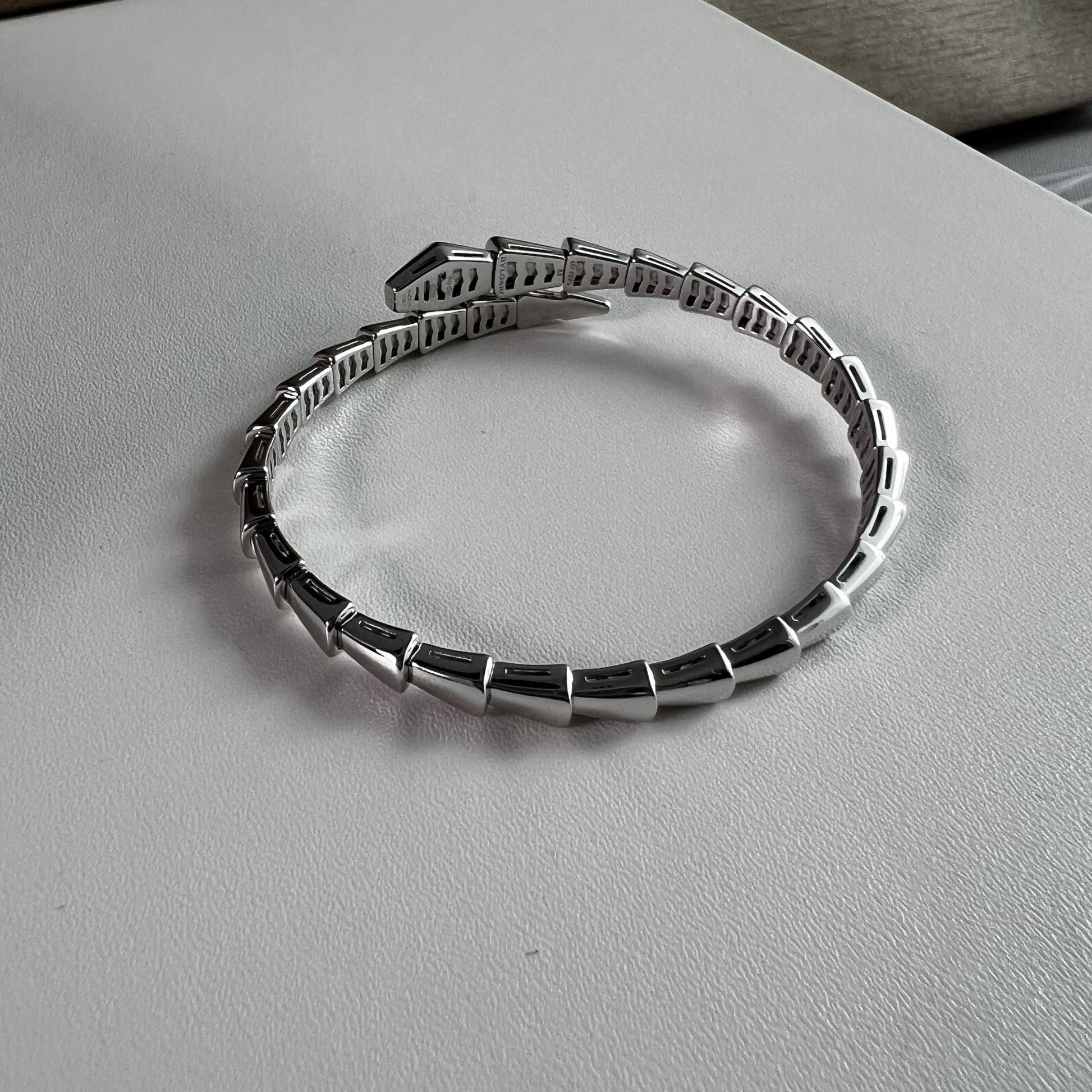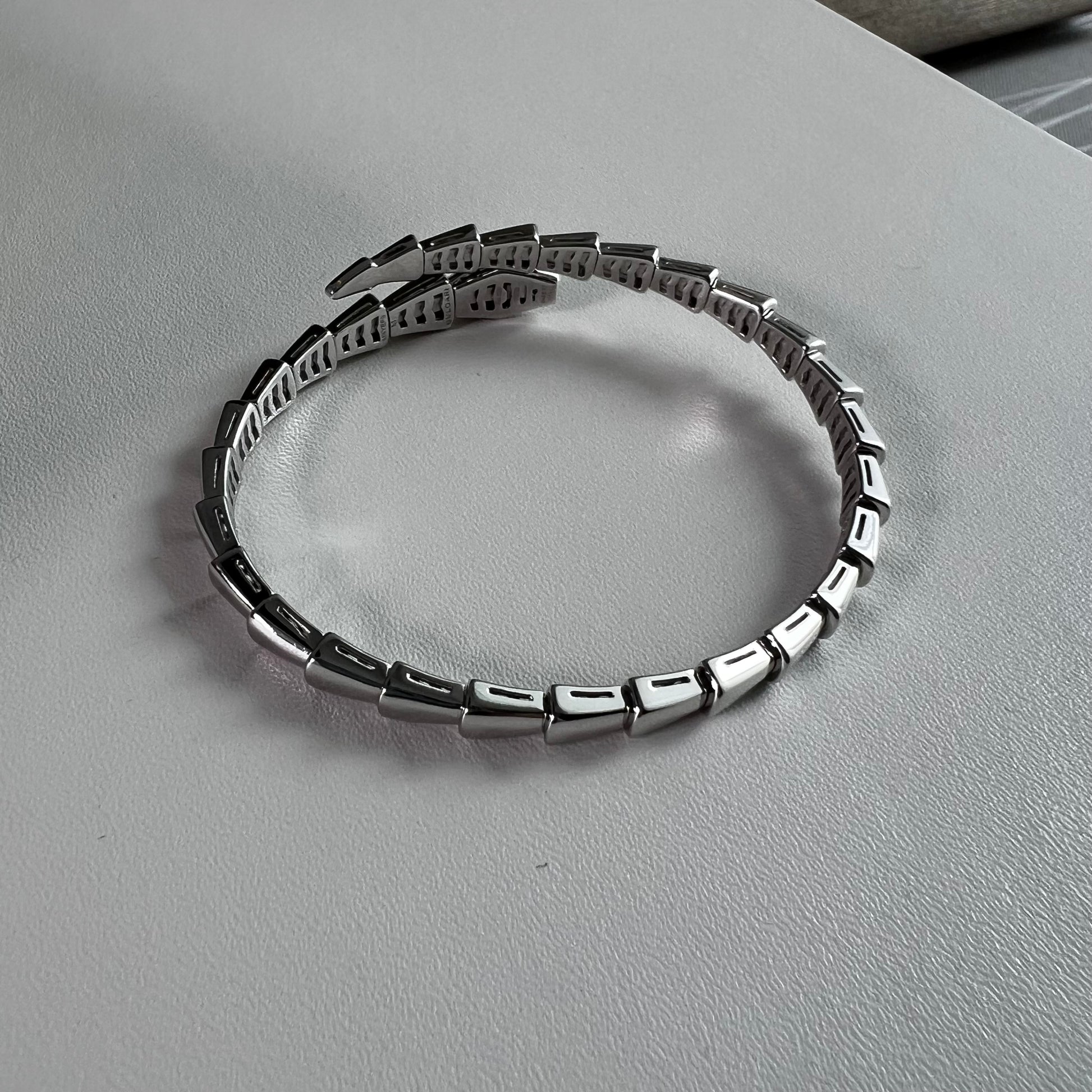 Brazalete B flexible color plateado unitalla. Incluye caja y shopping bag.