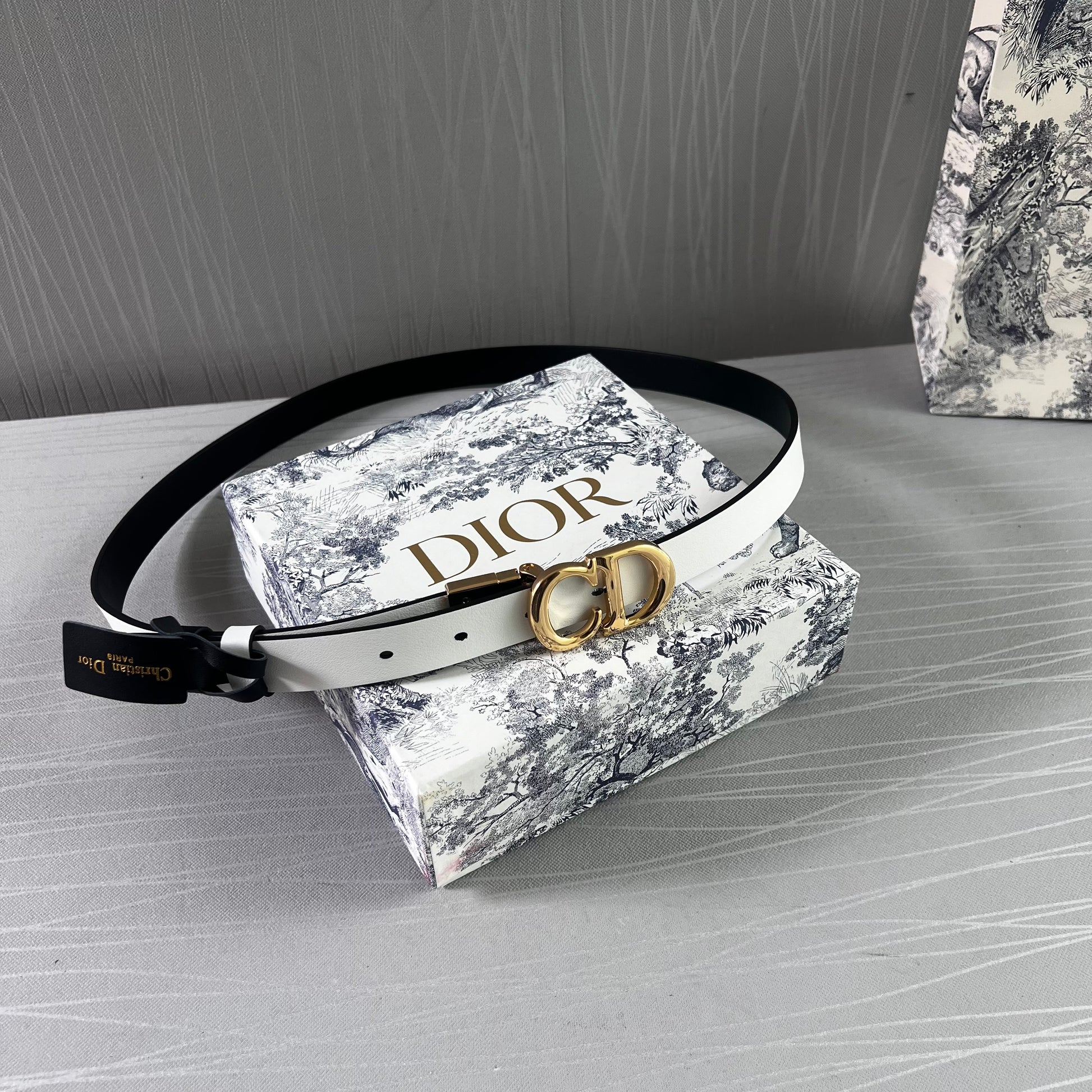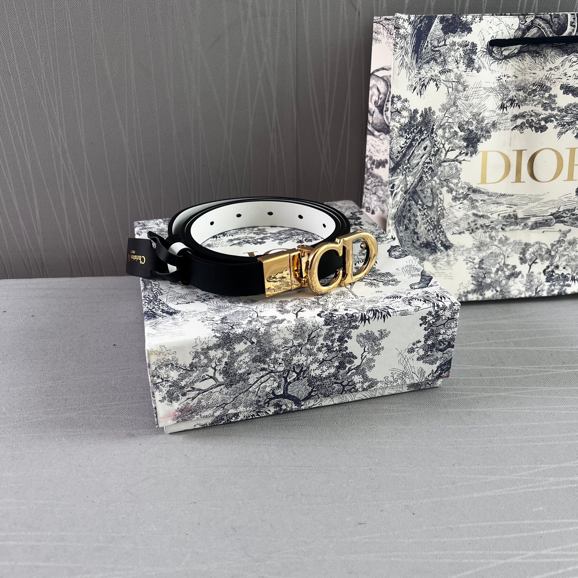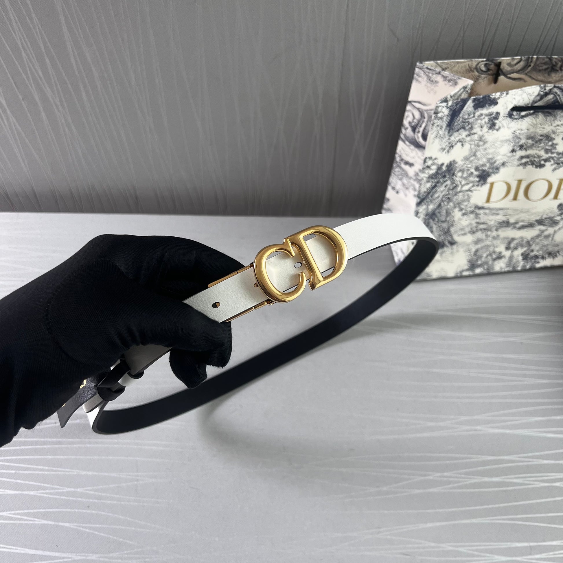 Cinto D reversible blanco con negro en piel, herrajes dorados.2 cm de ancho. Incluye caja, guardapolvo y shopping bag.