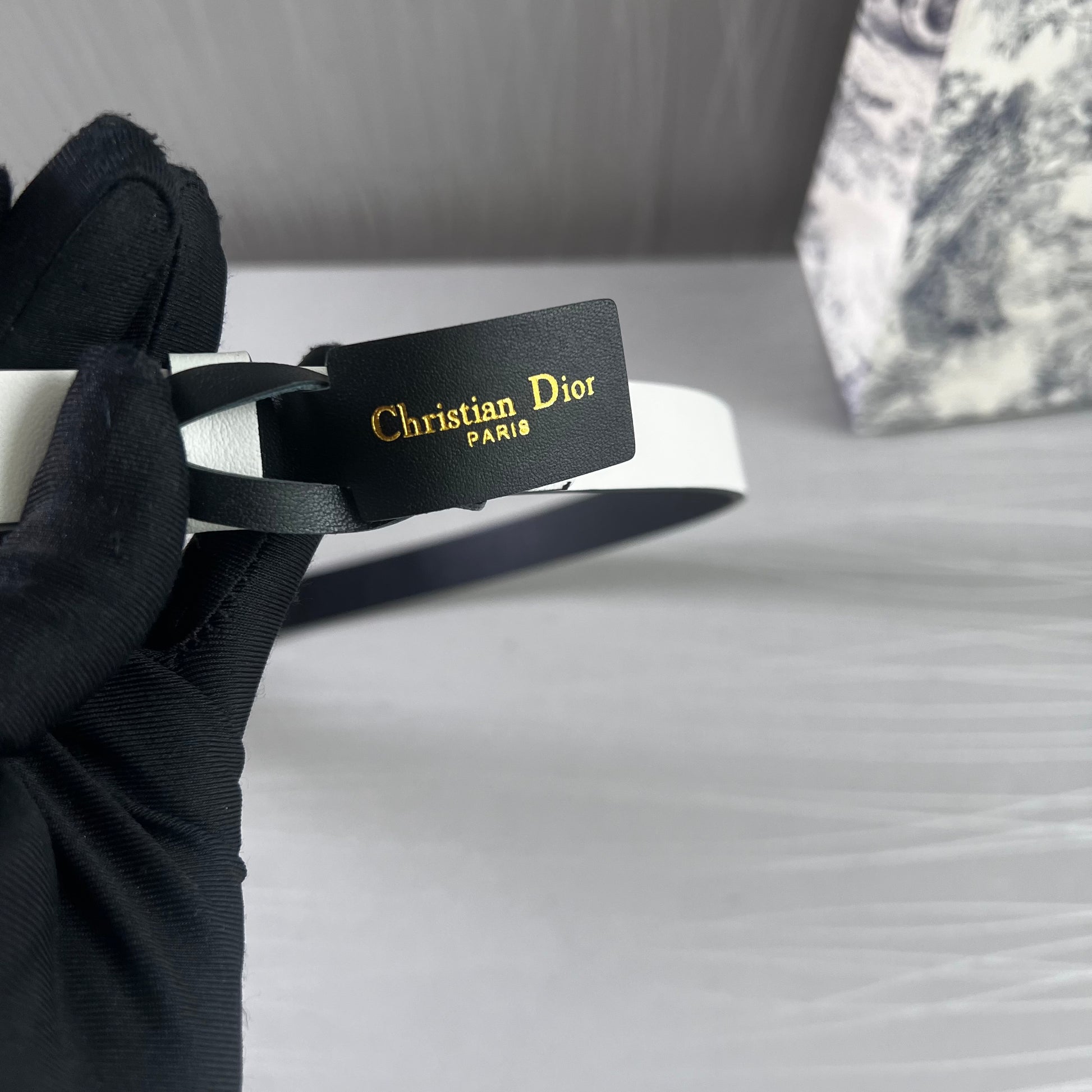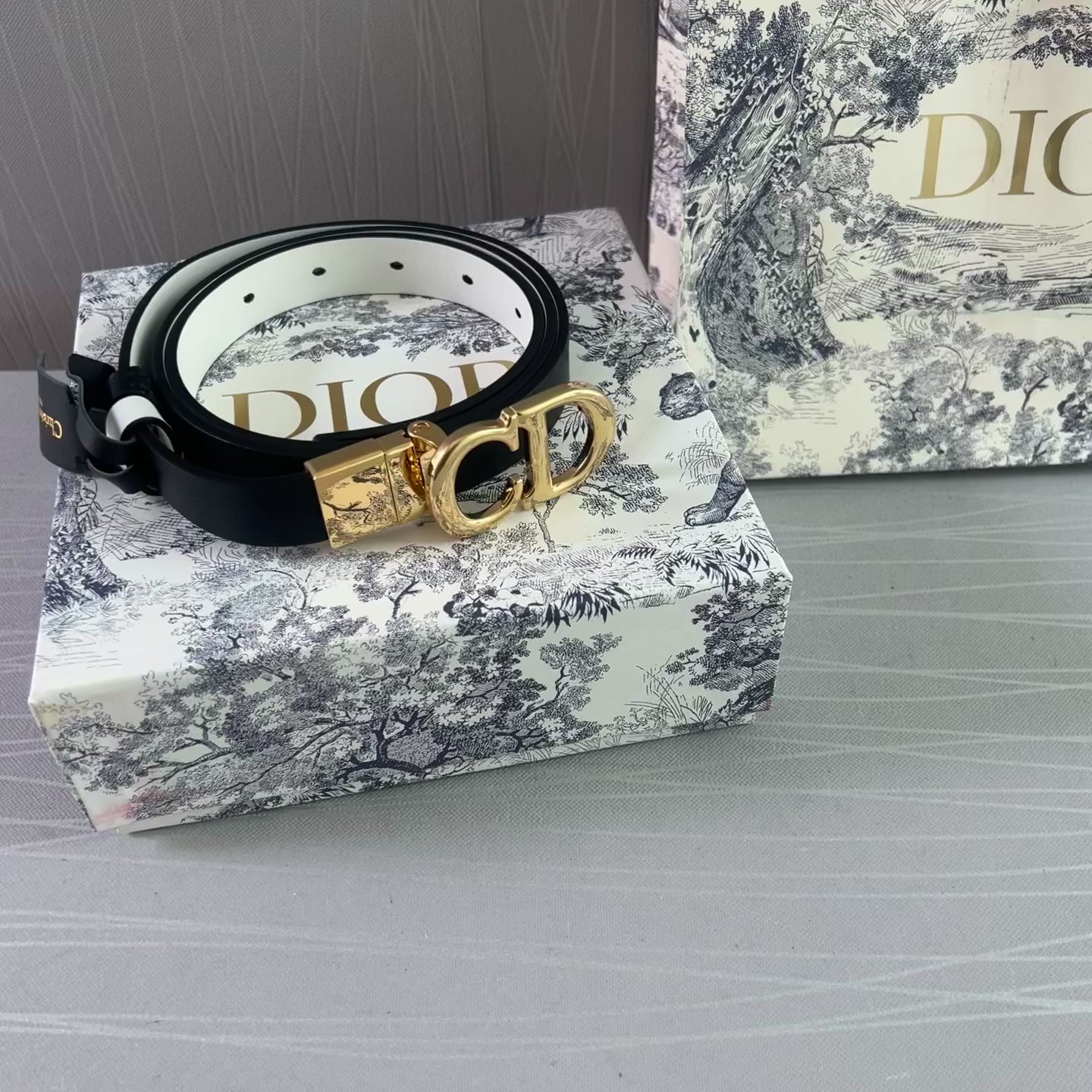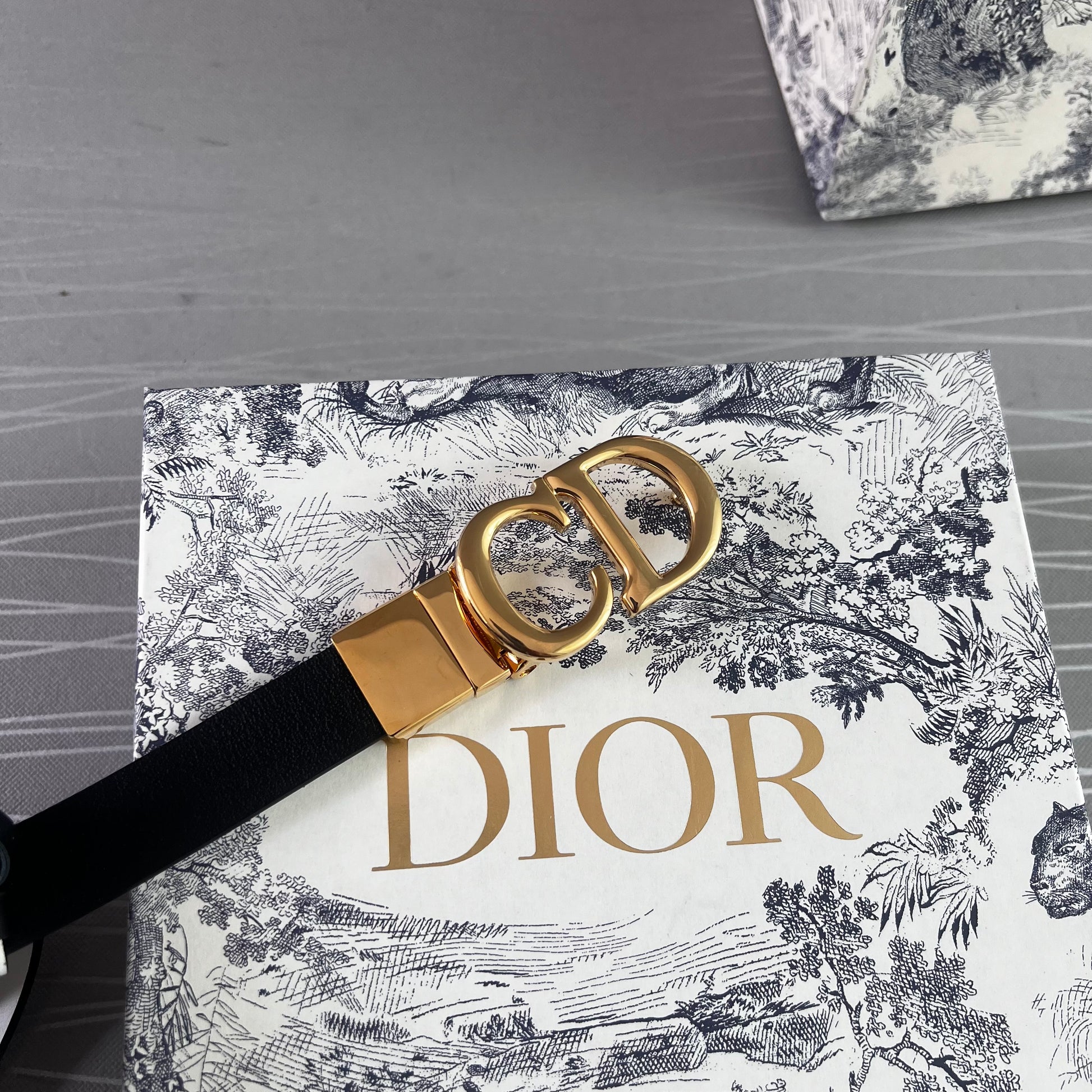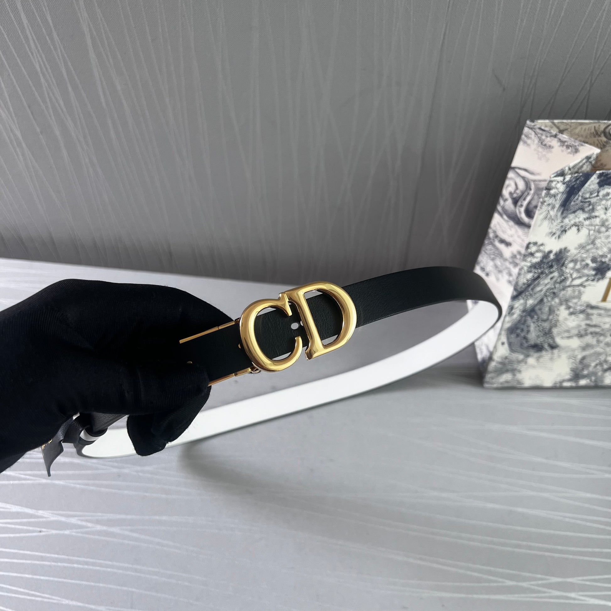 Cinto D reversible blanco con negro en piel, herrajes dorados.2 cm de ancho. Incluye caja, guardapolvo y shopping bag.