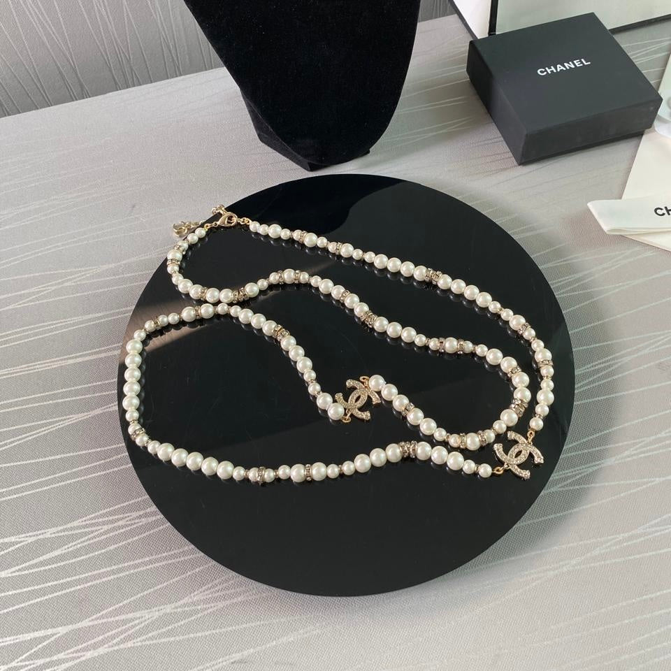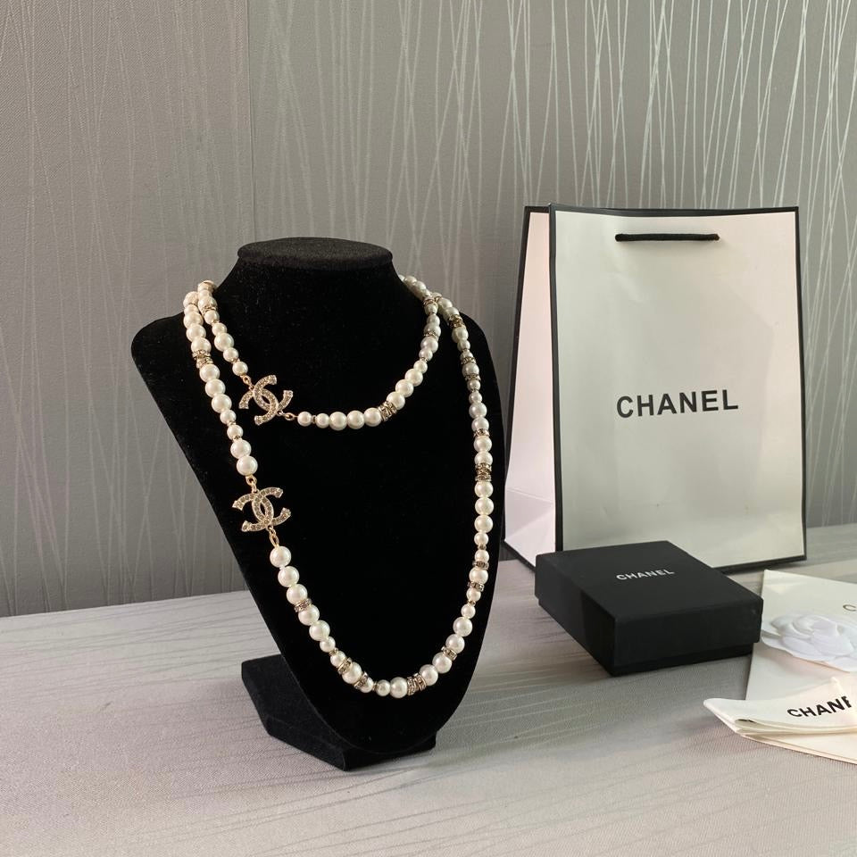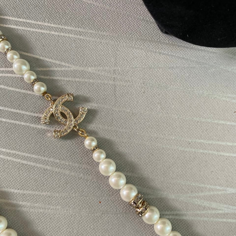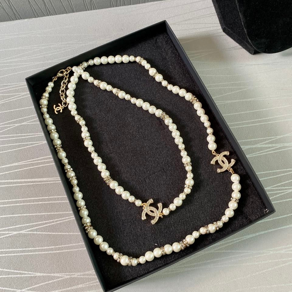 Collar C dorado combinado con piedras y perlas. Incluye caja, guardapolvo, flor, listón y shopping bag.