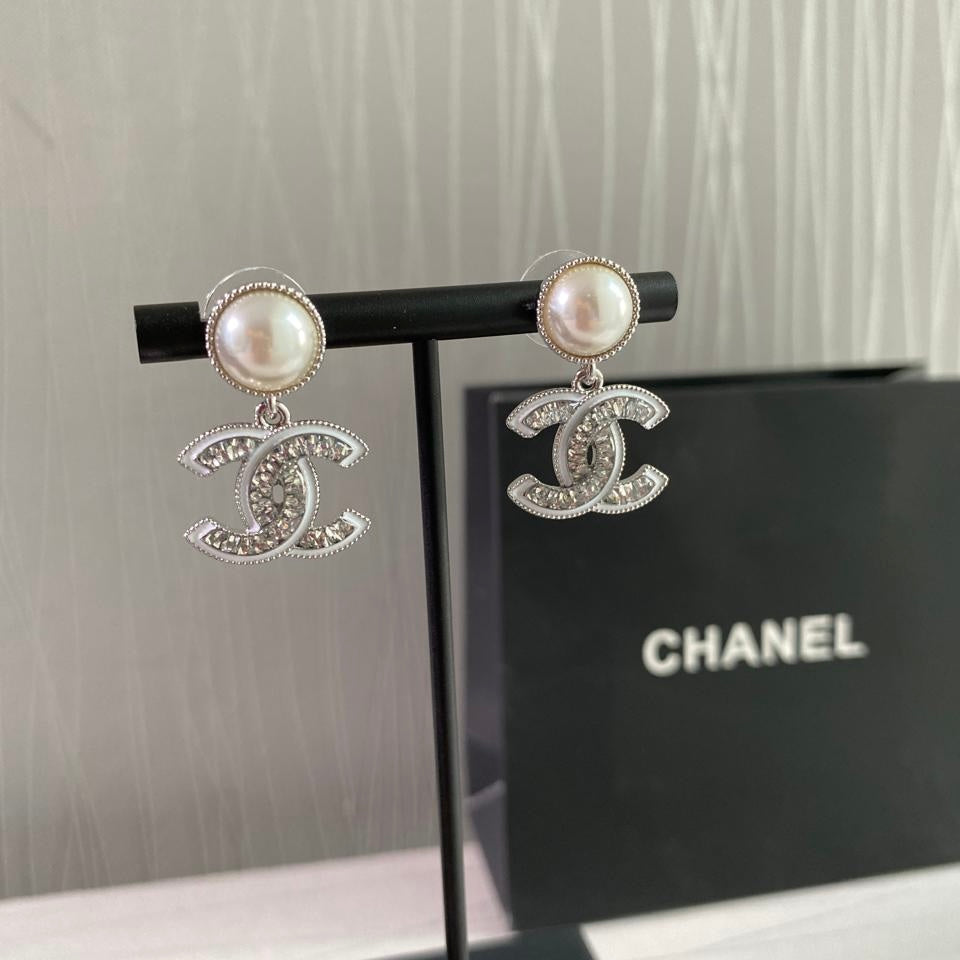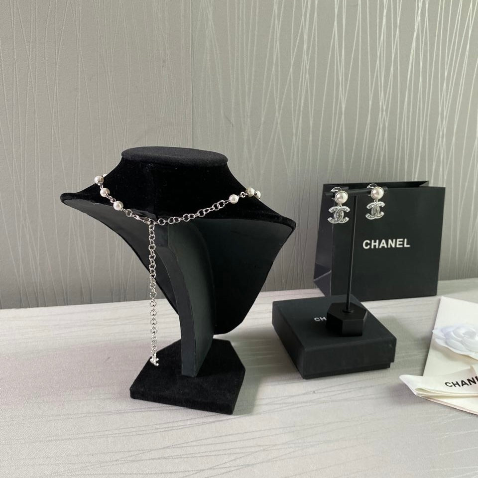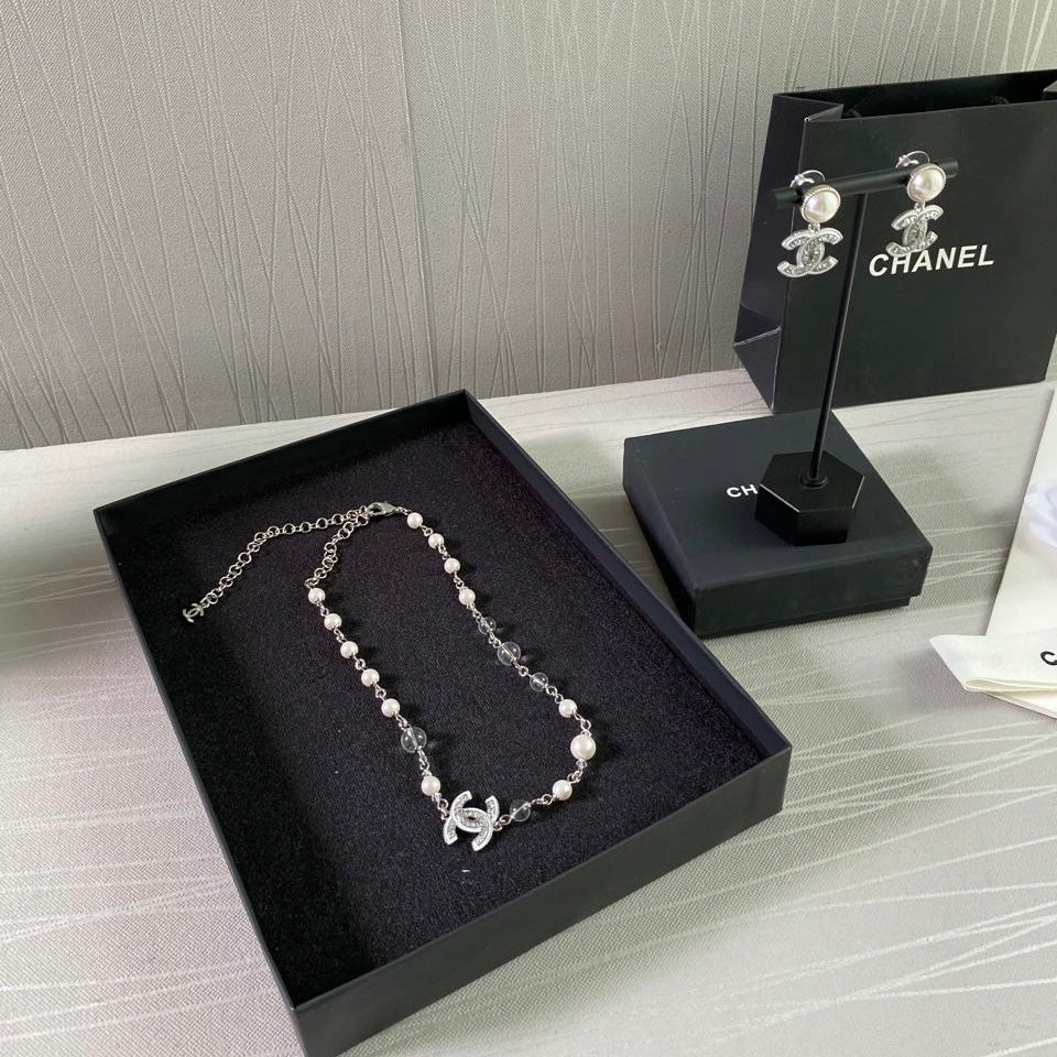 Juego C de collar y aretes color plateado combinado con perlas. Incluye caja, guardapolvo, listón, flor y shopping bag.