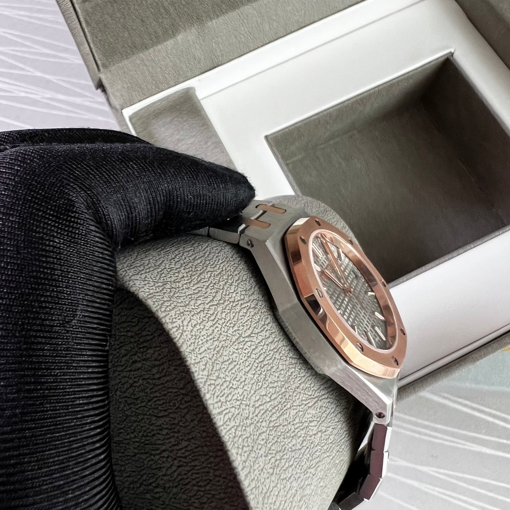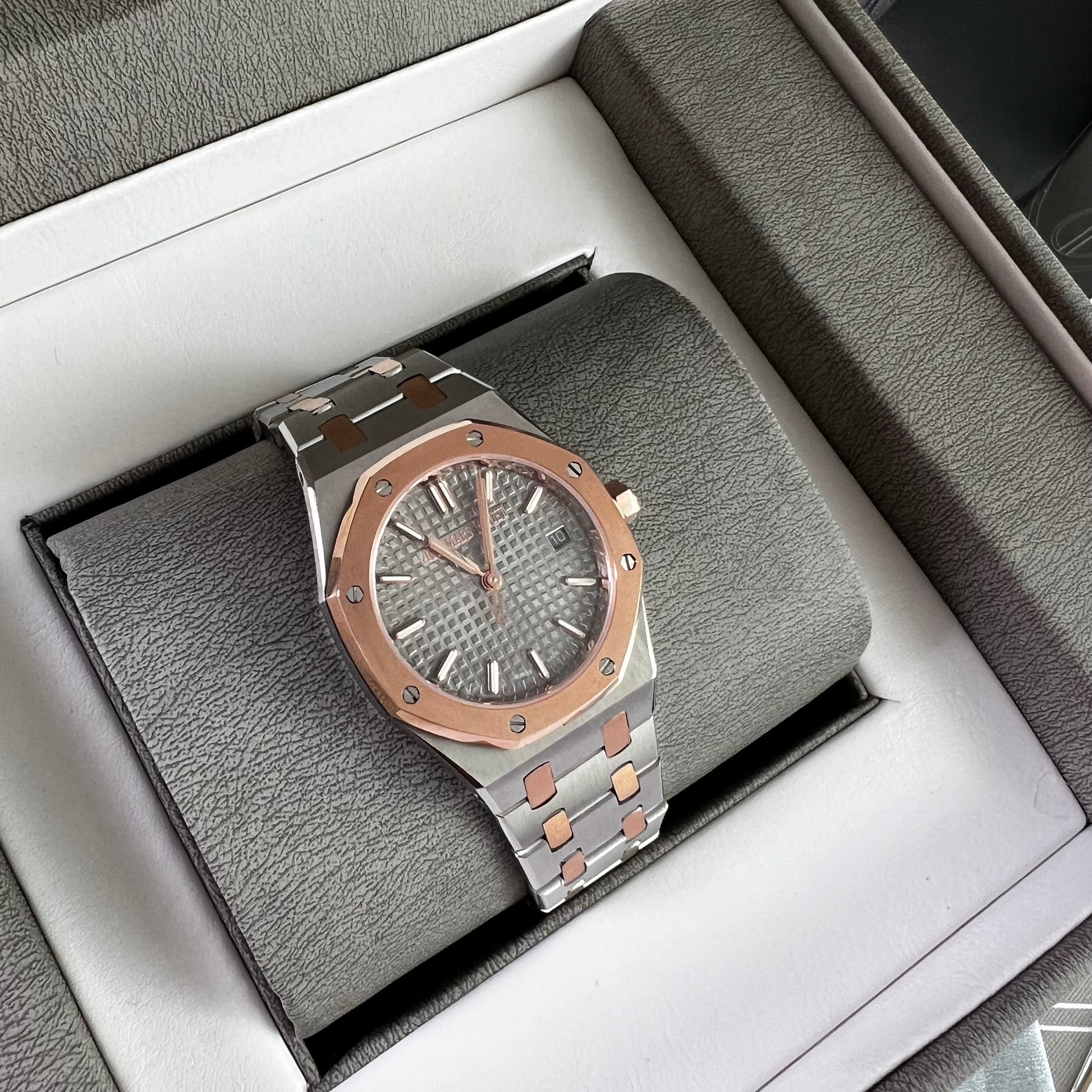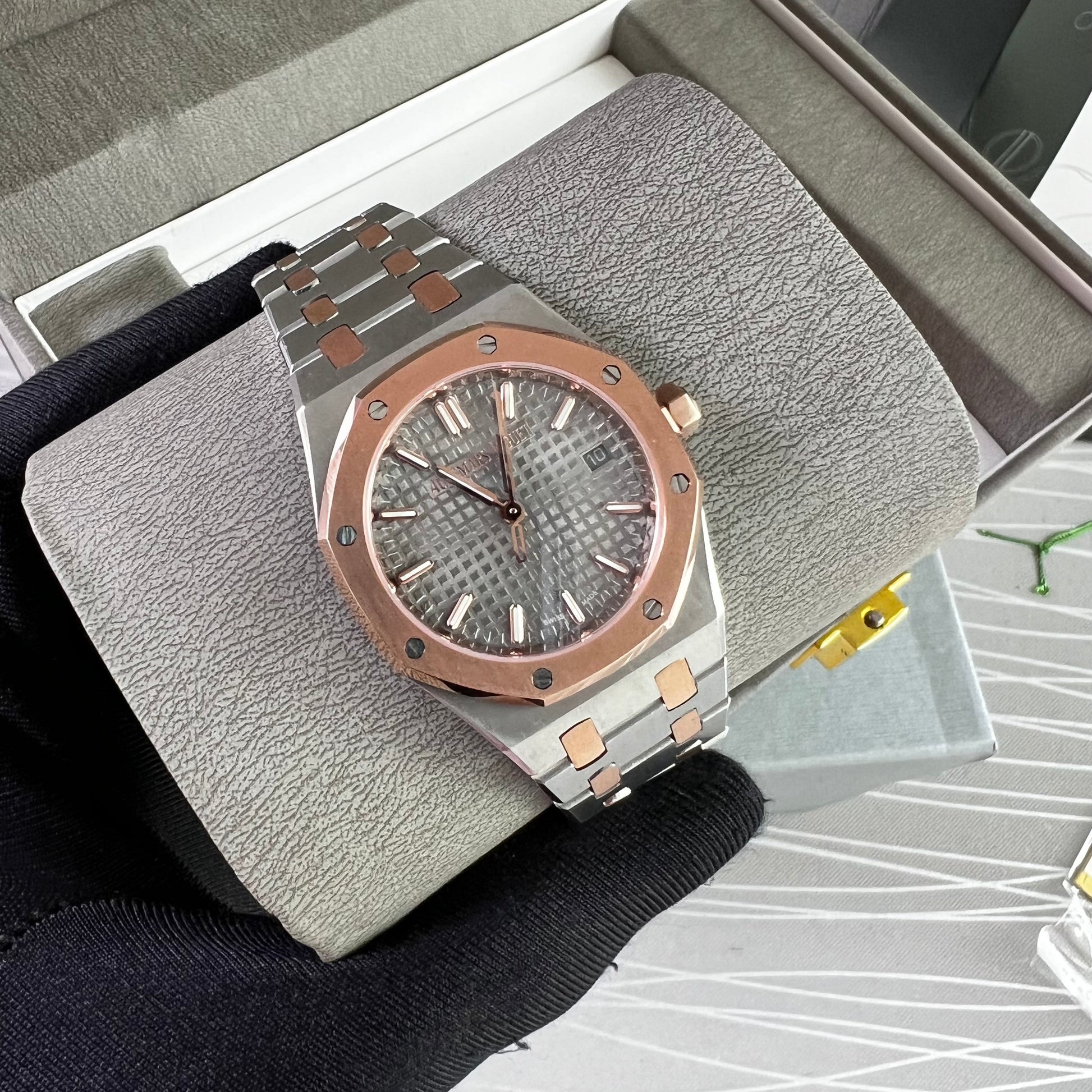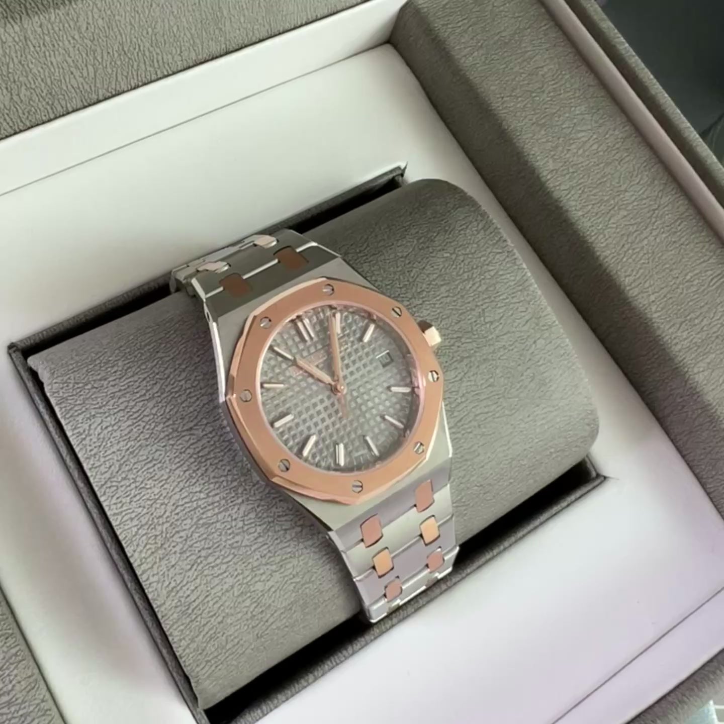 Reloj A - P unisex en acero inoxidable, color plata y rose gold. Maquinaría Suiza. 34 mm. Incluye caja, cubrepolvo, shopping bag.