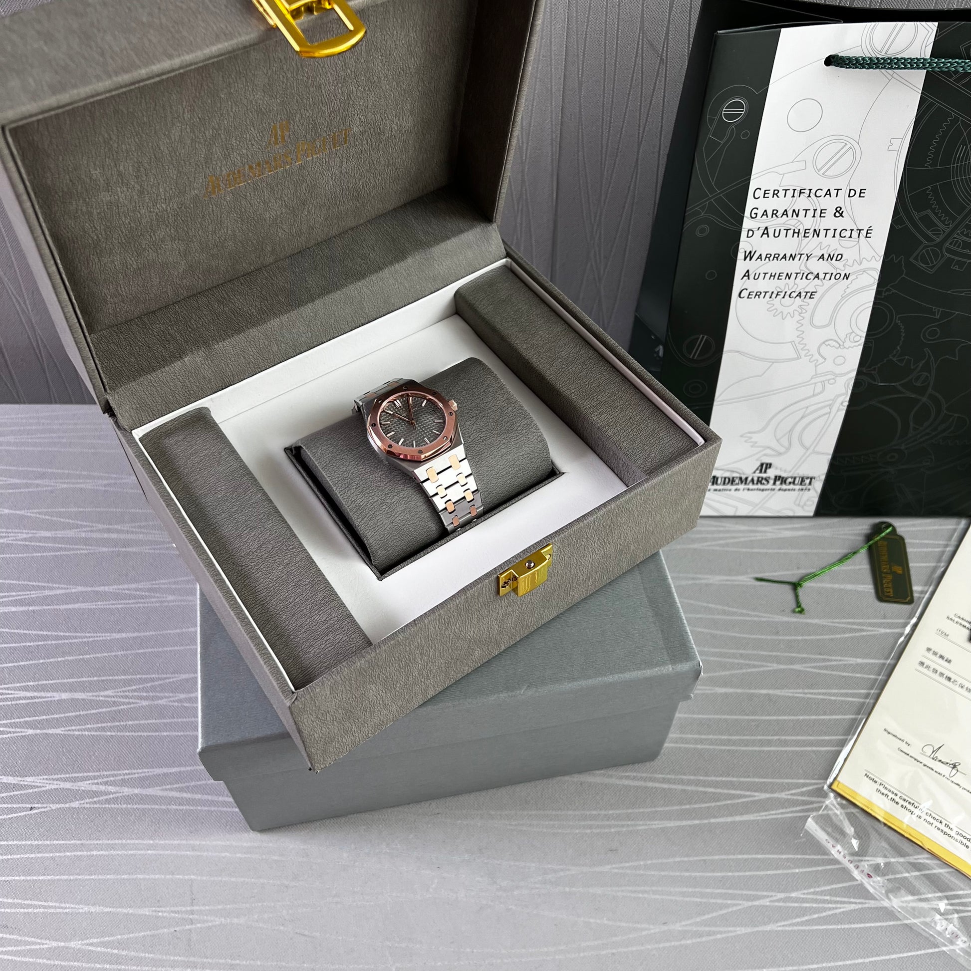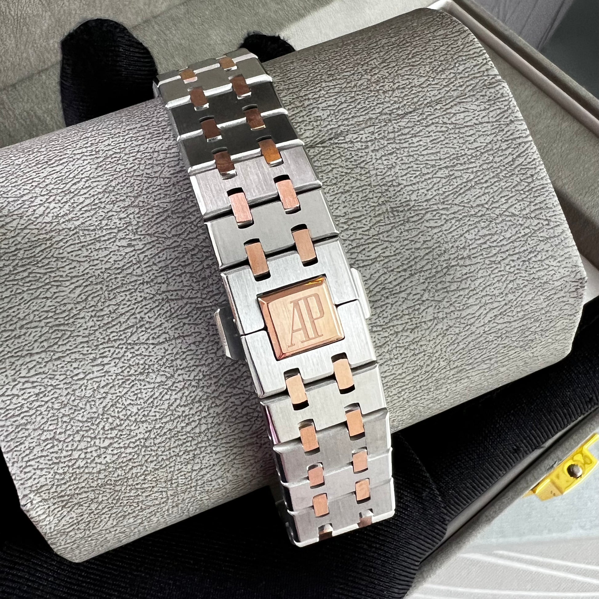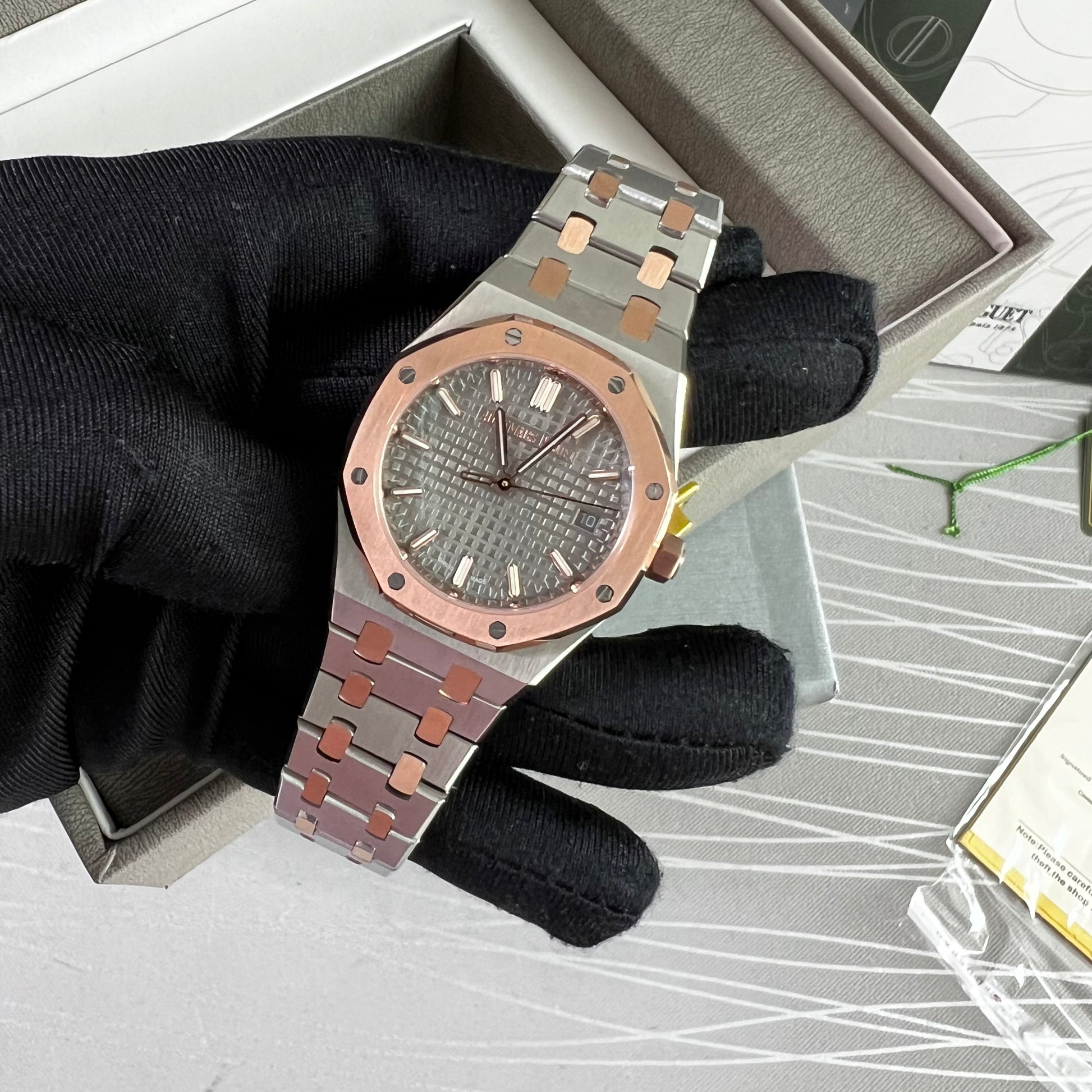 Reloj A - P unisex en acero inoxidable, color plata y rose gold. Maquinaría Suiza. 34 mm. Incluye caja, cubrepolvo, shopping bag.