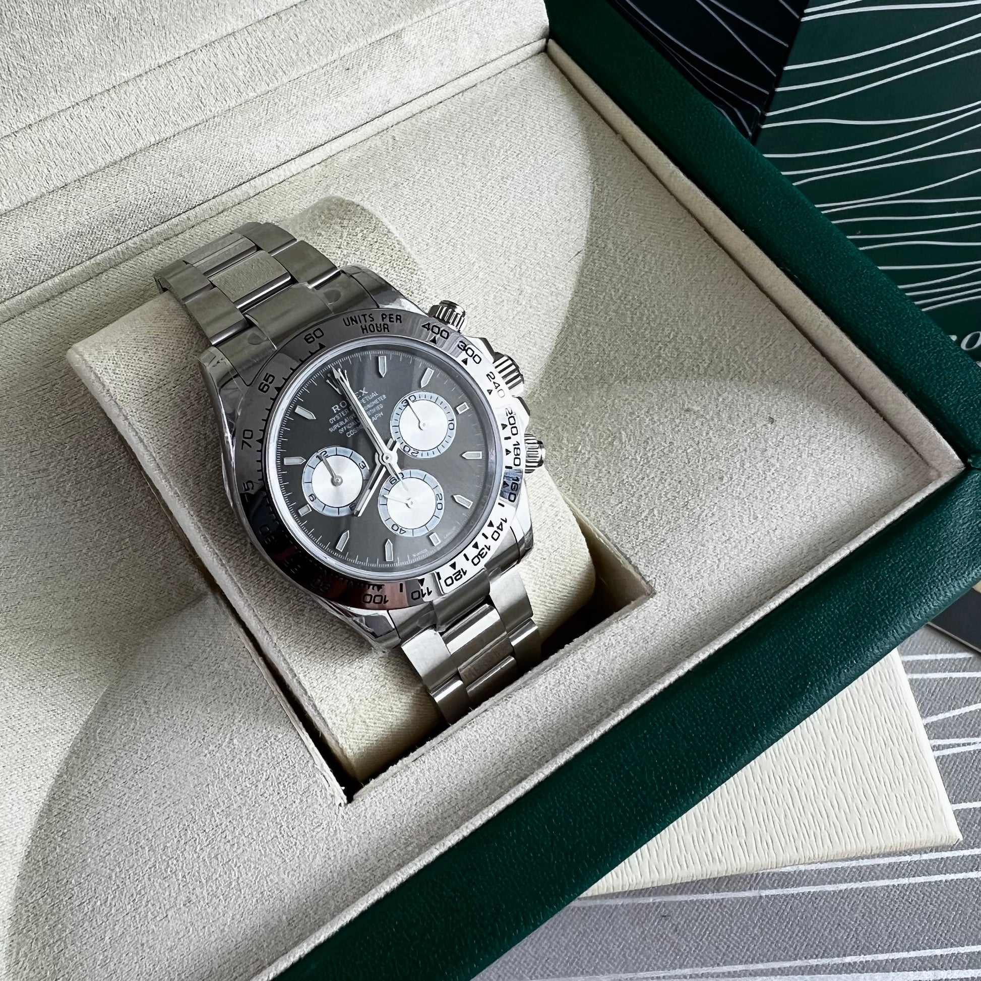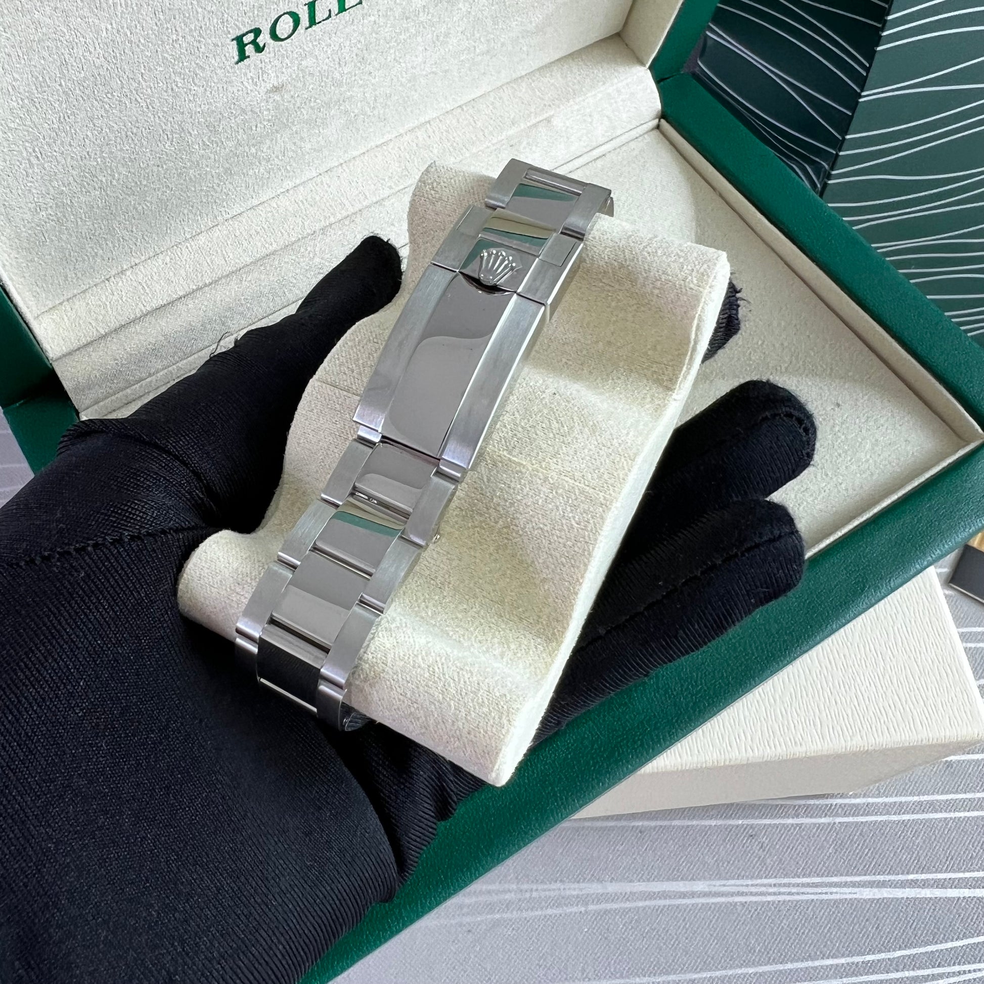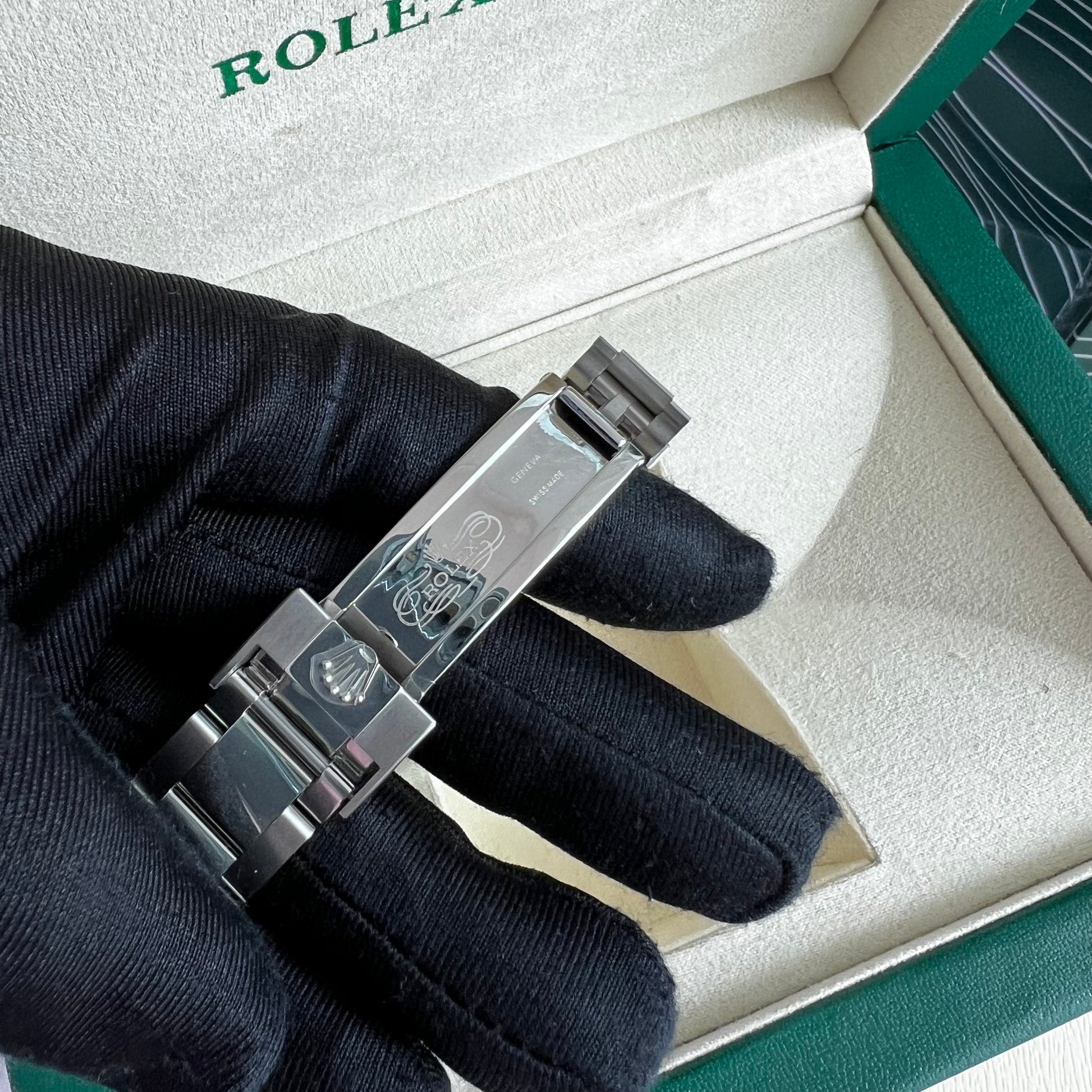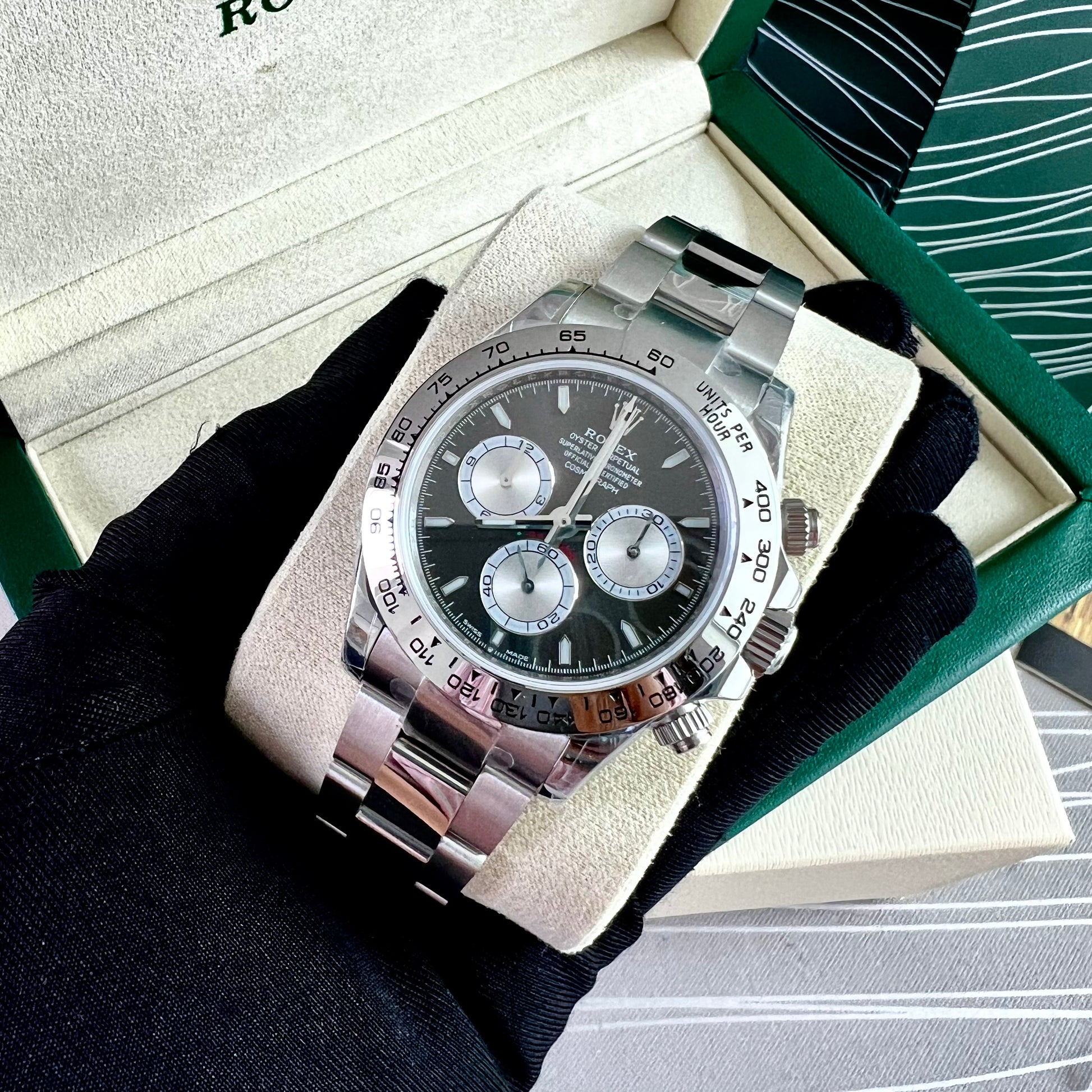 Reloj R acero inoxidable plateado con carátula color negro. 40 mm. Incluye caja, cubrepolvo y shopping bag.