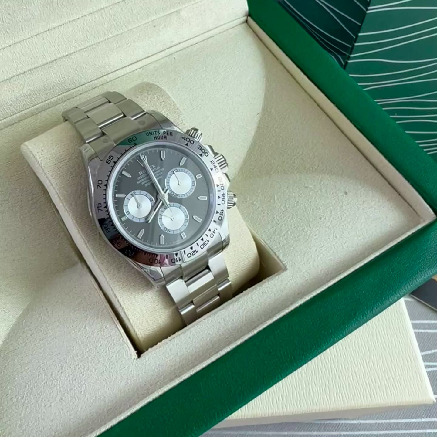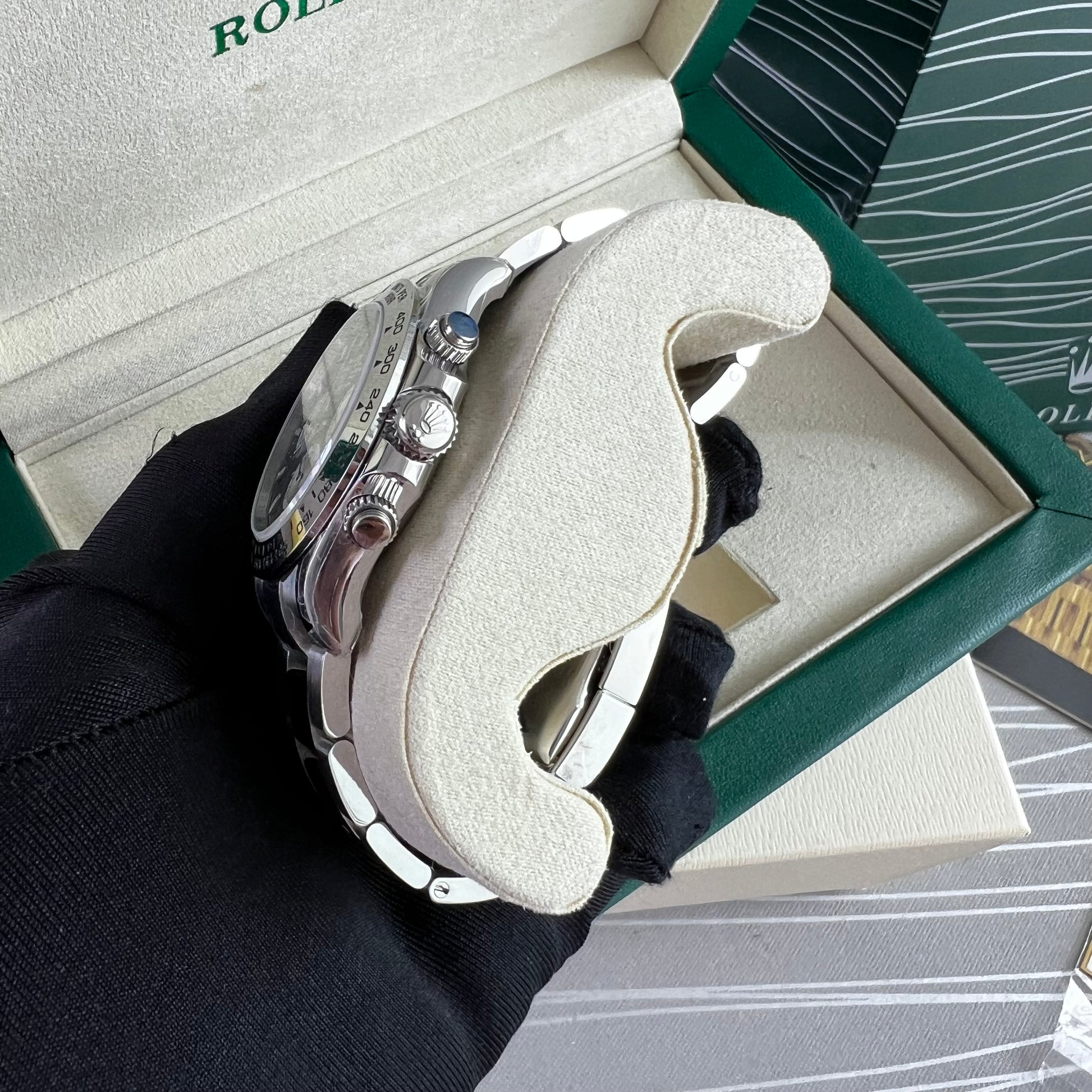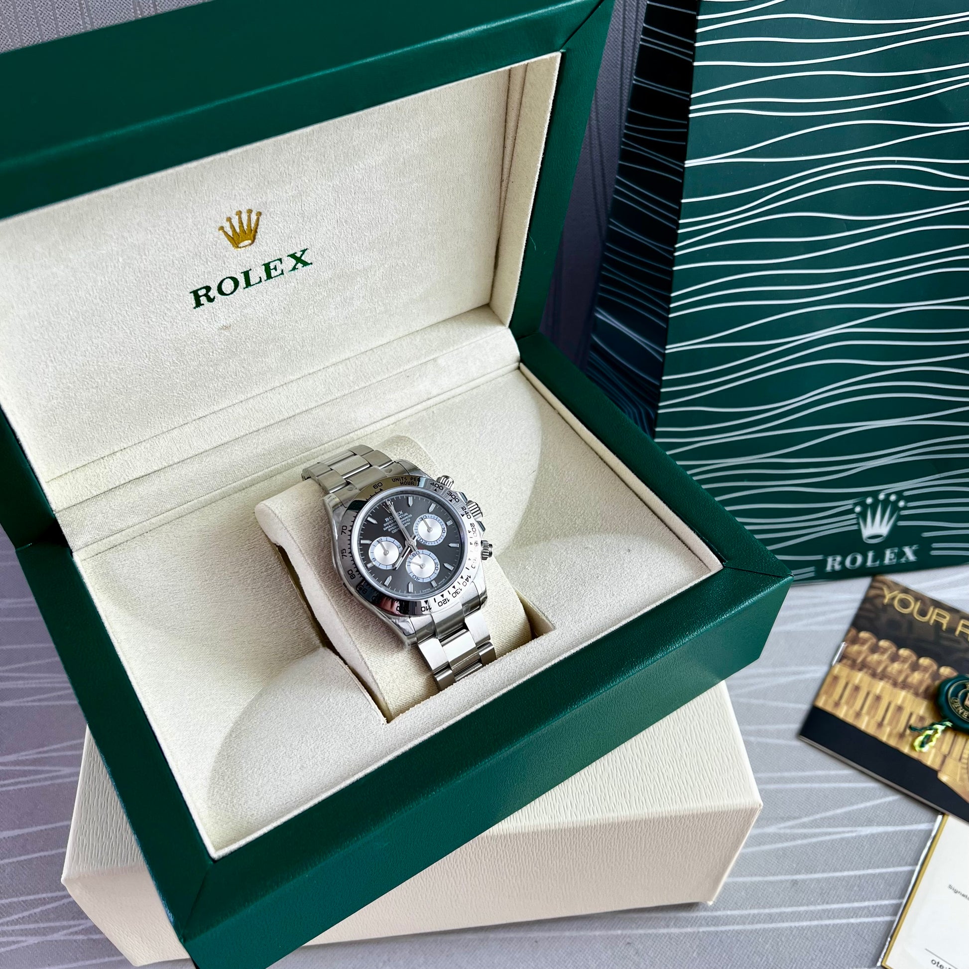 Reloj R acero inoxidable plateado con carátula color negro. 40 mm. Incluye caja, cubrepolvo y shopping bag.