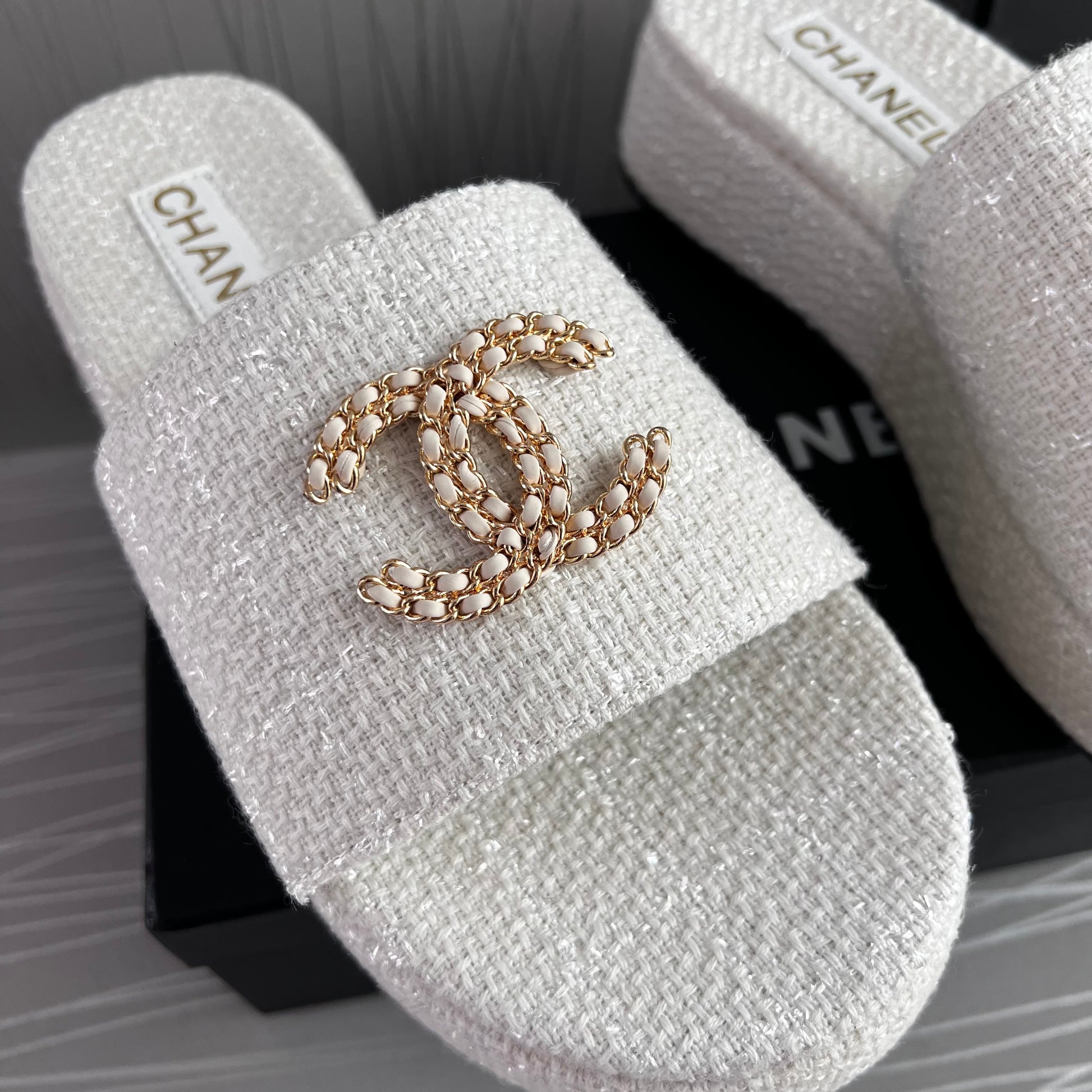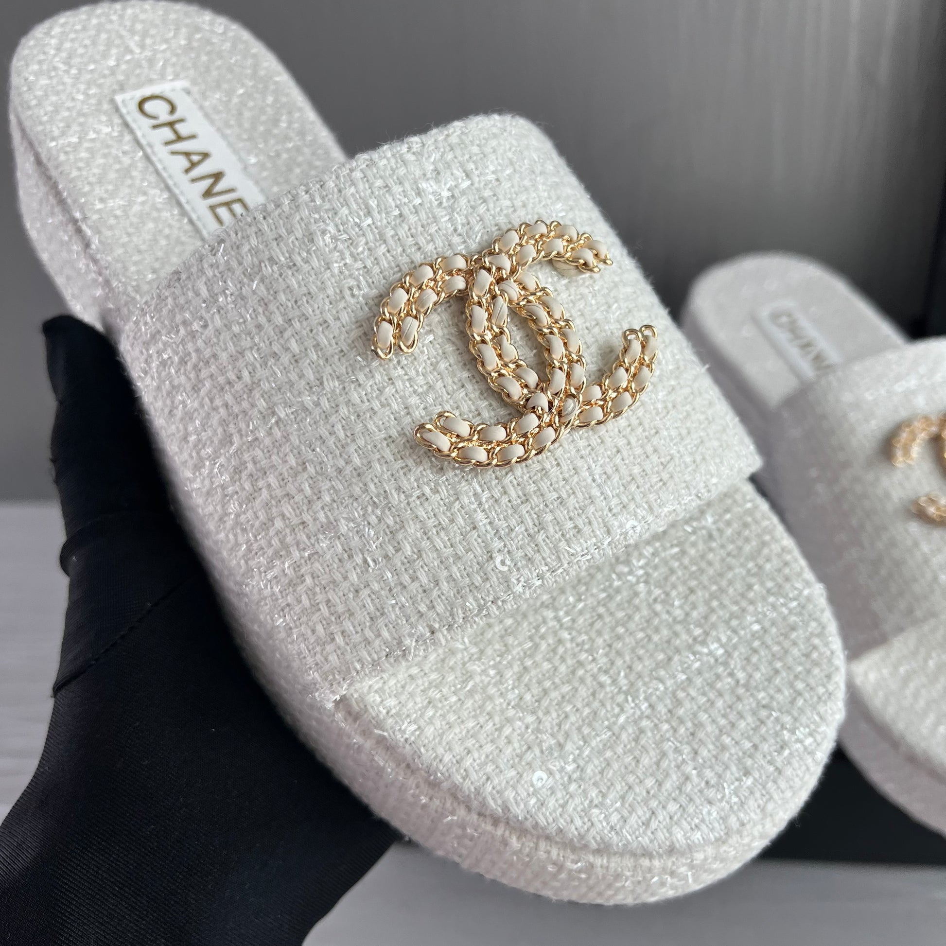 Sandalias C color blanco con letras doradas. Incluye caja y guardapolvo.