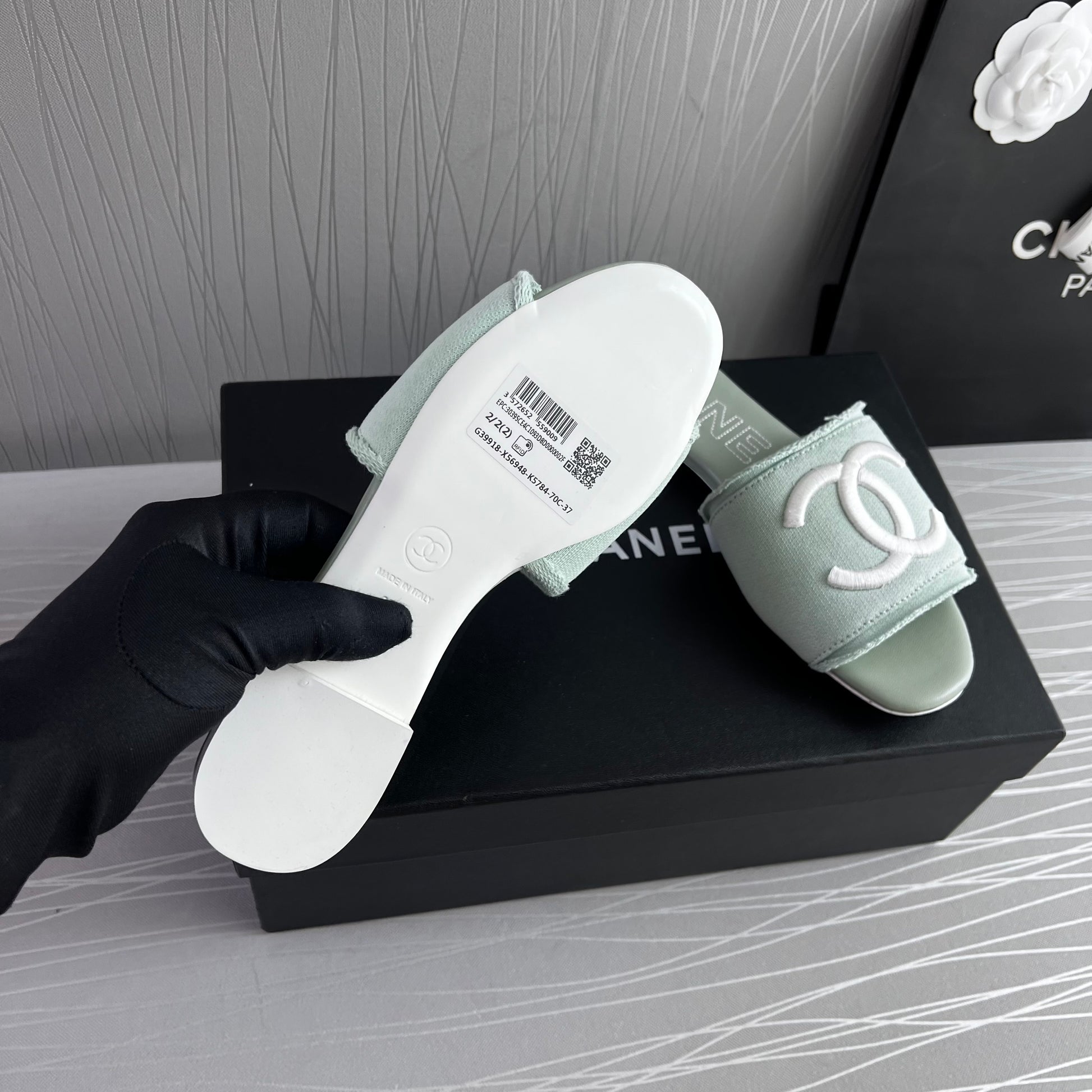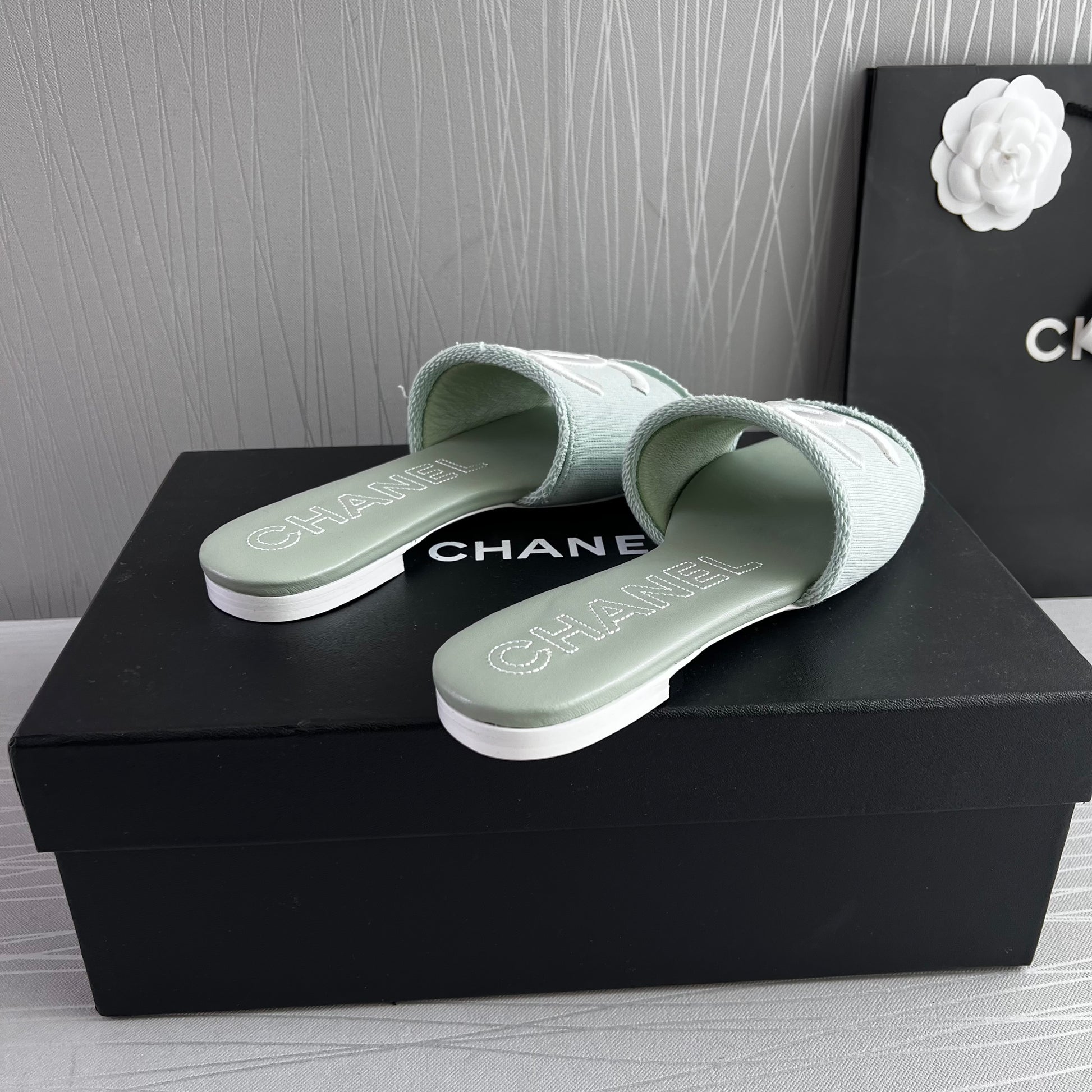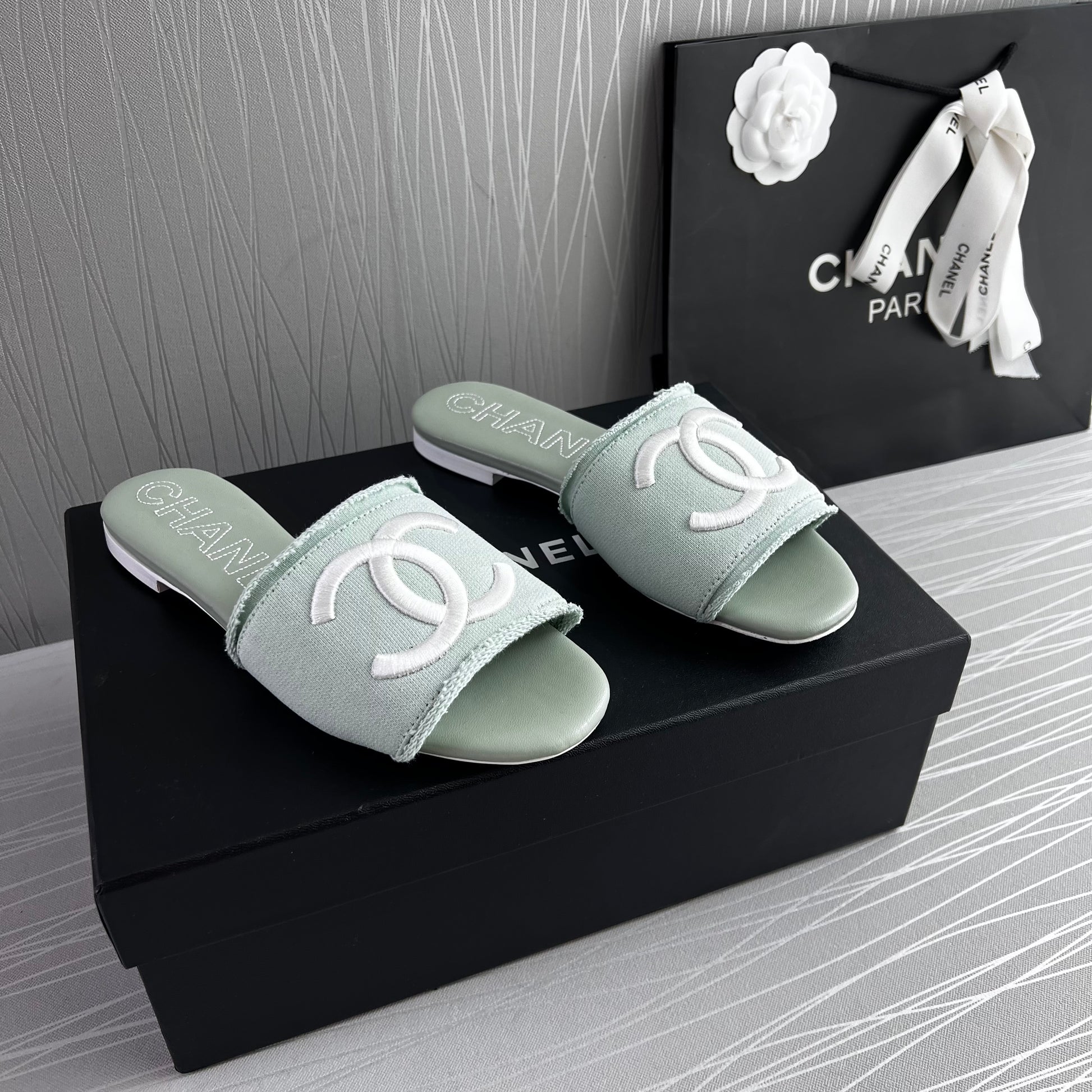 Sandalias en tela color verde con letras bordadas en color blanco, incluye caja, listón y flor.